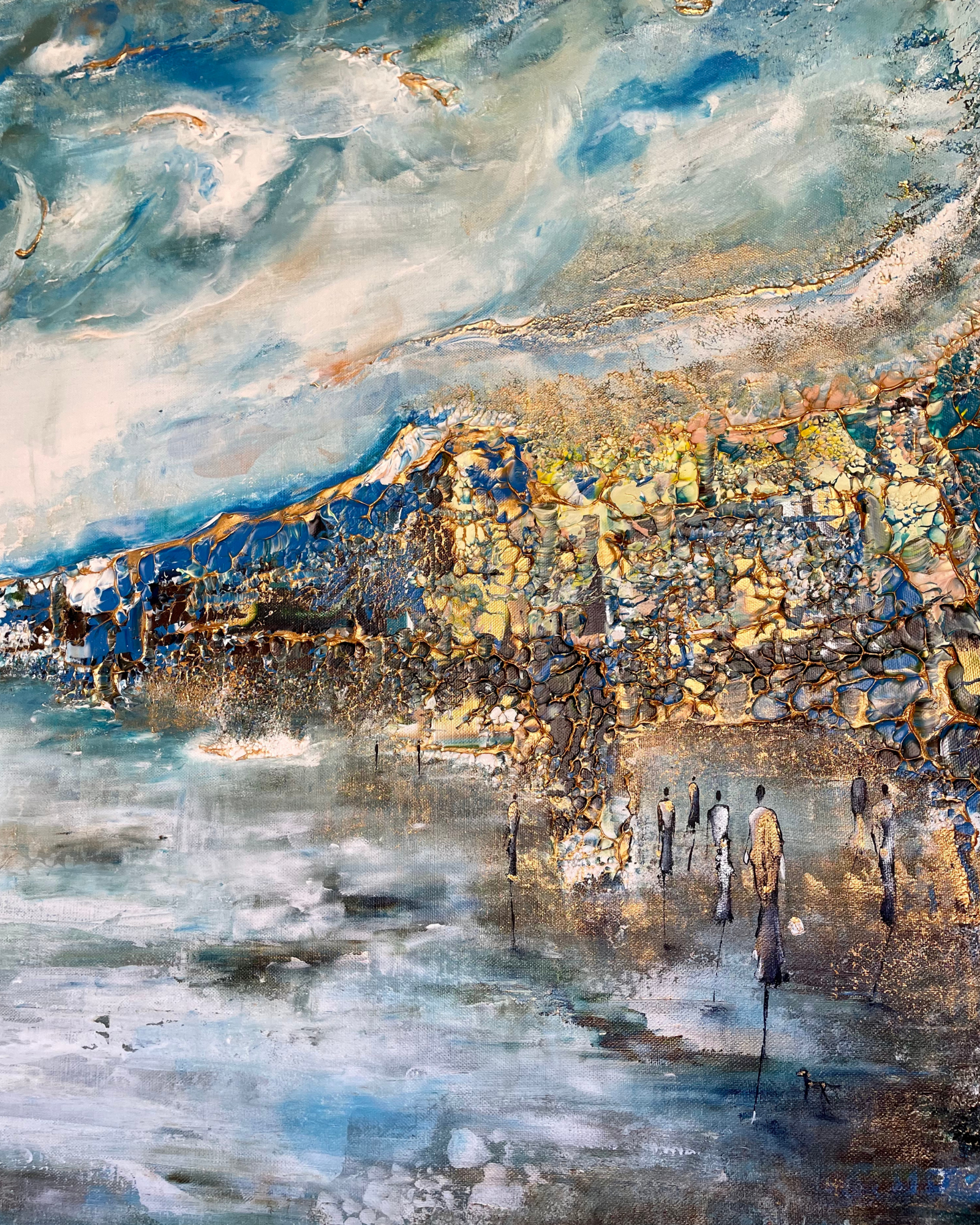 The colors used in this painting, varying from yellow to pink and of course blue, is a bit different from the other exhibition paintings. The inspiration comes from Crete, and its fantastic harbor with plenty of restaurants and a magical atmosphere. The buildings are not necessarily associated with the typical Greece style, which is reflected in the painting. You may also wonder when Hjördis will show up? Of course, I can not create an exhibition without her, and she is therefore making the silhouettes company on their little stroll.
