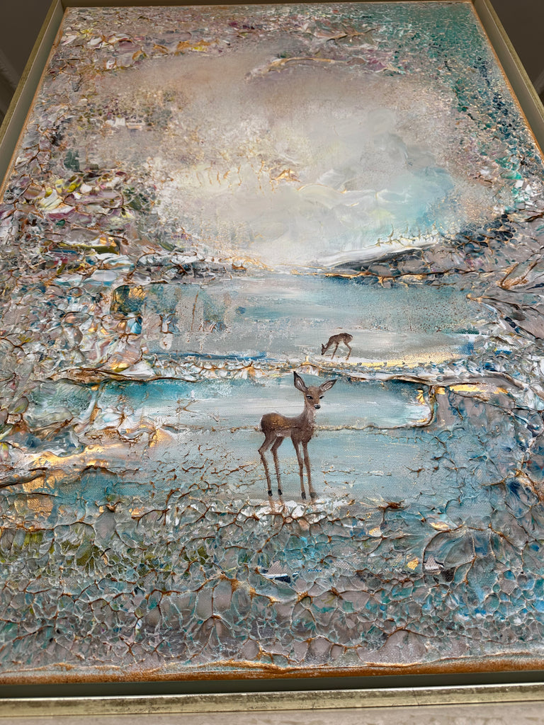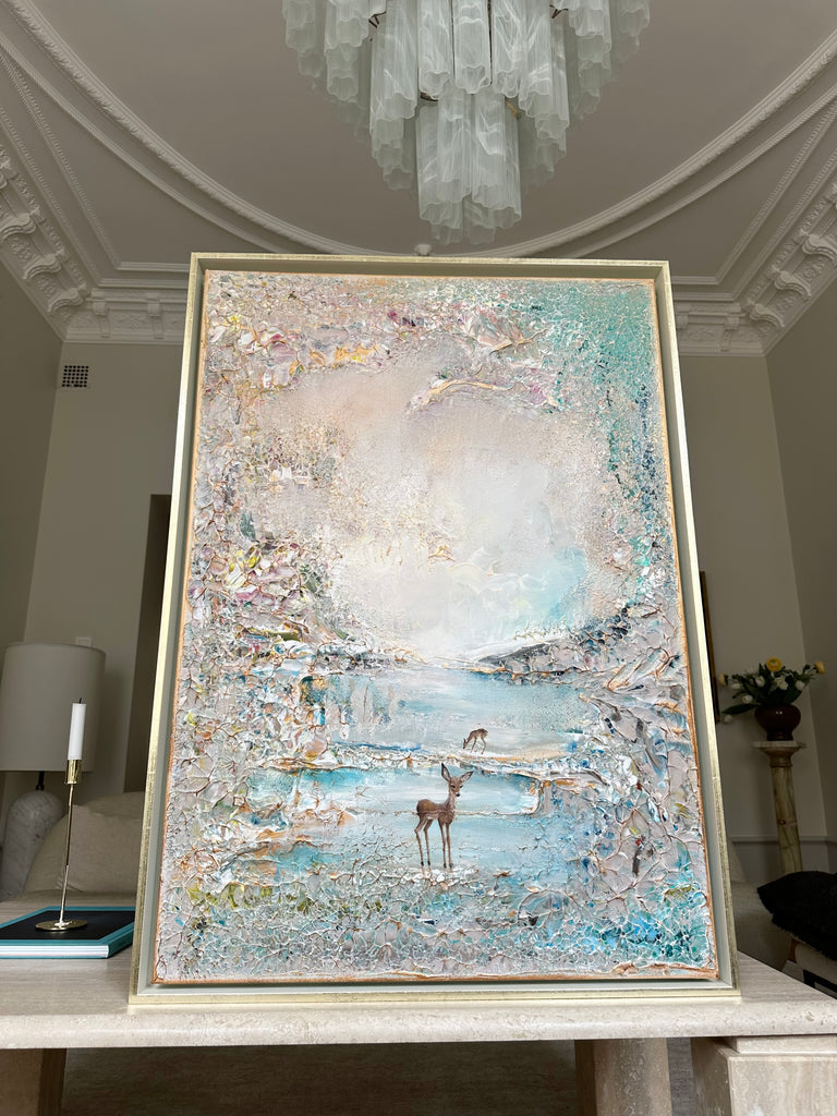 We offer worldwide shipping. The delivery is up to 6 weeks. A white and golden frame created by the artist, is included in the price.