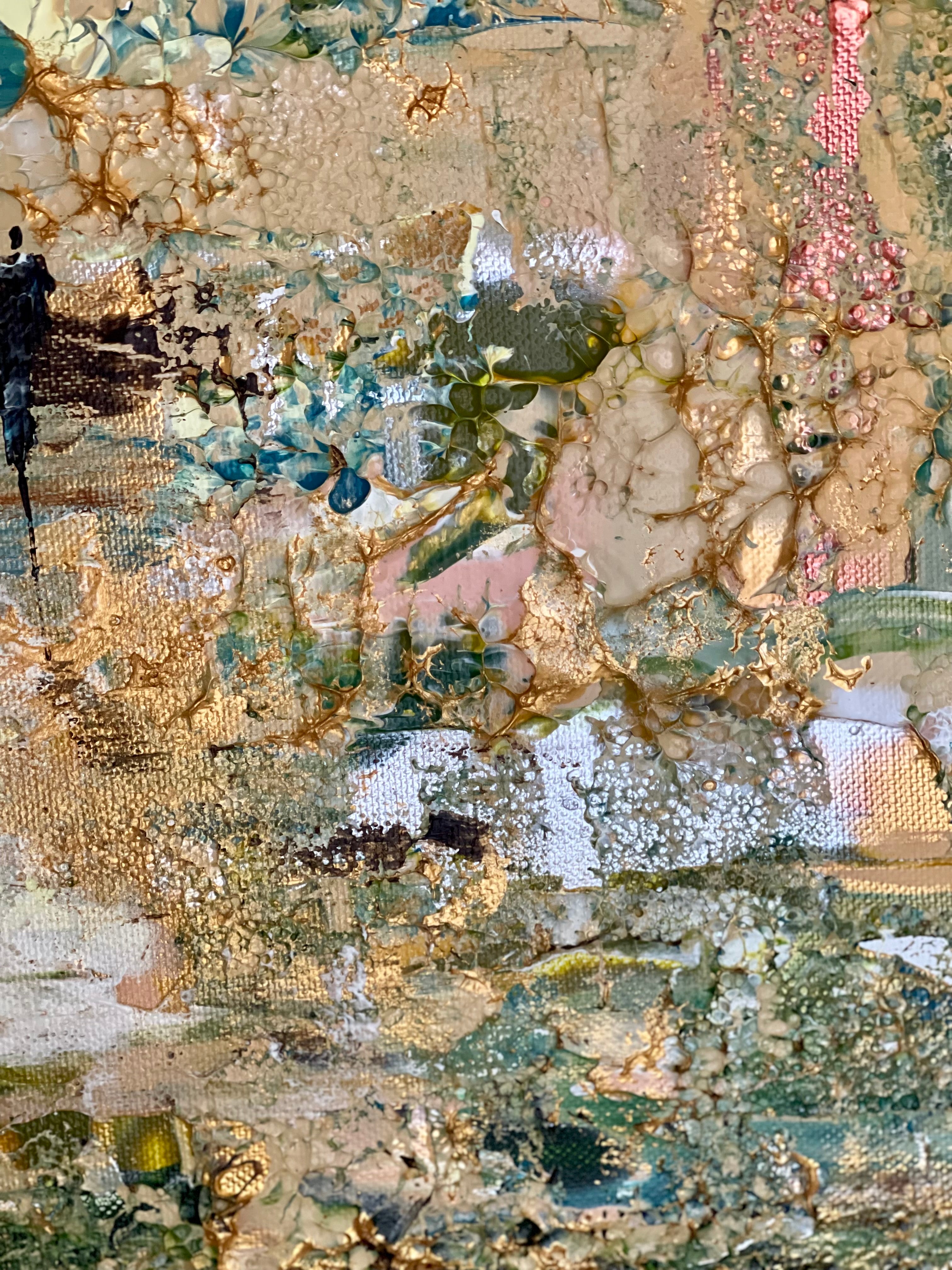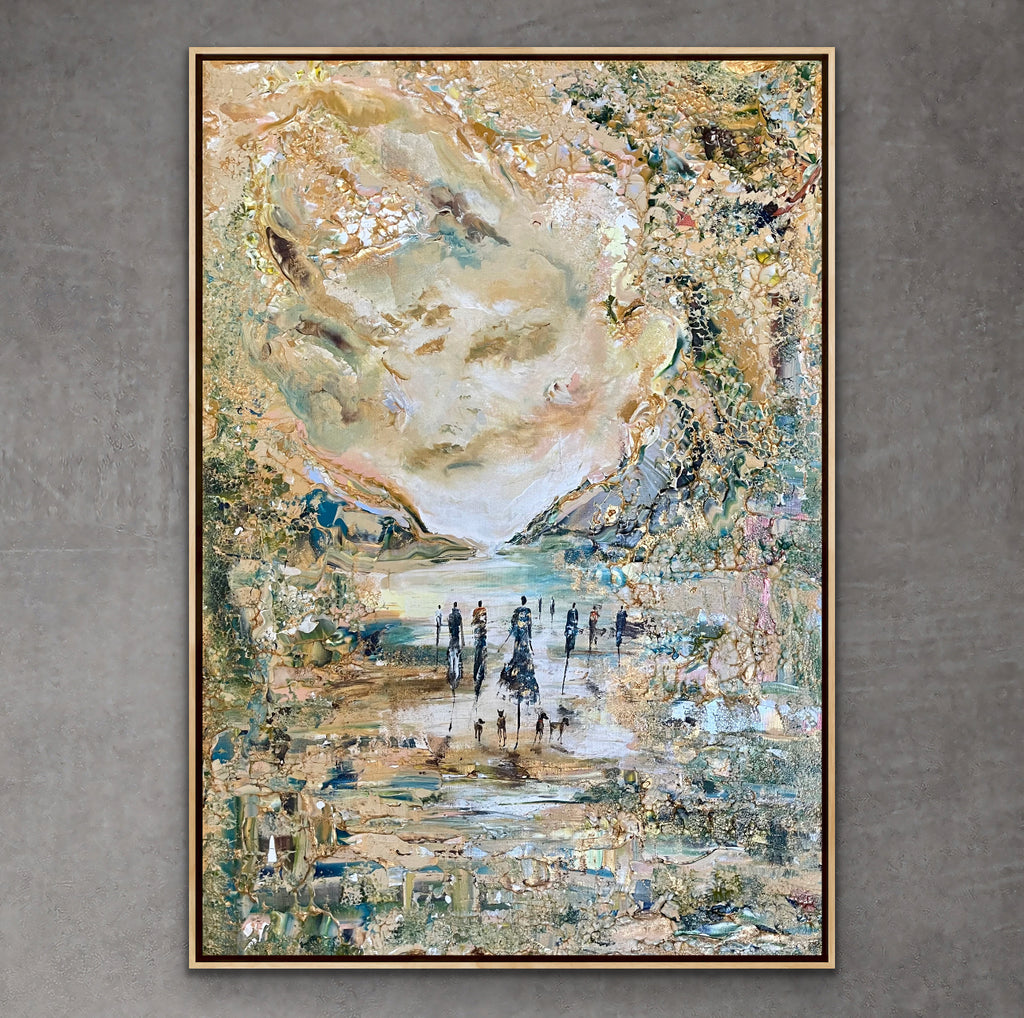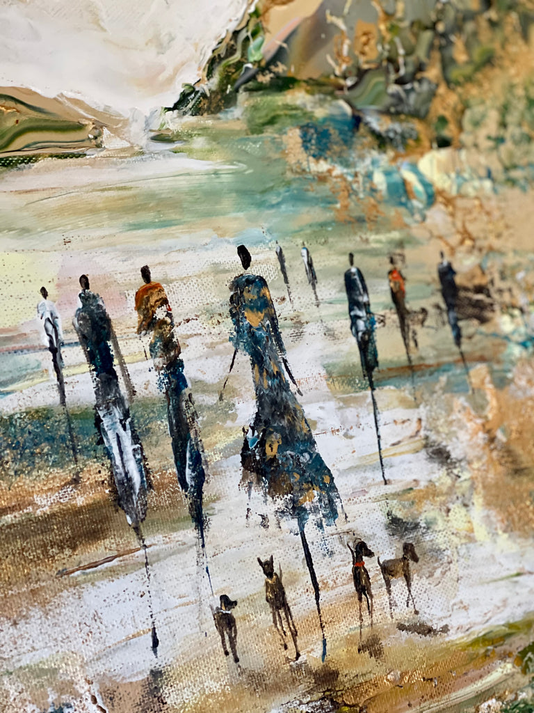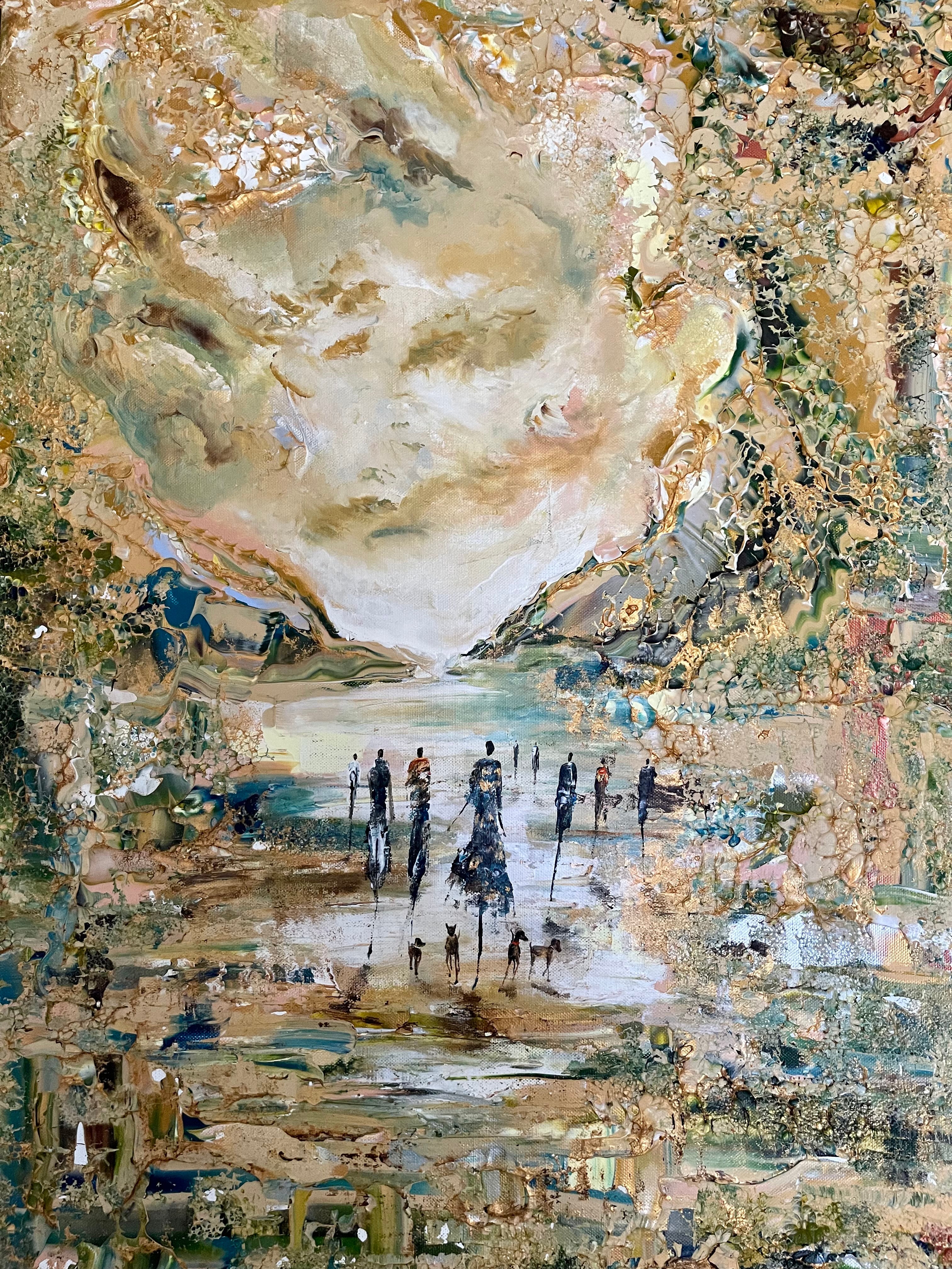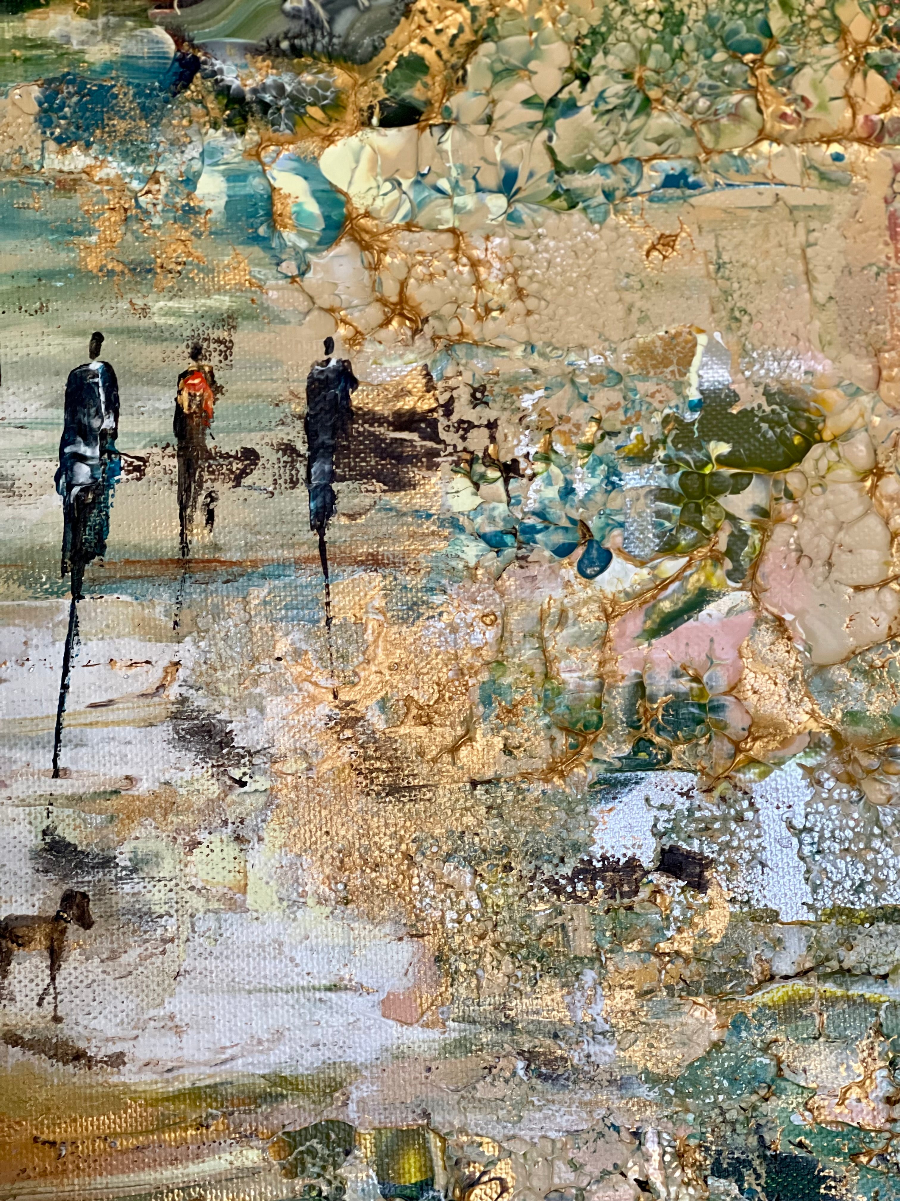 While painting "Hazeliusbacken", I gathered inspiration from the beautiful street at Djurgården with the same name. I have used a lot of golden and green colors, to create the dream-like feeling that I was after. I picture that the sun is shining and the air is crispy while several people, all dressed in different fashionable styles are strolling around on a Saturday afternoon. The lady in the middle is accompanied by her many cute dogs. Can you see which one Hjördis is?