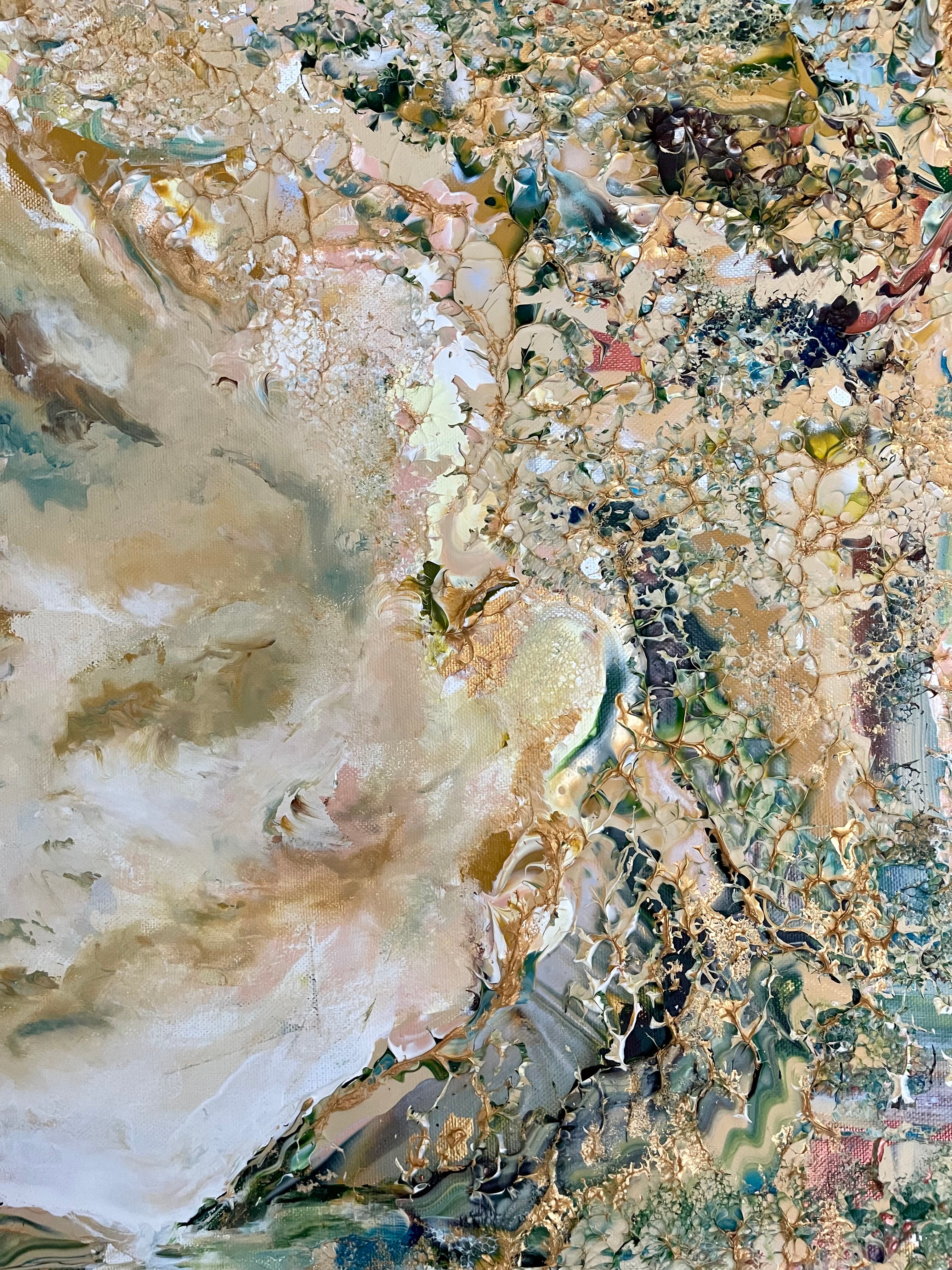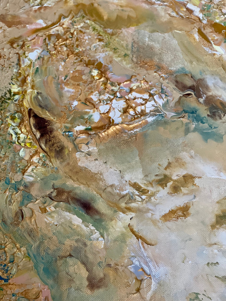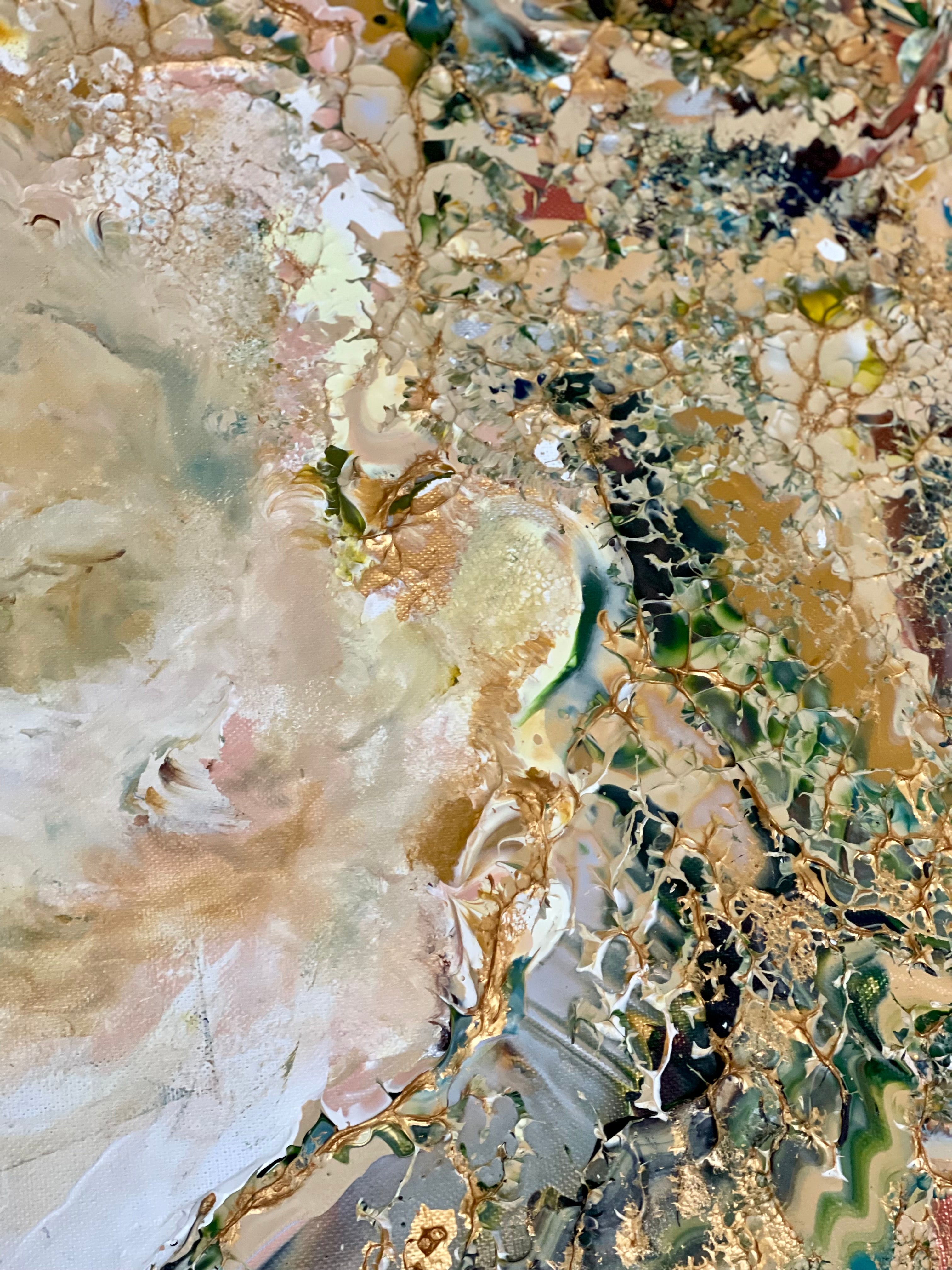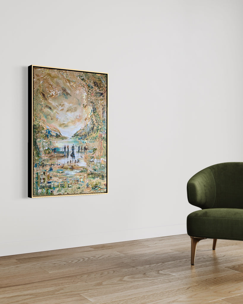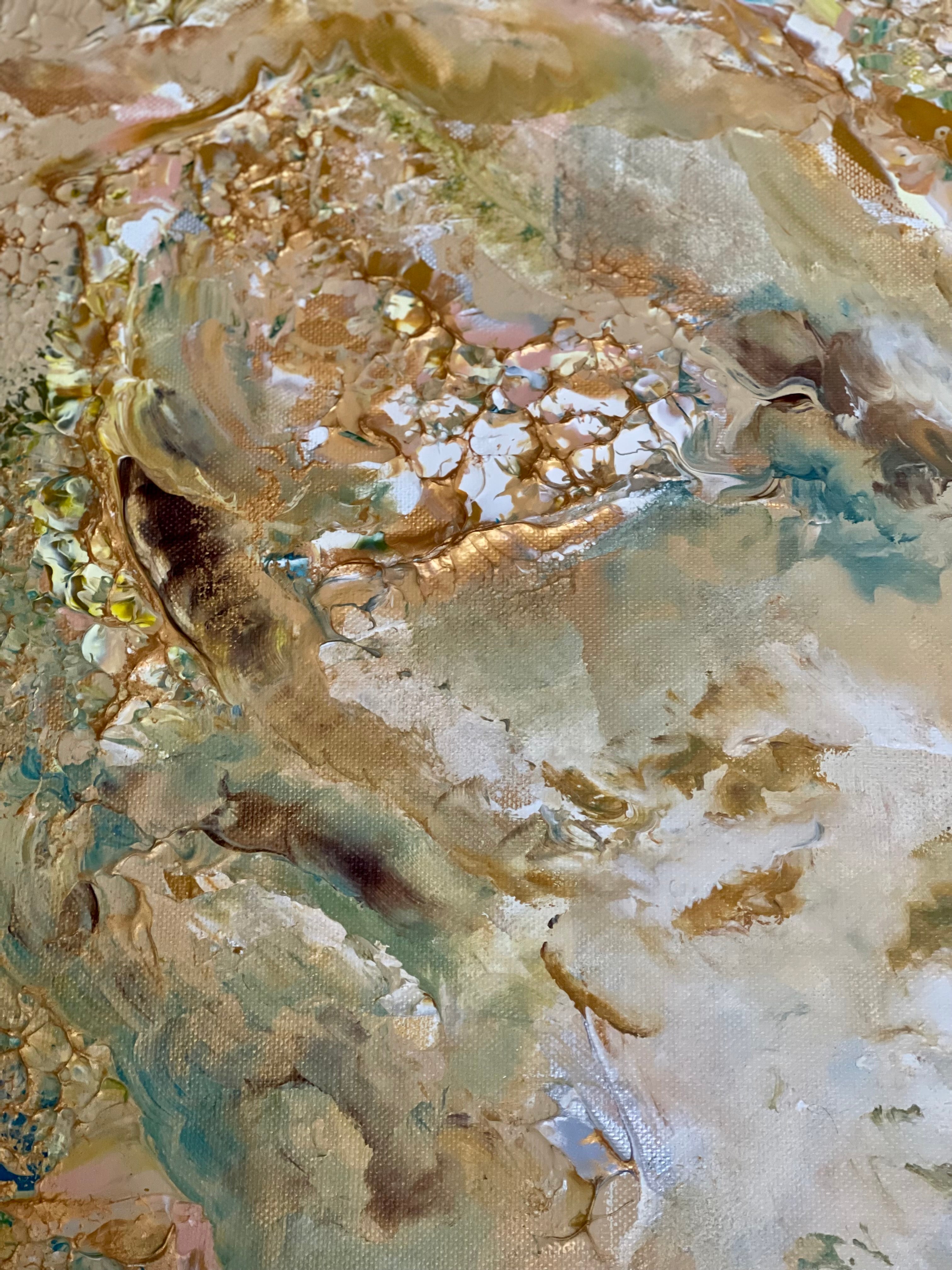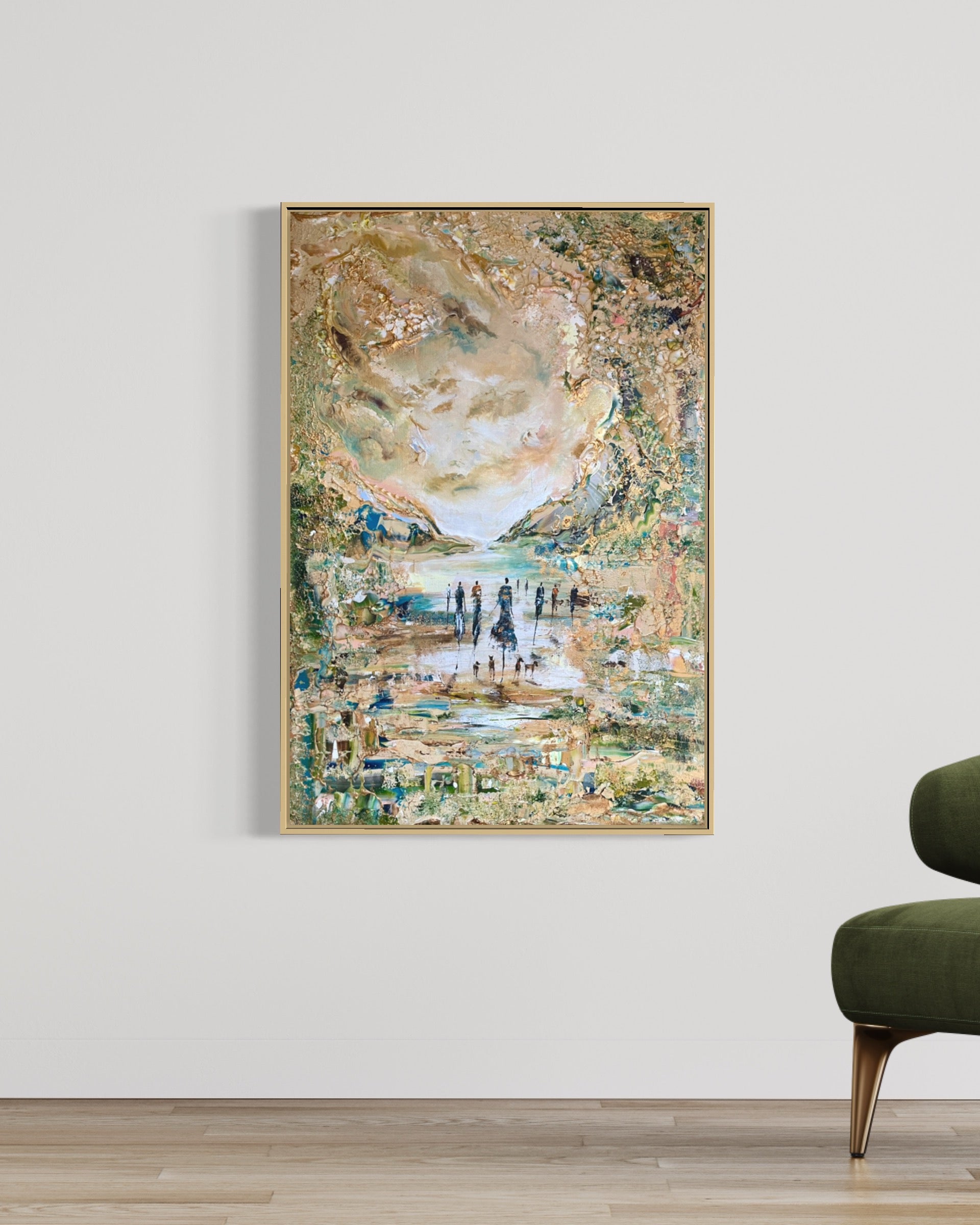 While painting "Hazeliusbacken", I gathered inspiration from the beautiful street at Djurgården with the same name. I have used a lot of golden and green colors, to create the dream-like feeling that I was after. I picture that the sun is shining and the air is crispy while several people, all dressed in different fashionable styles are strolling around on a Saturday afternoon. The lady in the middle is accompanied by her many cute dogs. Can you see which one Hjördis is?