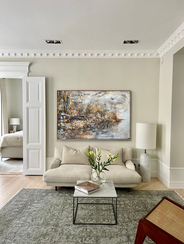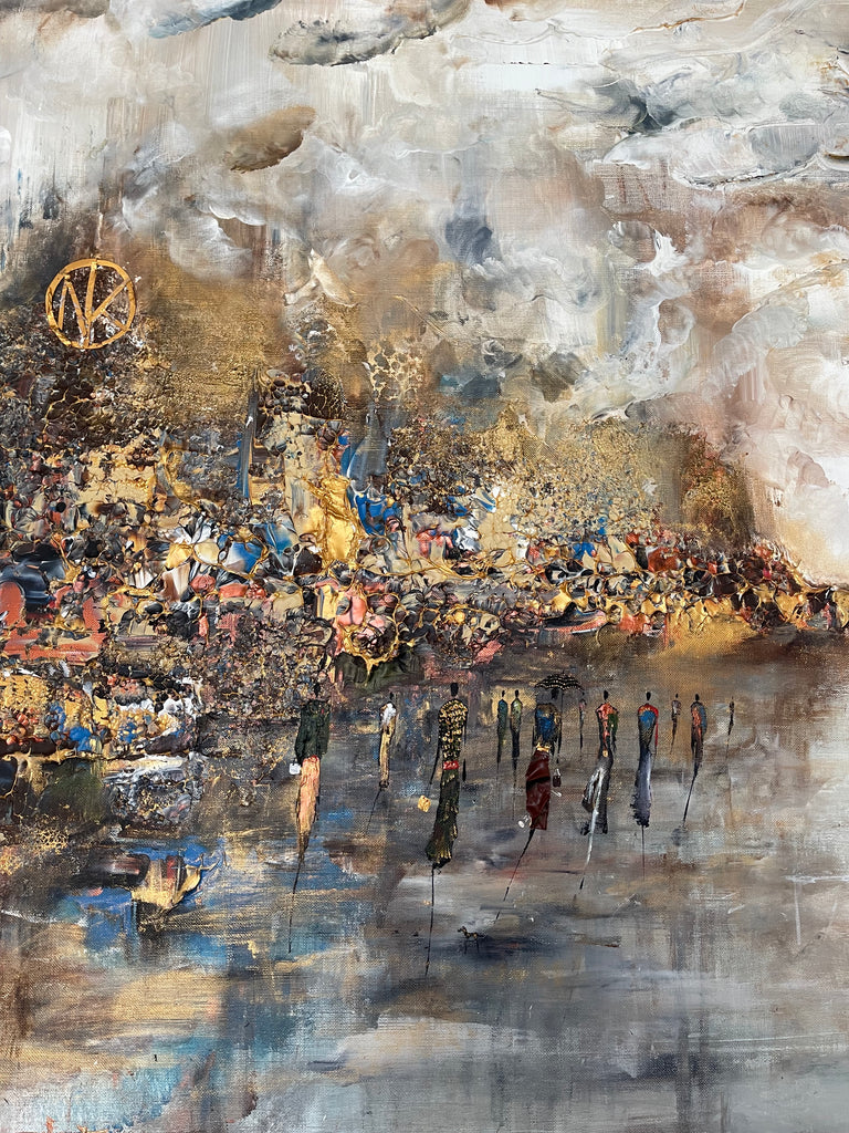 This painting was created with the intention of capturing Stockholm, and more specifically Nordiska Kompaniet (NK) during the autumn. The colors used are dusty and the figures strolling around Hamngatan are wearing fashionable clothing.