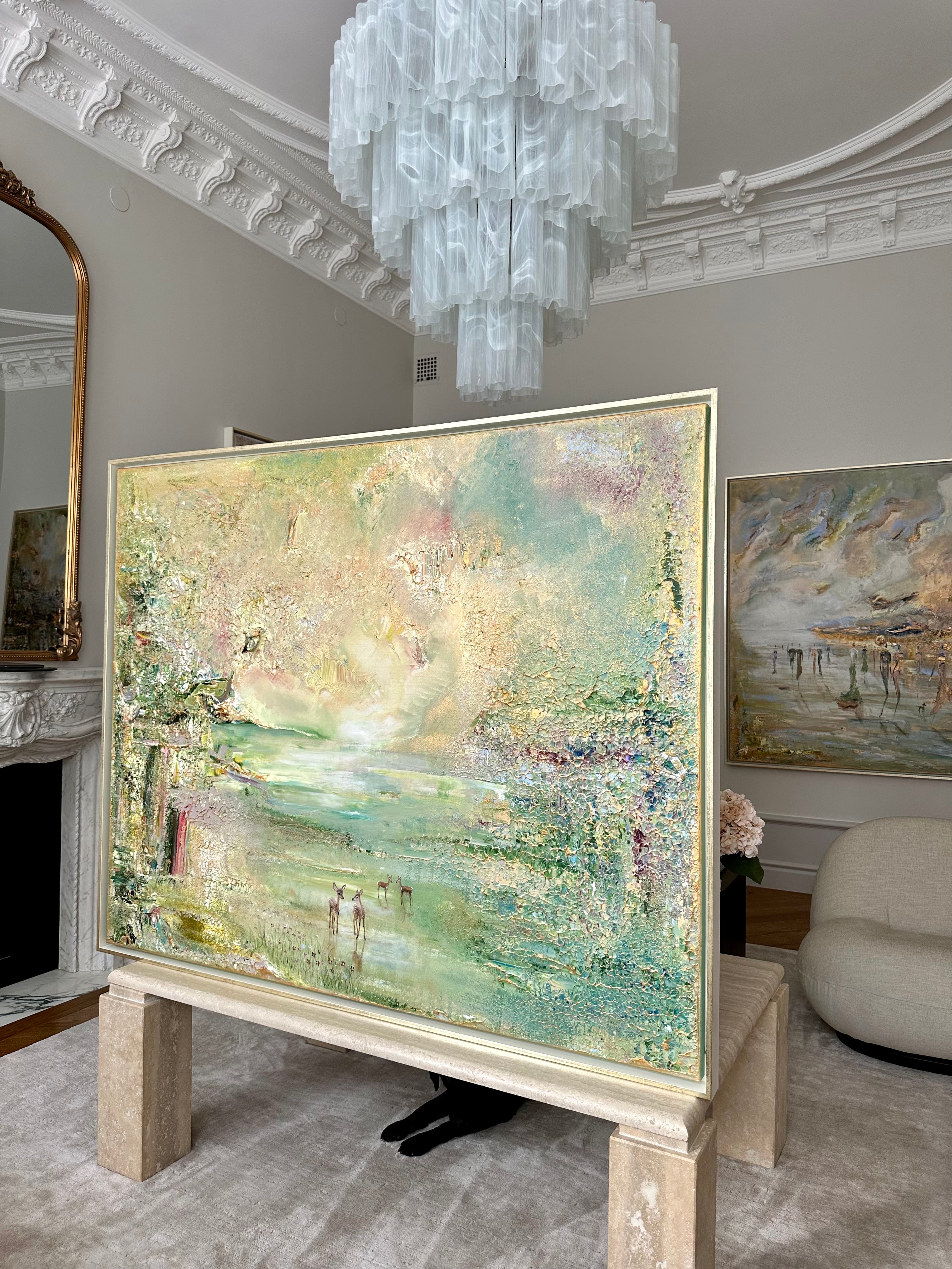 Vi tilbyder verdensomspændende forsendelse. Leveringen er op til 6 uger. En hvid og gylden ramme skabt af kunstneren, er inkluderet i prisen.