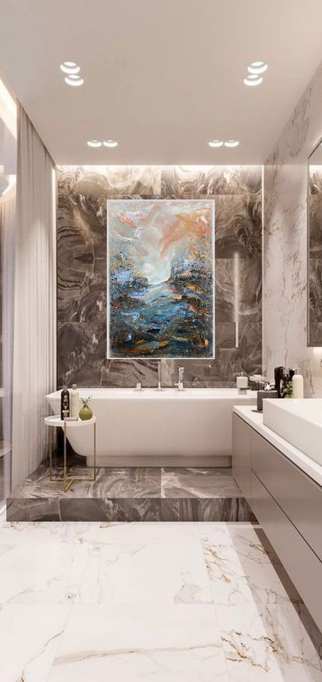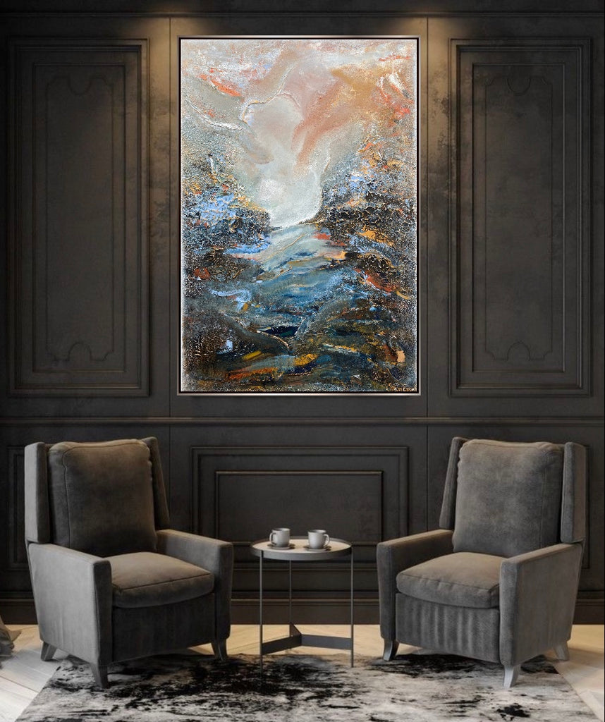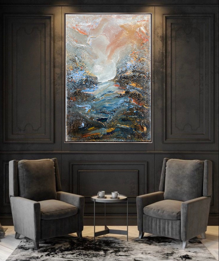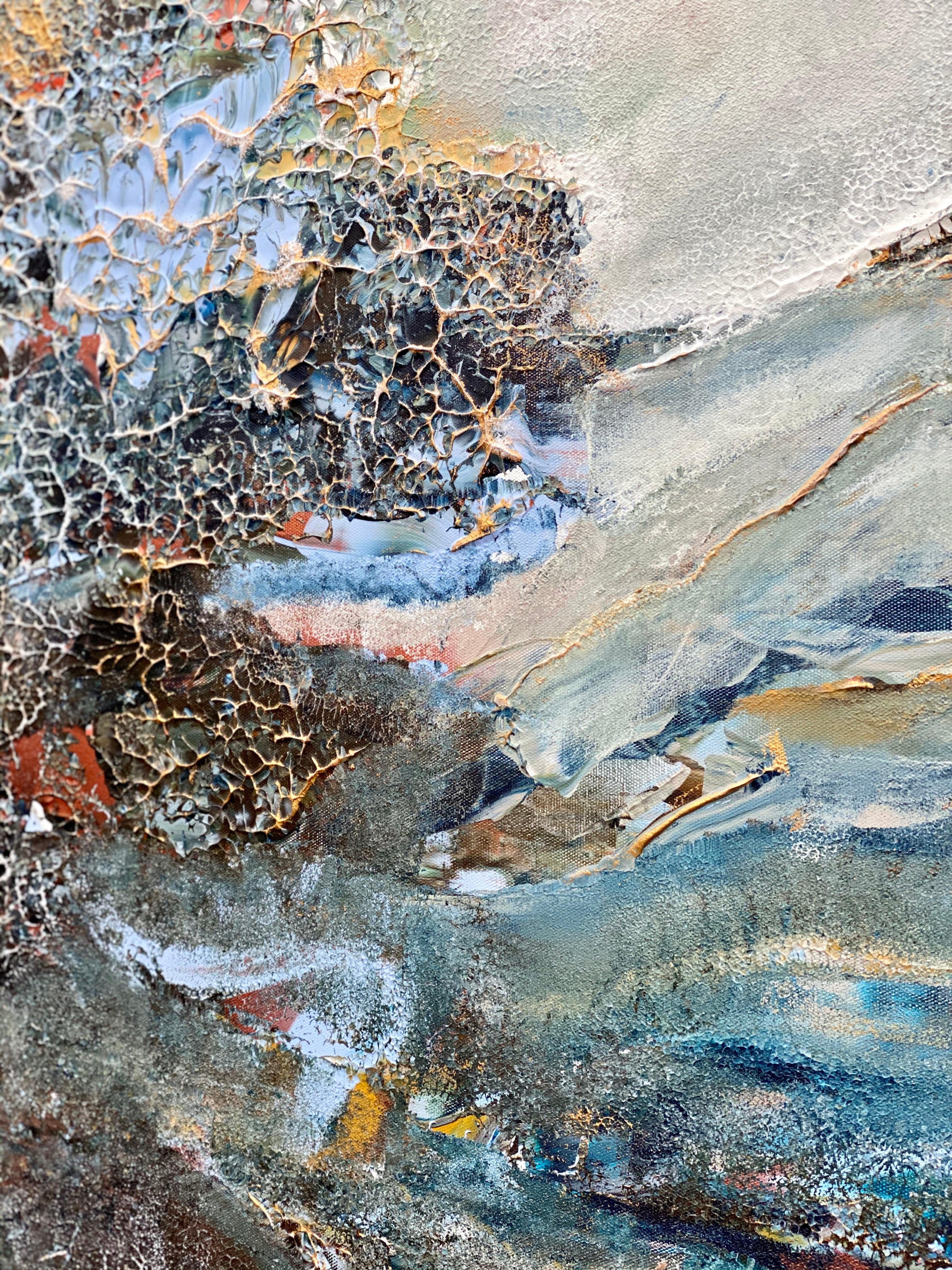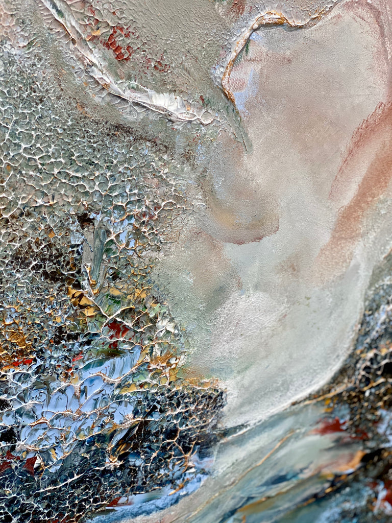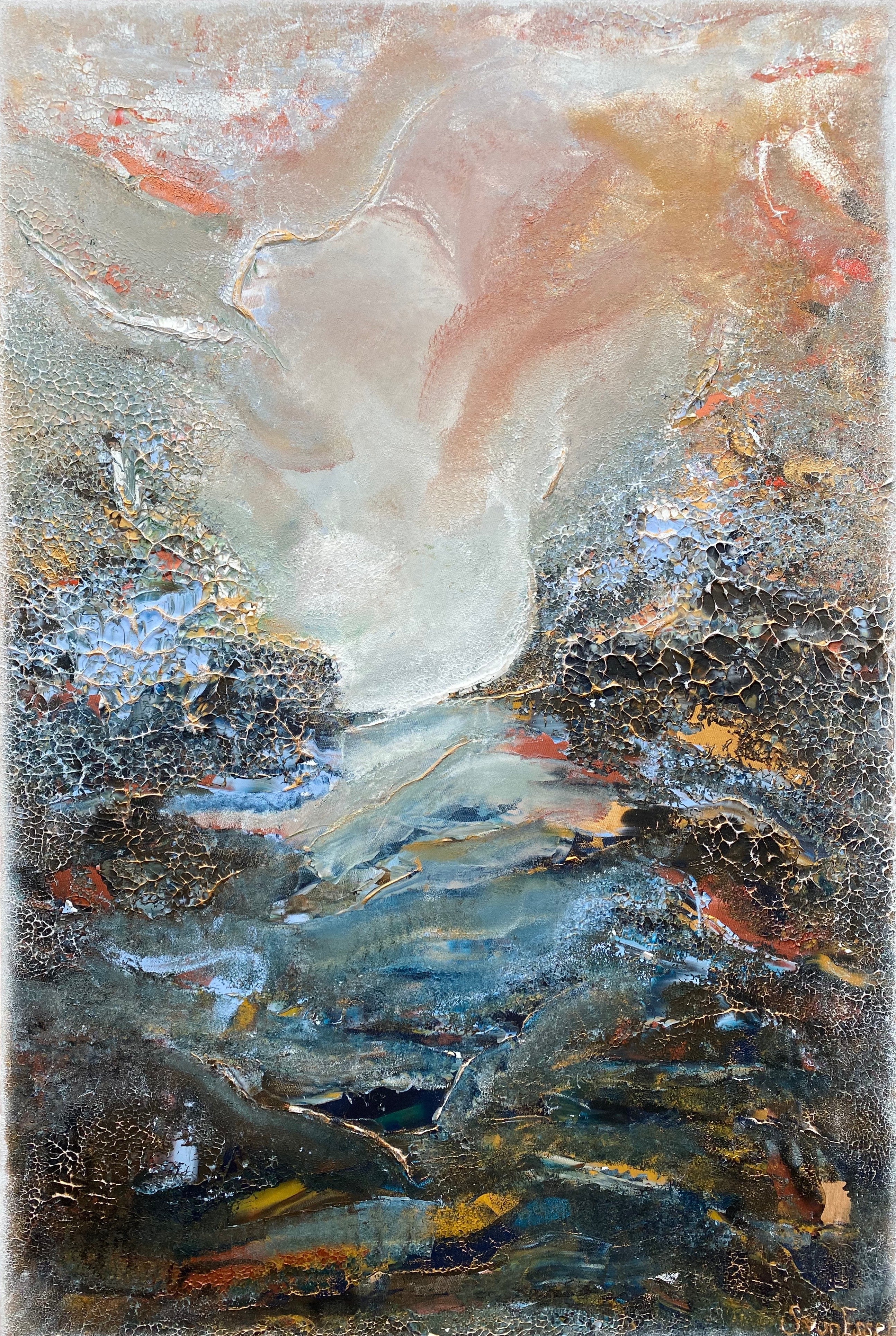 "Grundsviken" 100x150 aus Norden von Schweden inspiriert. Ich habe viel mit den Details des Gemäldes experimentiert, um eine Mischung zwischen warm und kalt zu erstellen. Ich verehre absolut, wie der rosa Glanz von der oberen rechten Ecke das dunkle und kalte Wasser von unten trifft.