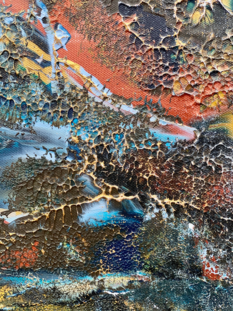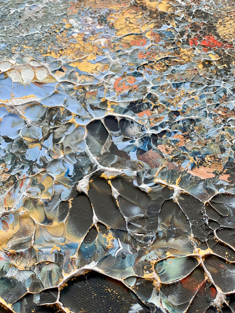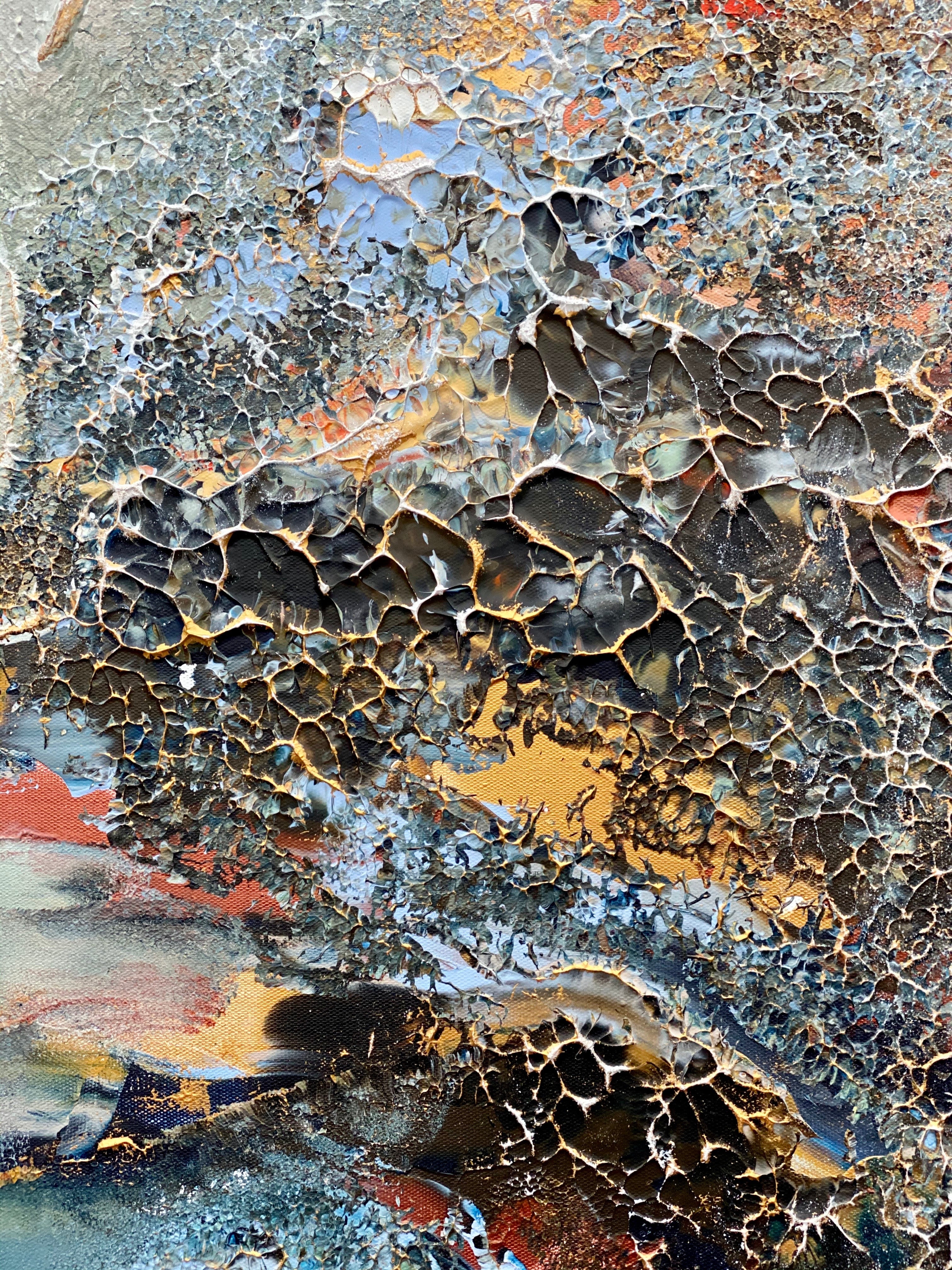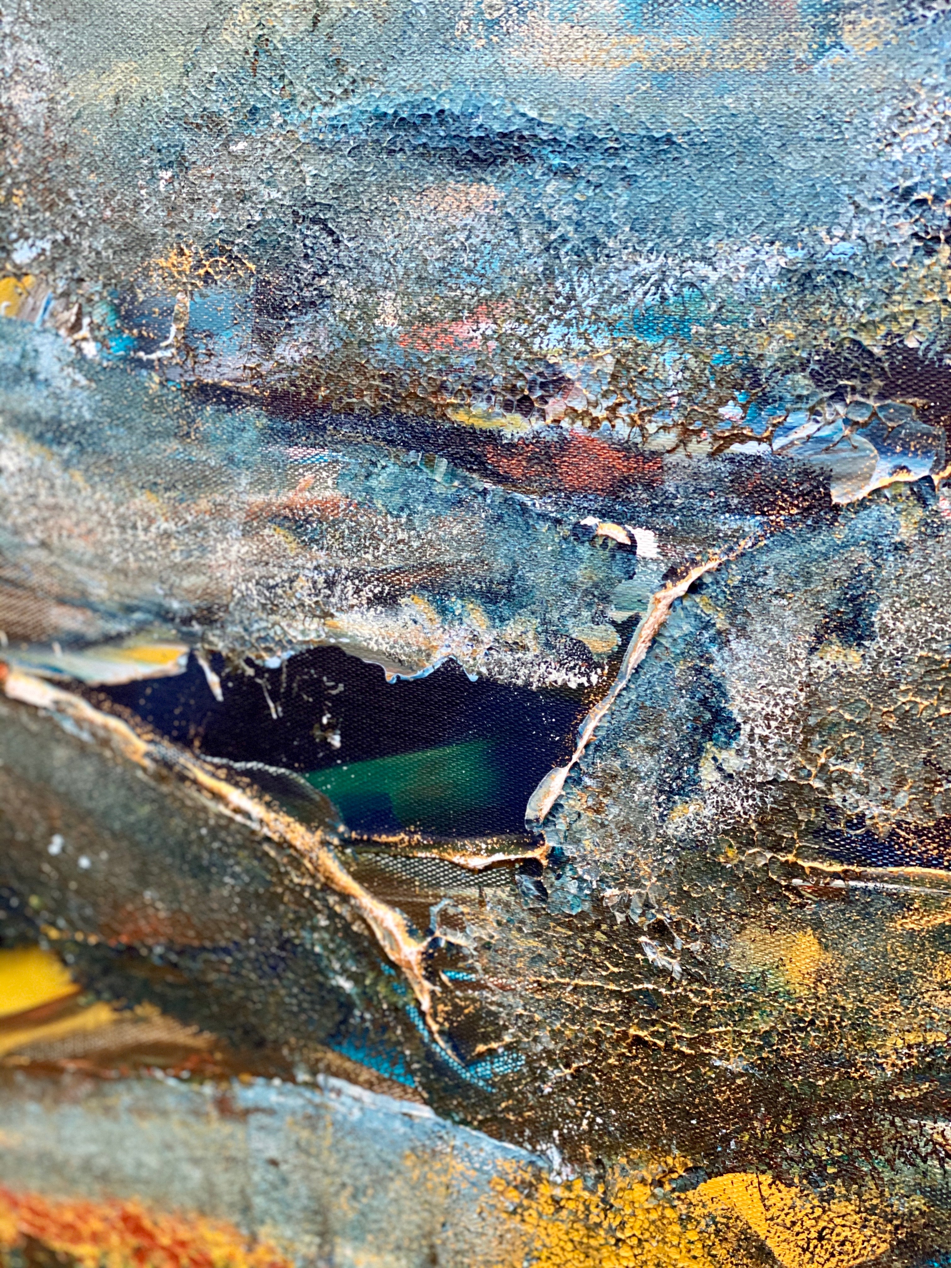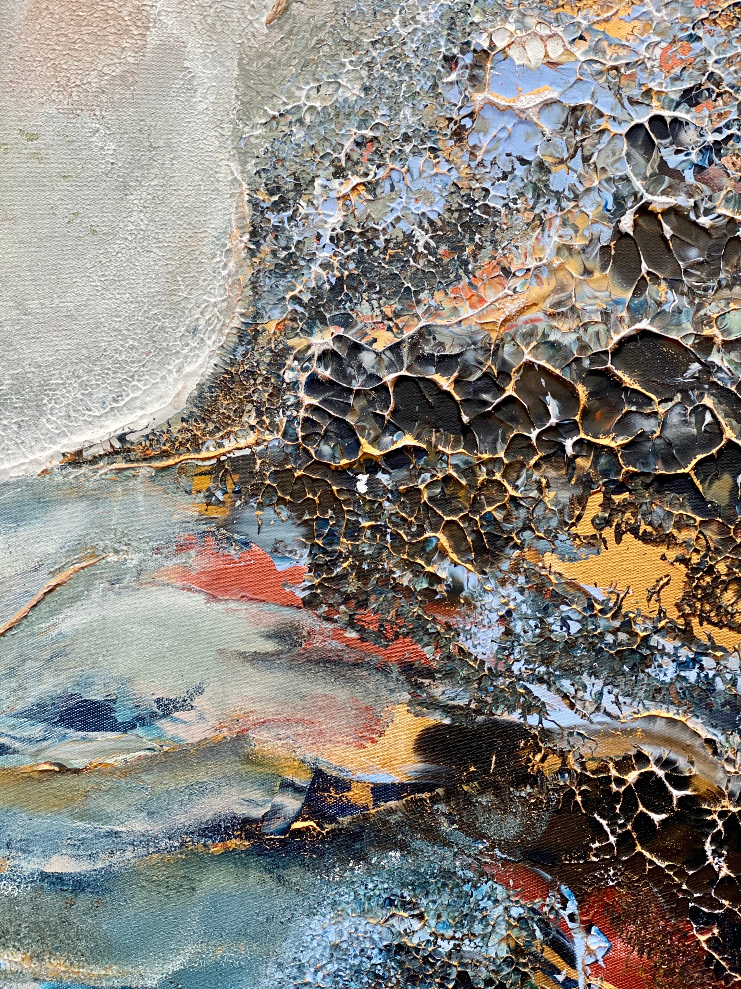 "Grundsviken" 100x150 aus Norden von Schweden inspiriert. Ich habe viel mit den Details des Gemäldes experimentiert, um eine Mischung zwischen warm und kalt zu erstellen. Ich verehre absolut, wie der rosa Glanz von der oberen rechten Ecke das dunkle und kalte Wasser von unten trifft.