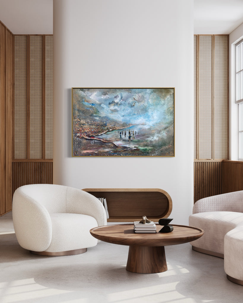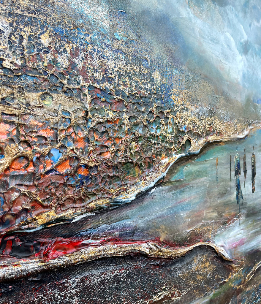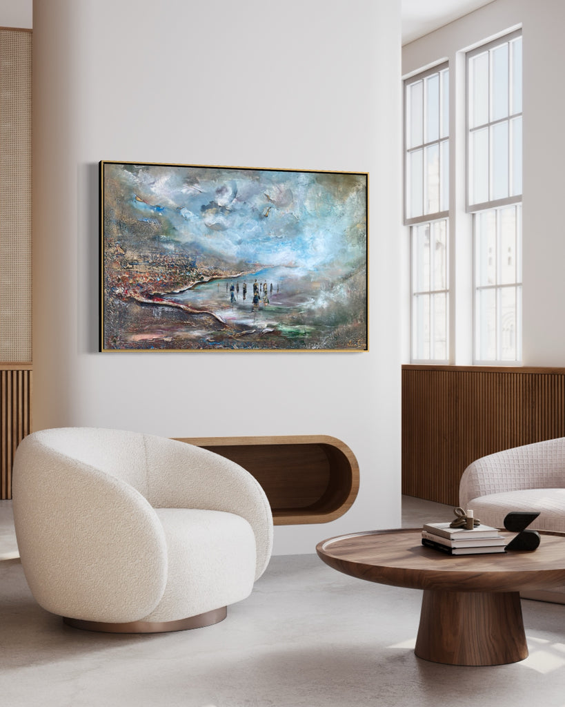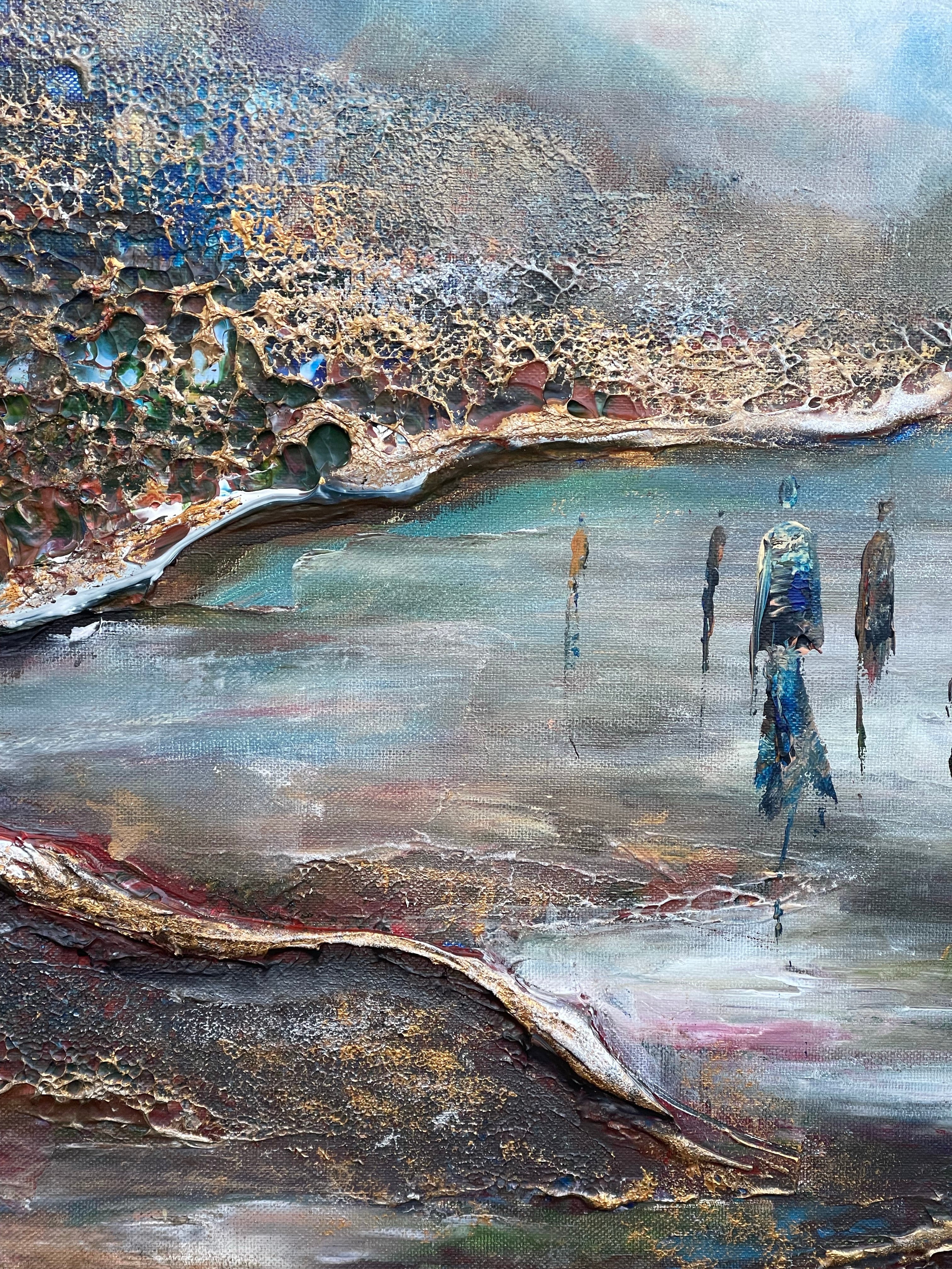 Ich mag besonders die sehr sehr dicken Farbschichten, die mit goldener Farbe bedeckt sind, um ein harmonischeres Gefühl zu erzeugen. Ich habe auch viel Liebe in die Menschen gesteckt, die alle sehr detailliert mit unterschiedlichen Mustern und Farben auf ihrer Kleidung sind.