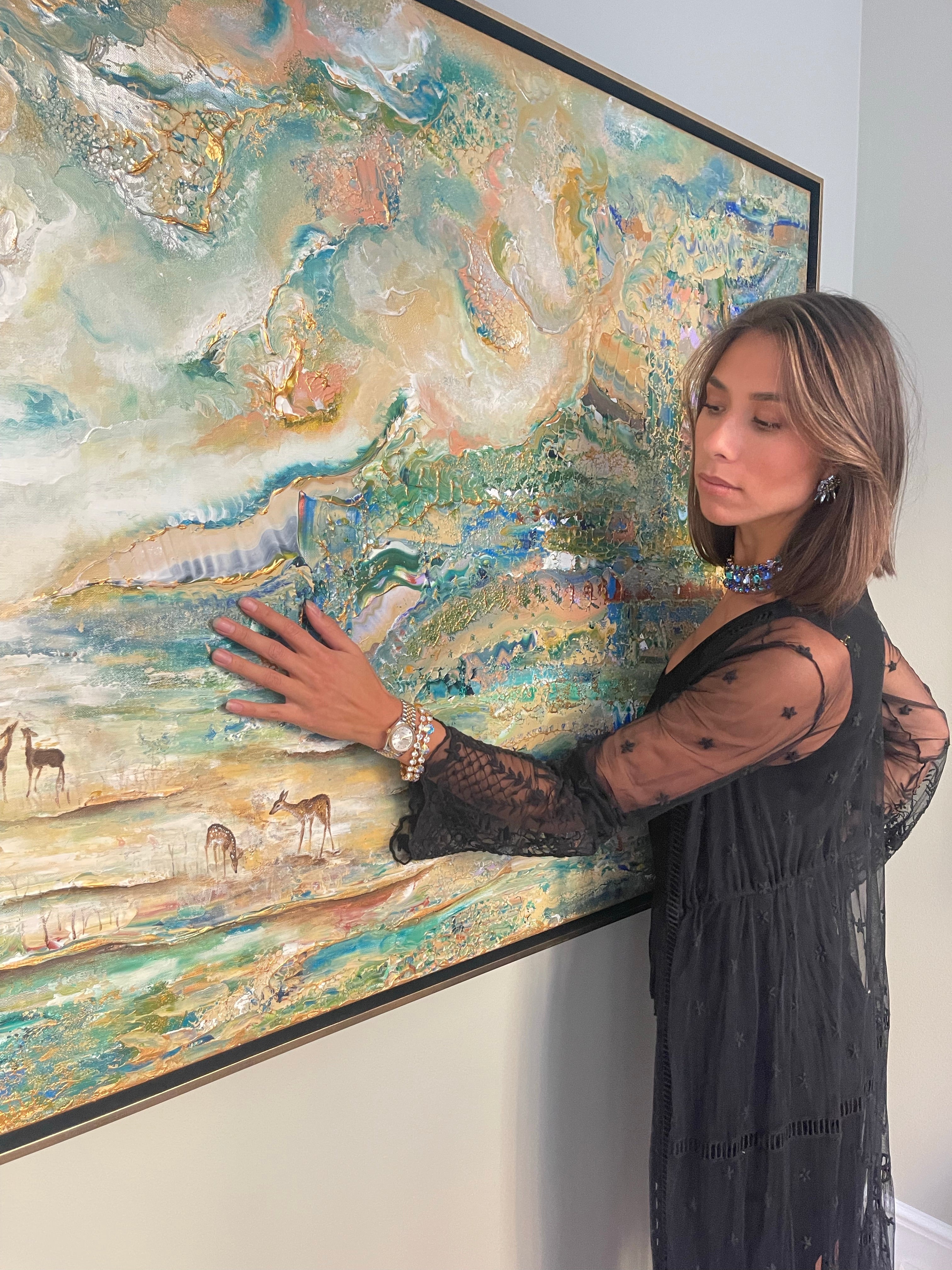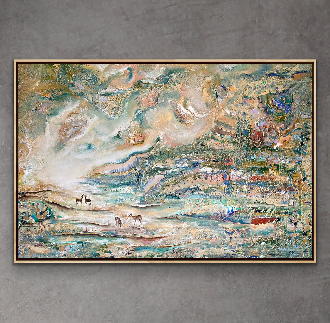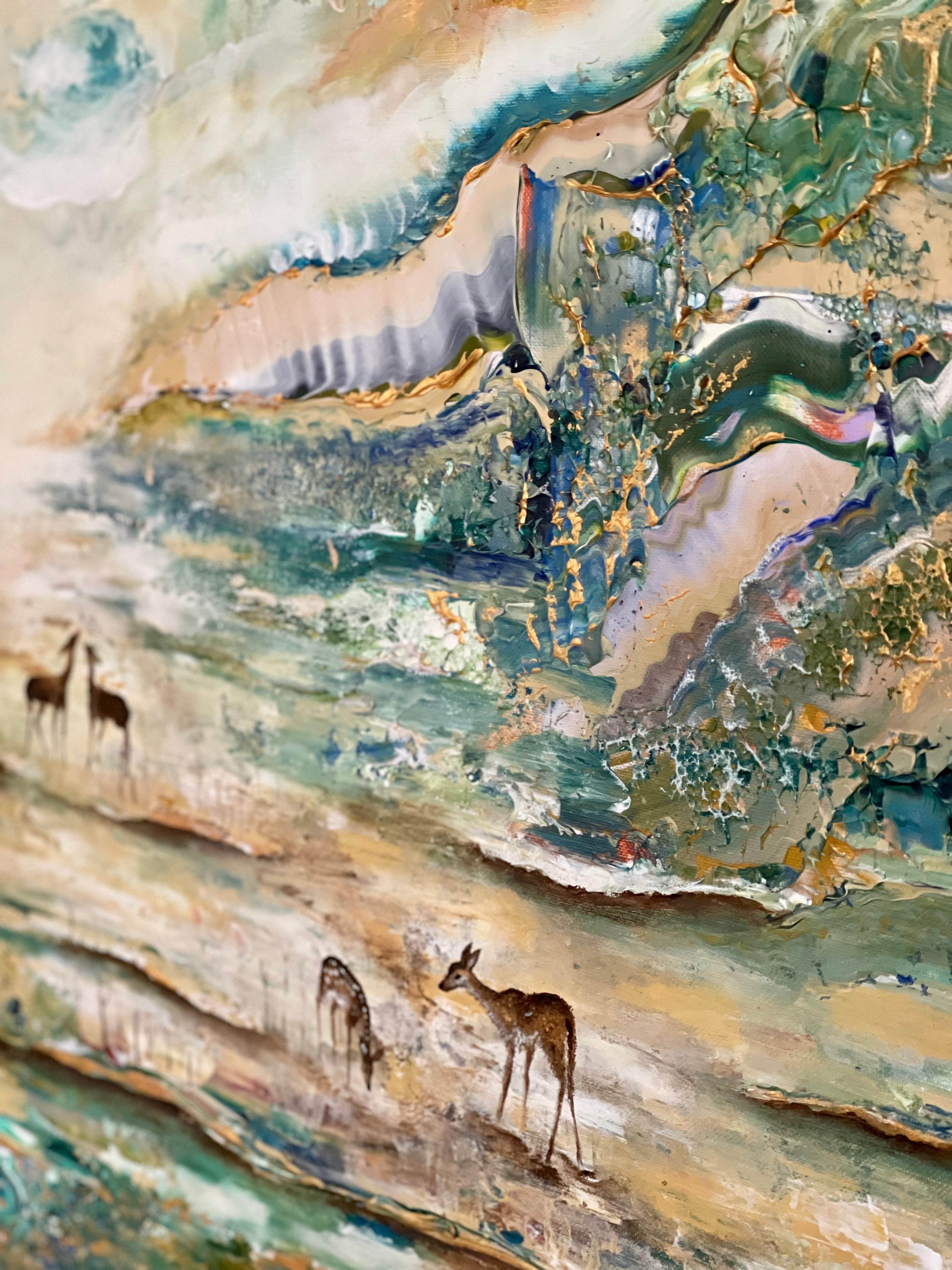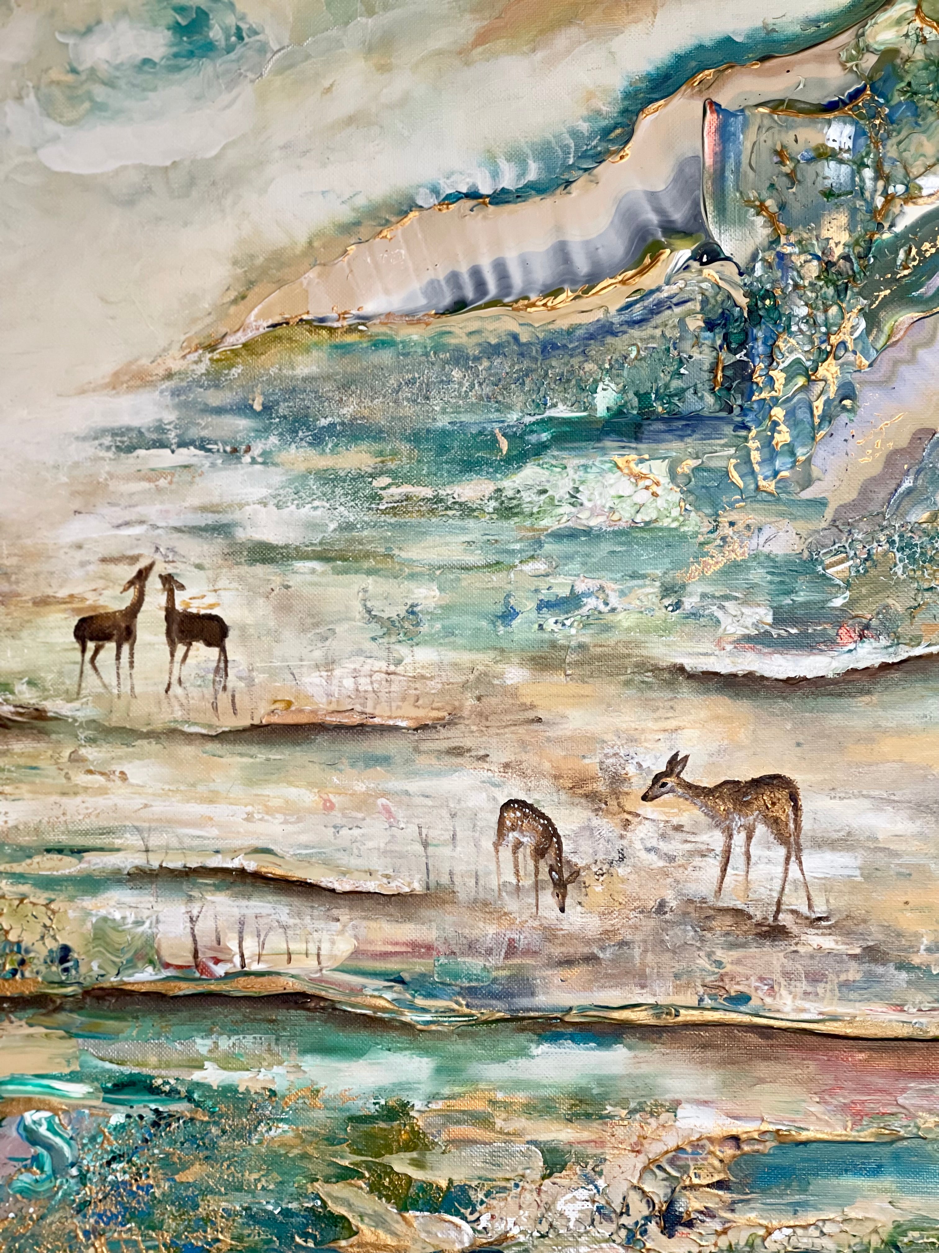 Ich fühle mich sehr harmonisch, wenn ich "Hirsche in Galärparken" betrachte. Während des Malprozesses fand ich Inspiration in dem Grün, von dem Djurgården umgeben ist. Es gibt viele Tiere, die frei leben, was ich erstaunlich finde. Außerdem habe ich viel an der Lichtquelle gearbeitet und bin so zufrieden mit dem Ergebnis. Ich hätte gerne während ihres Spaziergangs in Galaärpark die Gesellschaft des Hirsches gemacht!