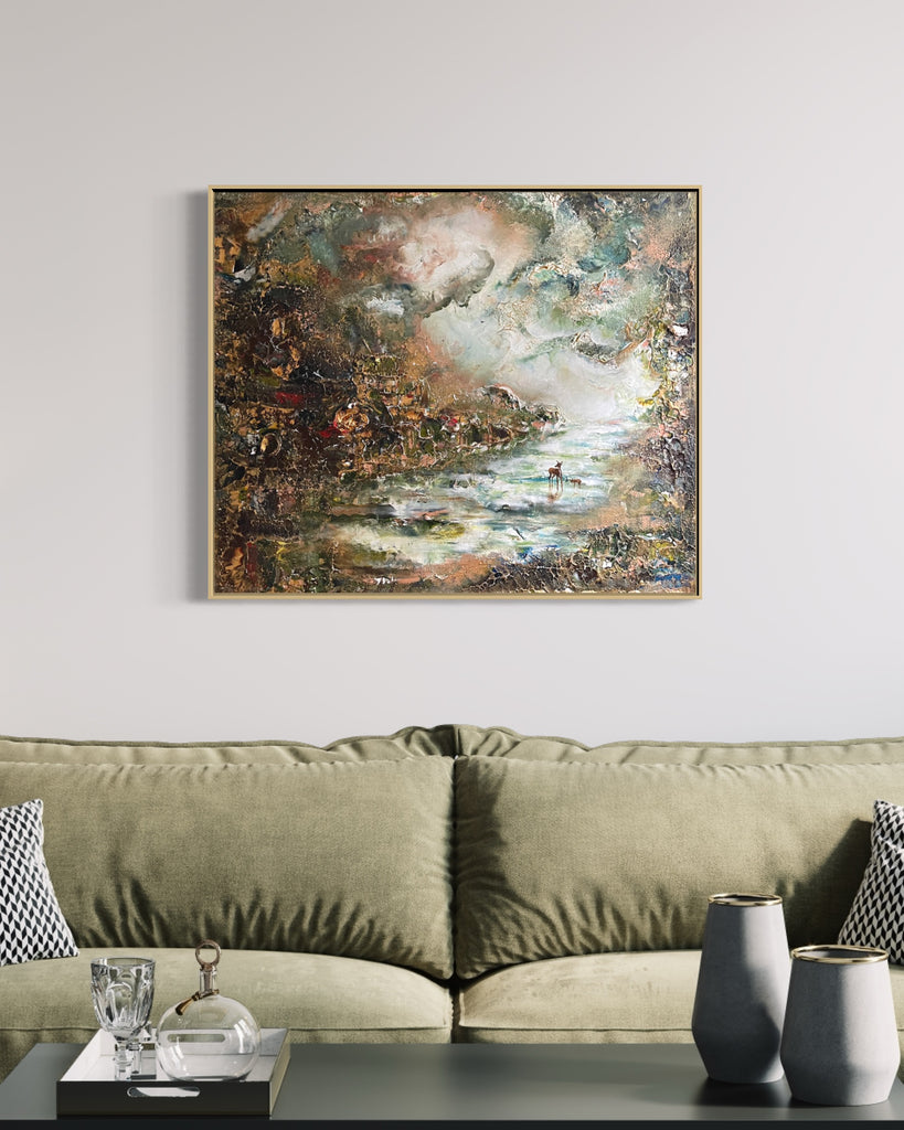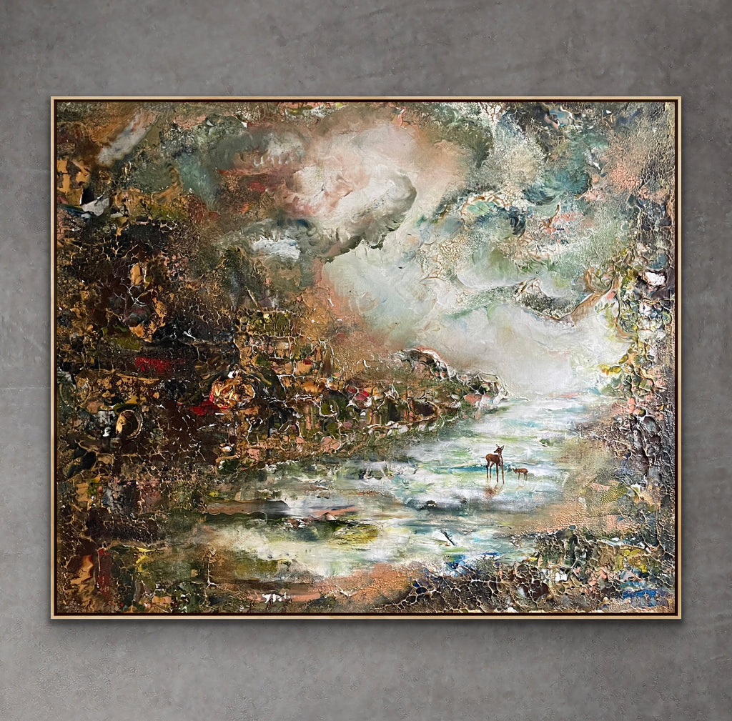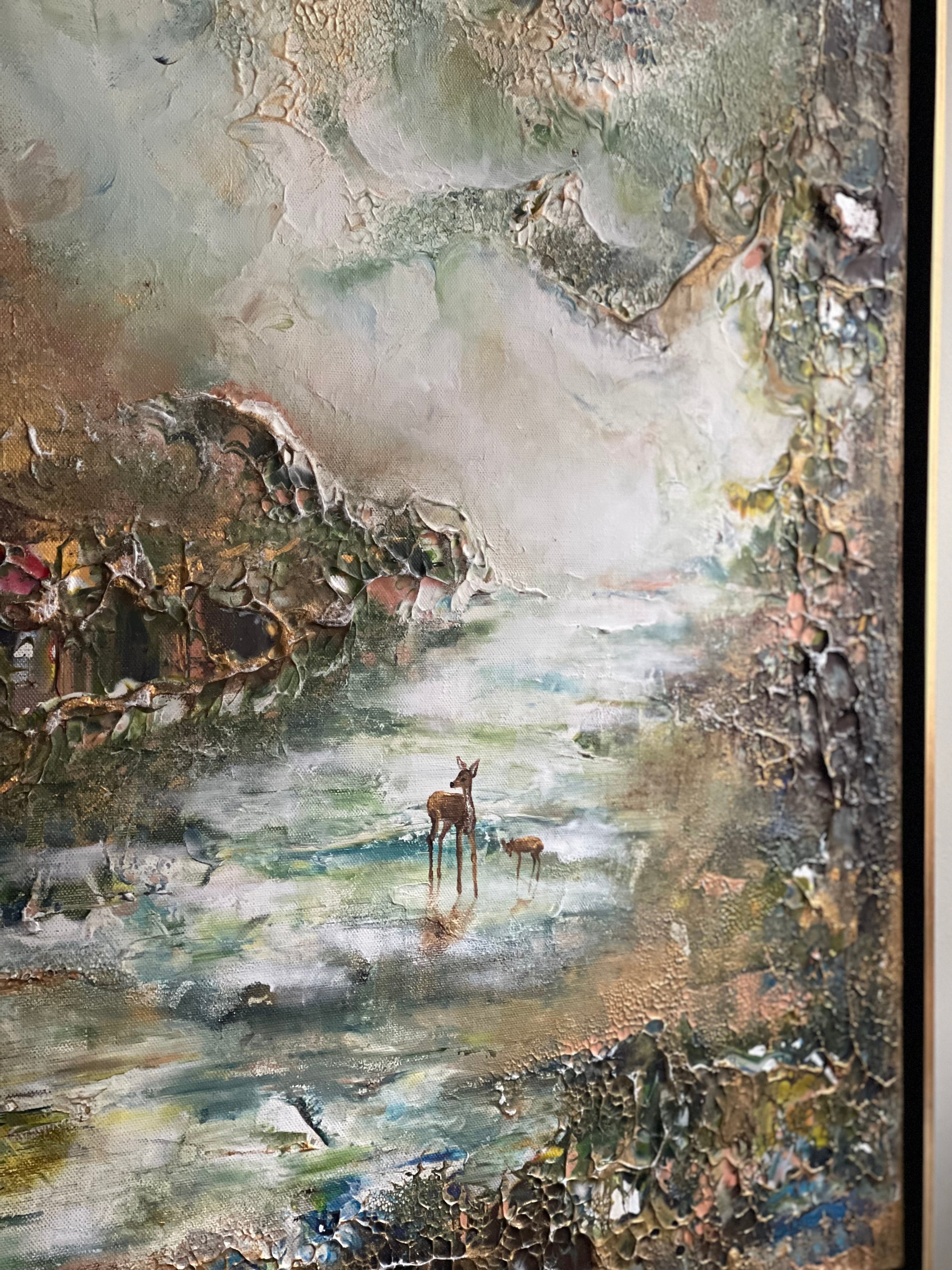 Wie Sie sehen können, hat dieses Gemälde ein mystisches Gefühl und einen etwas dramatischeren Ausdruck. Ich habe viel mit der Perspektive und der Lichtquelle gearbeitet, um diese Atmosphäre zu schaffen. Die beiden Hirsche stehen still und es sieht fast so aus, als ob sie sich im tiefen Wald verstecken. Eine weitere Interpretation ist, dass die Mutter ihr Kind vor Gefahr schützt, während sie herumfährt.