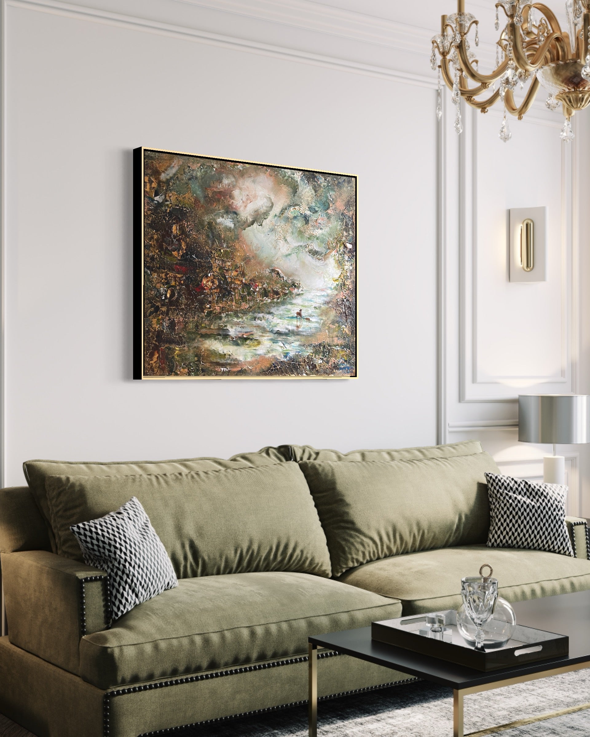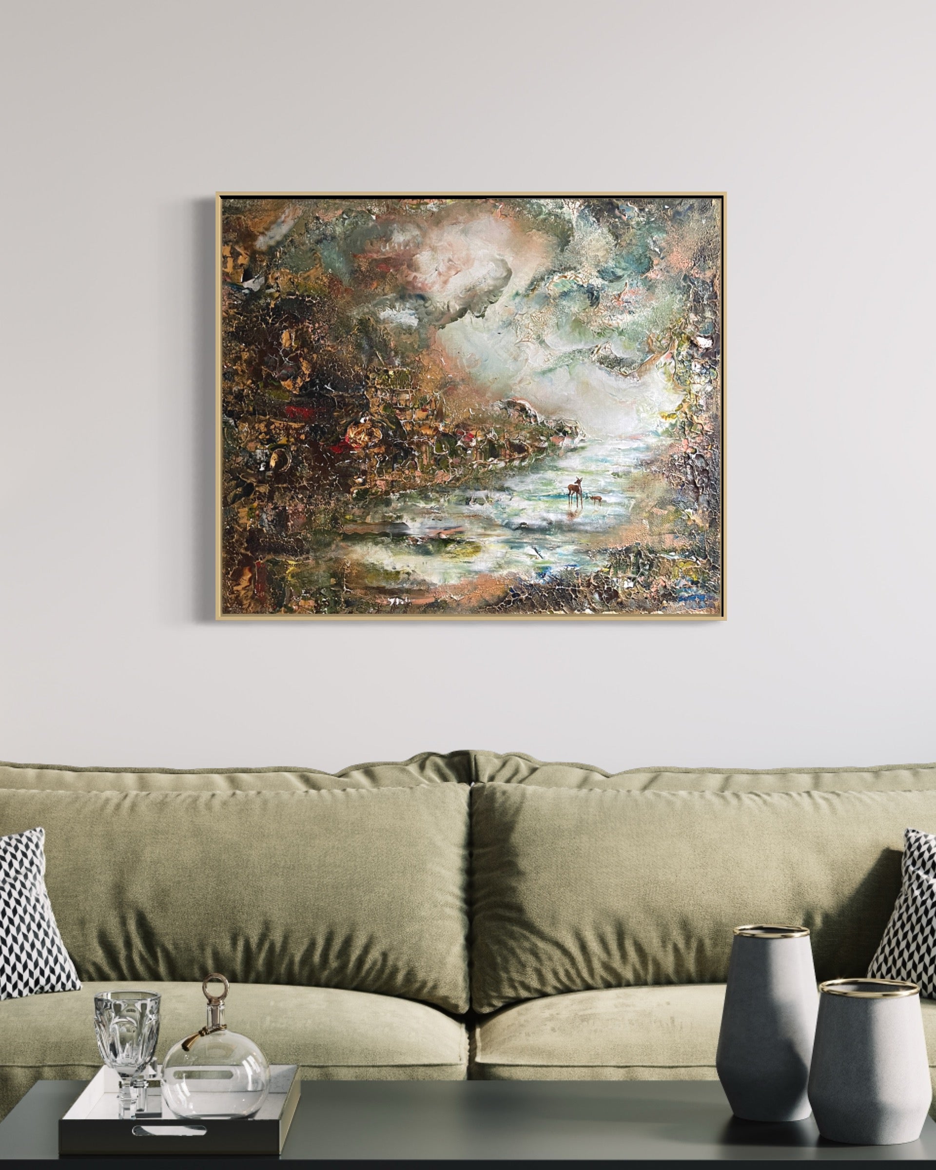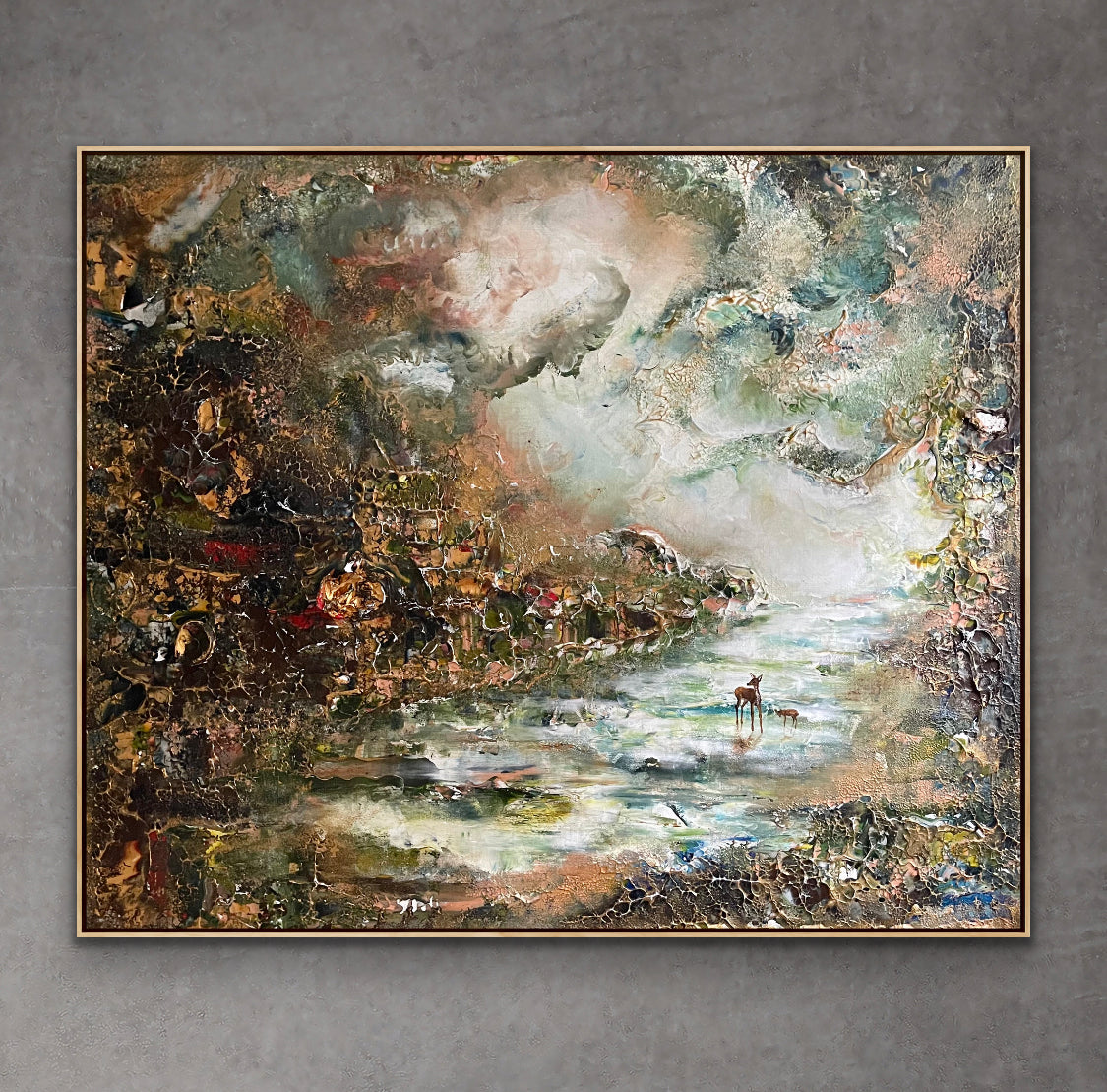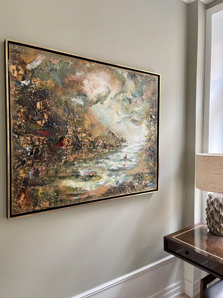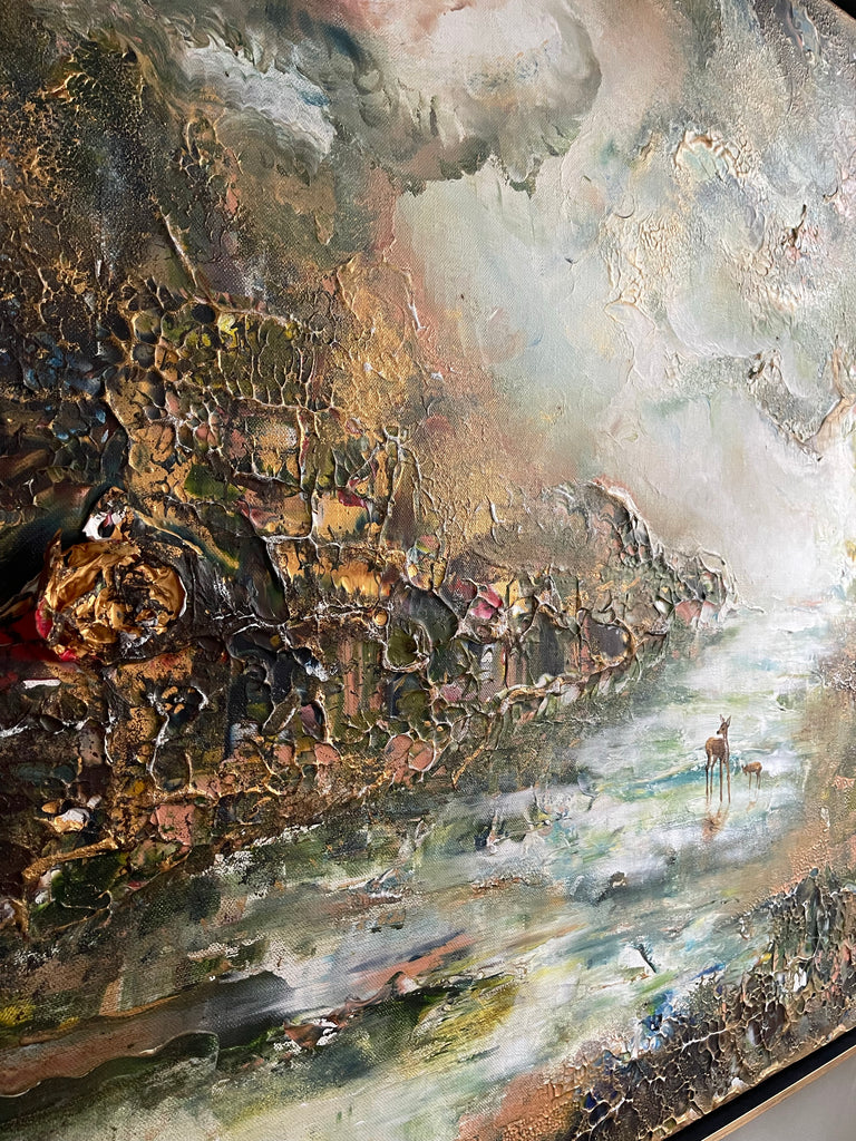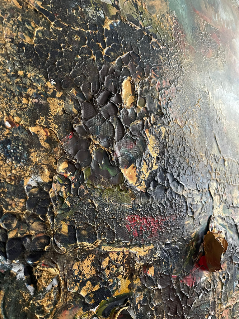 Die Farben, die ich verwendet habe, sind etwas erdiger, mit helleren Elementen und goldenen Details. Einige Teile des Gemäldes sind auch sehr dick und ich habe viel mit dem Trocknungsprozess gespielt.
