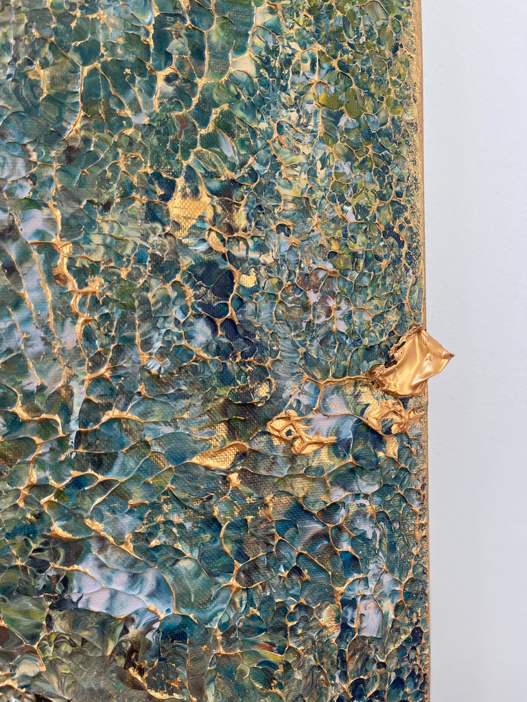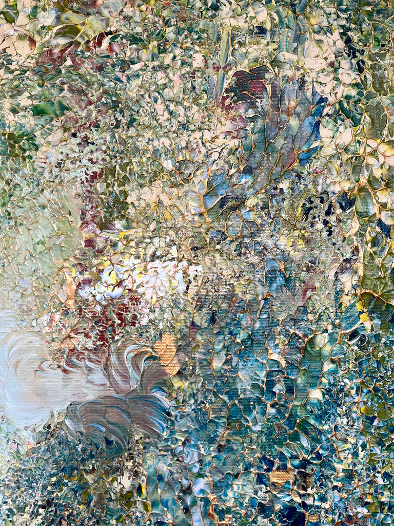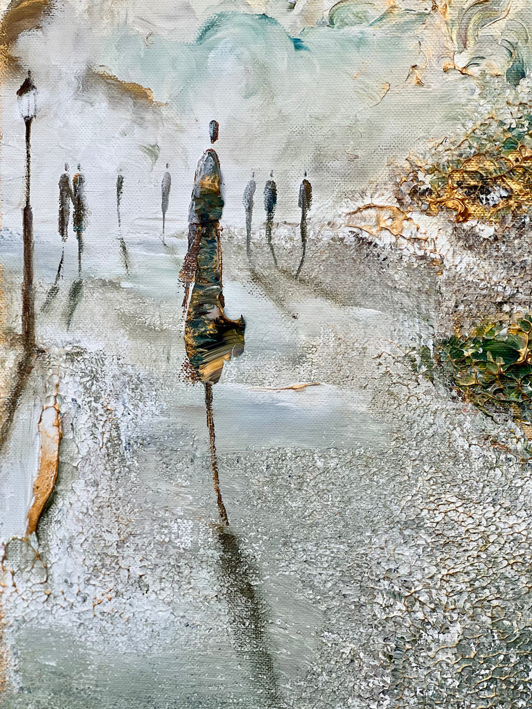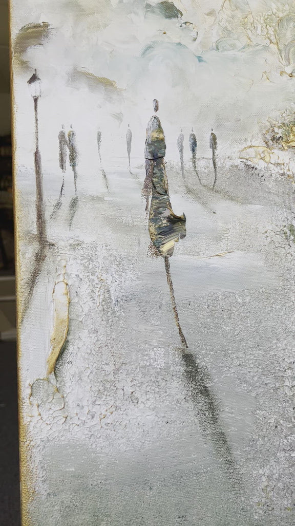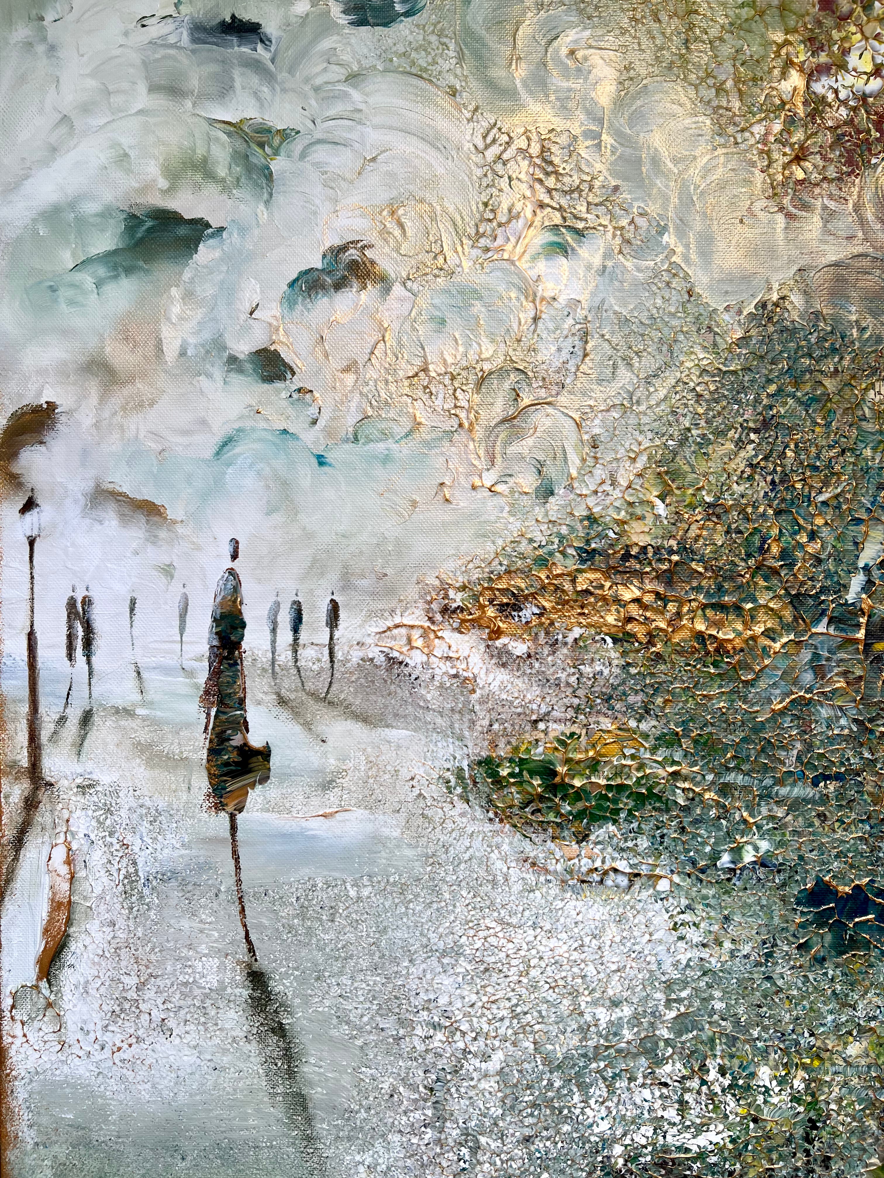 Lassen Sie mich ein neues Ausstellungsgemälde namens Ivy Street präsentieren! Ich habe versucht, ein Gleichgewicht zwischen Grün und einer Stadtatmosphäre zu schaffen. Die Details sind konkreter als gewöhnlich, zum Beispiel die Straßenlampe. Sie können auch mehrere Personen in der Ferne sehen, und ich stelle mir vor, dass sie auf einer Straße spazieren, die an einem Nachmittag oder frühen Morgen mit Efeu bedeckt sind.