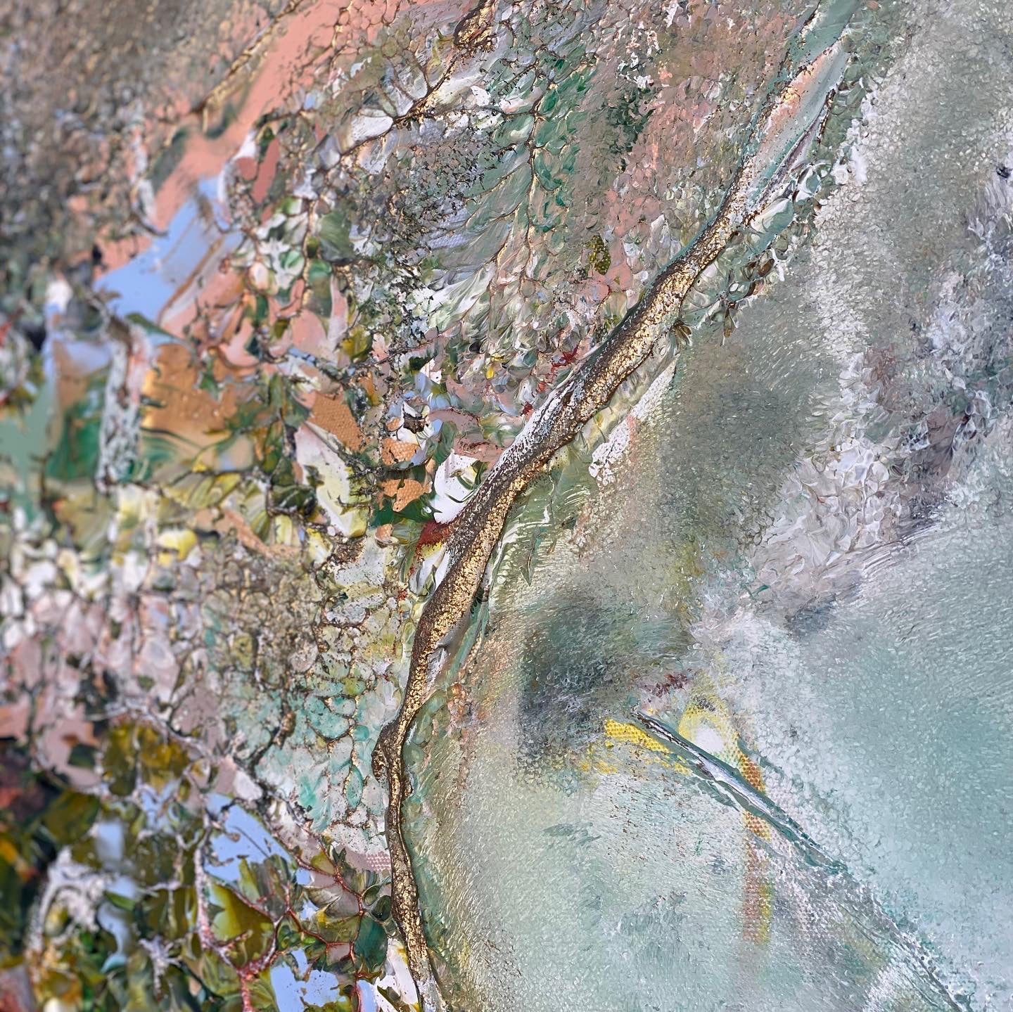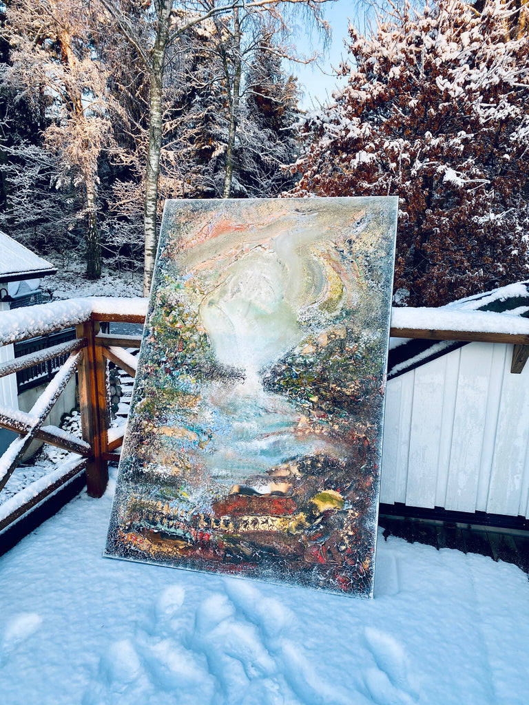 Ich freue mich sehr, mein neues Lieblingsgemälde "Ljusnan" 122x182 zu präsentieren, das viel größer ist als meine üblichen stehenden Gemälde😄 Ich denke, große Gemälde sind erstaunlich, da es sich anfühlt, als könntest du in das Gemälde die Welt betreten. Das Motiv ist eine Interpretation der schönen Farben und der Winterlandschaft im Norden Schwedens❄️