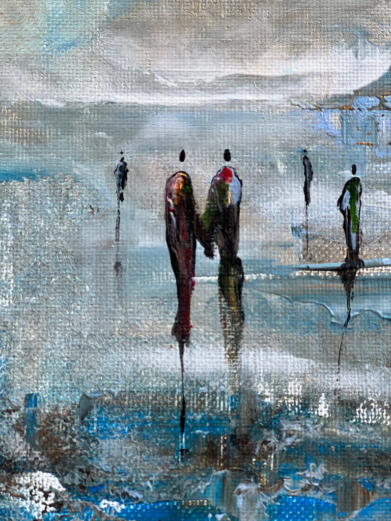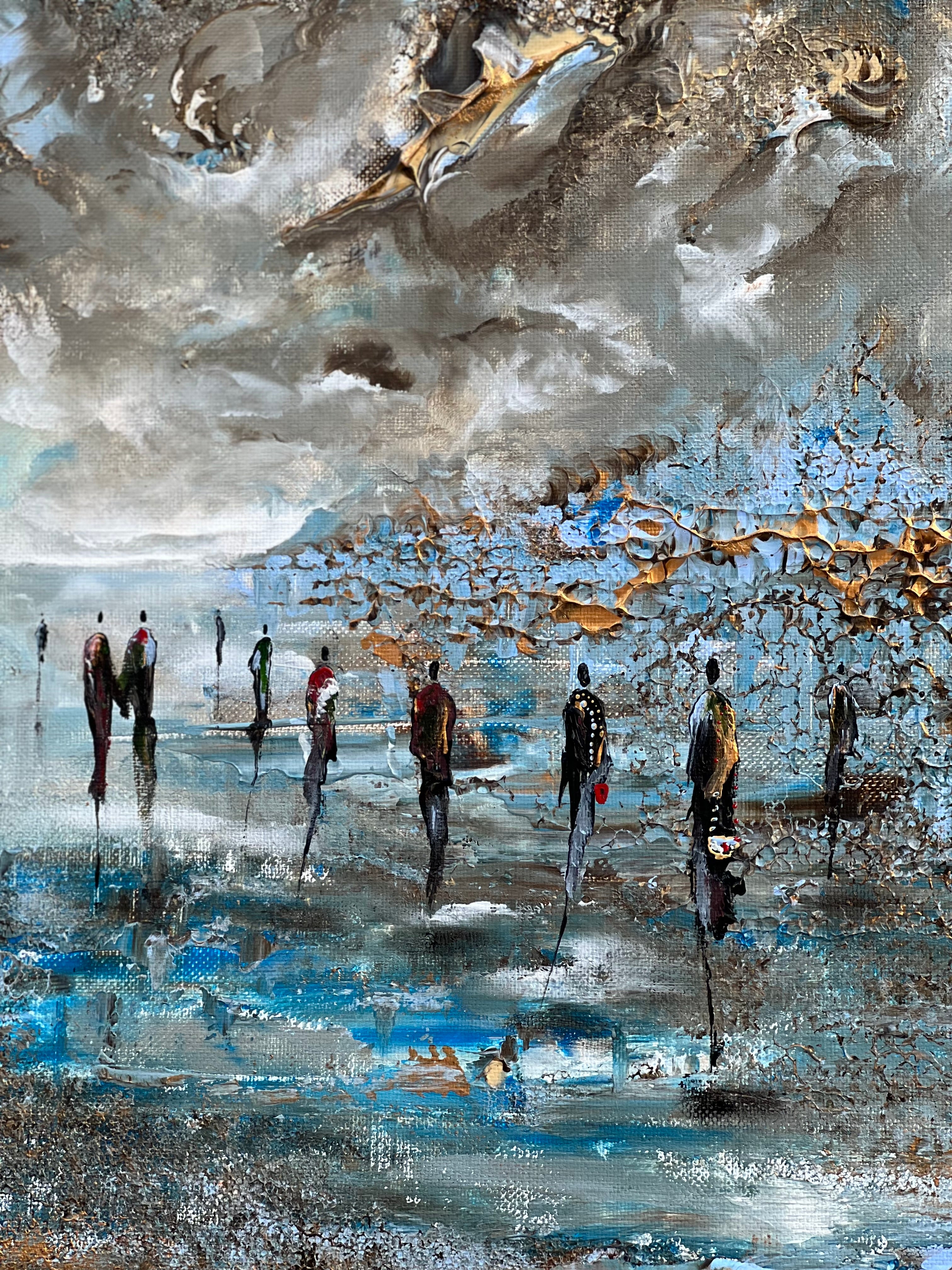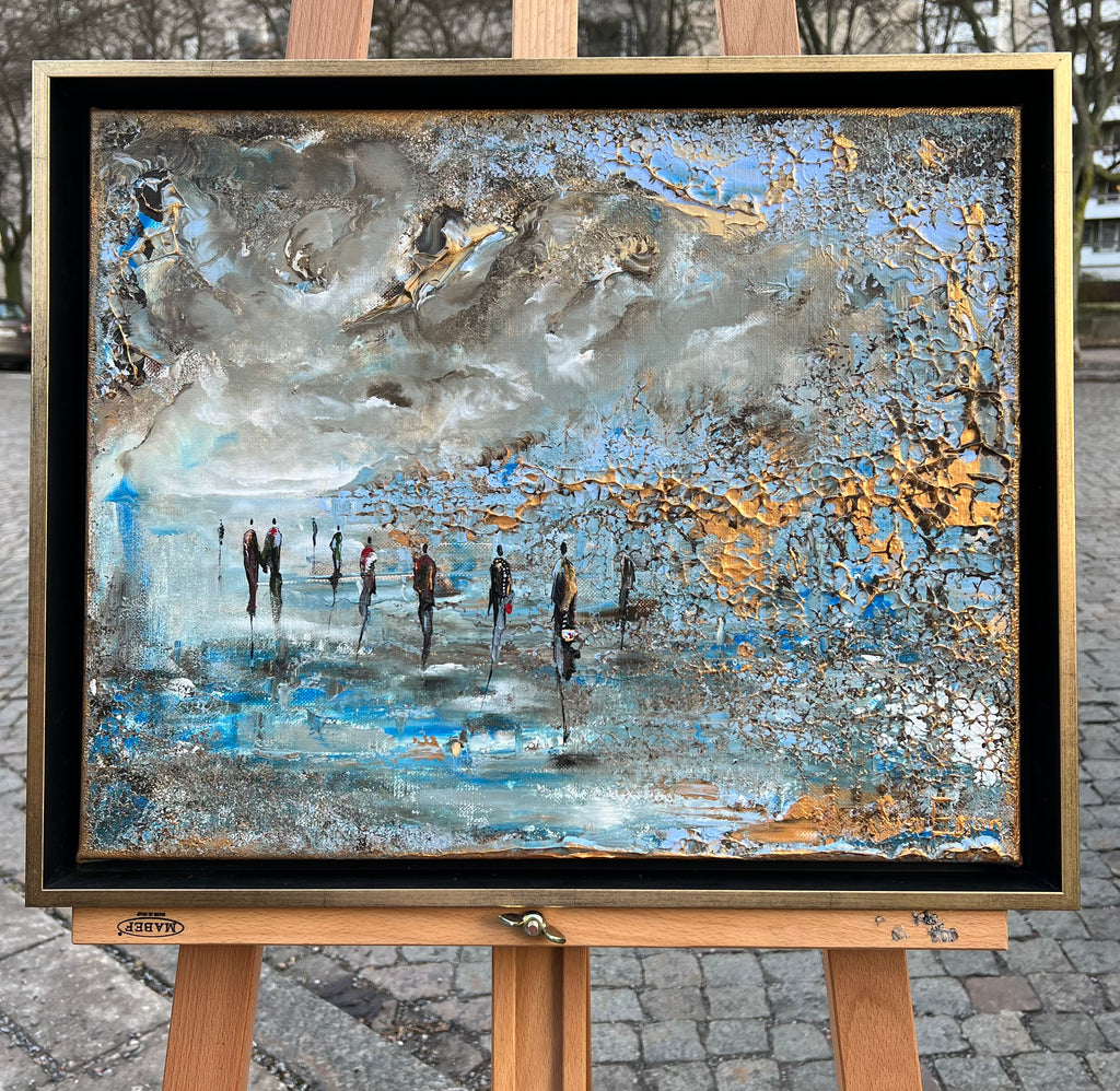 ¡Permítanme presentar las pinturas más pequeñas de la exposición, brillo en Skeppargatan! Quería capturar una luz especial que a veces cubre las calles alrededor del puerto de la ciudad aquí en Estocolmo. Skeppargatan tiene este lugar ubicado perfecto con algunos bancos que es un excelente lugar para sentarse descansando por un tiempo, y simultáneamente atrapar algunos rayos solares. Como tal, he tenido esa calle y recuerdos de allí en mi mente al pintar. Creo que logré transmitir esa luz brillante en el lienzo, y me gusta lo pacífico que se ve la gente. Casi como si estuvieran completamente libres de estrés, en un paseo dominical.
