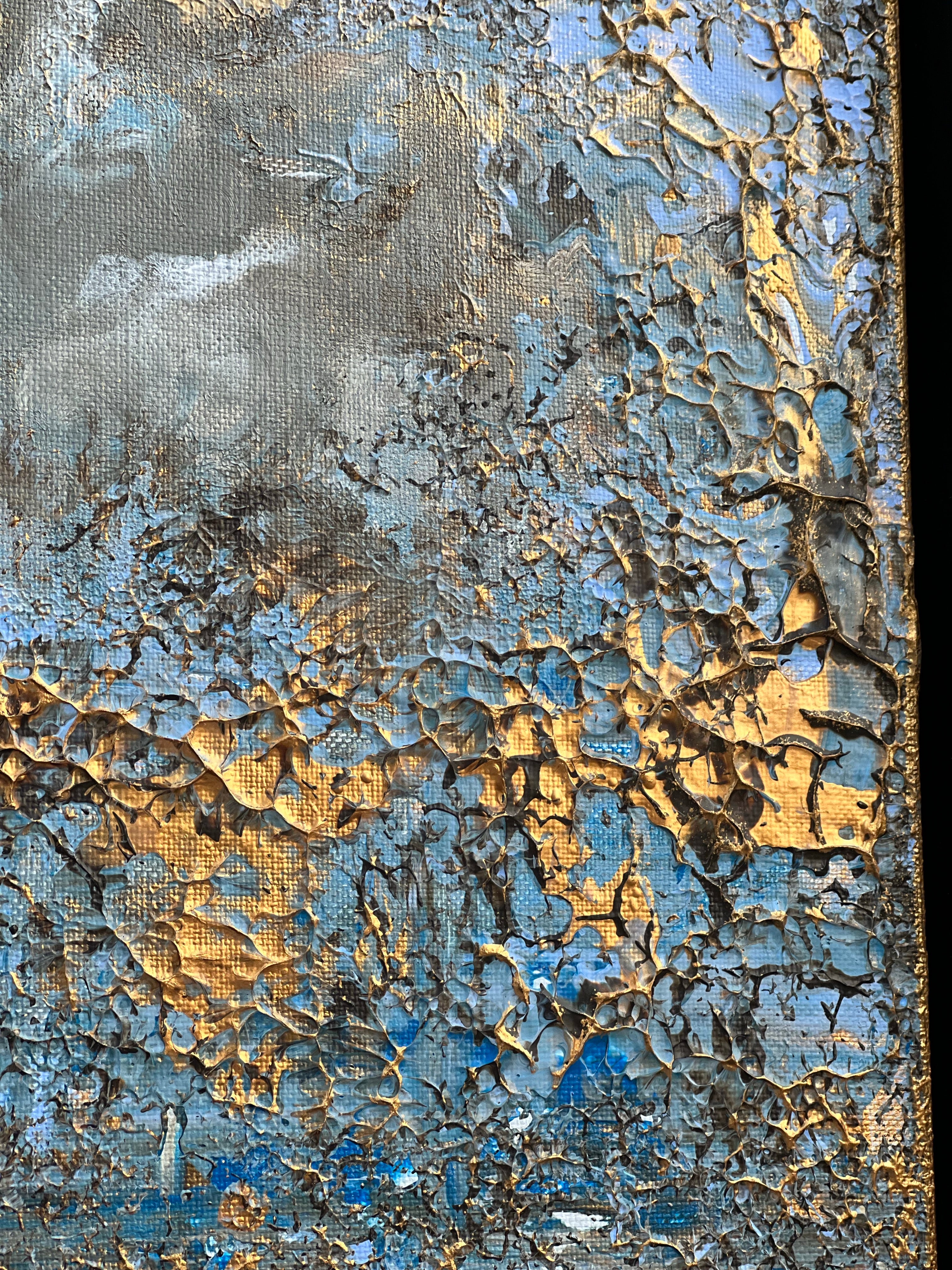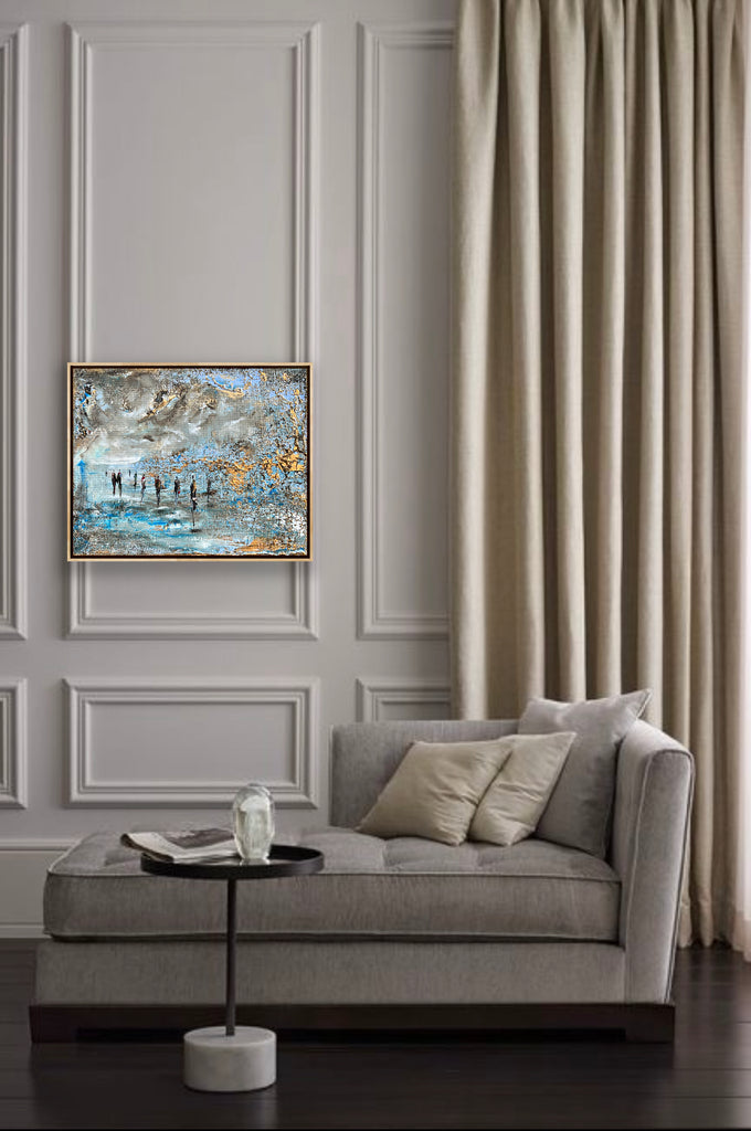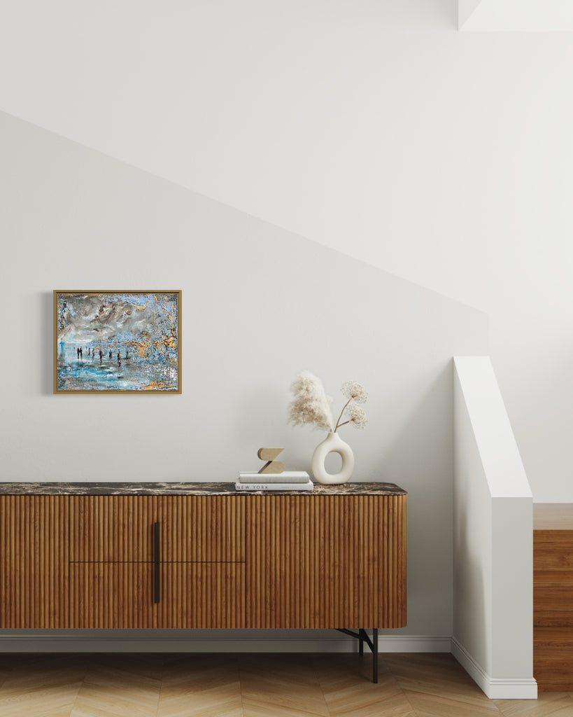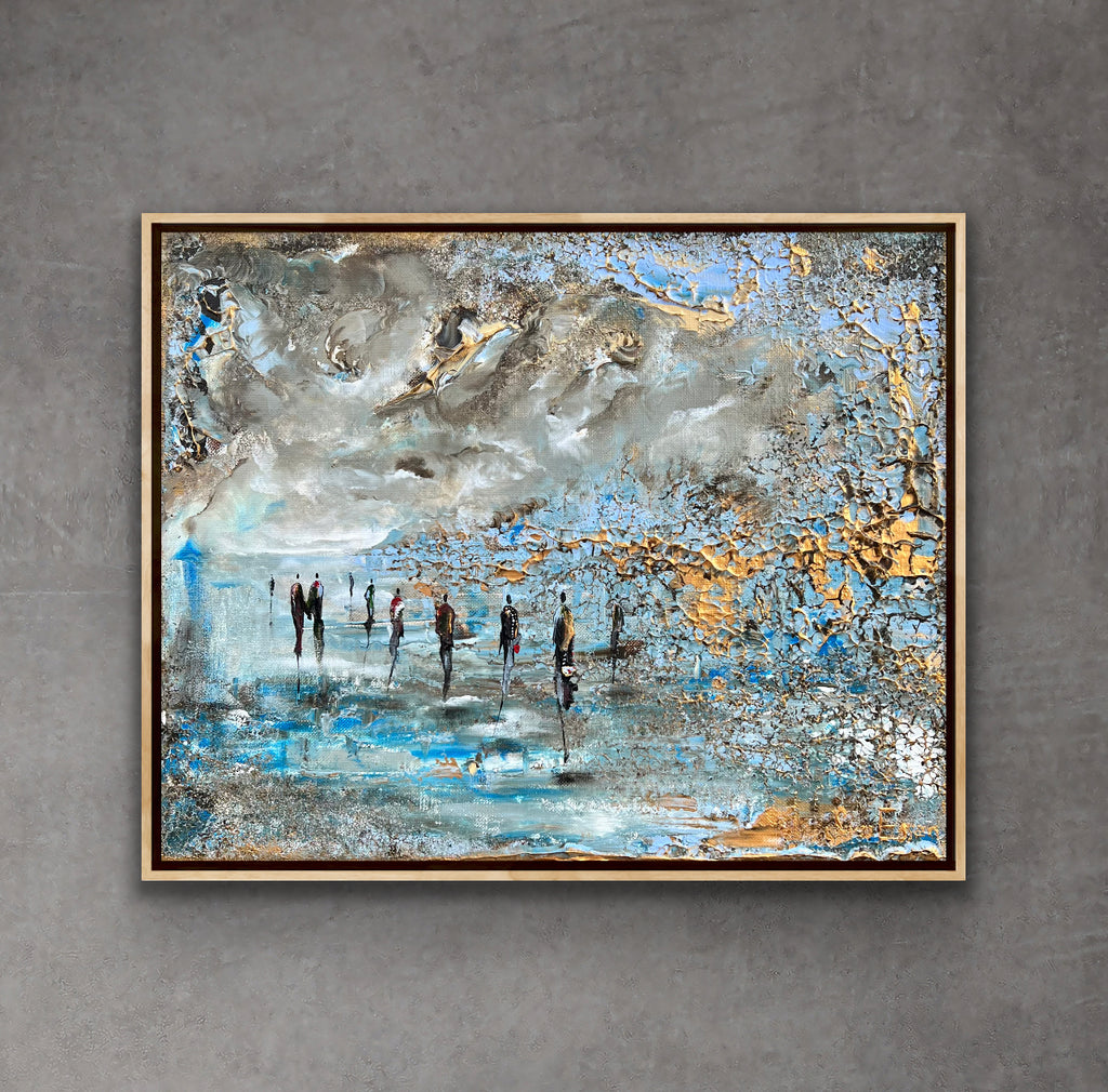 ¡Permítanme presentar las pinturas más pequeñas de la exposición, brillo en Skeppargatan! Quería capturar una luz especial que a veces cubre las calles alrededor del puerto de la ciudad aquí en Estocolmo. Skeppargatan tiene este lugar ubicado perfecto con algunos bancos que es un excelente lugar para sentarse descansando por un tiempo, y simultáneamente atrapar algunos rayos solares. Como tal, he tenido esa calle y recuerdos de allí en mi mente al pintar. Creo que logré transmitir esa luz brillante en el lienzo, y me gusta lo pacífico que se ve la gente. Casi como si estuvieran completamente libres de estrés, en un paseo dominical.