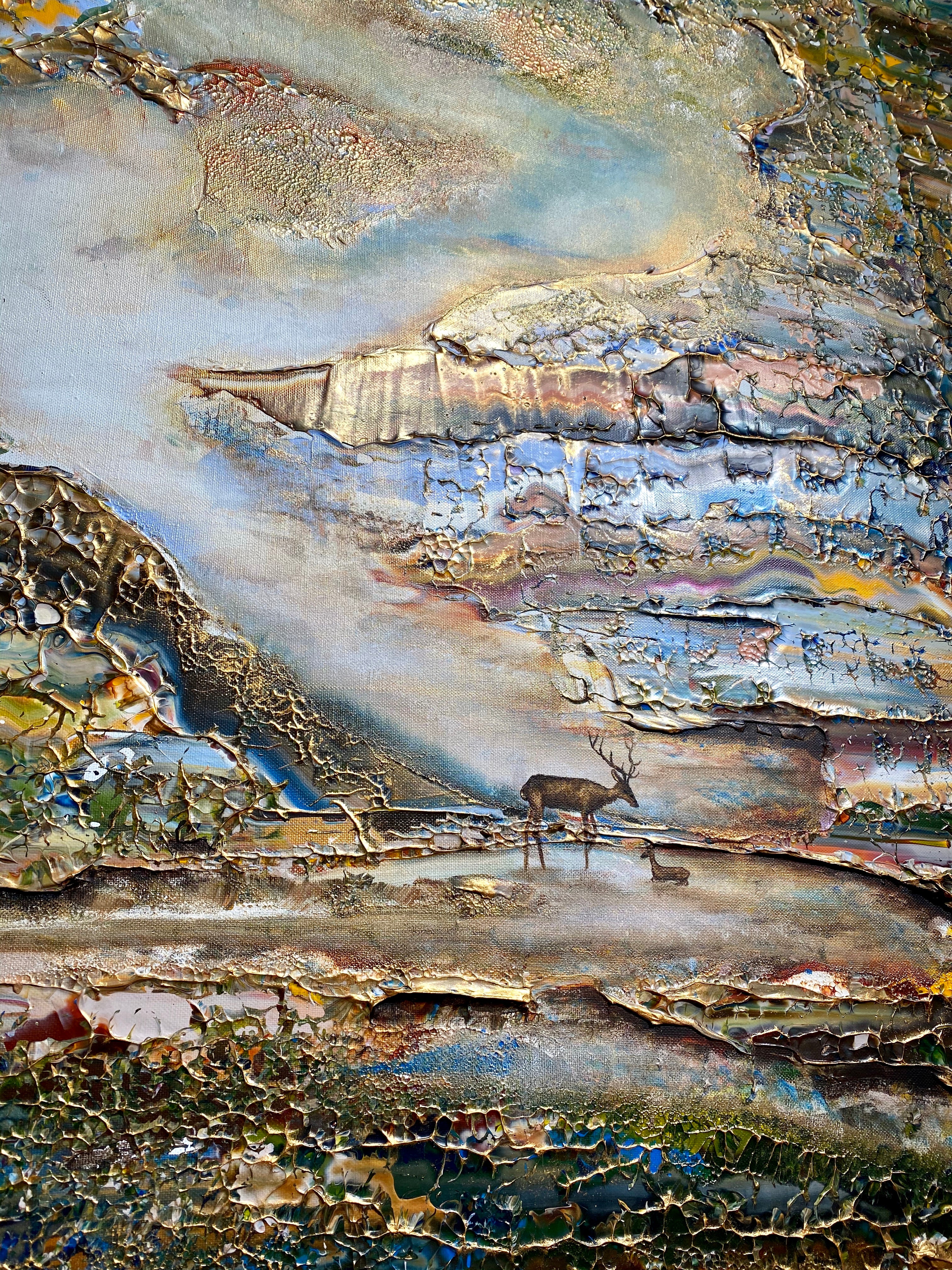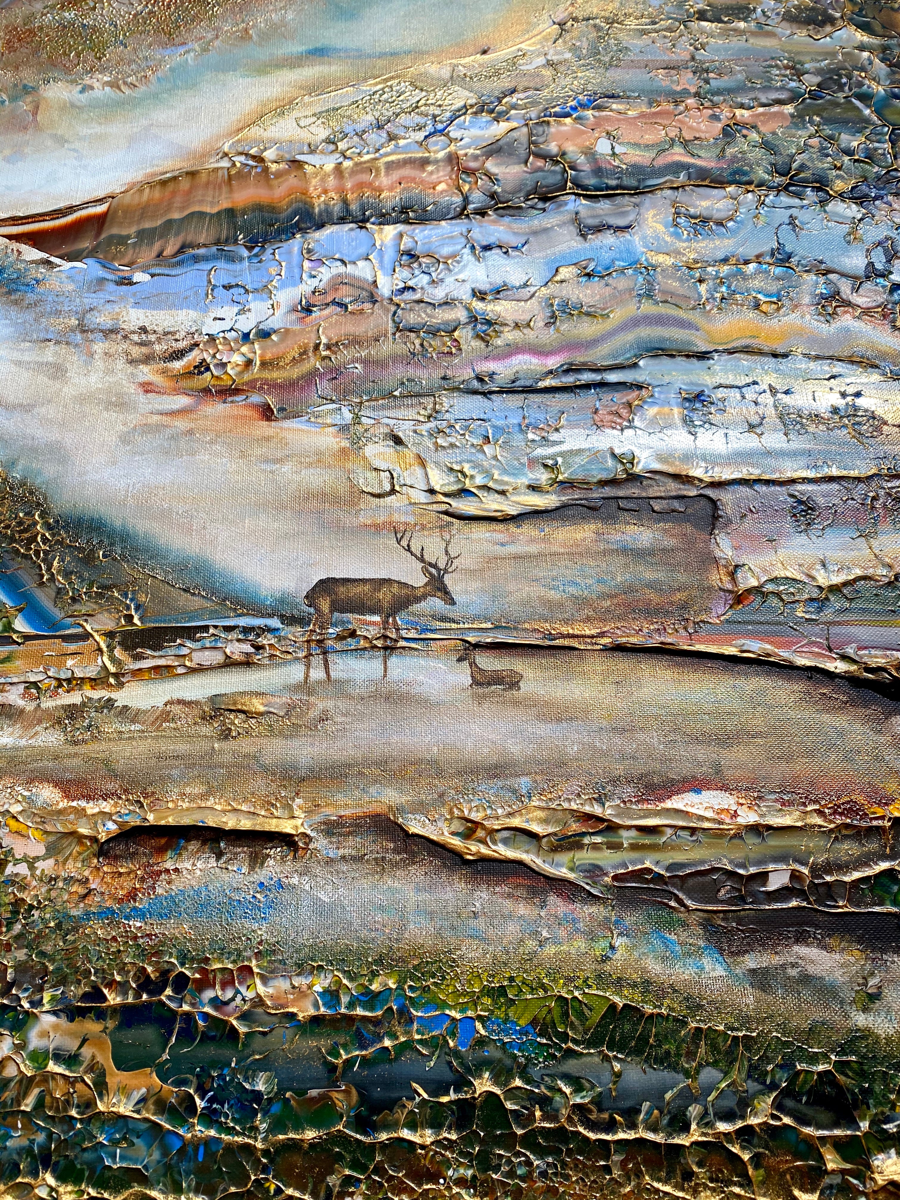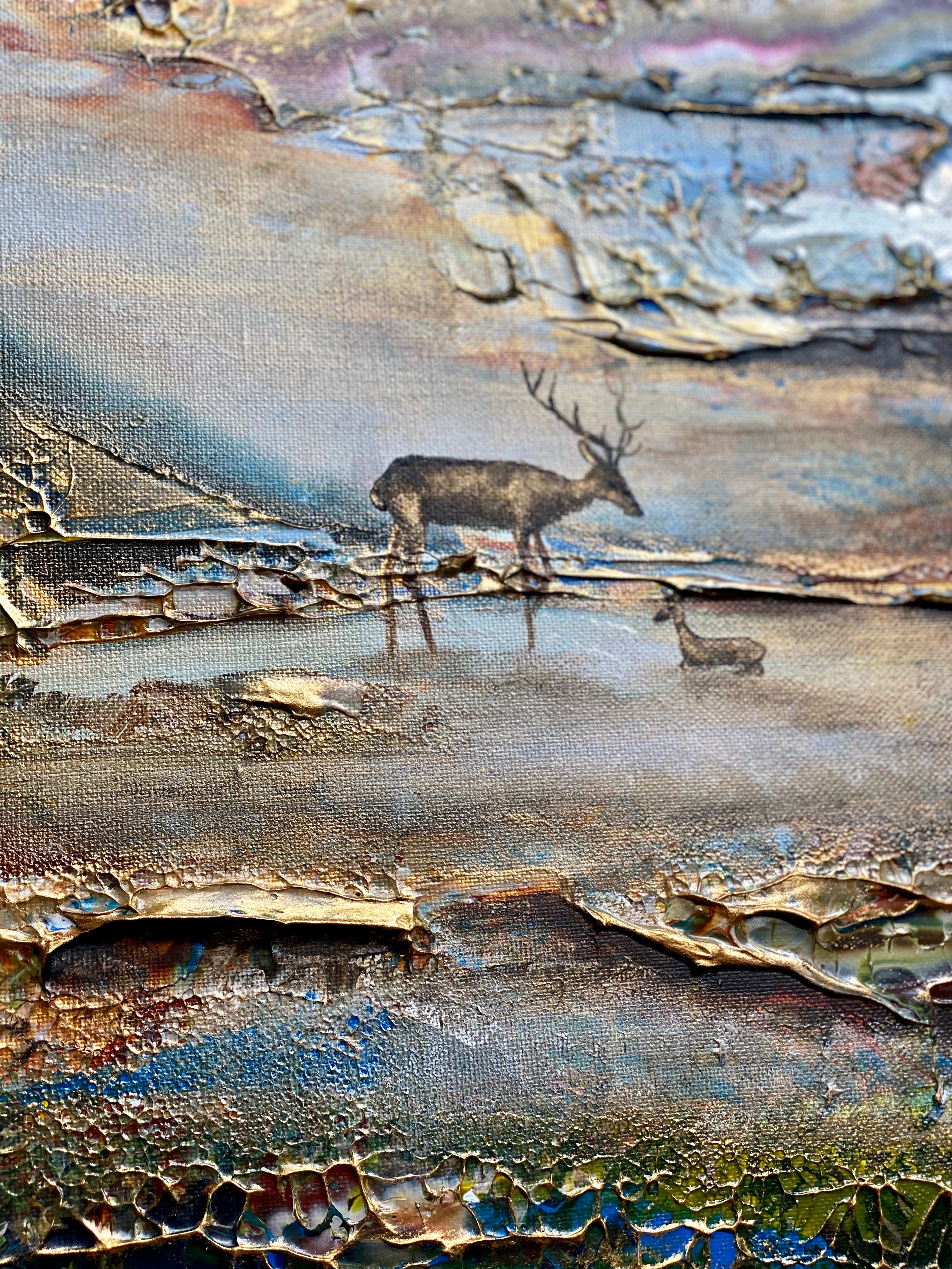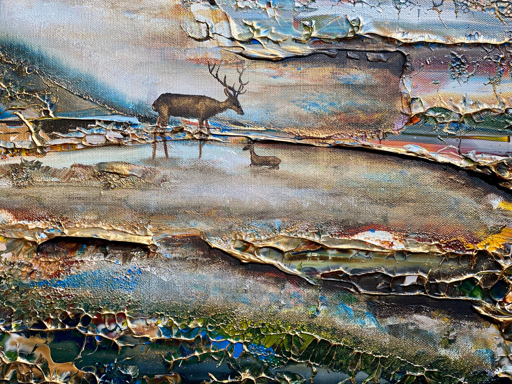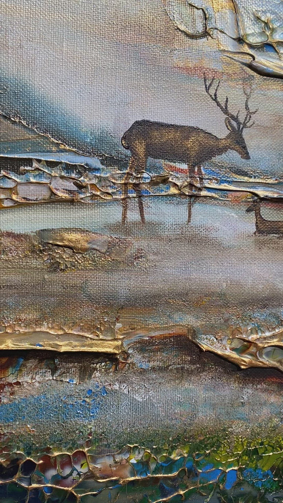 Inspirado en el encantador lago Gråviken. En esta pintura, he trabajado mucho para crear una niebla de la mañana fresca que busca su camino sobre el lago. También se encuentran dos ciervos en el lavado de agua. Me gusta especialmente la luz de la pintura que da un efecto armonioso y romántico.