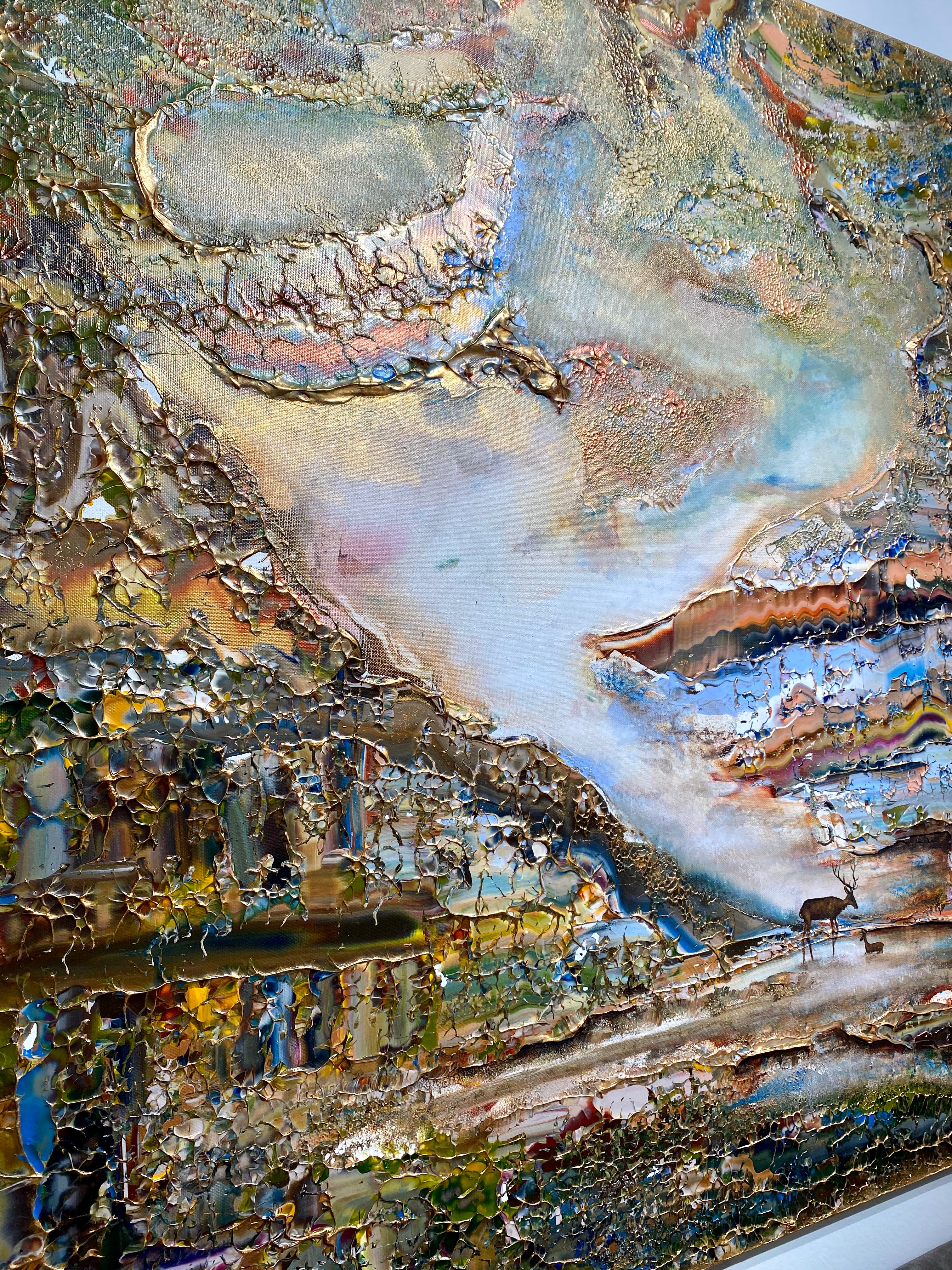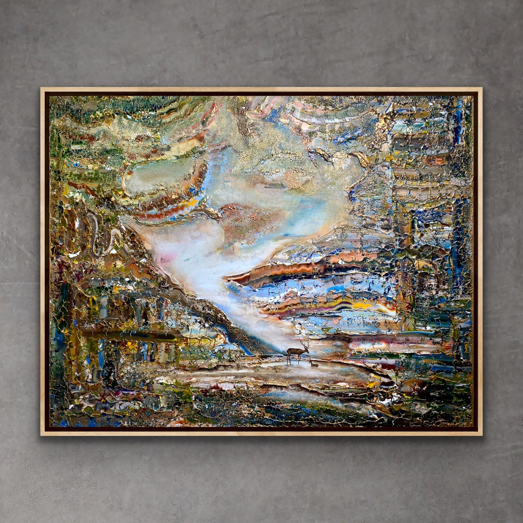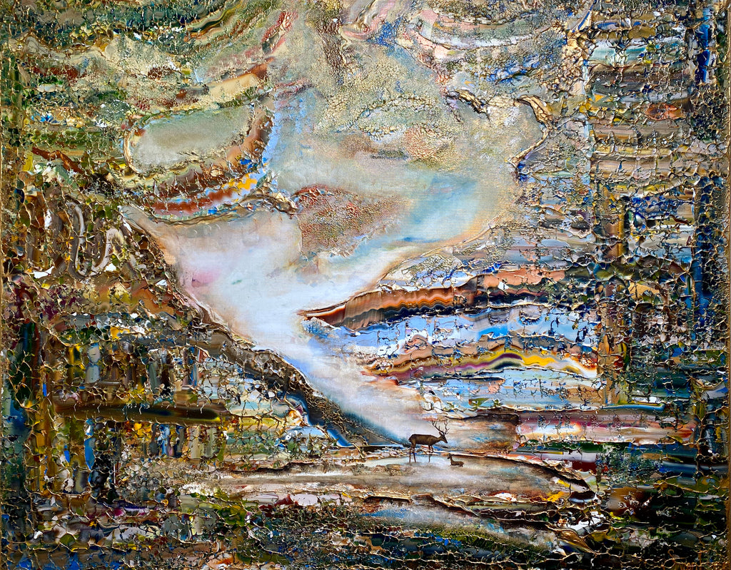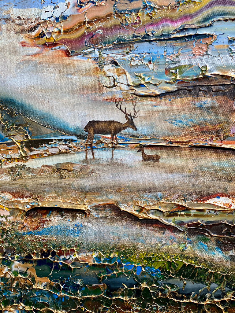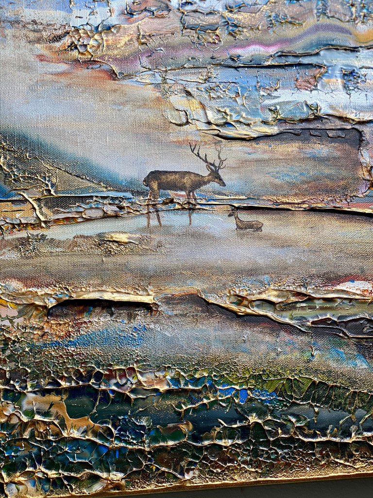 Inspirado en el encantador lago Gråviken. En esta pintura, he trabajado mucho para crear una niebla de la mañana fresca que busca su camino sobre el lago. También se encuentran dos ciervos en el lavado de agua. Me gusta especialmente la luz de la pintura que da un efecto armonioso y romántico.