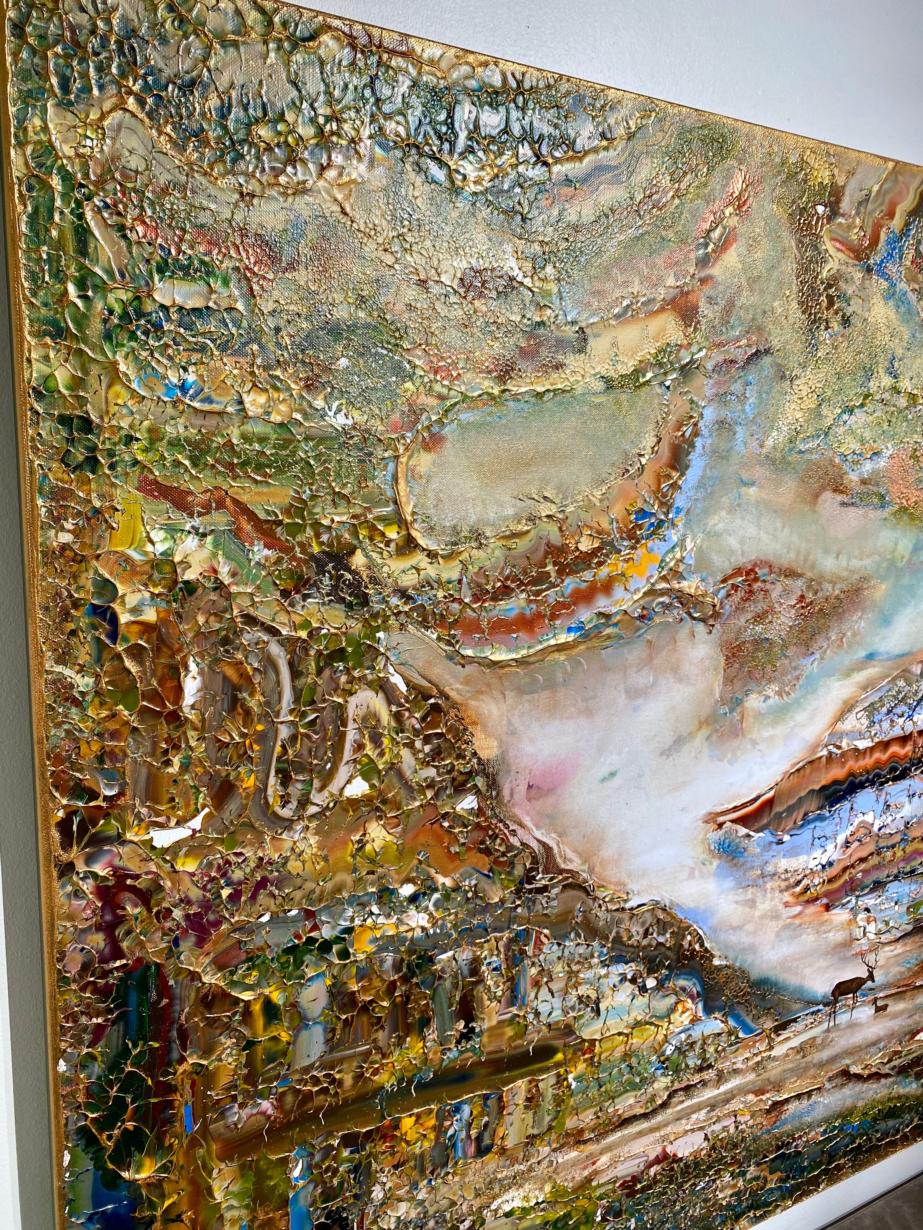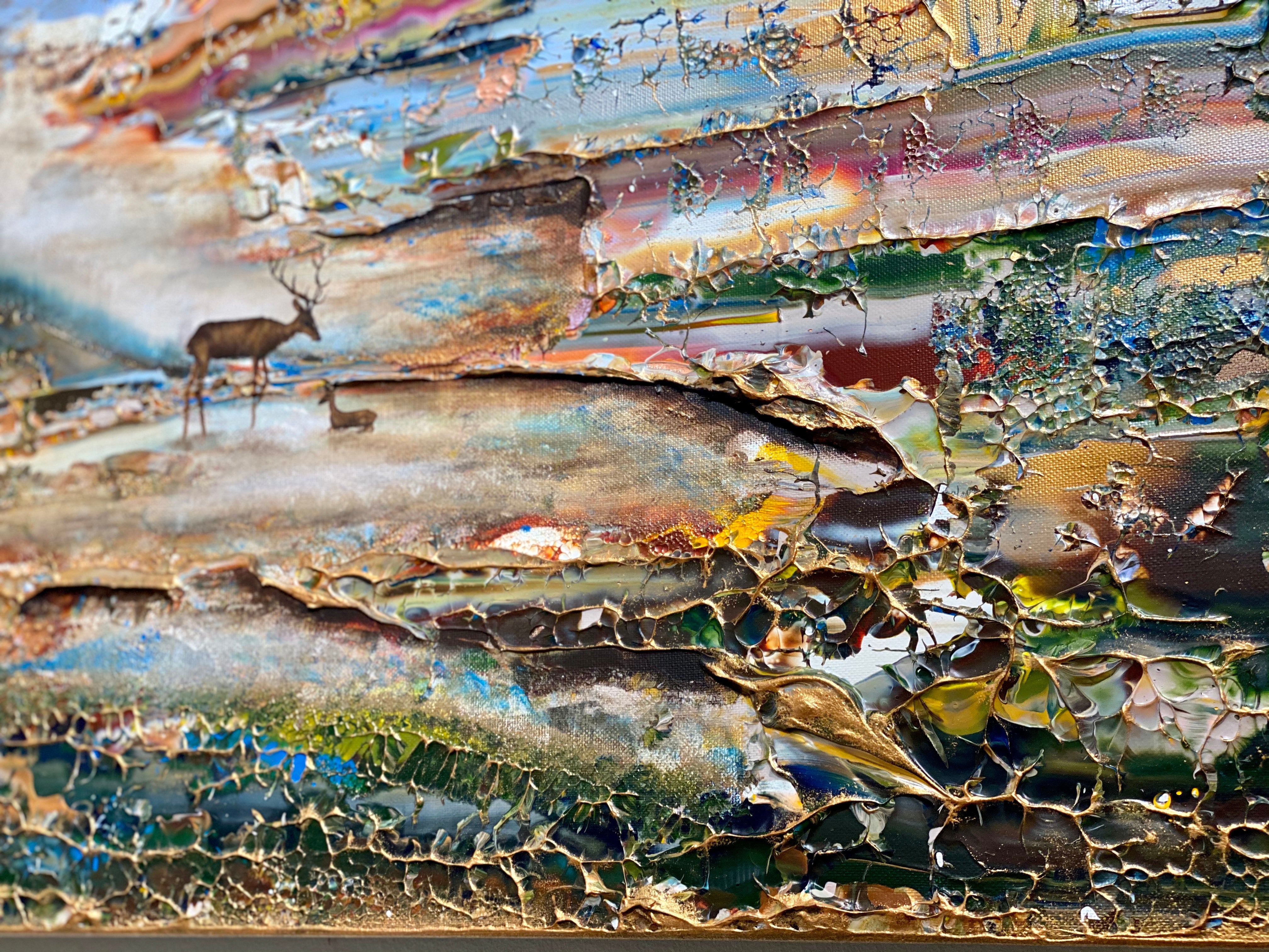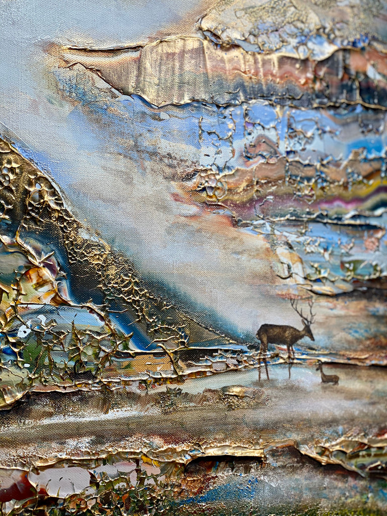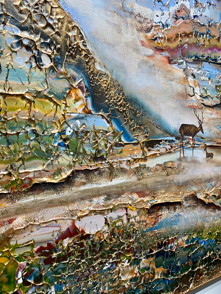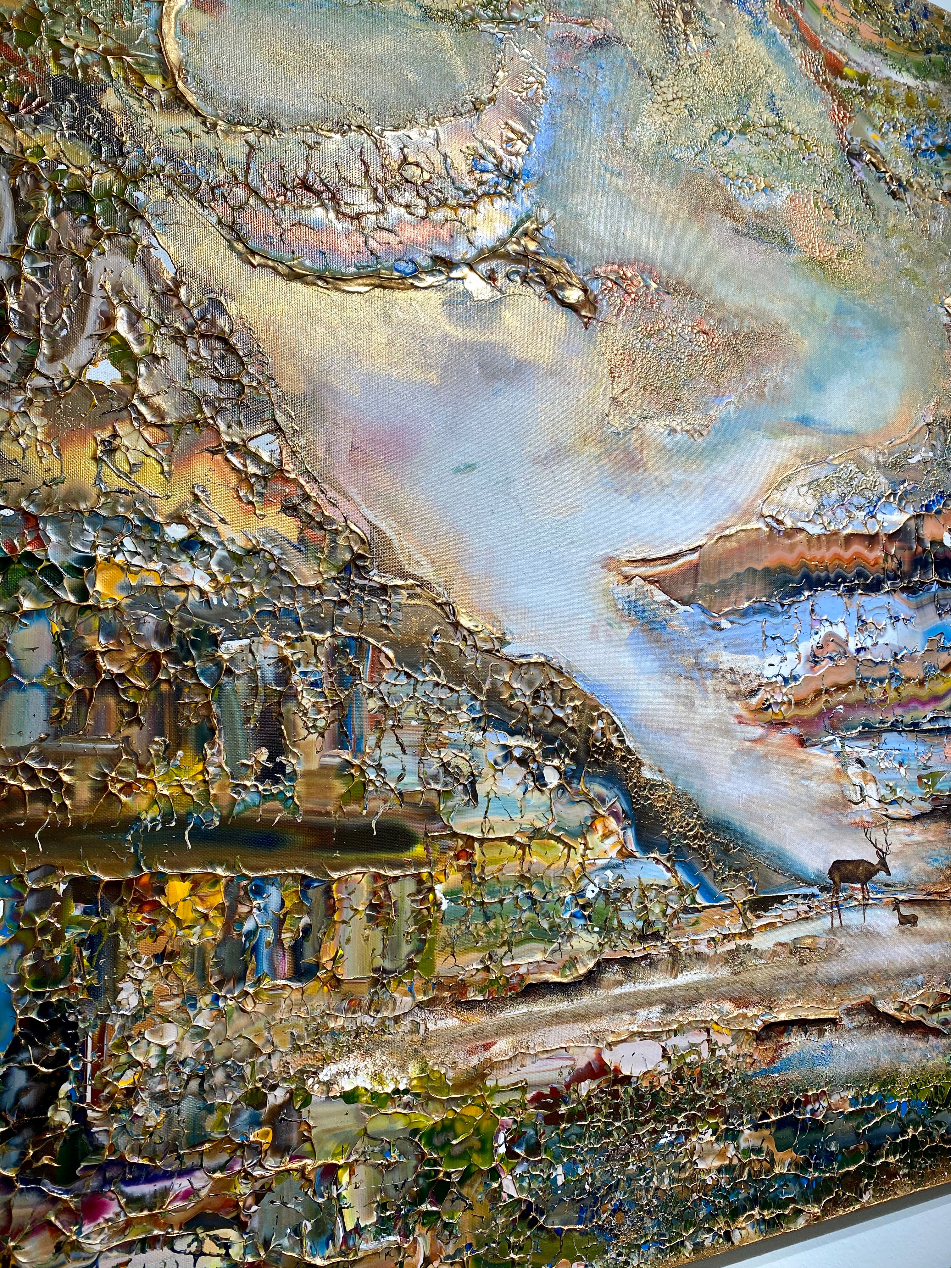 Inspirado en el encantador lago Gråviken. En esta pintura, he trabajado mucho para crear una niebla de la mañana fresca que busca su camino sobre el lago. También se encuentran dos ciervos en el lavado de agua. Me gusta especialmente la luz de la pintura que da un efecto armonioso y romántico.