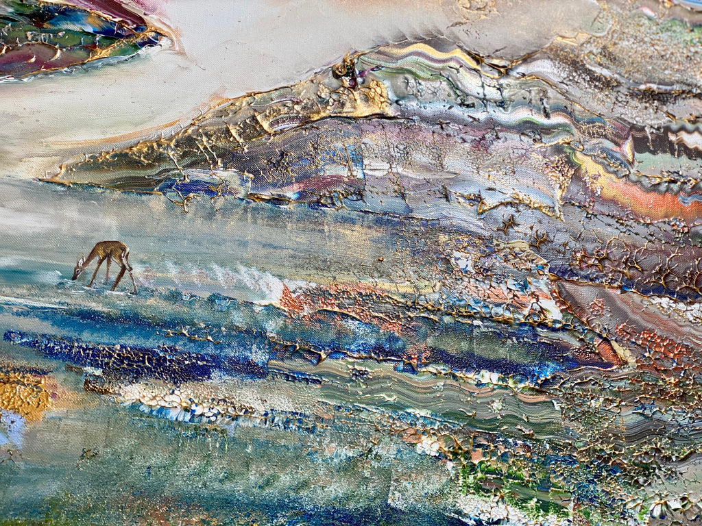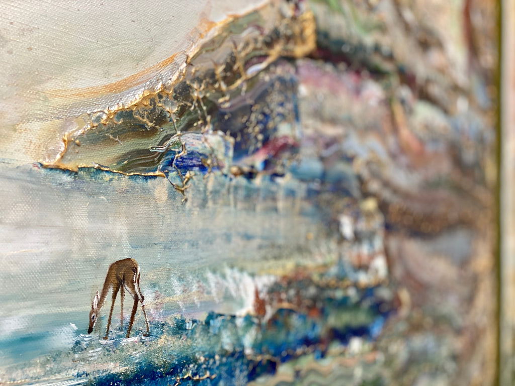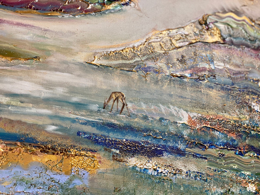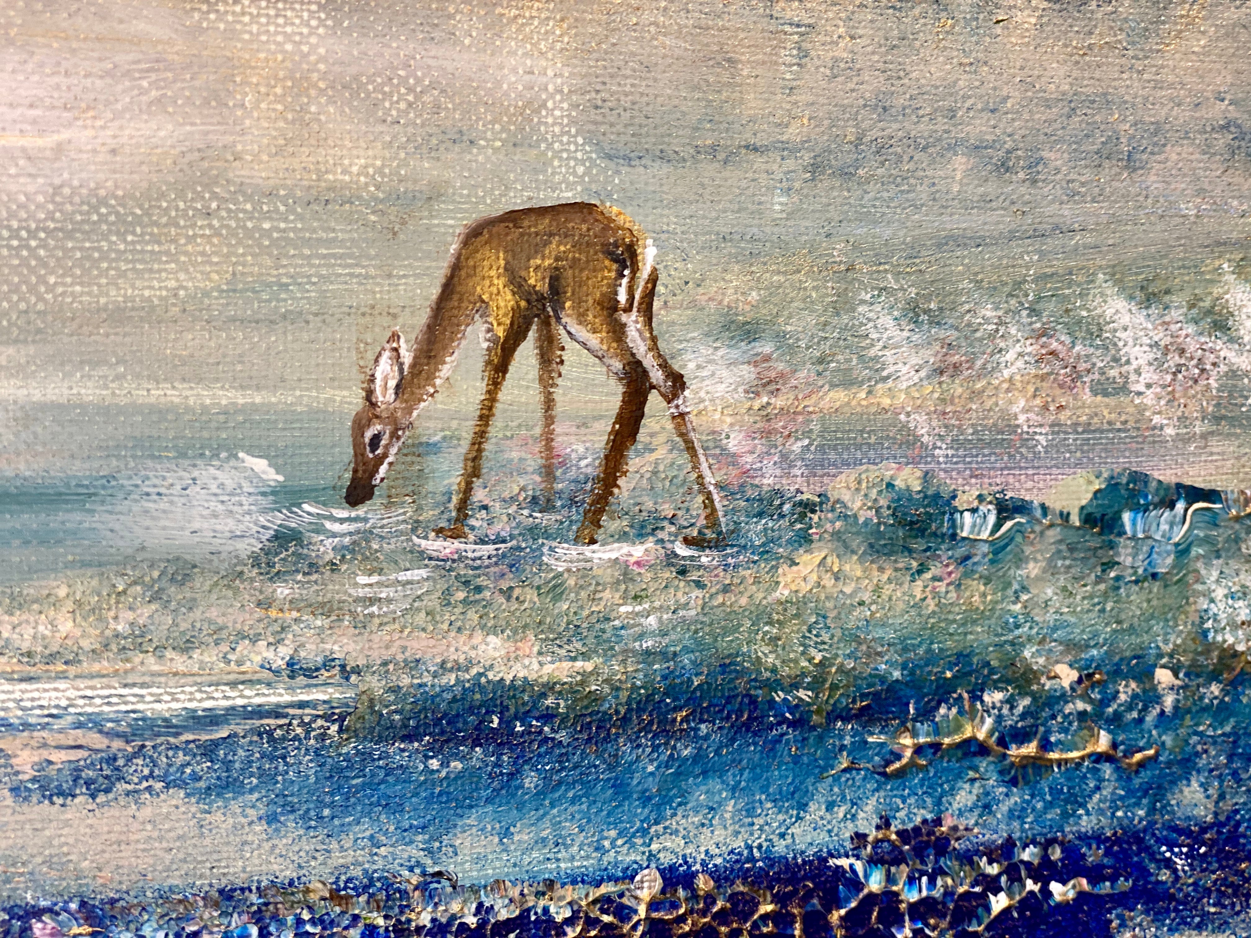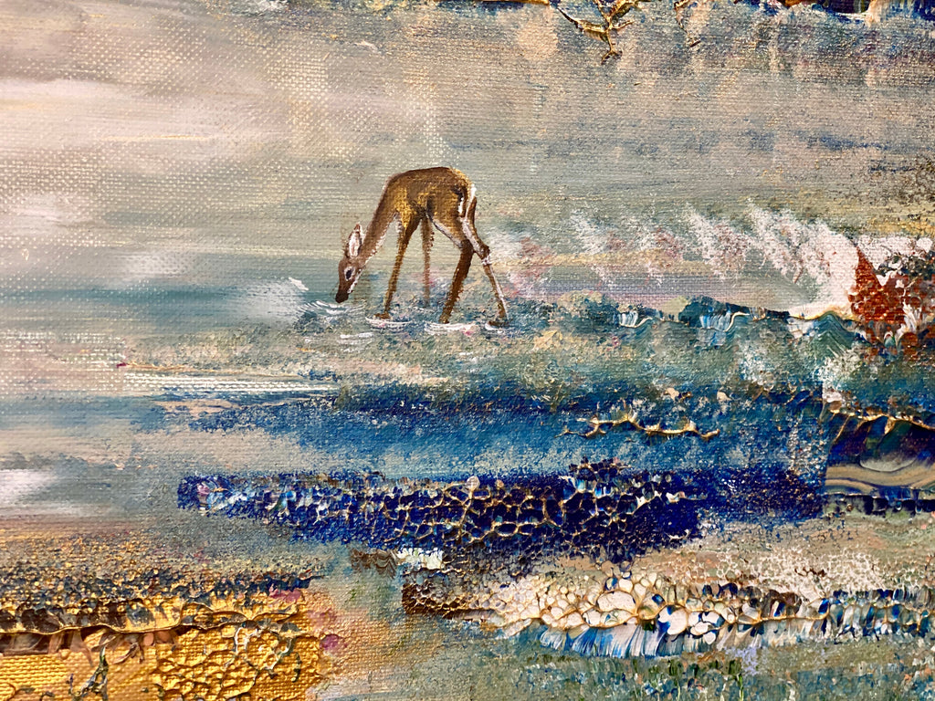 Inspirado por la naturaleza en Täby. En esta pintura, he trabajado mucho con la creación de una puesta de sol suave sobre la encantadora bahía. En el centro de la pintura se encuentra un ciervo que bebe agua mientras su piel brilla de la luz del sol. Esta "hora dorada" es mi hora favorita del día.