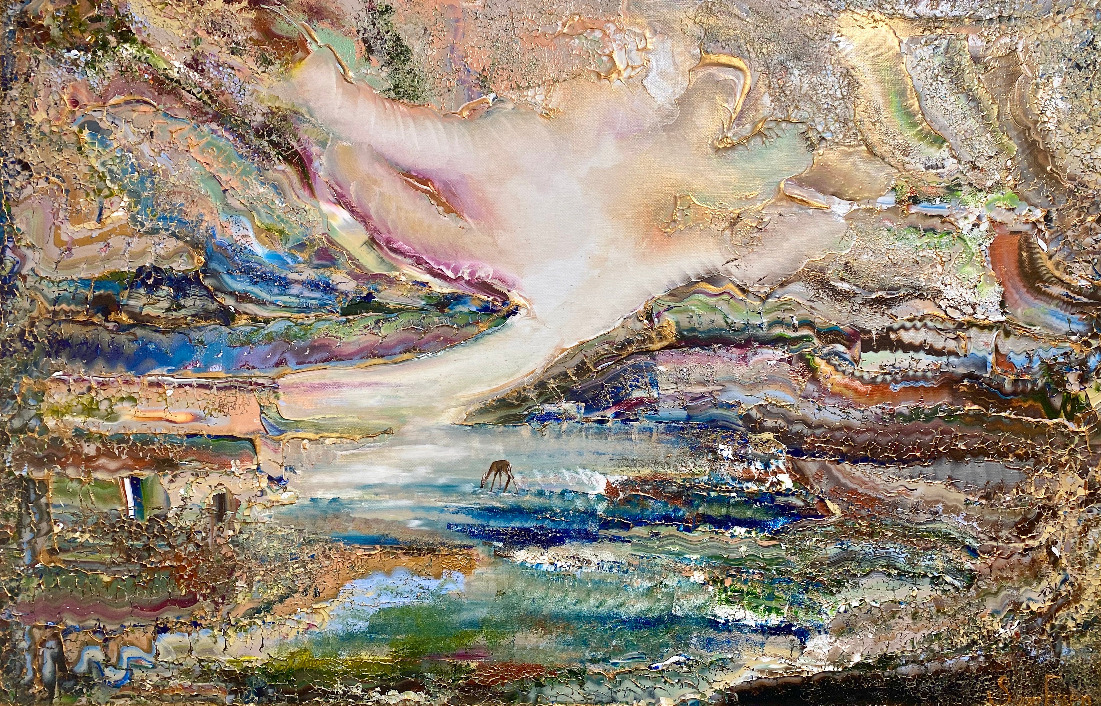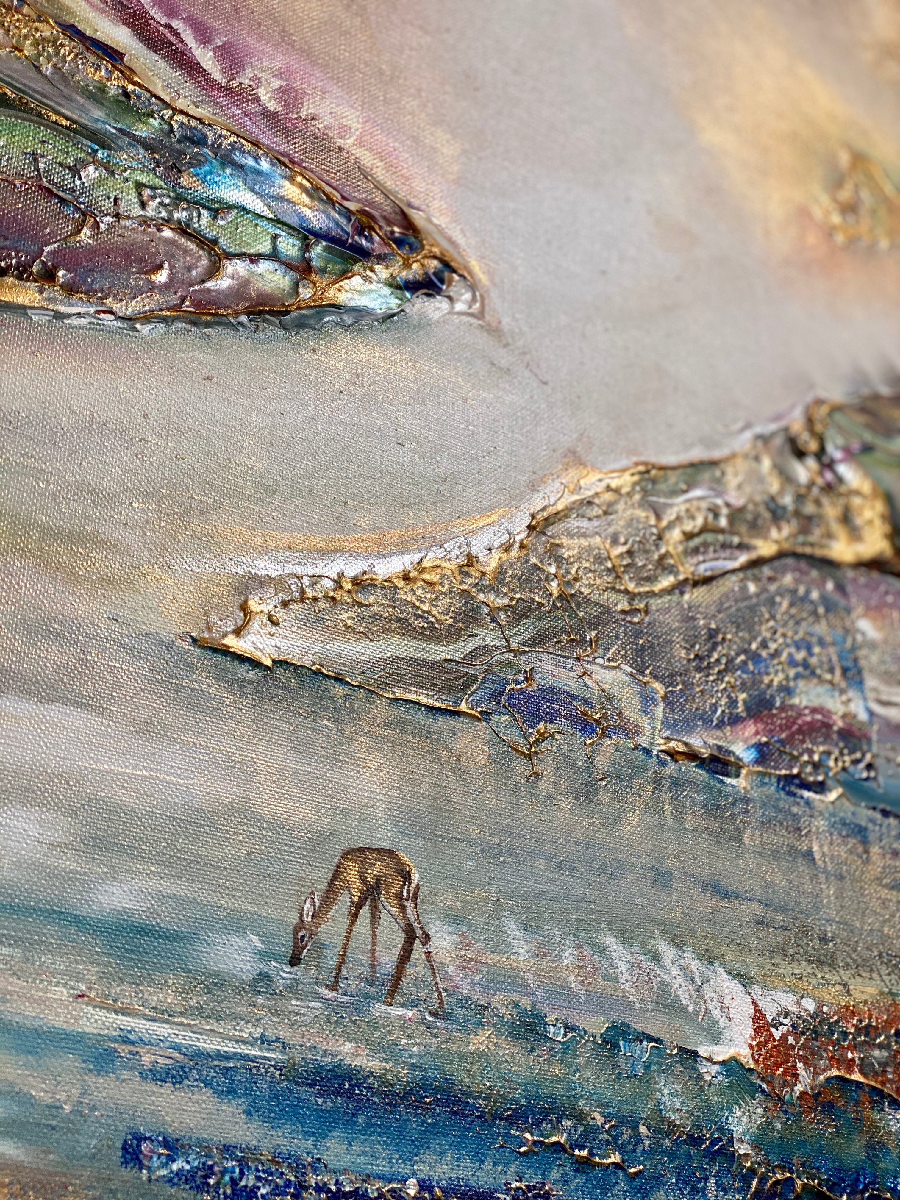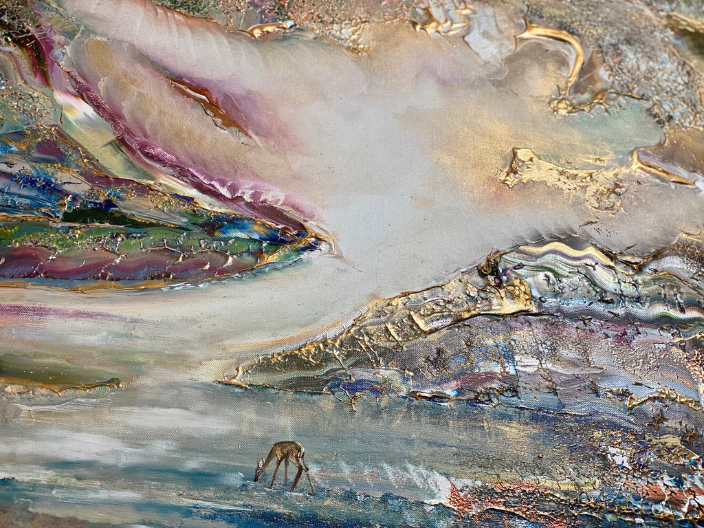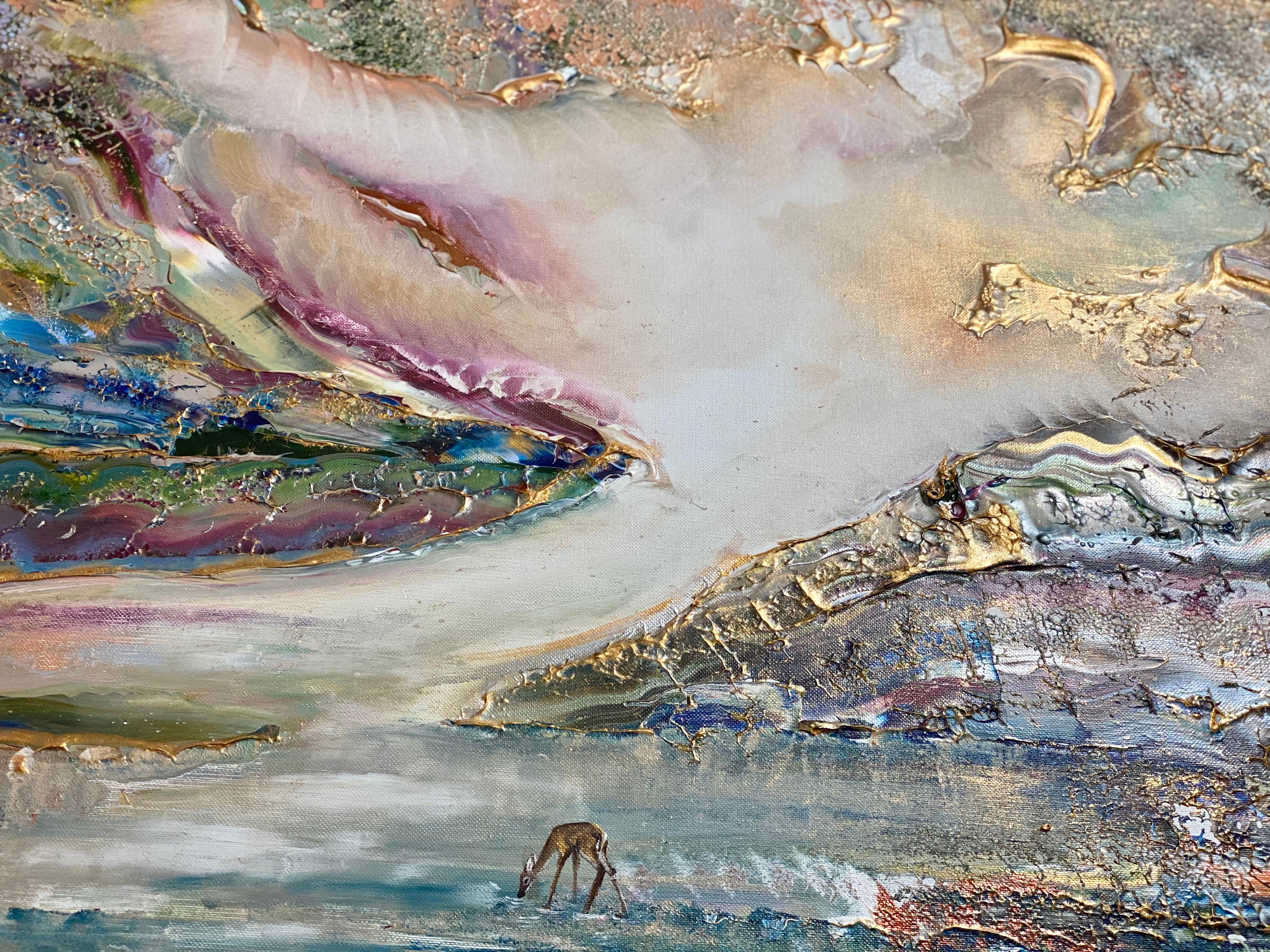 Inspirado por la naturaleza en Täby. En esta pintura, he trabajado mucho con la creación de una puesta de sol suave sobre la encantadora bahía. En el centro de la pintura se encuentra un ciervo que bebe agua mientras su piel brilla de la luz del sol. Esta "hora dorada" es mi hora favorita del día.