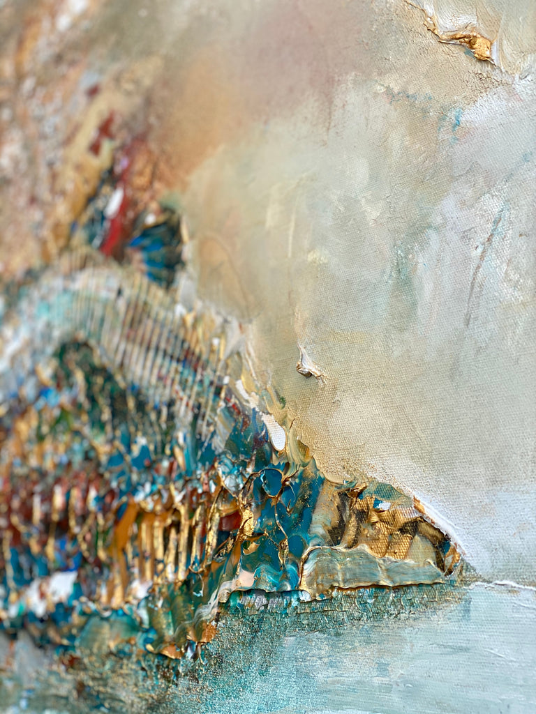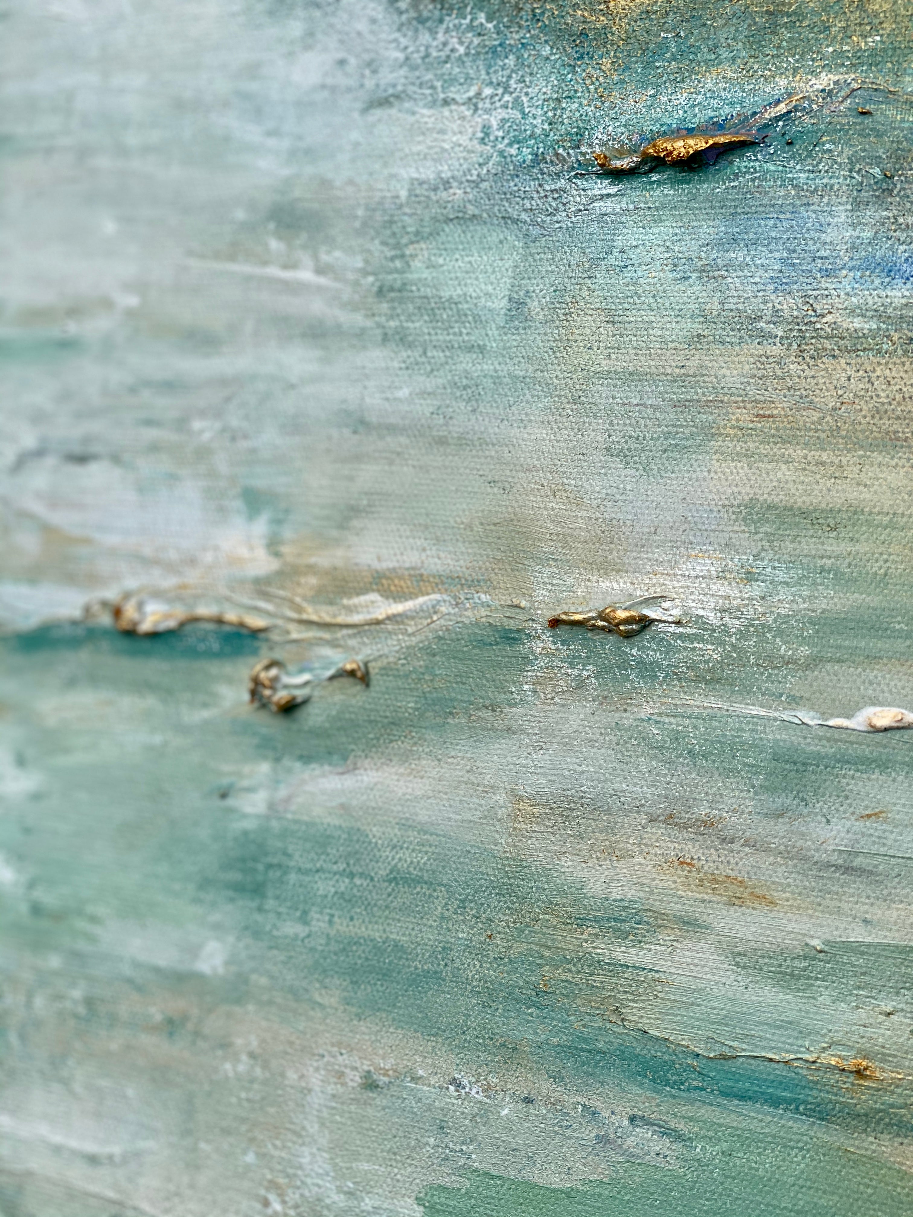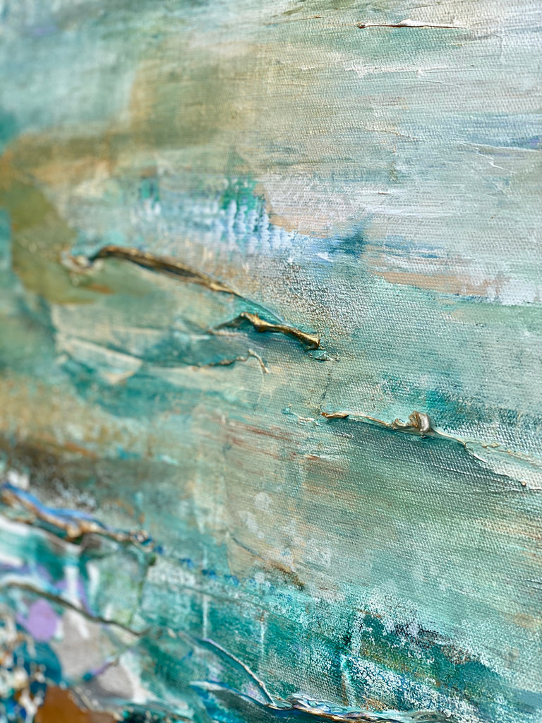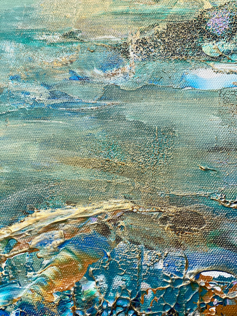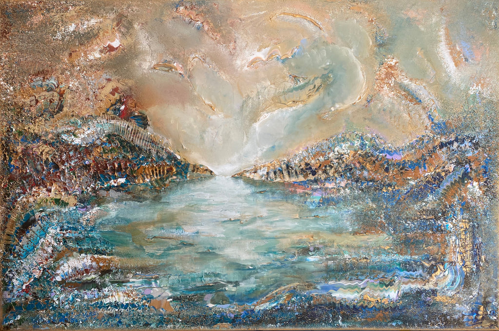 Rullaaaltojen ja kimaltelevien heijastusten innoittamana Tukholman saaristossa. Maalauksella on tasapaino draaman ja romanssin välillä, mikä tekee maalauksesta leikkisän ja salaperäisen. Olen erityisen tyytyväinen maalauksen rakenteeseen, joka muodostaa jännittäviä kuvioita.