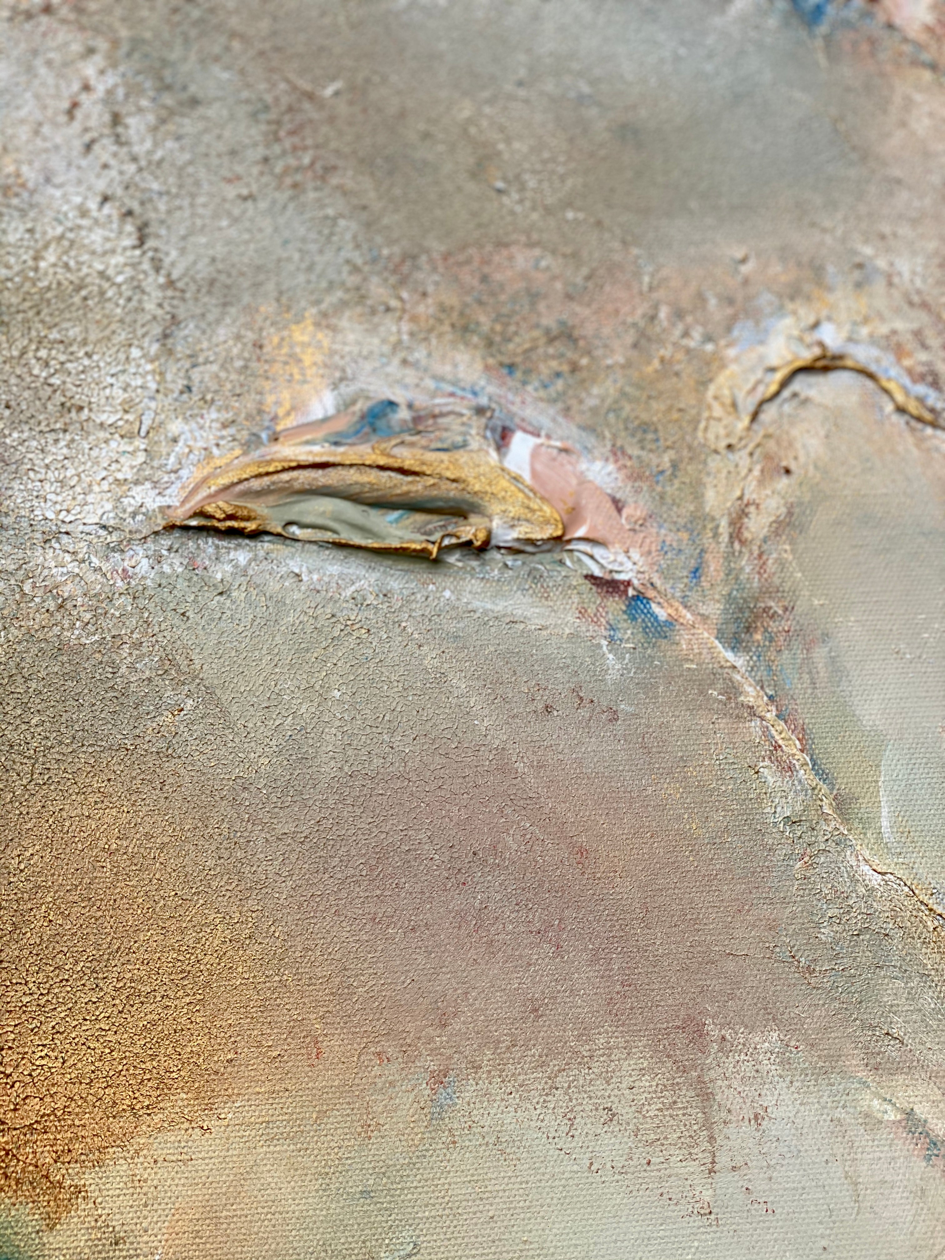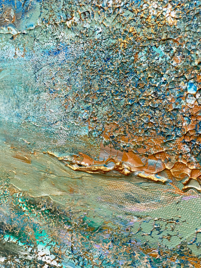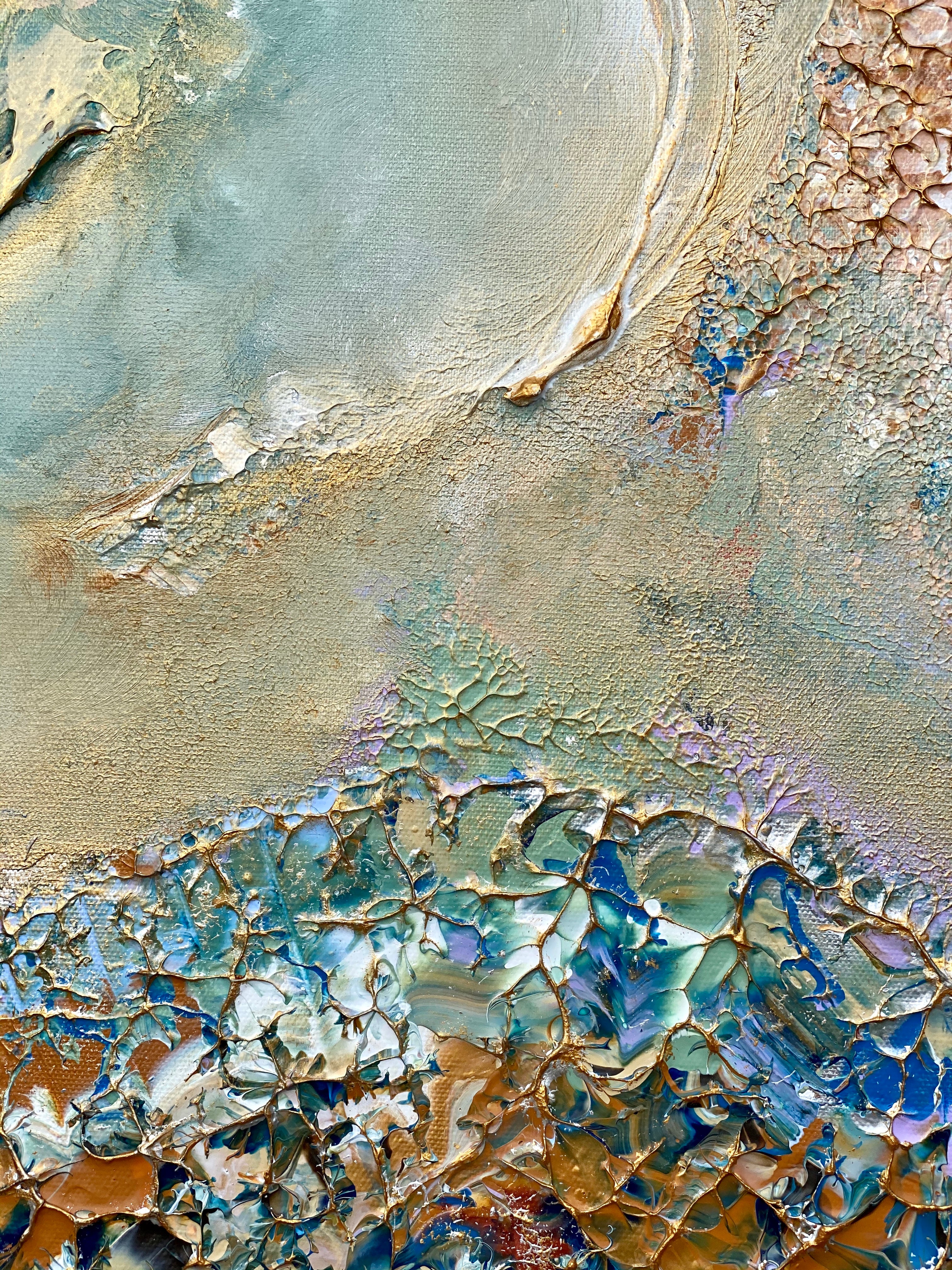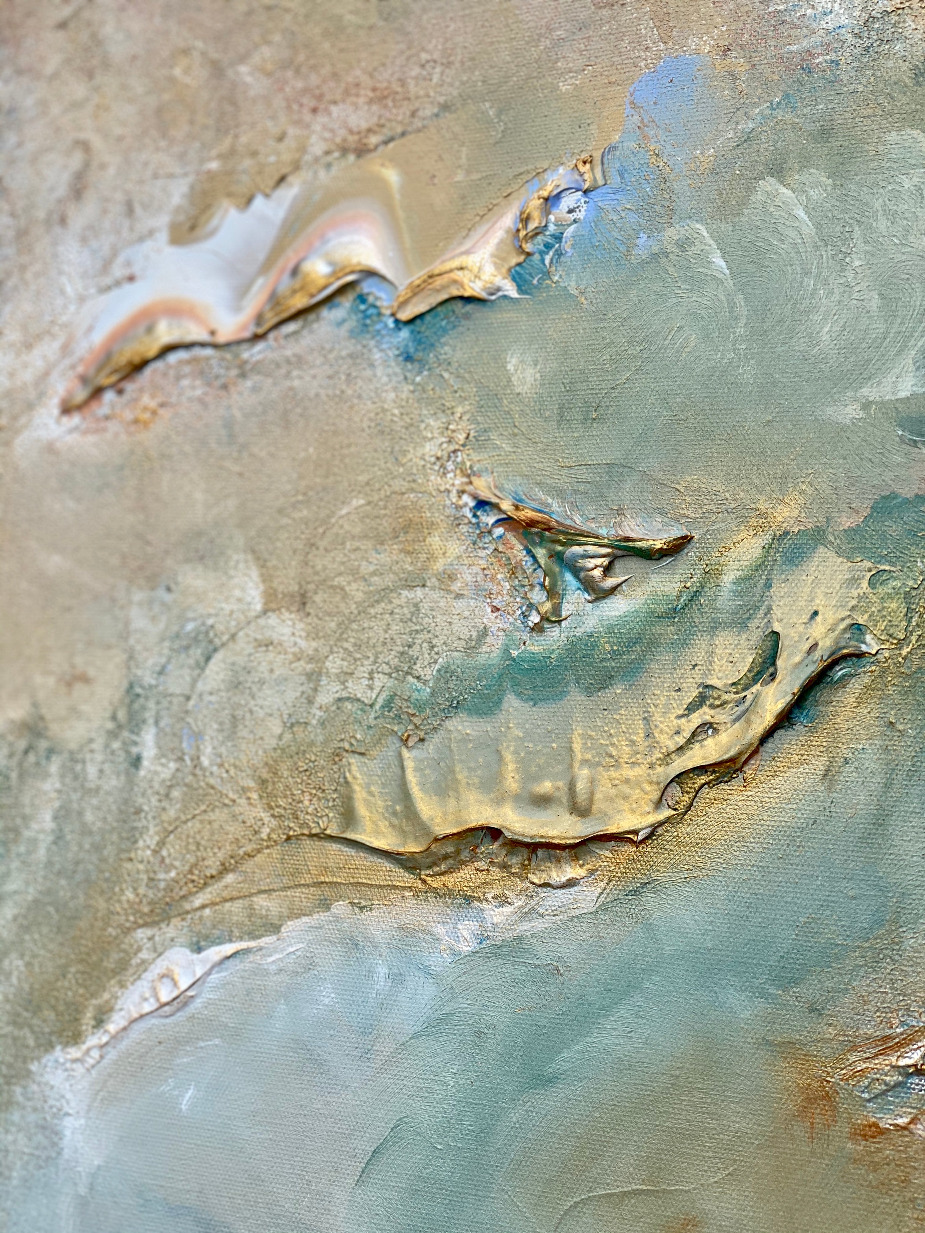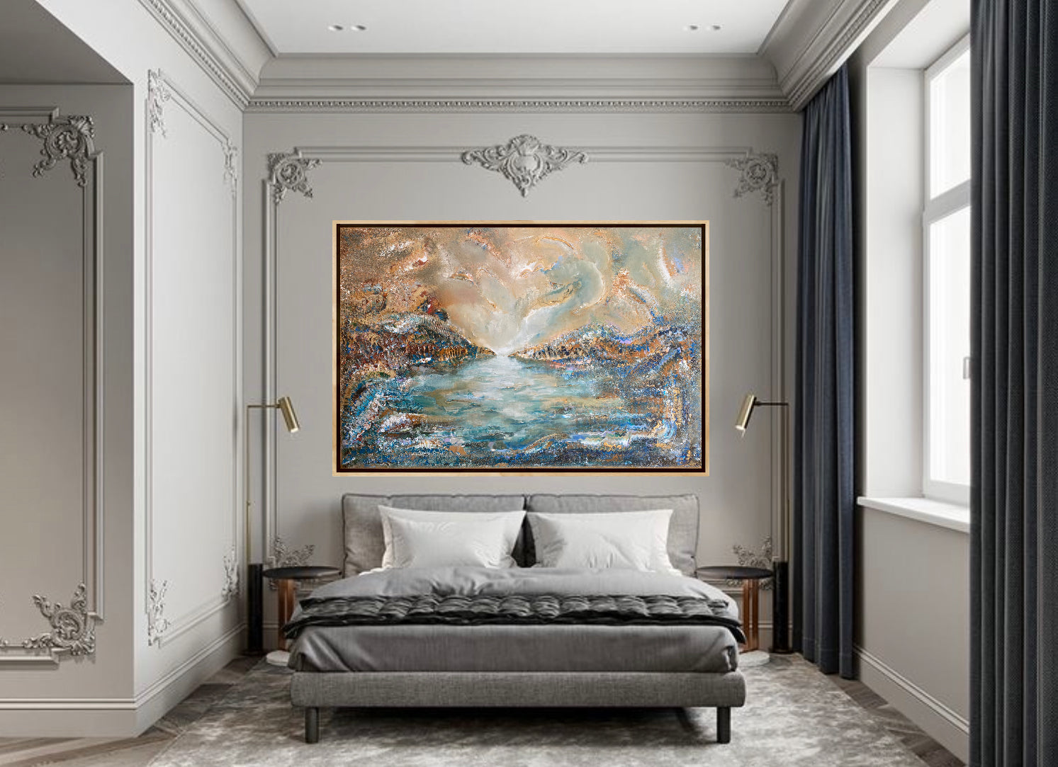 Rullaaaltojen ja kimaltelevien heijastusten innoittamana Tukholman saaristossa. Maalauksella on tasapaino draaman ja romanssin välillä, mikä tekee maalauksesta leikkisän ja salaperäisen. Olen erityisen tyytyväinen maalauksen rakenteeseen, joka muodostaa jännittäviä kuvioita.