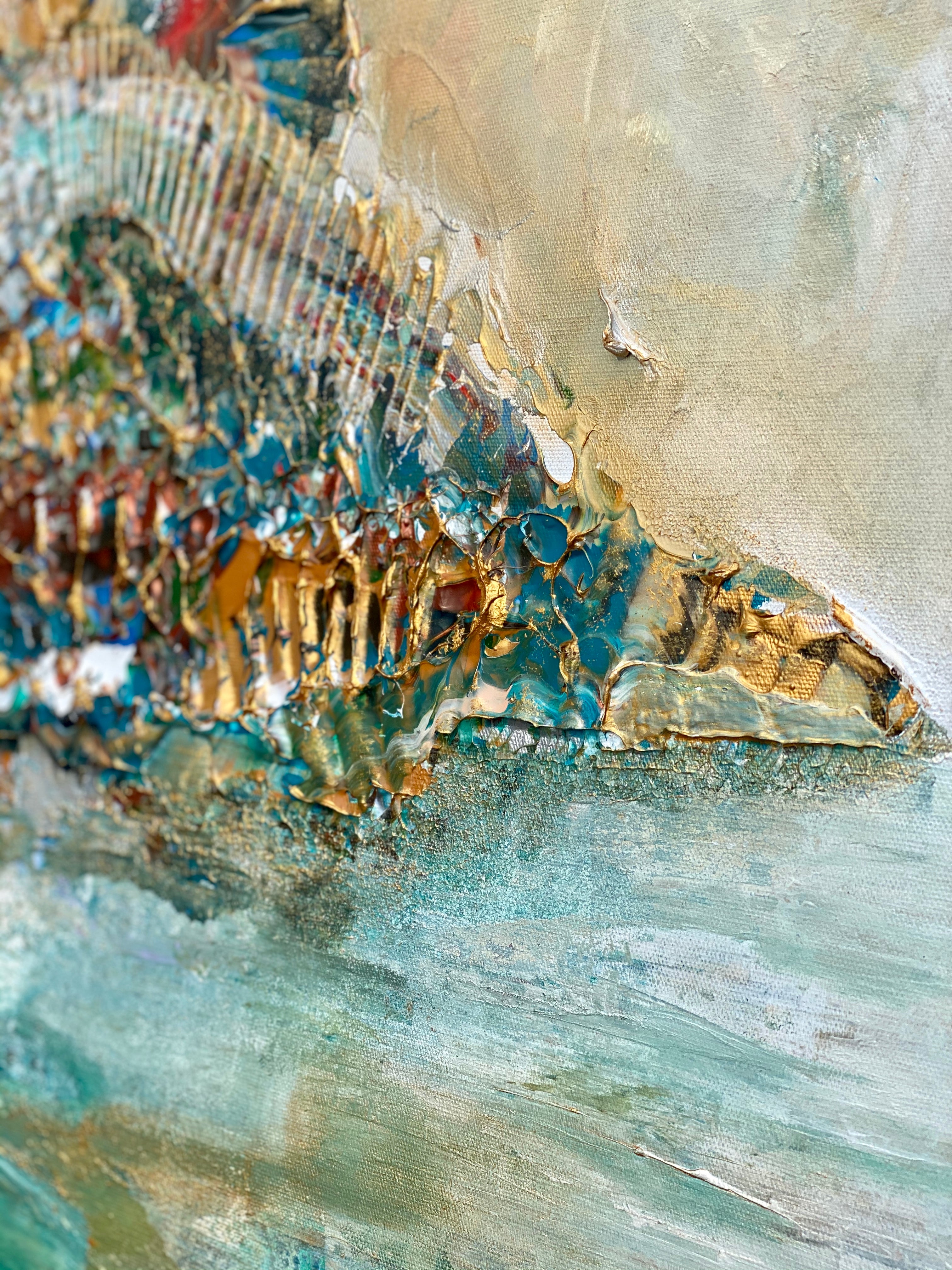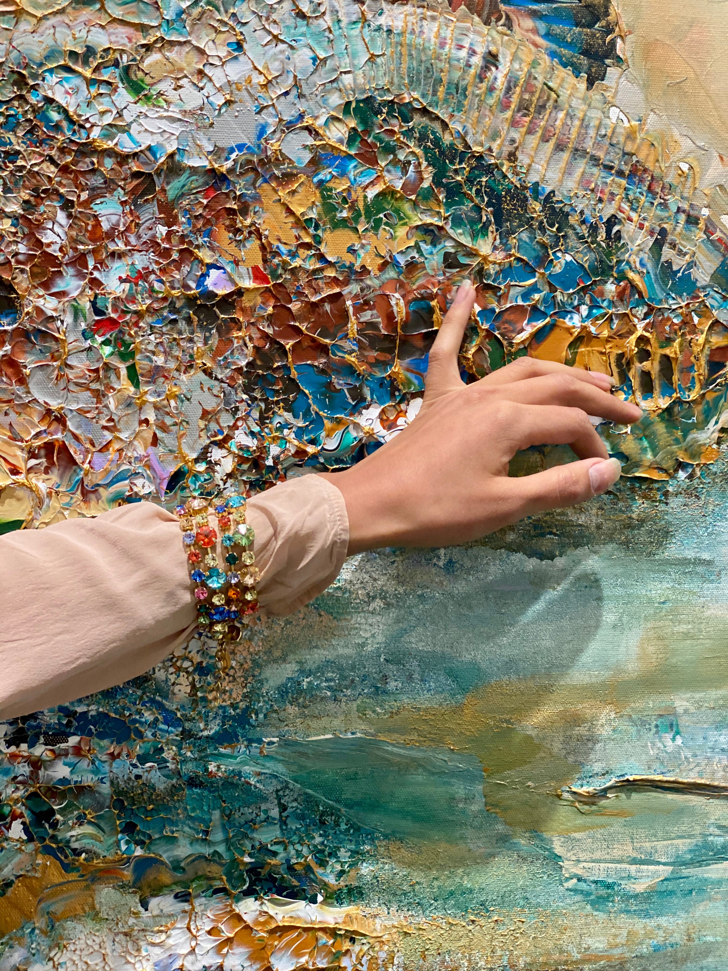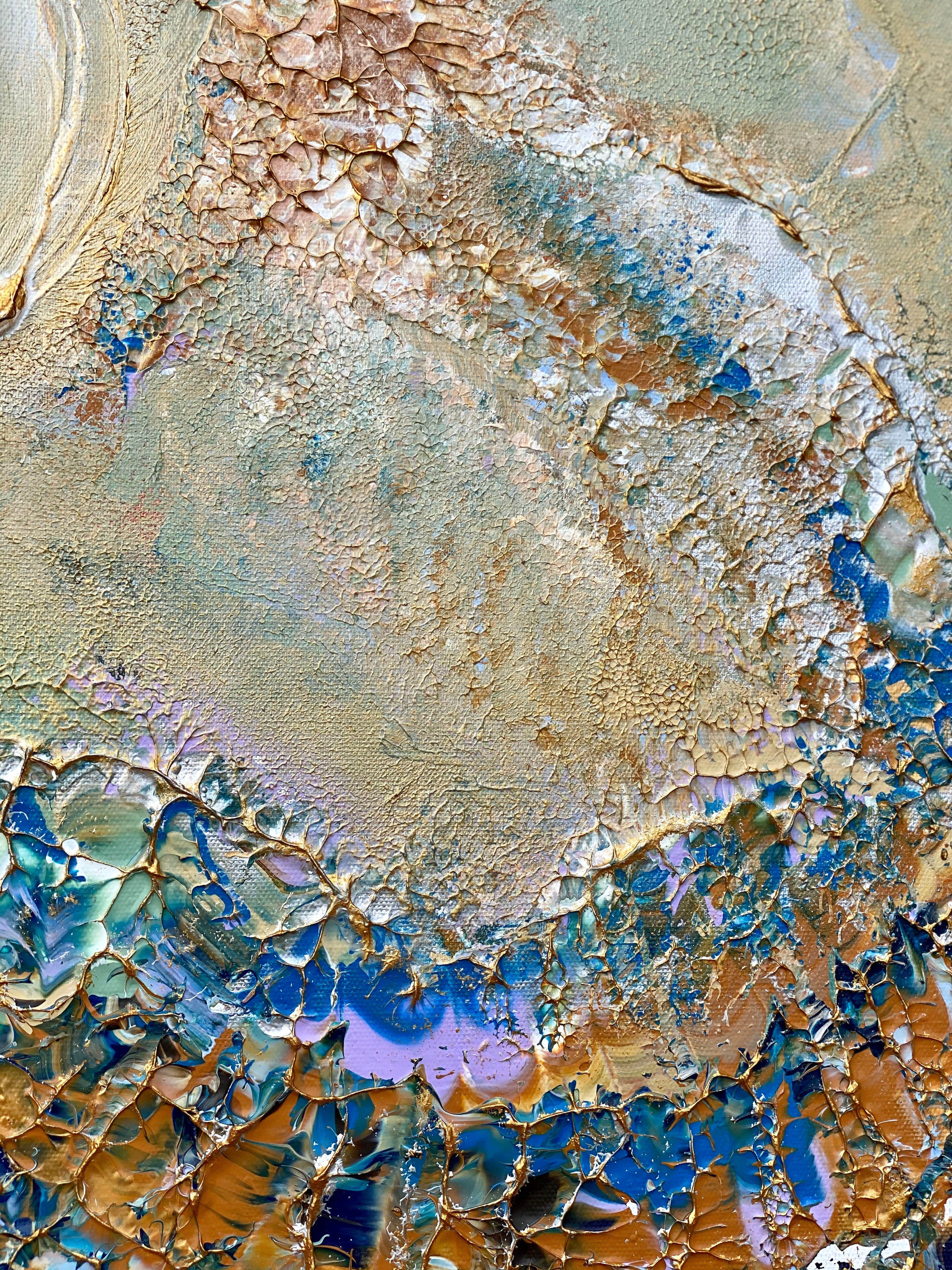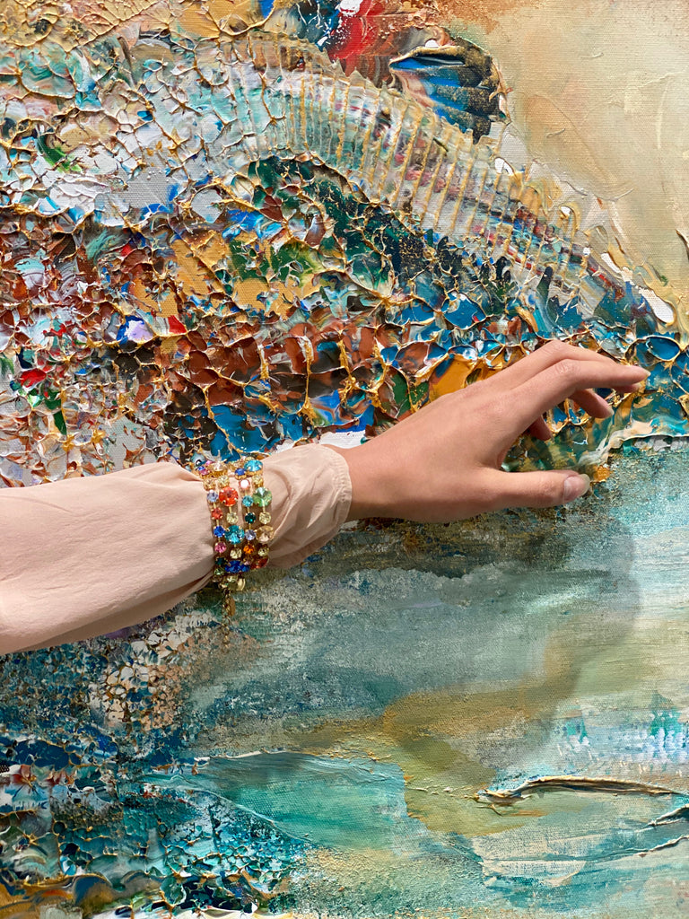 Rullaaaltojen ja kimaltelevien heijastusten innoittamana Tukholman saaristossa. Maalauksella on tasapaino draaman ja romanssin välillä, mikä tekee maalauksesta leikkisän ja salaperäisen. Olen erityisen tyytyväinen maalauksen rakenteeseen, joka muodostaa jännittäviä kuvioita.
