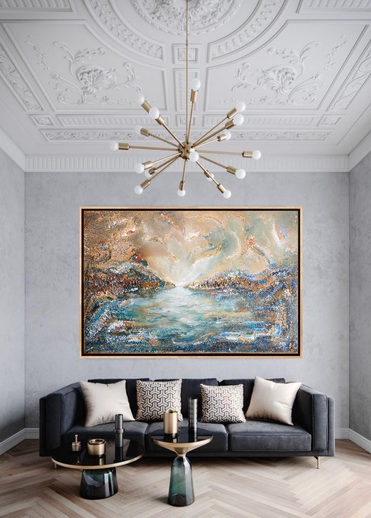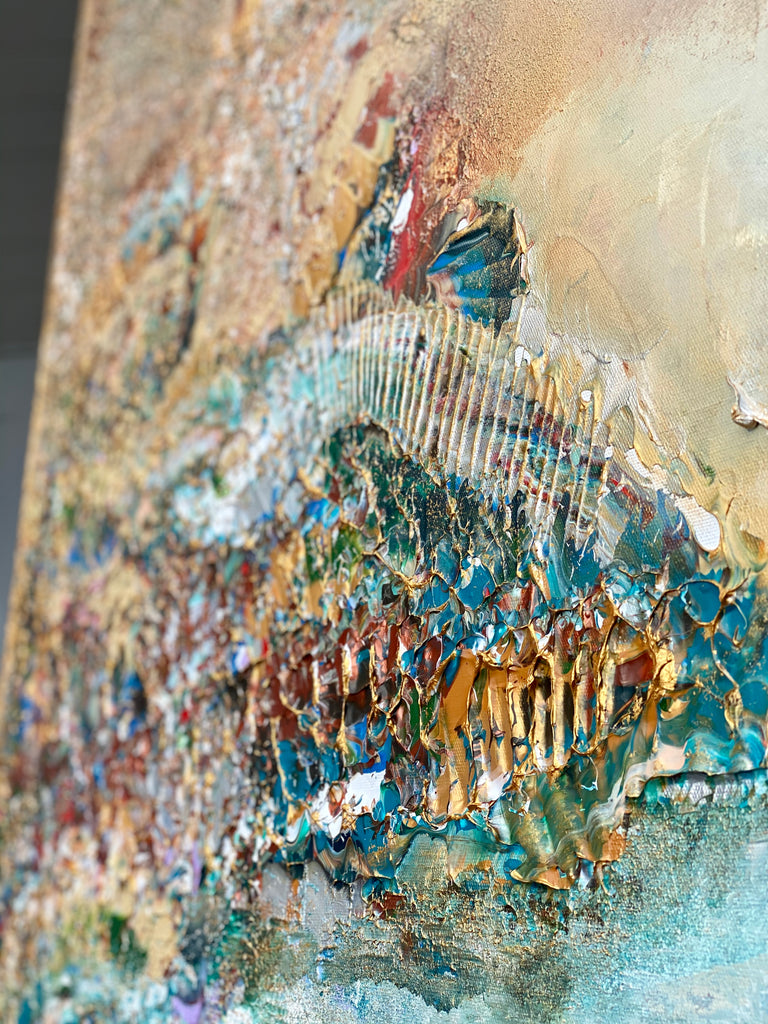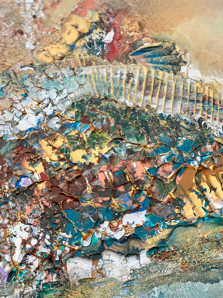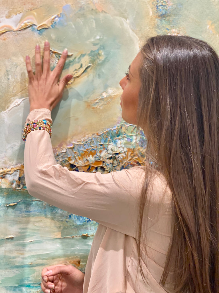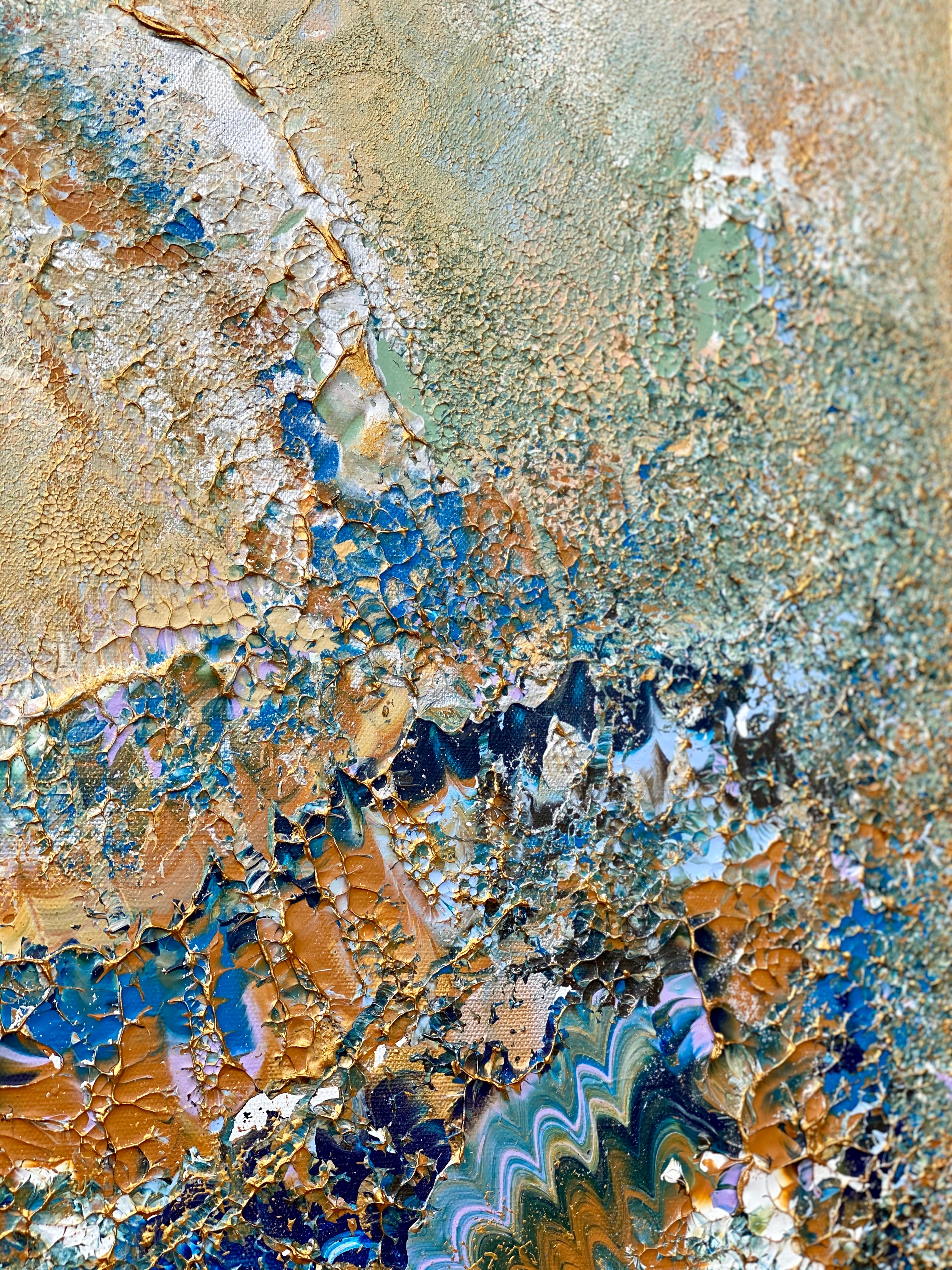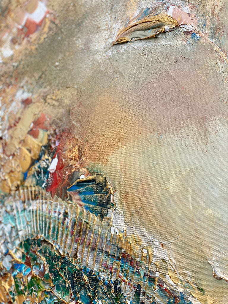 Rullaaaltojen ja kimaltelevien heijastusten innoittamana Tukholman saaristossa. Maalauksella on tasapaino draaman ja romanssin välillä, mikä tekee maalauksesta leikkisän ja salaperäisen. Olen erityisen tyytyväinen maalauksen rakenteeseen, joka muodostaa jännittäviä kuvioita.