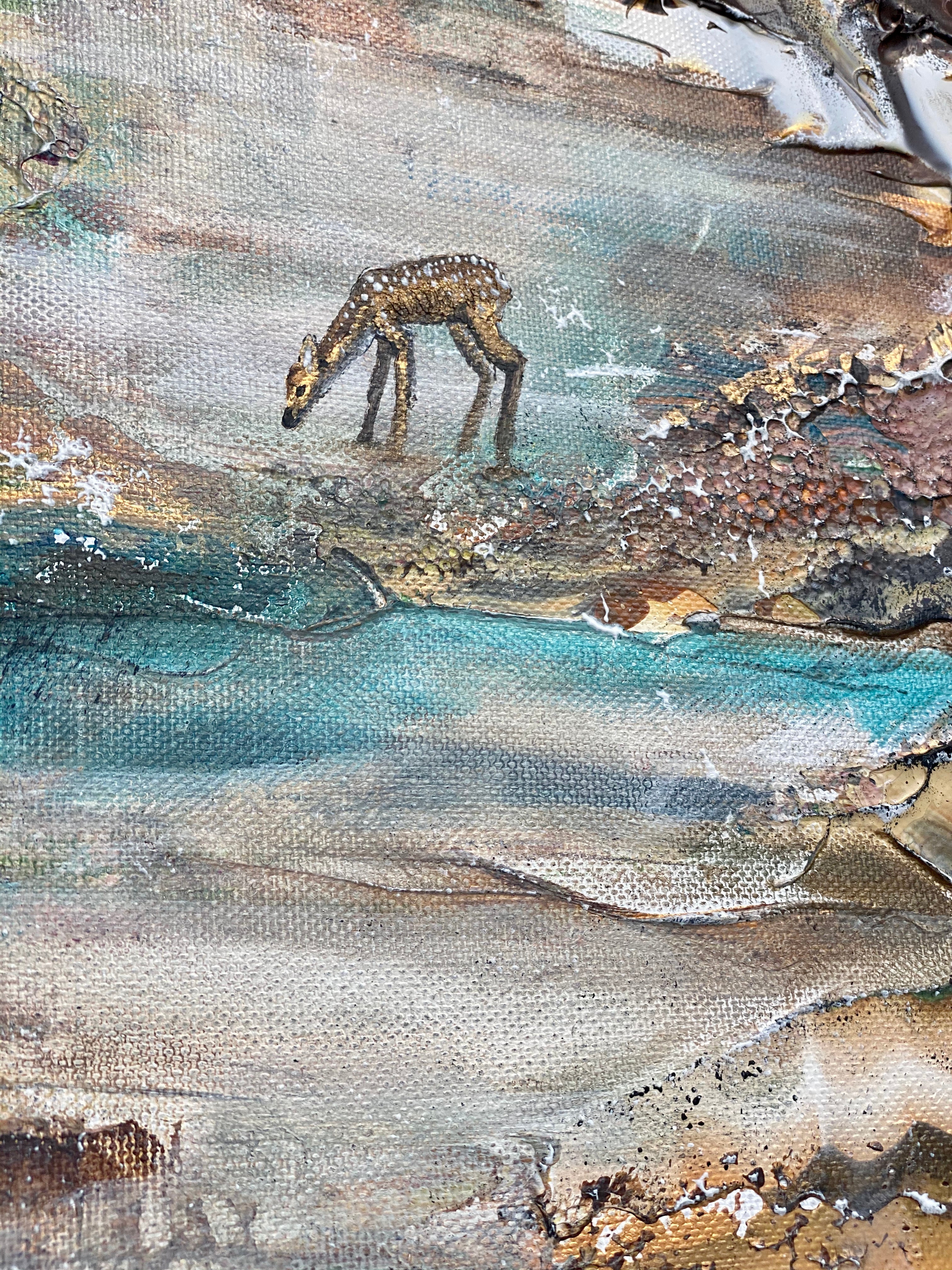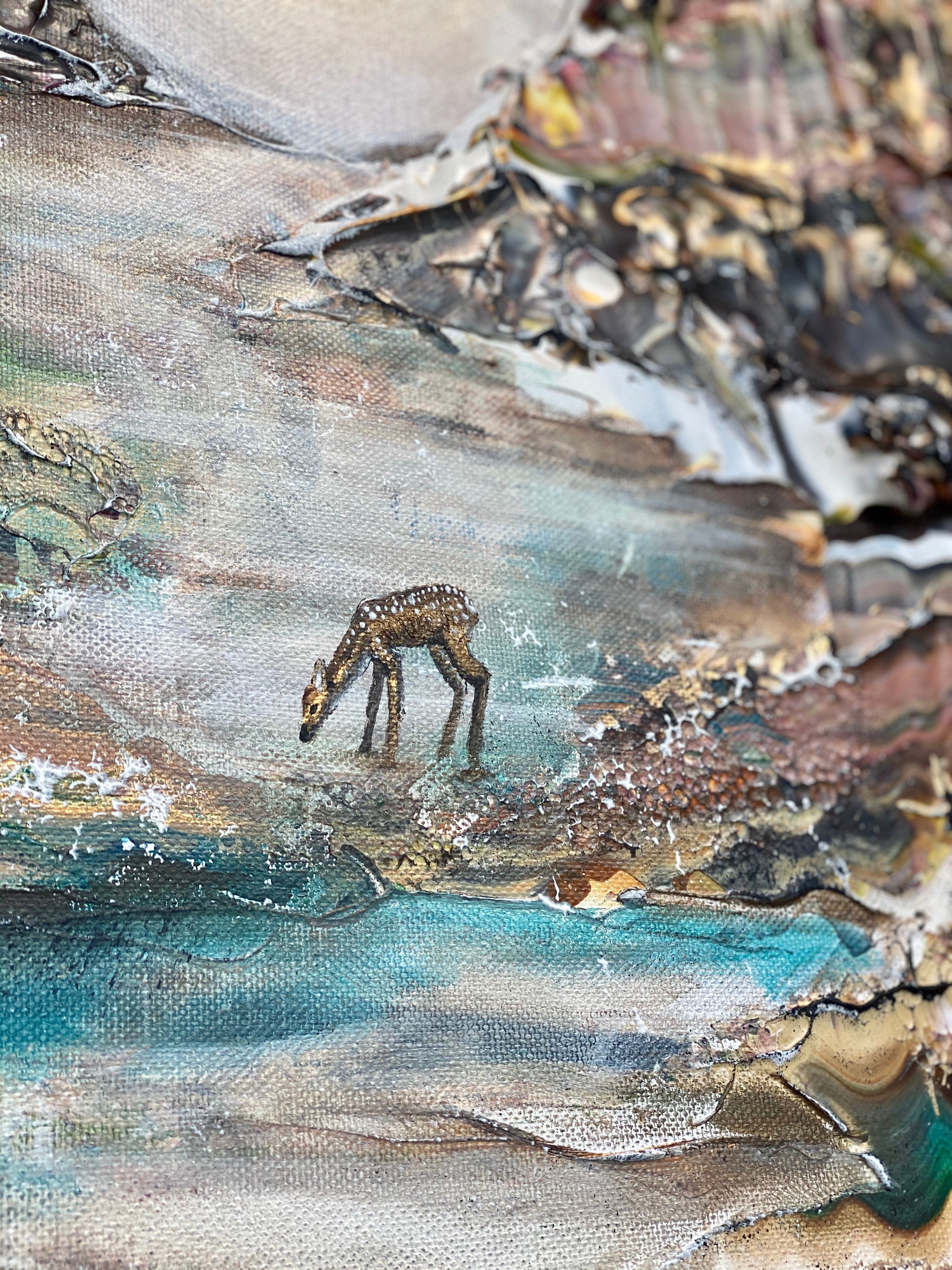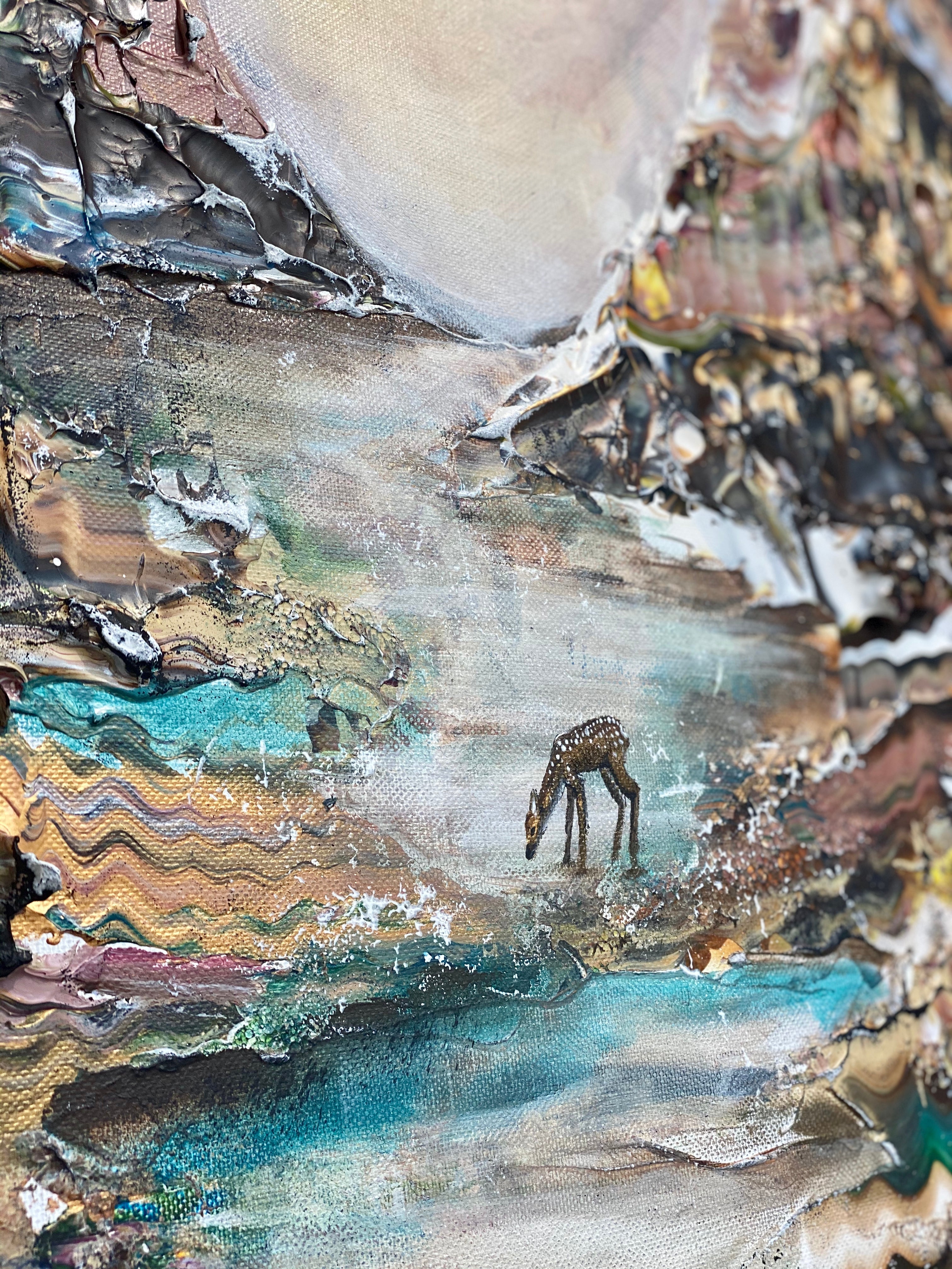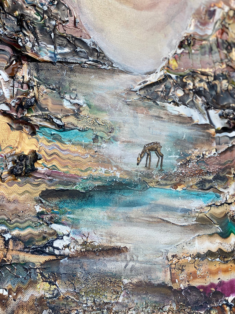 Tämä maalaus on yhdistelmä karkeaa ja lievää. Maalauksen keskiosassa on paksin maalikerros, jota olen koskaan käyttänyt. Värikerrokset antavat kolmiulotteisen tunteen ja yhdessä ohuempien osien kanssa antavat dynaamisen tunteen. Ulompi kerros on maalattu mustana, mikä minulle on melko epätavallista, mutta rakastan kuinka se myötävaikuttaa jännittävään vaikutukseen. Huomaa kultainen bambi -juomavesi järvestä.