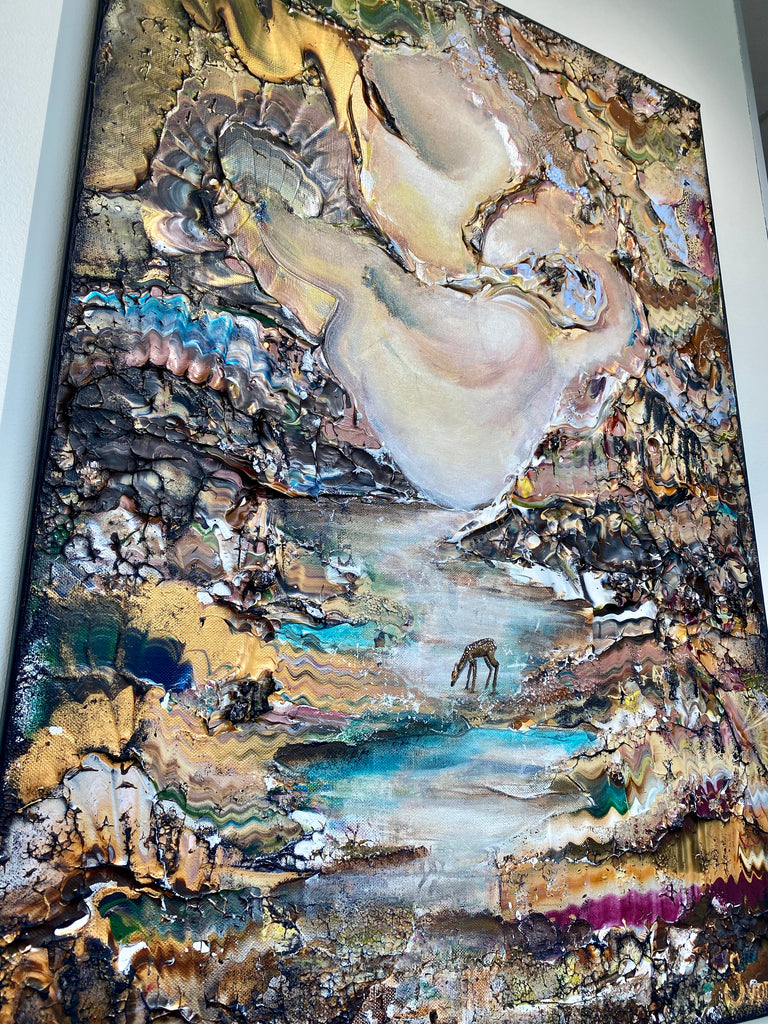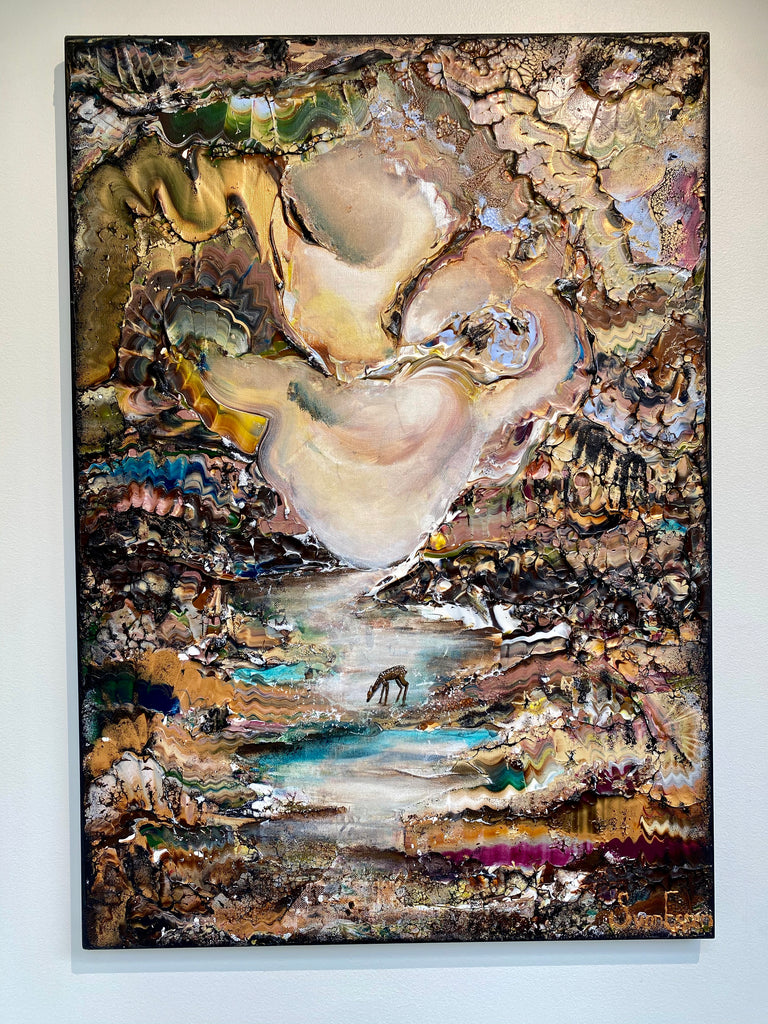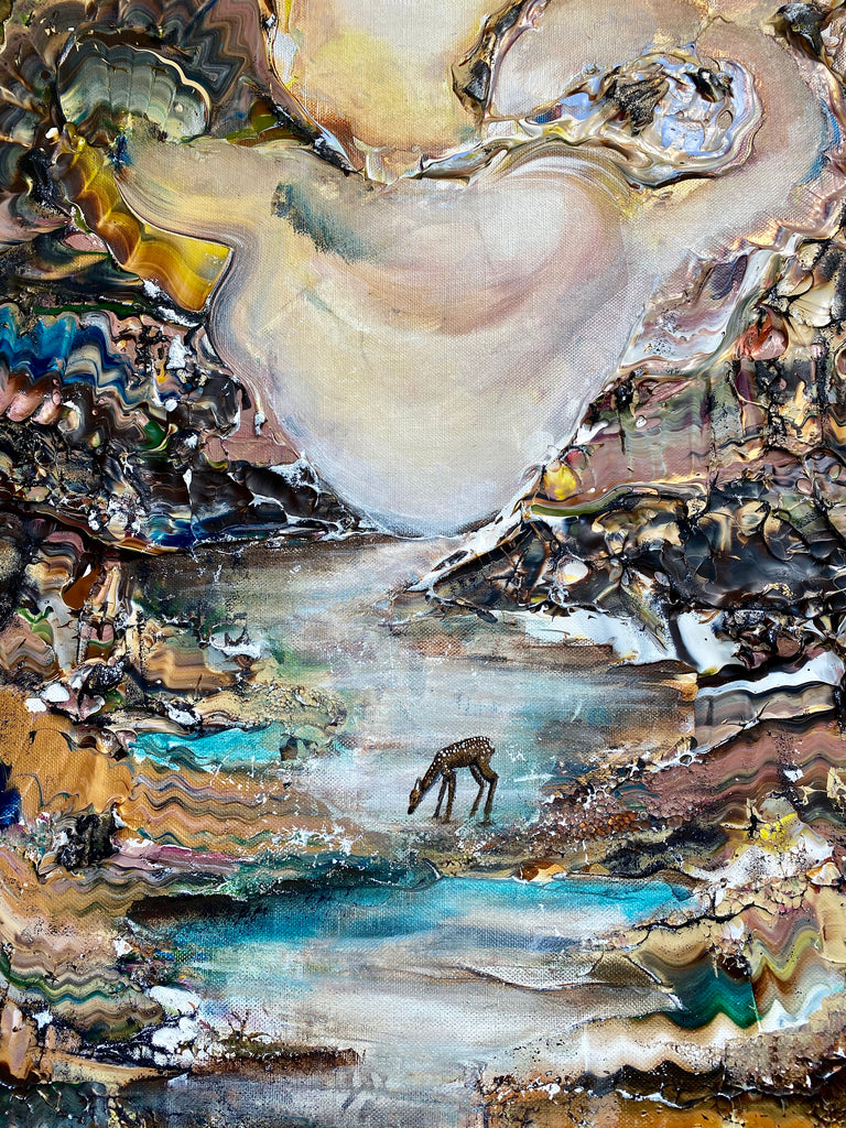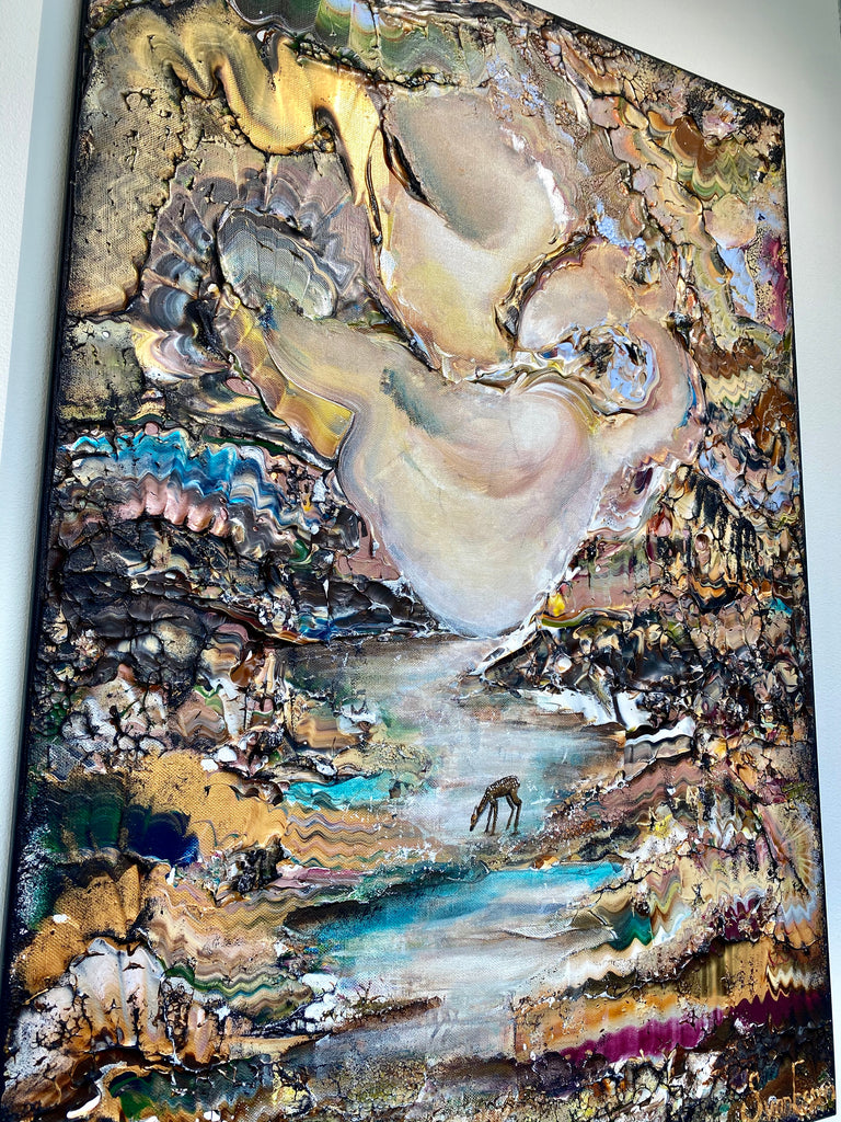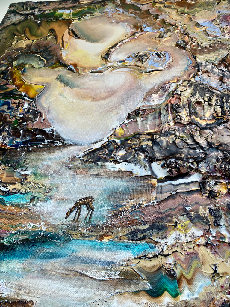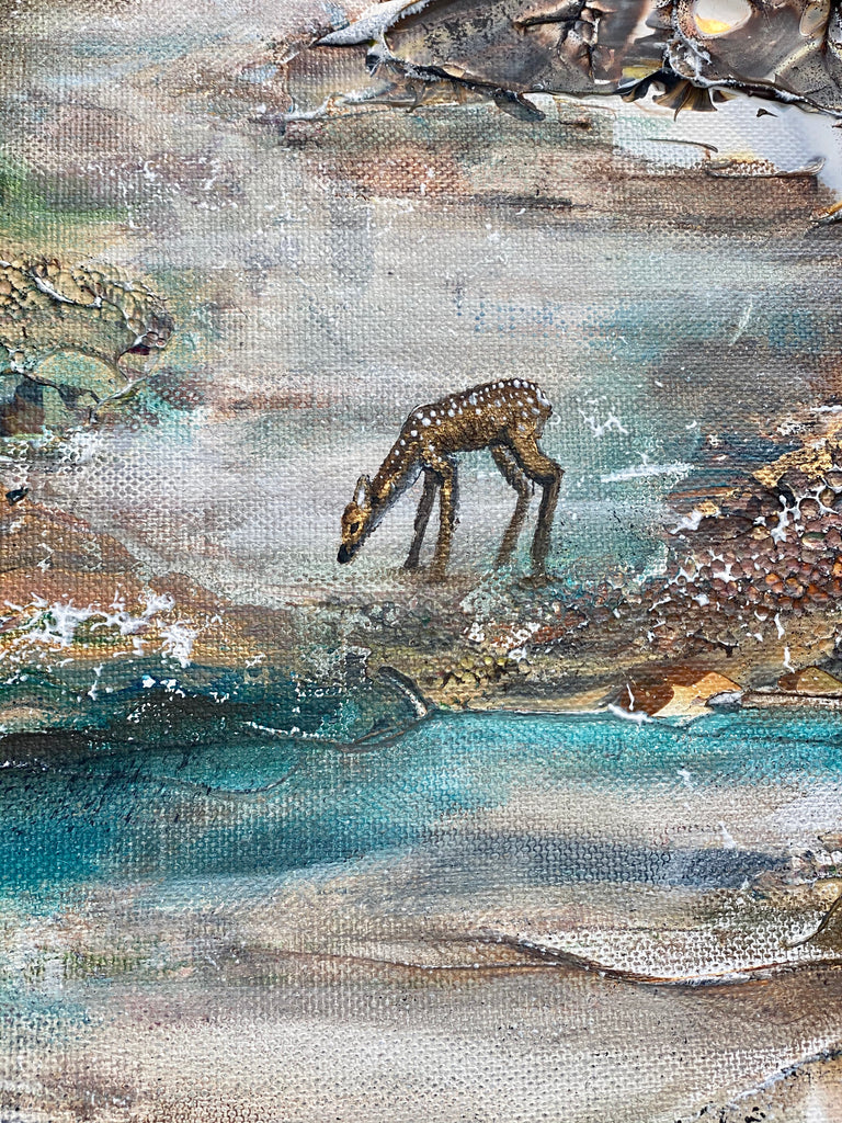 Tämä maalaus on yhdistelmä karkeaa ja lievää. Maalauksen keskiosassa on paksin maalikerros, jota olen koskaan käyttänyt. Värikerrokset antavat kolmiulotteisen tunteen ja yhdessä ohuempien osien kanssa antavat dynaamisen tunteen. Ulompi kerros on maalattu mustana, mikä minulle on melko epätavallista, mutta rakastan kuinka se myötävaikuttaa jännittävään vaikutukseen. Huomaa kultainen bambi -juomavesi järvestä.