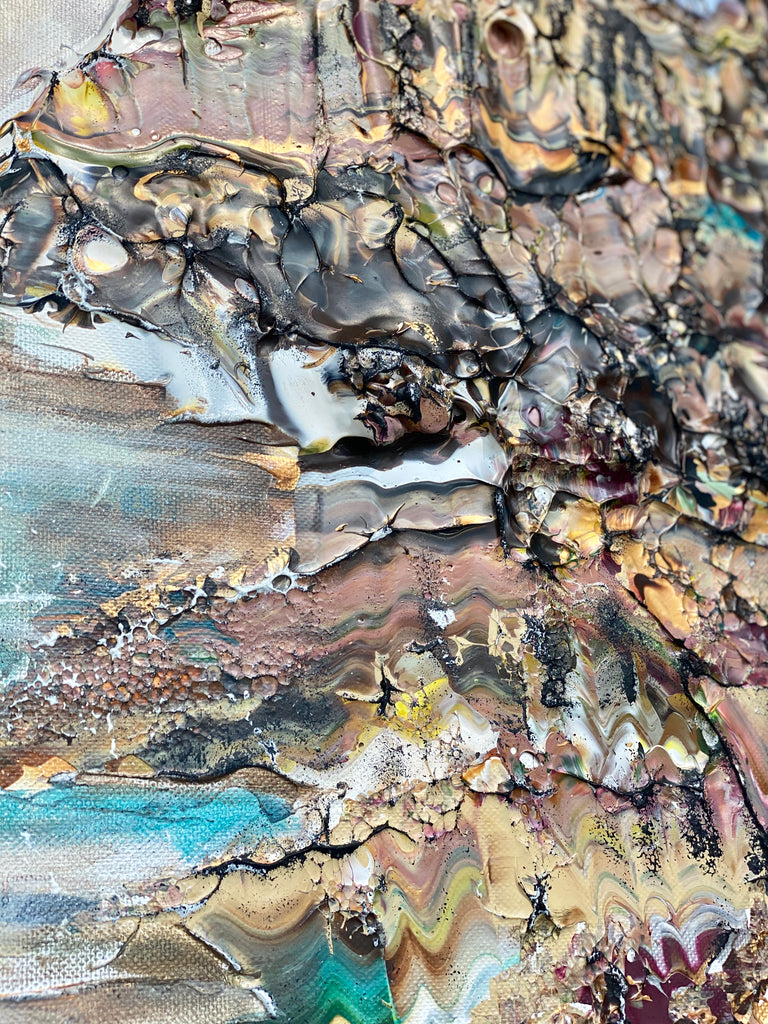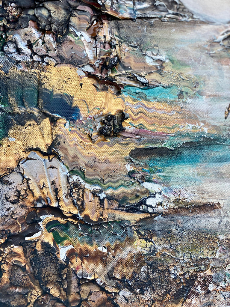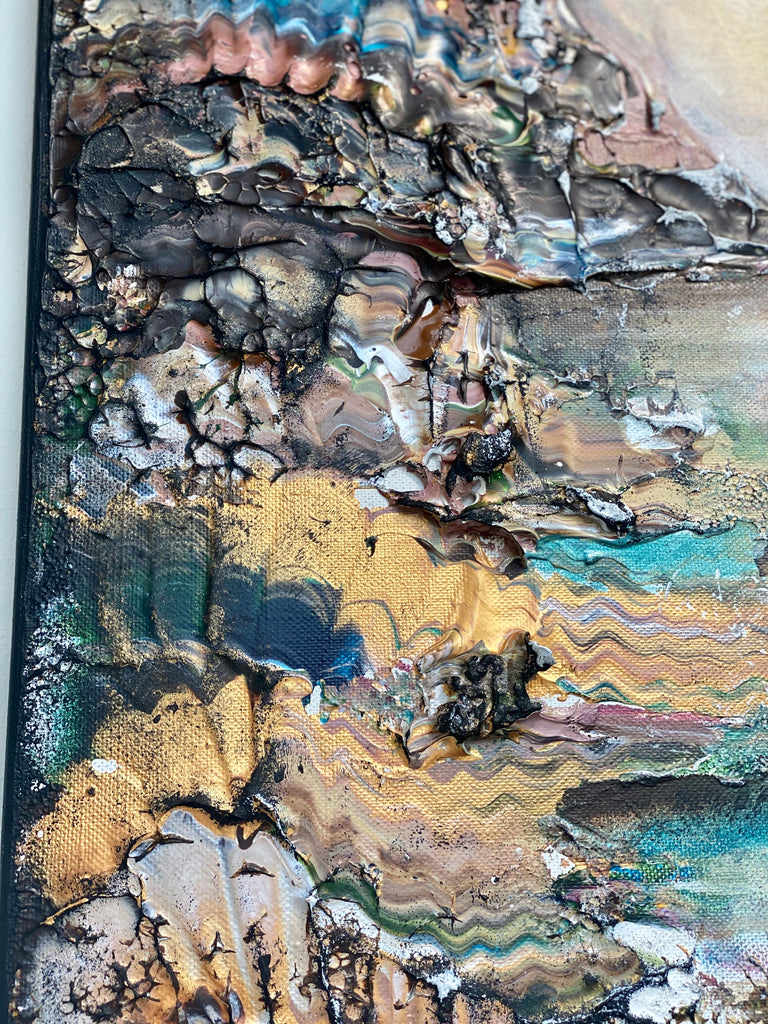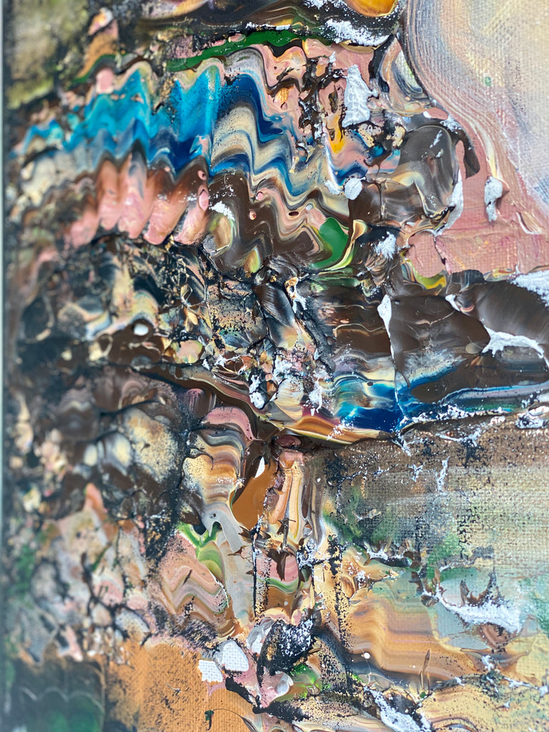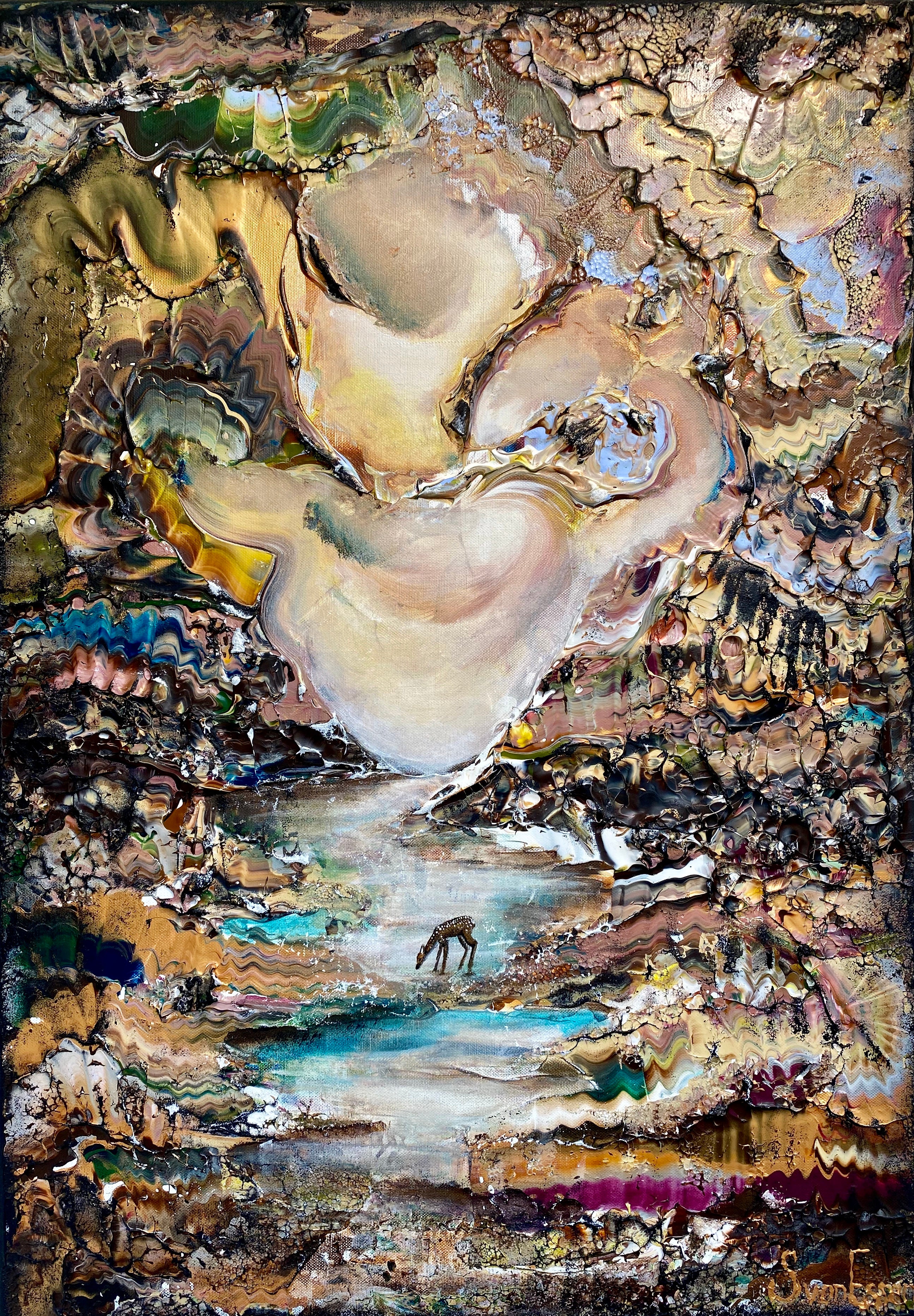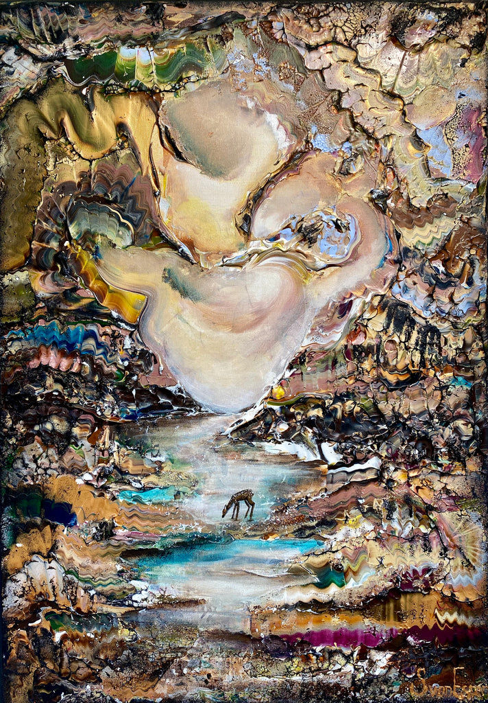 Tämä maalaus on yhdistelmä karkeaa ja lievää. Maalauksen keskiosassa on paksin maalikerros, jota olen koskaan käyttänyt. Värikerrokset antavat kolmiulotteisen tunteen ja yhdessä ohuempien osien kanssa antavat dynaamisen tunteen. Ulompi kerros on maalattu mustana, mikä minulle on melko epätavallista, mutta rakastan kuinka se myötävaikuttaa jännittävään vaikutukseen. Huomaa kultainen bambi -juomavesi järvestä.
