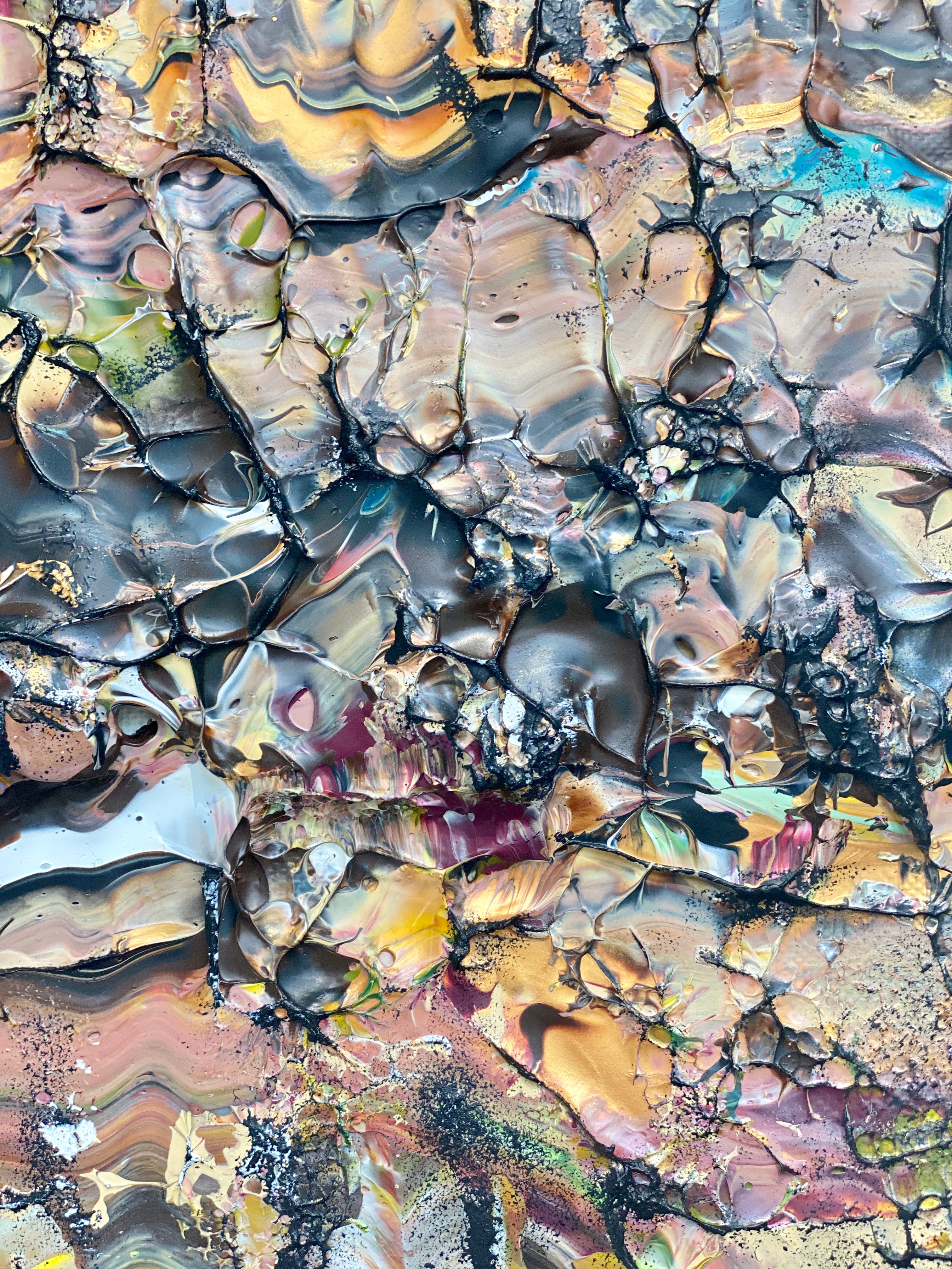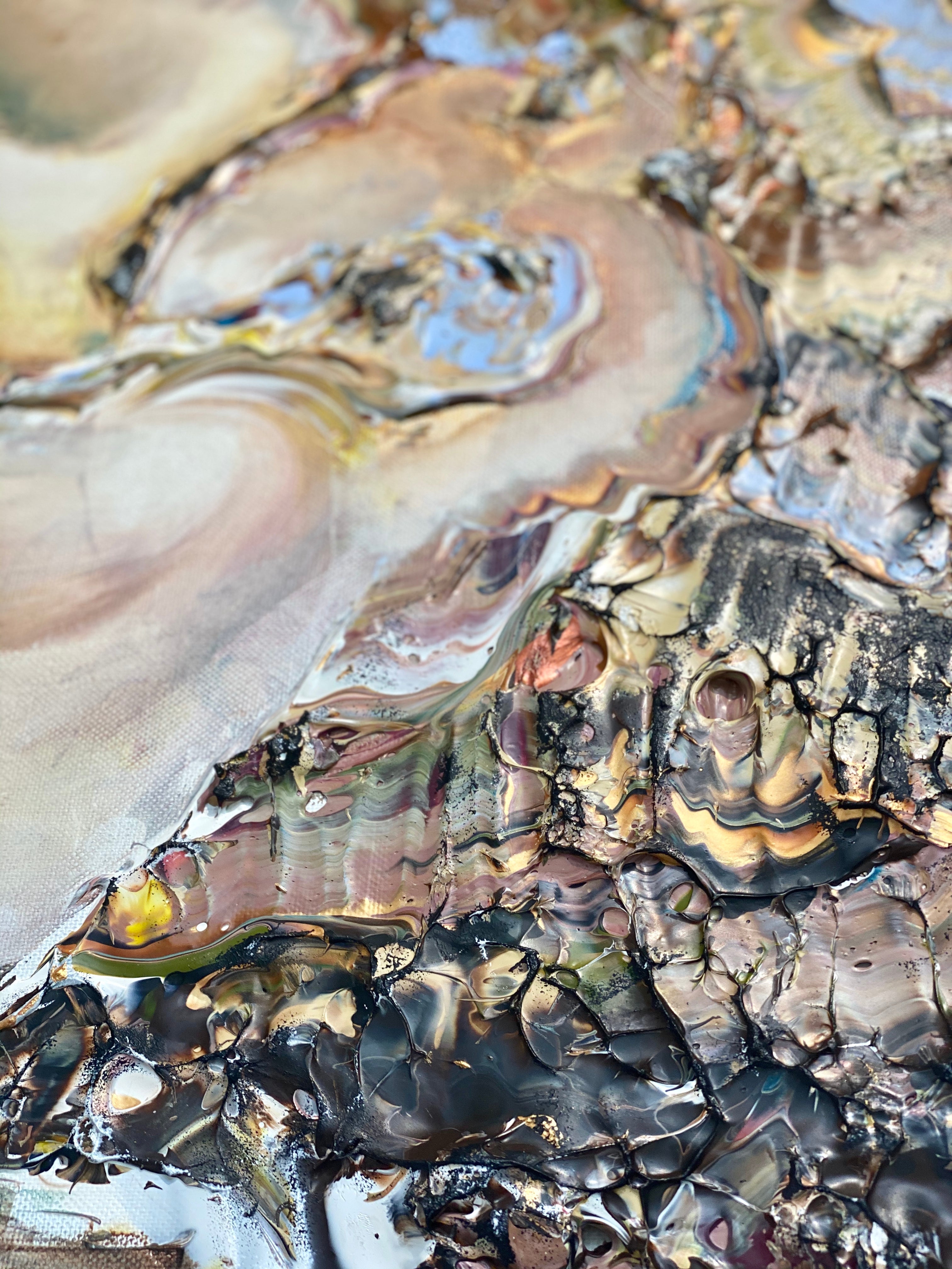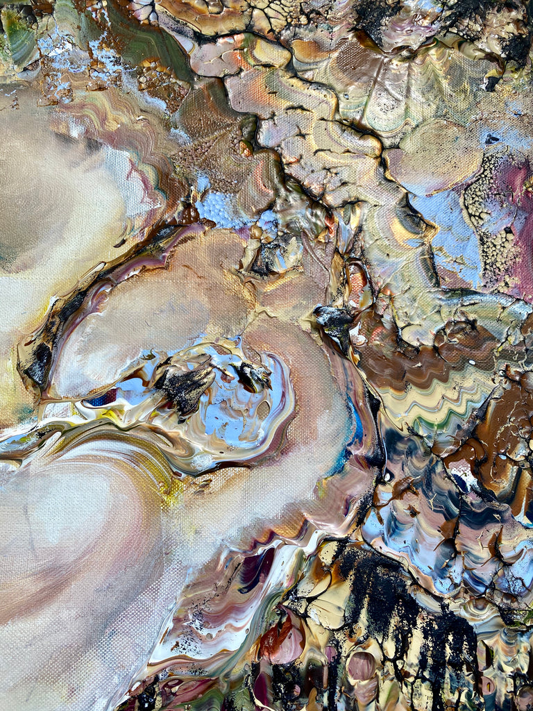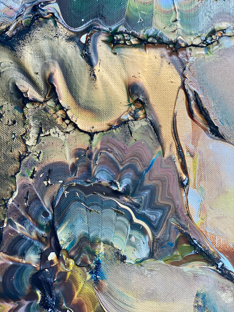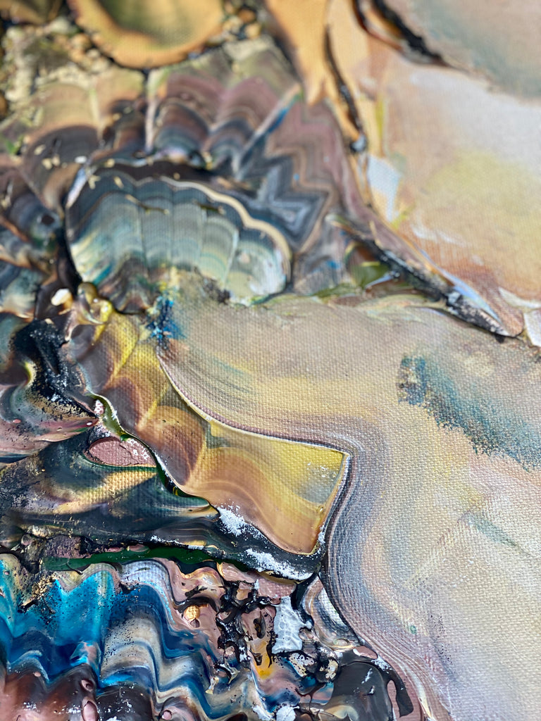 Tämä maalaus on yhdistelmä karkeaa ja lievää. Maalauksen keskiosassa on paksin maalikerros, jota olen koskaan käyttänyt. Värikerrokset antavat kolmiulotteisen tunteen ja yhdessä ohuempien osien kanssa antavat dynaamisen tunteen. Ulompi kerros on maalattu mustana, mikä minulle on melko epätavallista, mutta rakastan kuinka se myötävaikuttaa jännittävään vaikutukseen. Huomaa kultainen bambi -juomavesi järvestä.