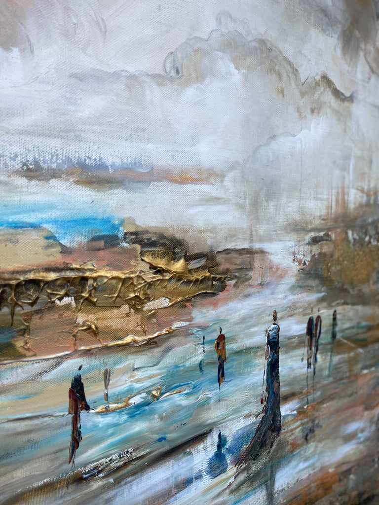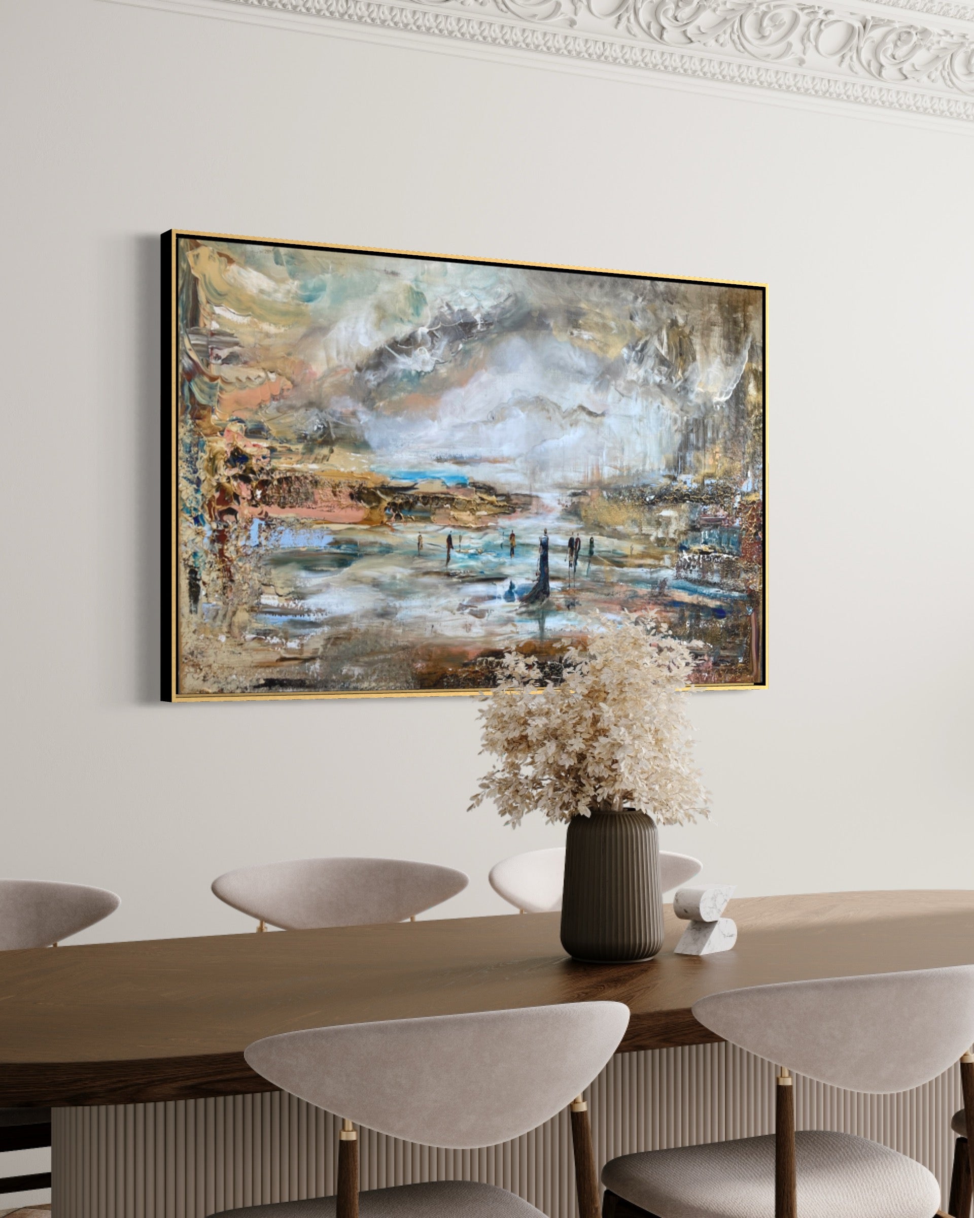 Nybrokajen kevään aikana on osa tulevaa näyttelyä Hallwylska ravintolassa. Luomalla tätä maalausta yritin vangita erityisen tunteen, joka täyttää Tukholman ilman, kun talvi on ohi ja kevät lopulta saapuu. Ihmiset kävelevät jälleen ilman monia talvivaatteiden kerroksia, tuulet ovat lämpimämpiä, linnut laulavat ja päivät ovat kauemmin. Siten käyttämäni värit ovat hiukan lämpimämpiä, maanläheisiä ja siluetteja ovat erittäin yksityiskohtaisia. Pidän erityisesti siitä, kuinka tyylikäs pitkä nainen sinisessä vaatteessaan näyttää, ikään kuin hän olisi matkalla Gatsby -juhliin, hyvin pitkän ajan kuluttua.