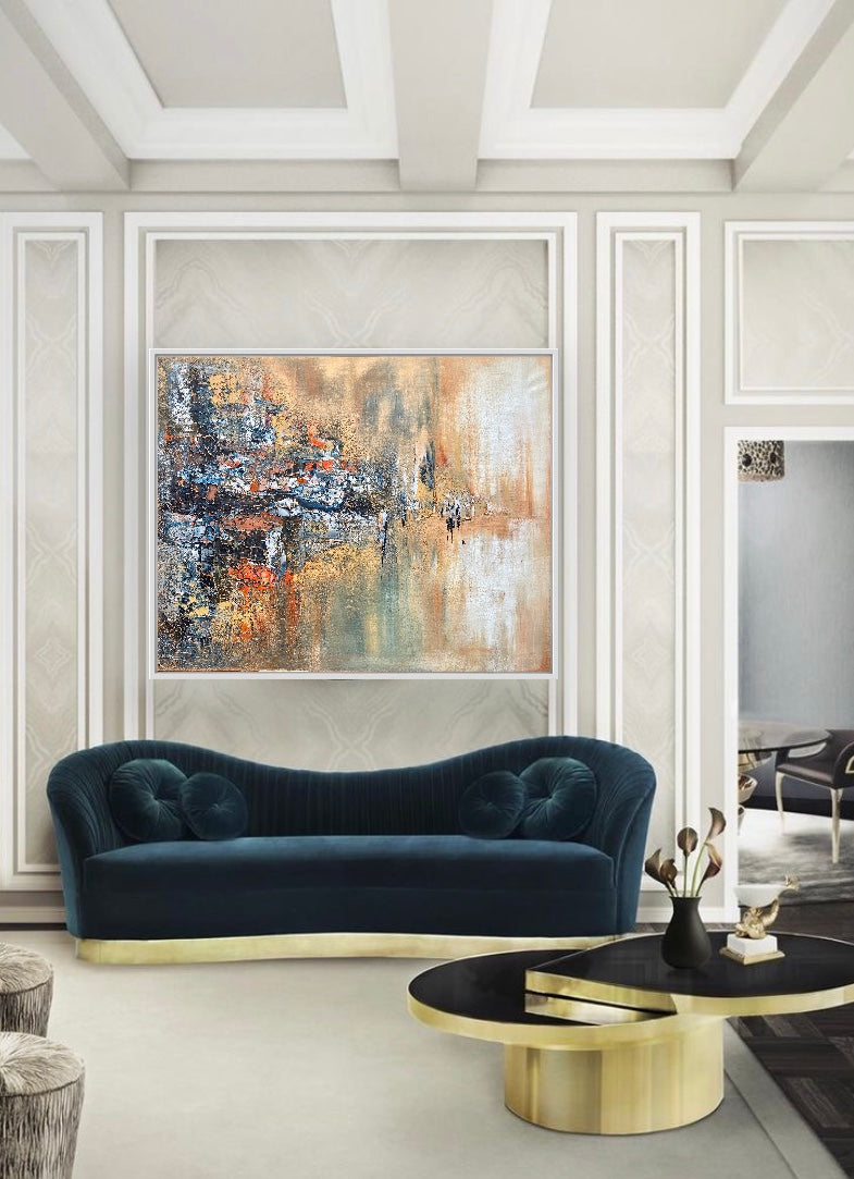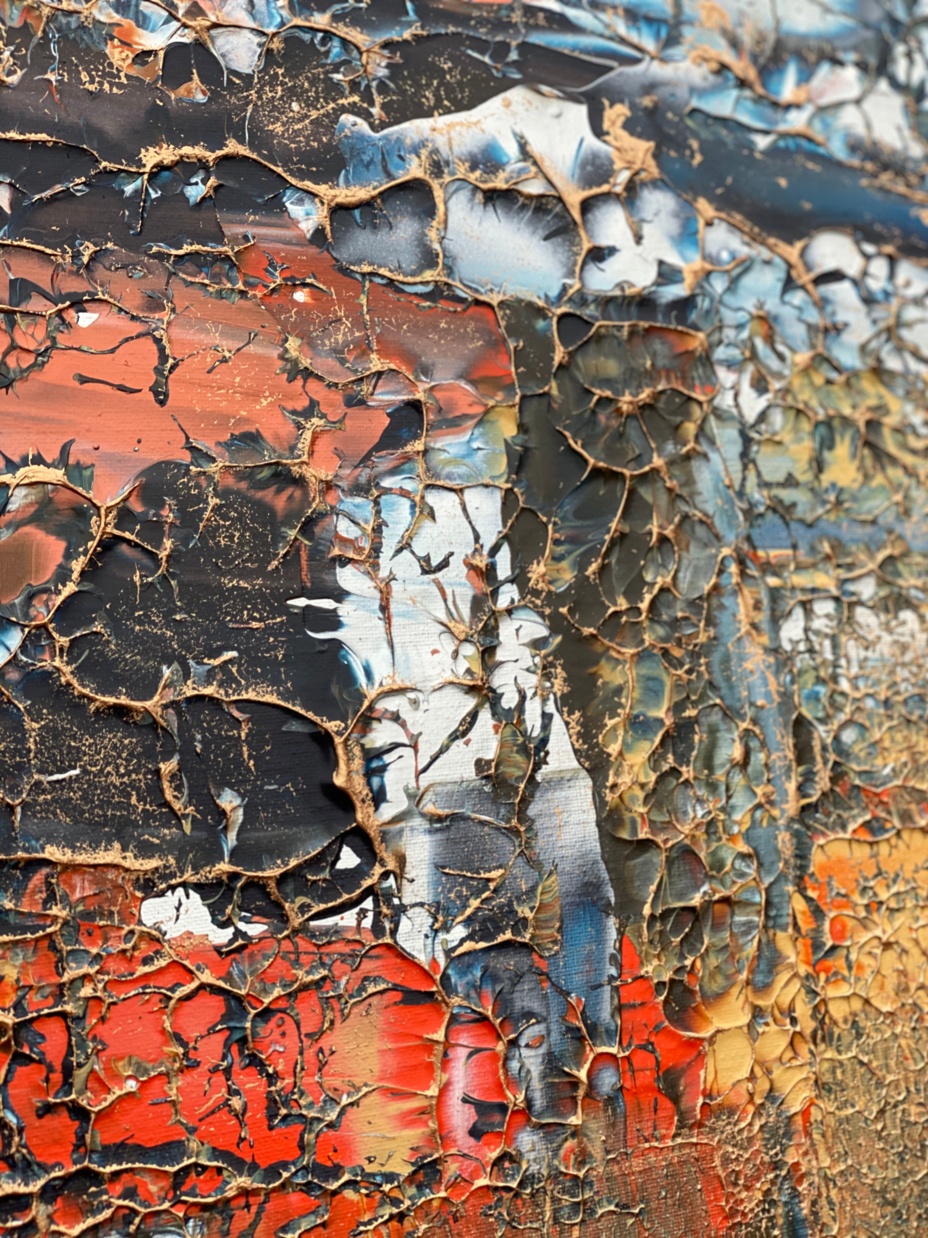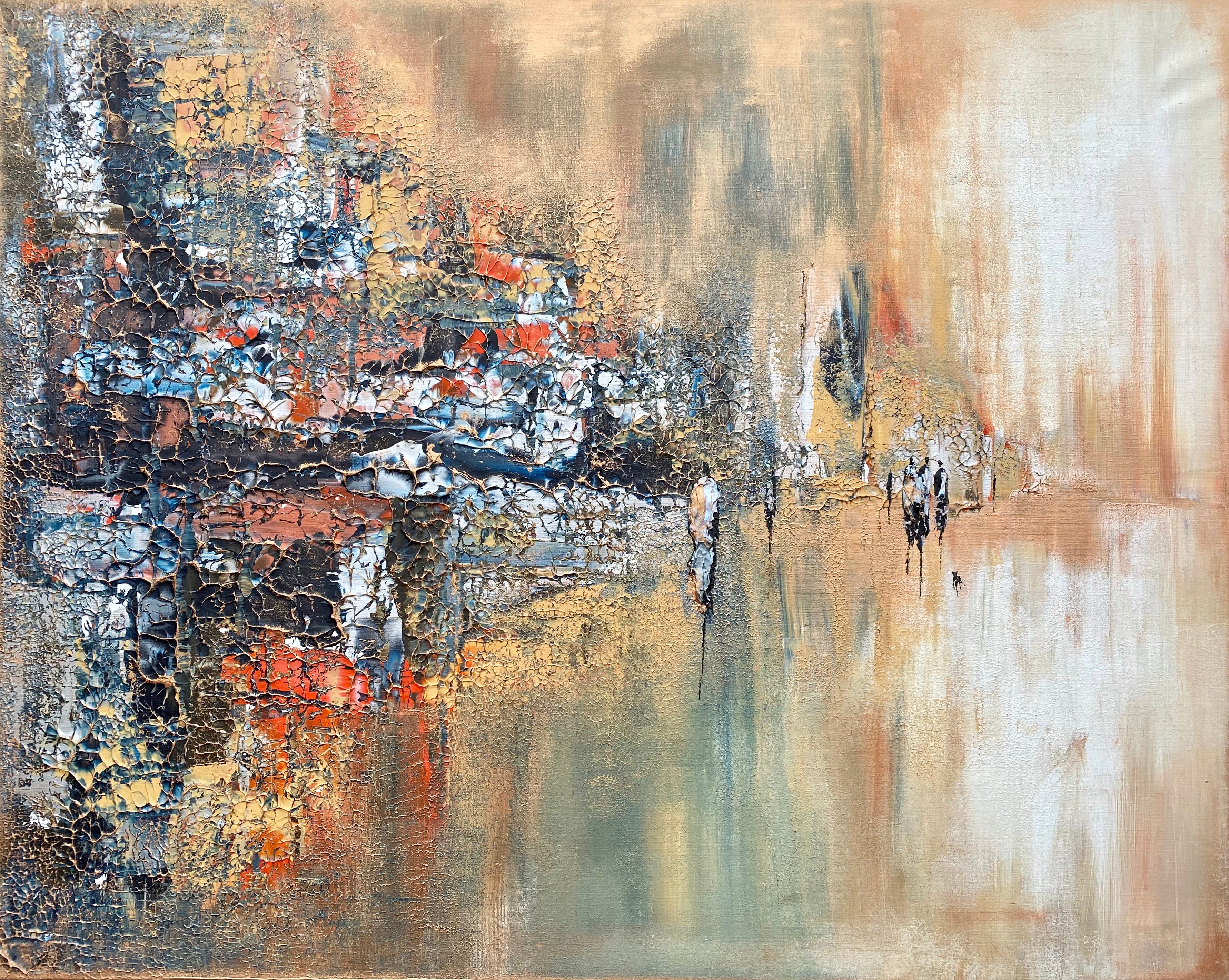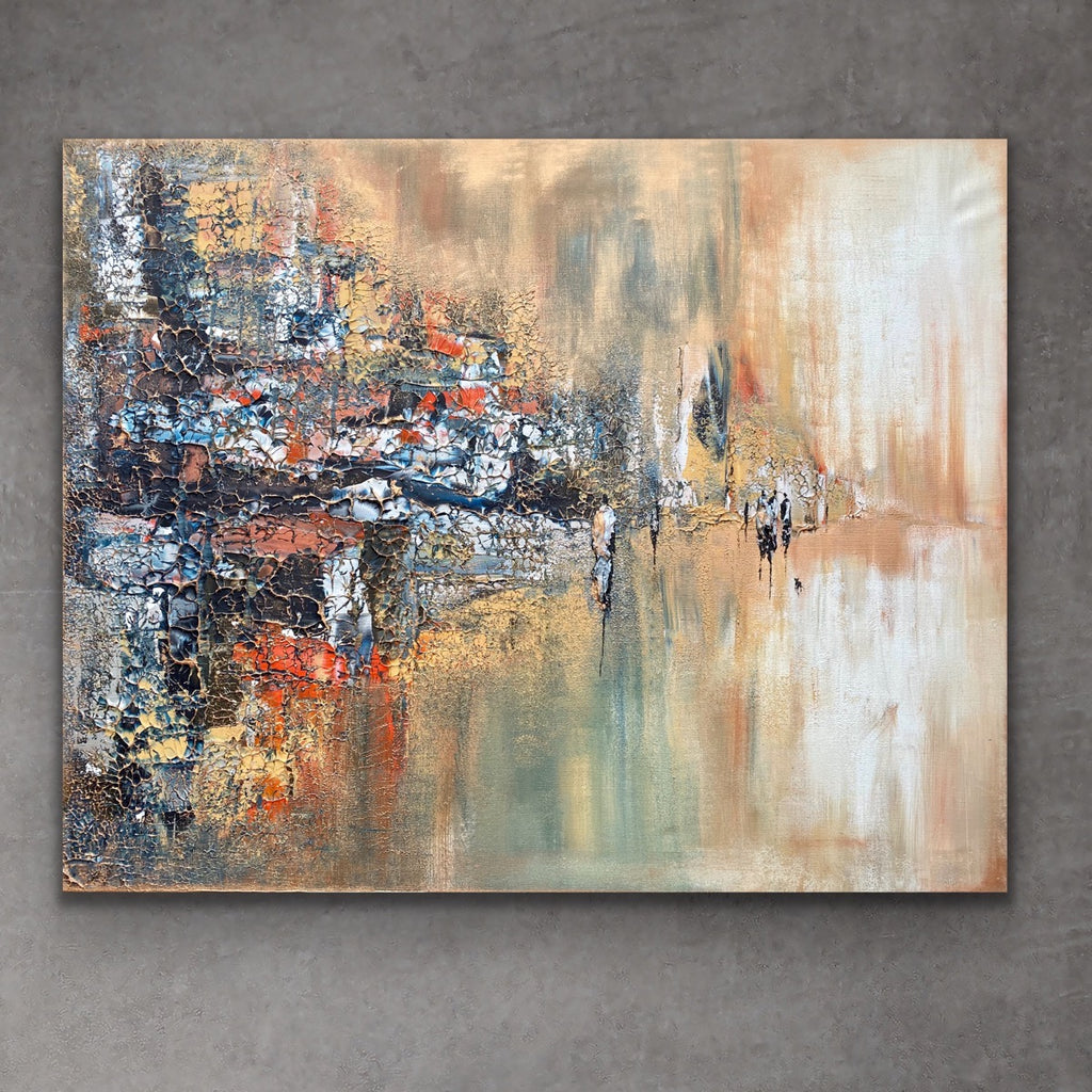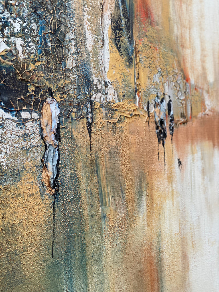 Dipinto acrilico con una tavolozza di colori di bianco, bianco perla, marrone, giallo, blu, arancione, blu, rame, bronzo, argento e oro.