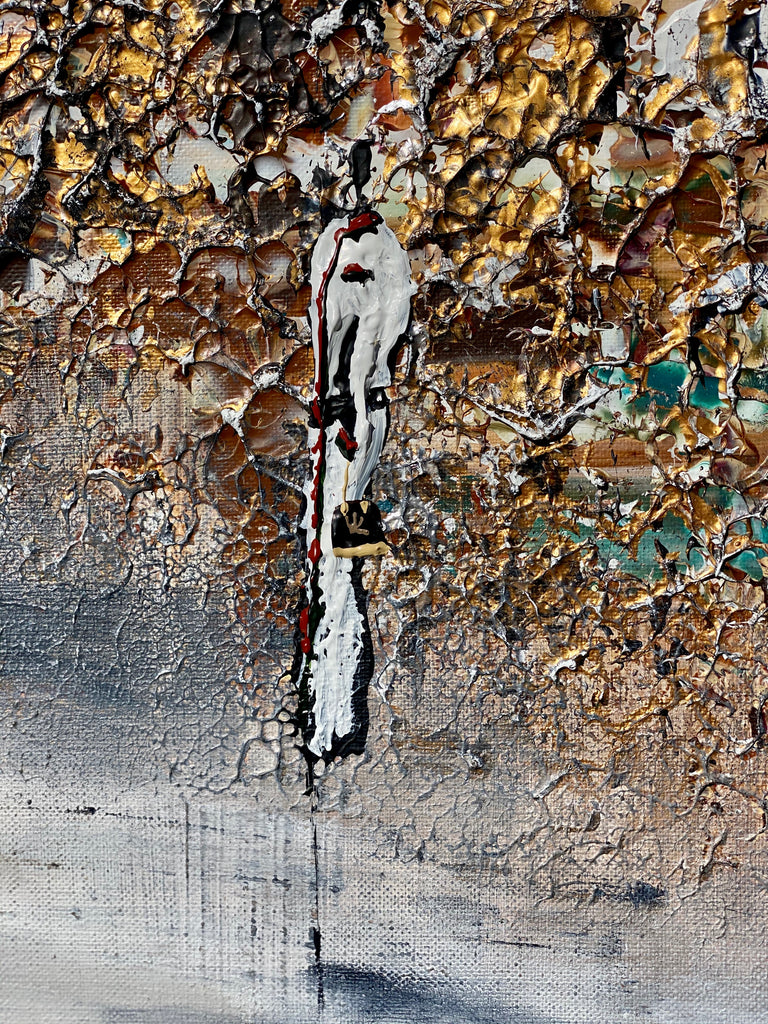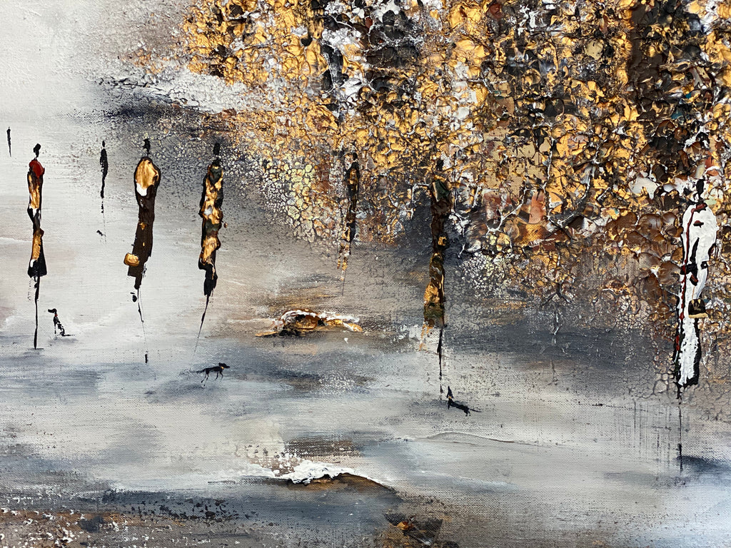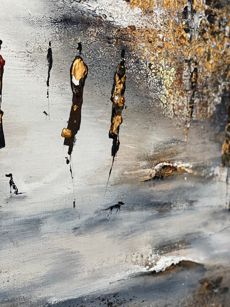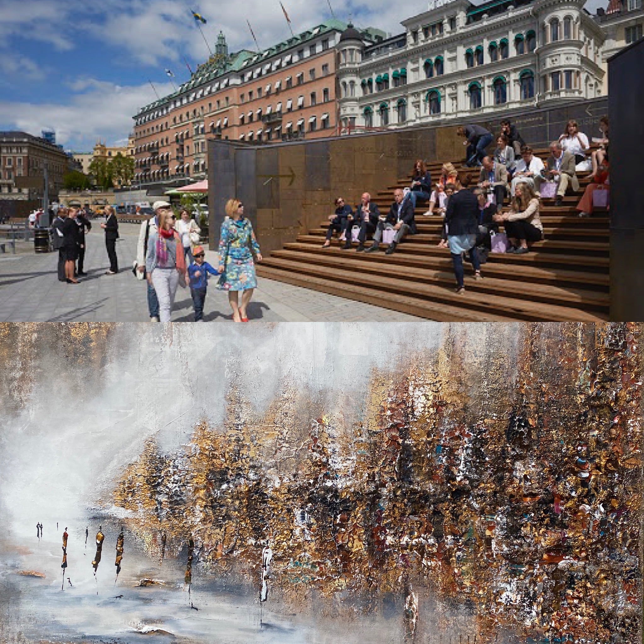 La bella "Strömkajen" vicino al Grand Hotel di Stoccolma è uno dei miei preferiti. Adoro le combinazioni di colori di argento oro e rame che insieme crea una lucentezza calda. Molti molti strati uno sopra l'altro creano una nuova dimensione del dipinto che lo rende ruvido e robusto. All'interno di questo dipinto ho lavorato molto con i piccoli dettagli, come la borsa Louis Vuitton e il cappotto Gucci che dà alla pittura una storia.