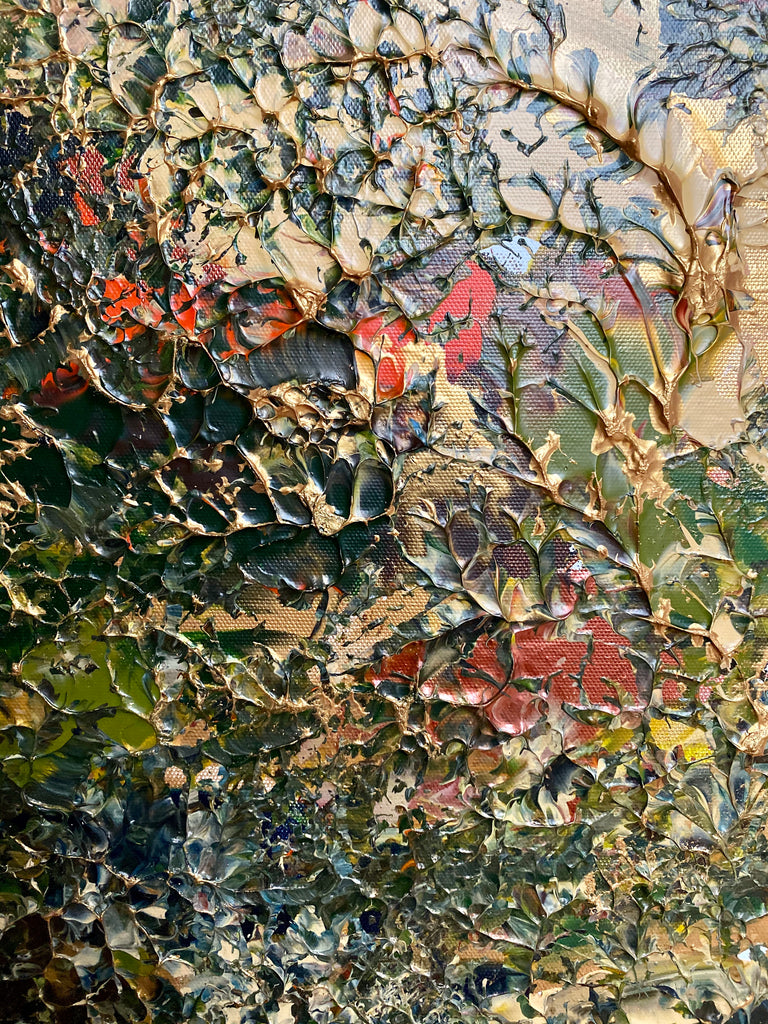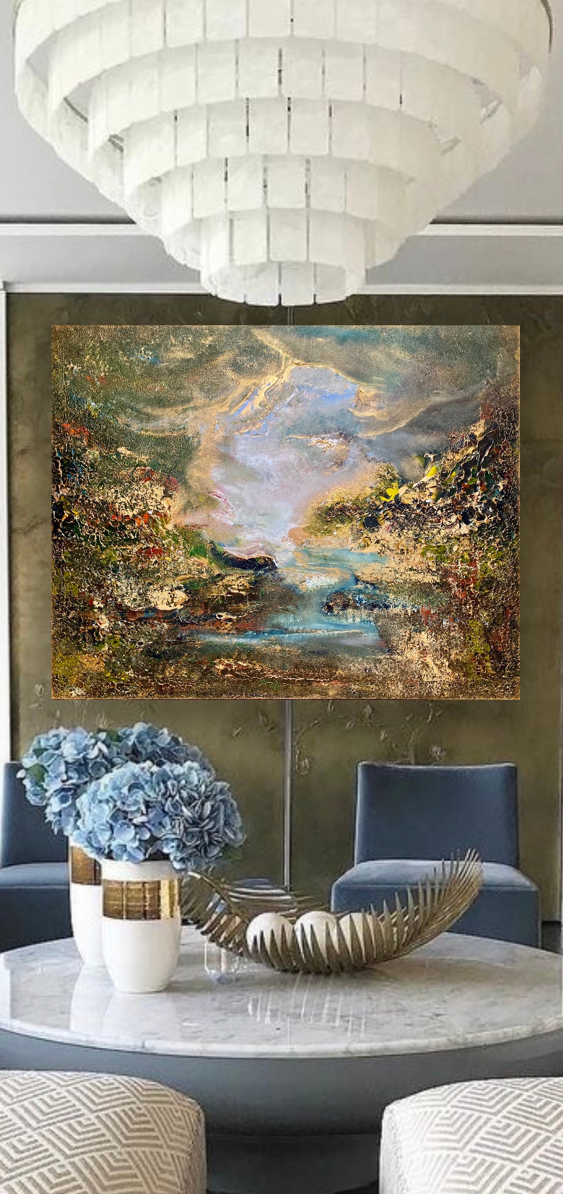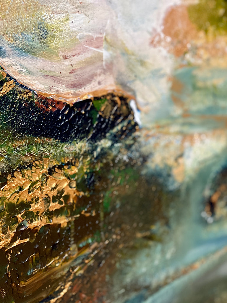 Akrylmaleri med en fargepalett med hvit, perlehvit, brun, beige, rød, oransje, blå, grønn, turkis, metallblått, kobber, bronse, sølv og gull.