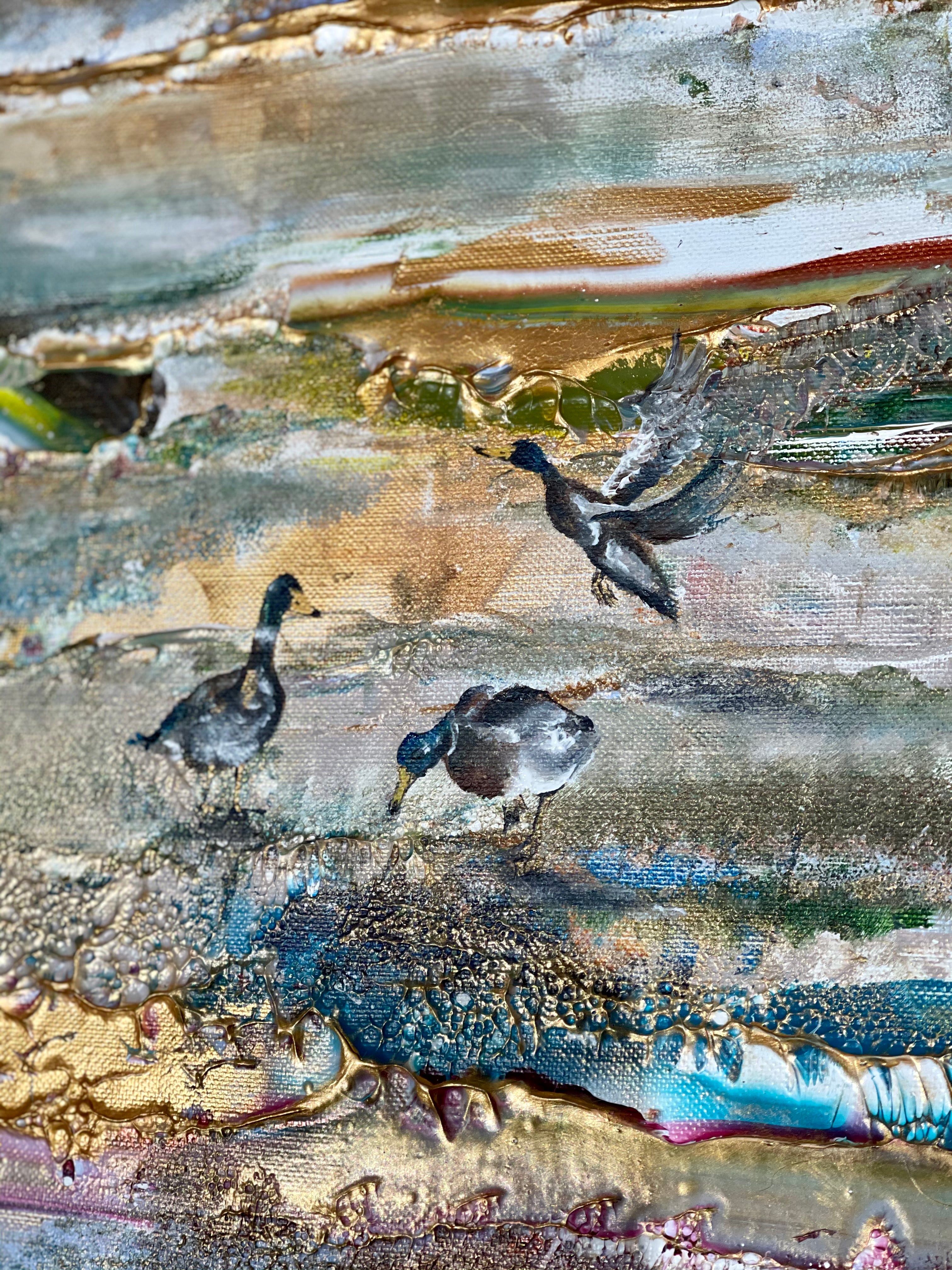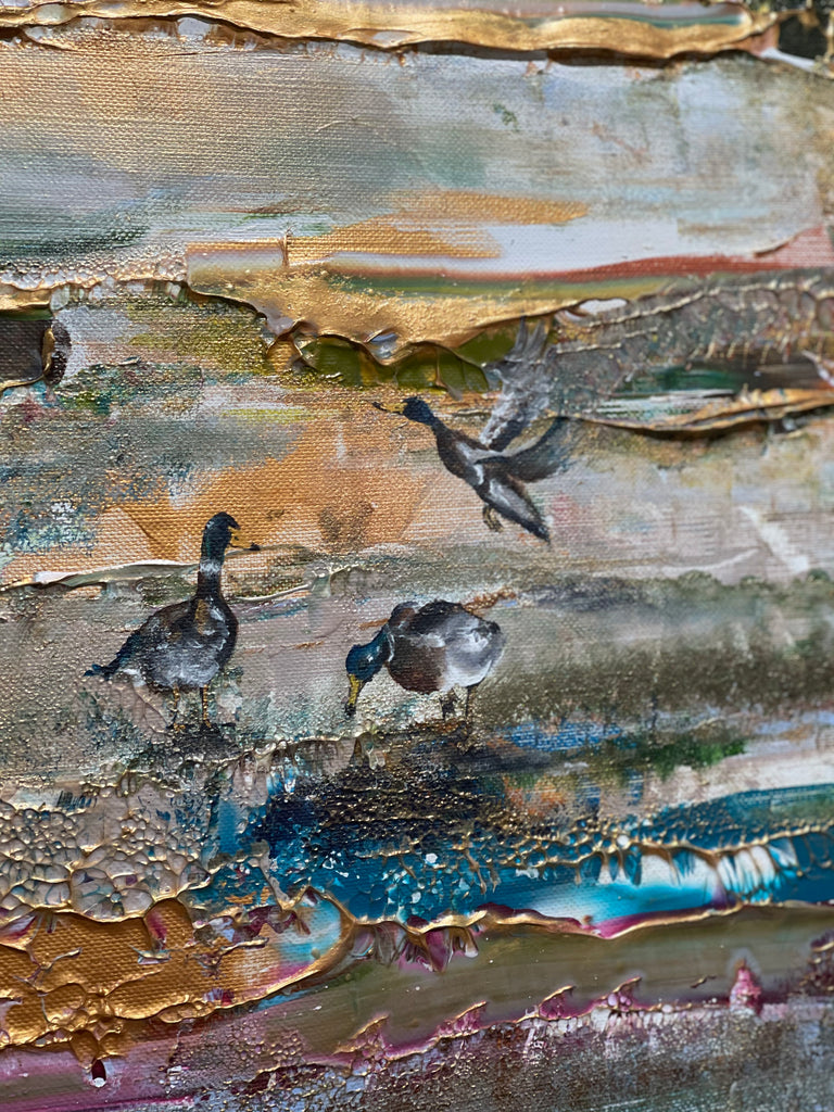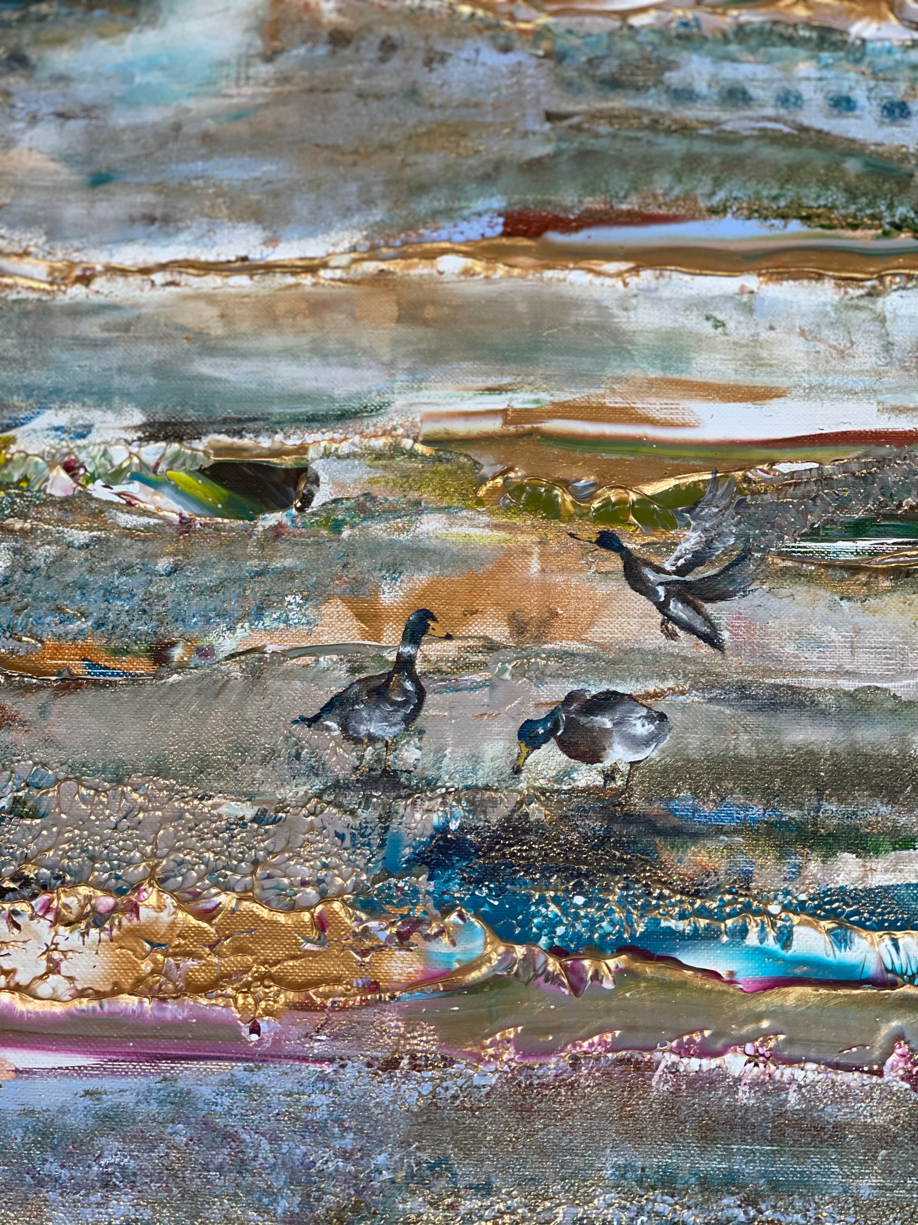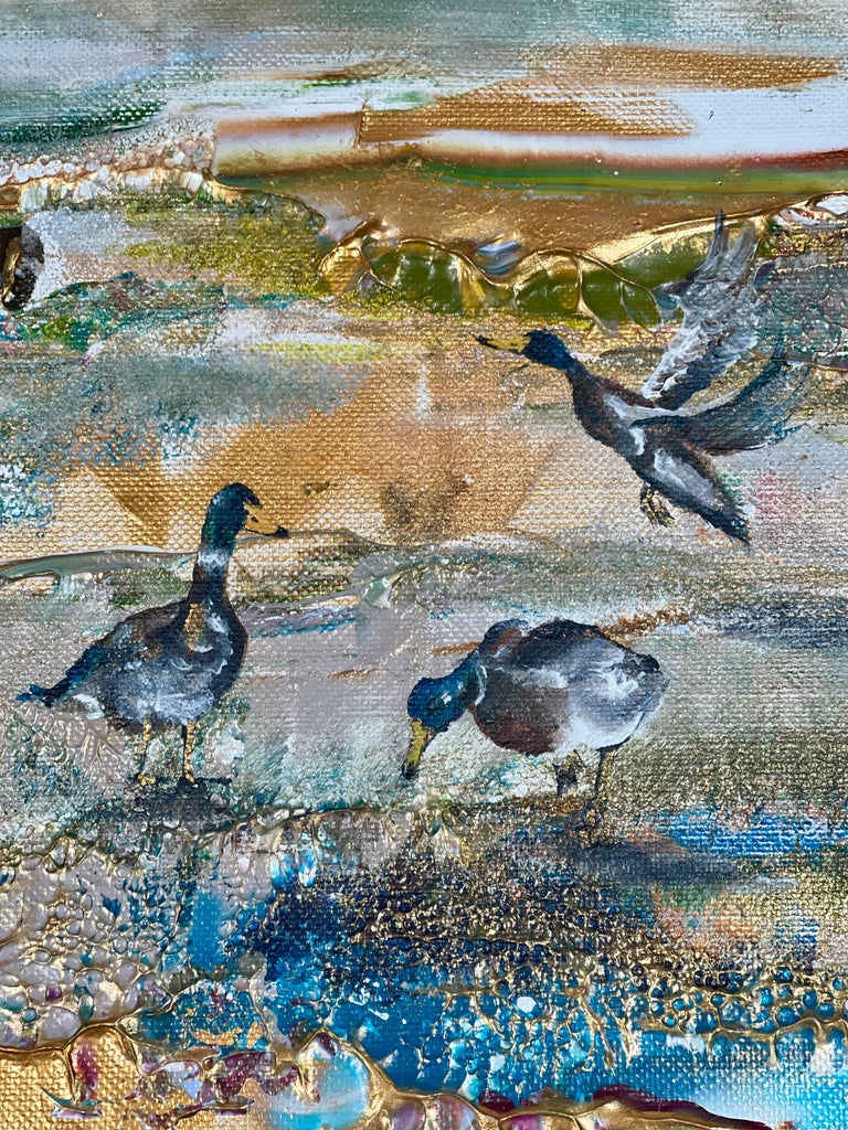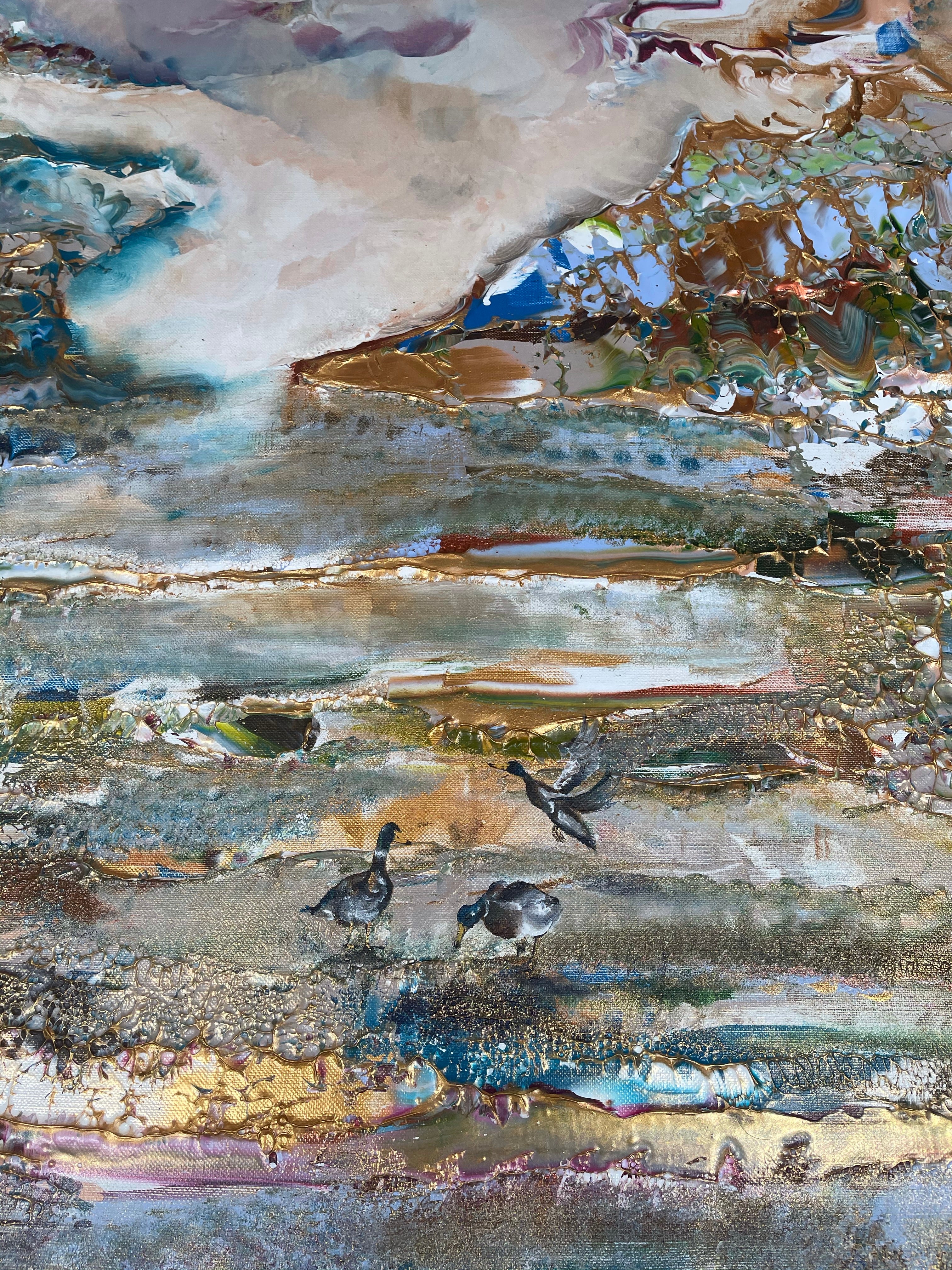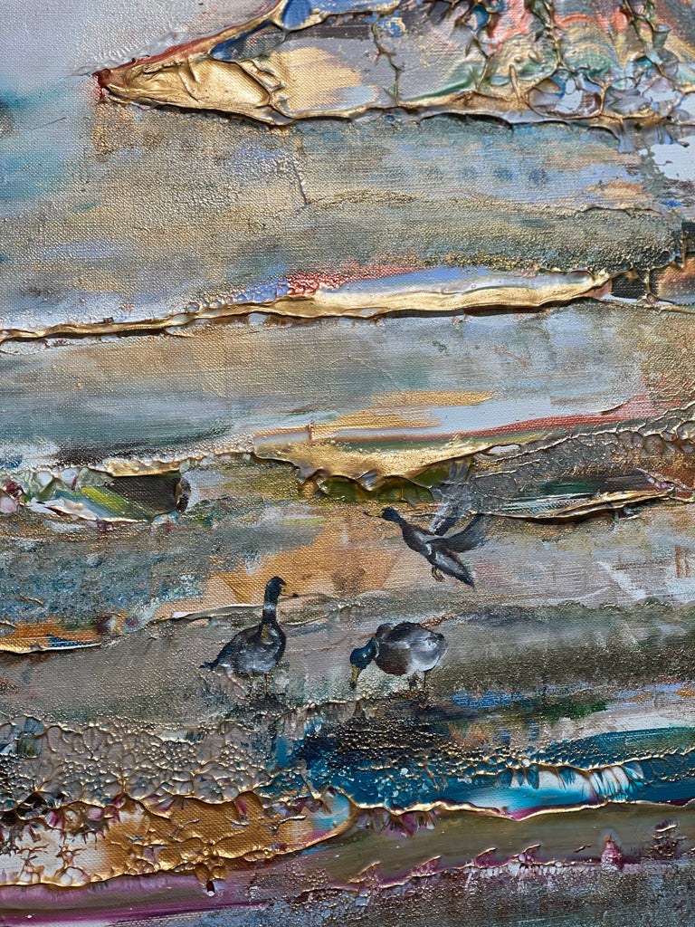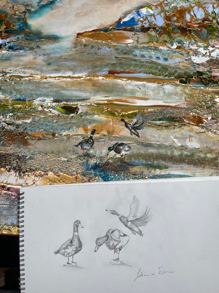 Med inspirasjon fra Djurgårskanalen. Jeg har blitt spesielt inspirert av den lille stranden i begynnelsen av Djurgårdspromenaden, der ender vanligvis ligger og nyter solen. Å blande konkrete detaljer i et abstrakt miljø er virkelig noe jeg har hatt glede av å skape.