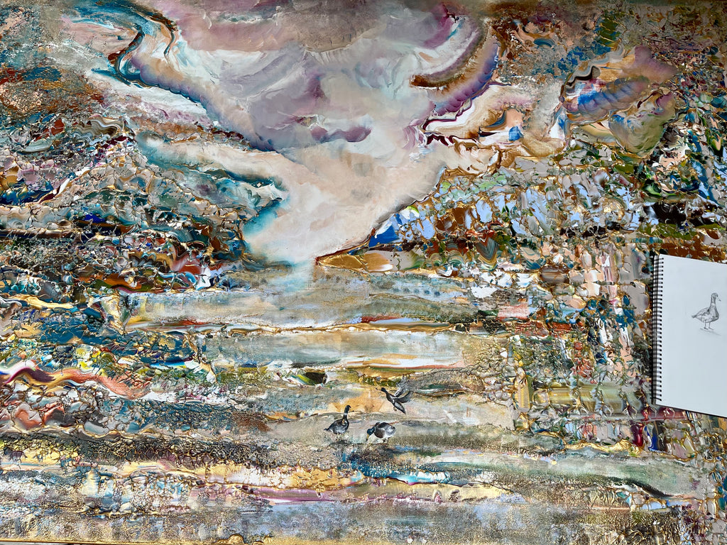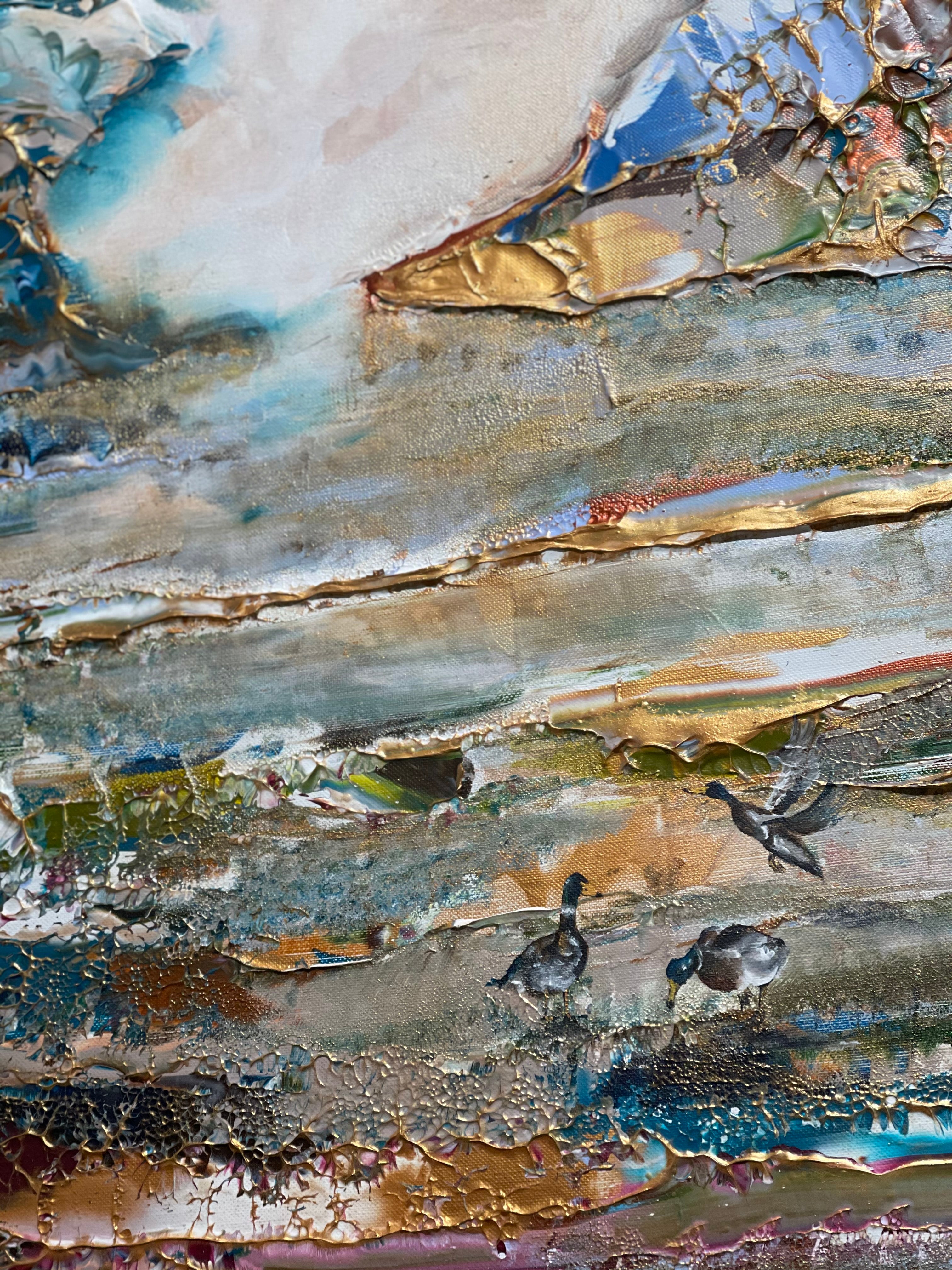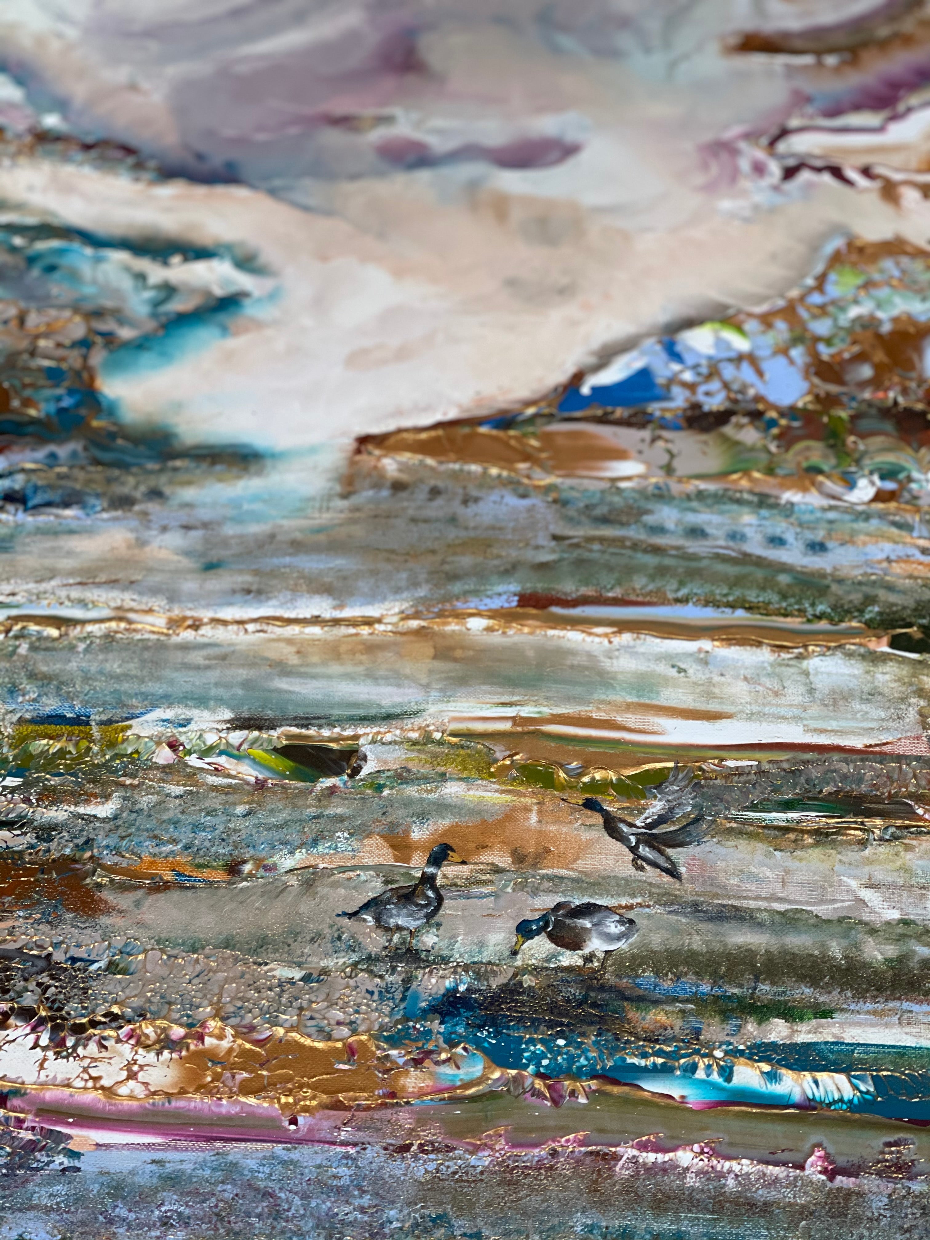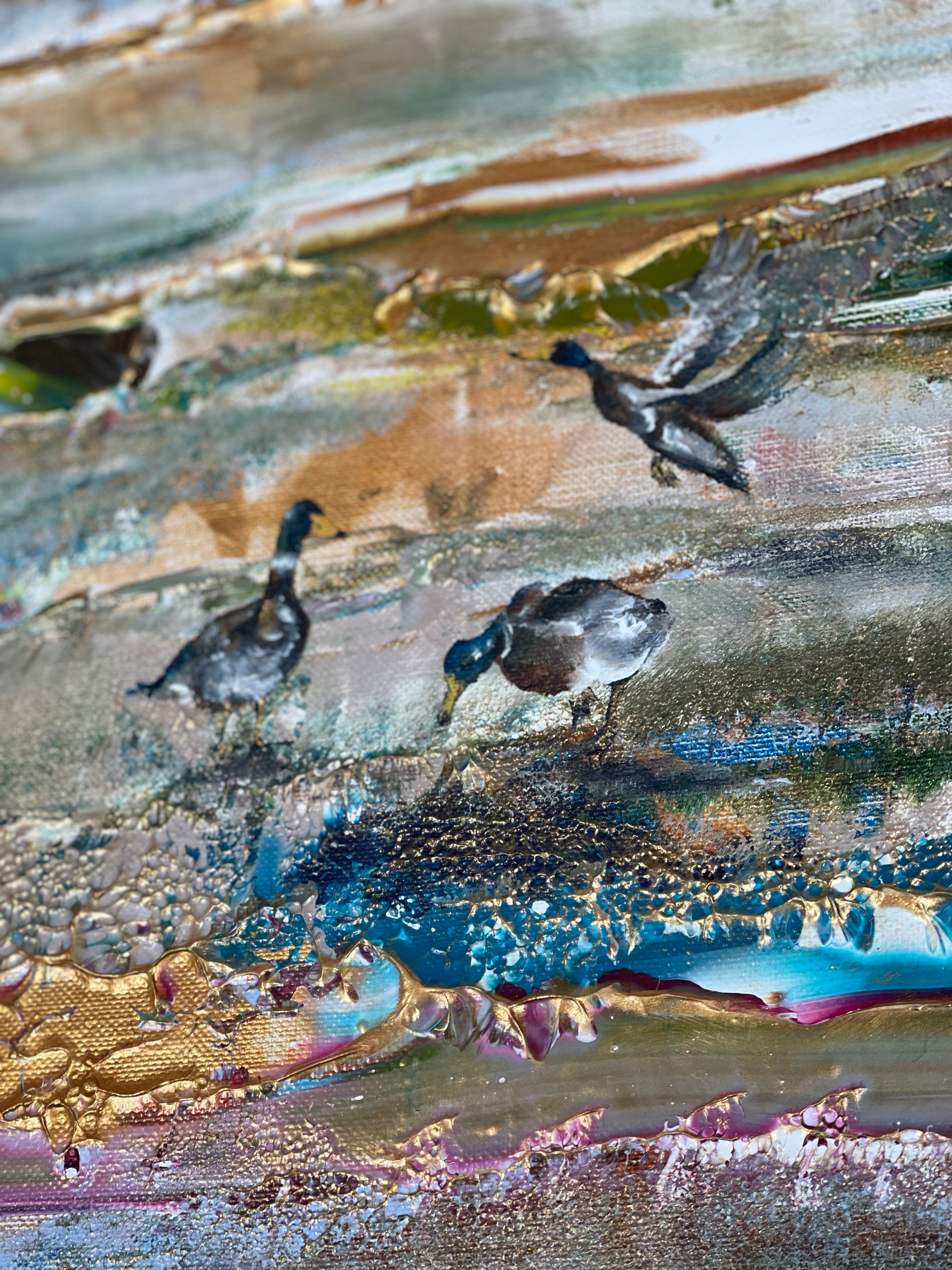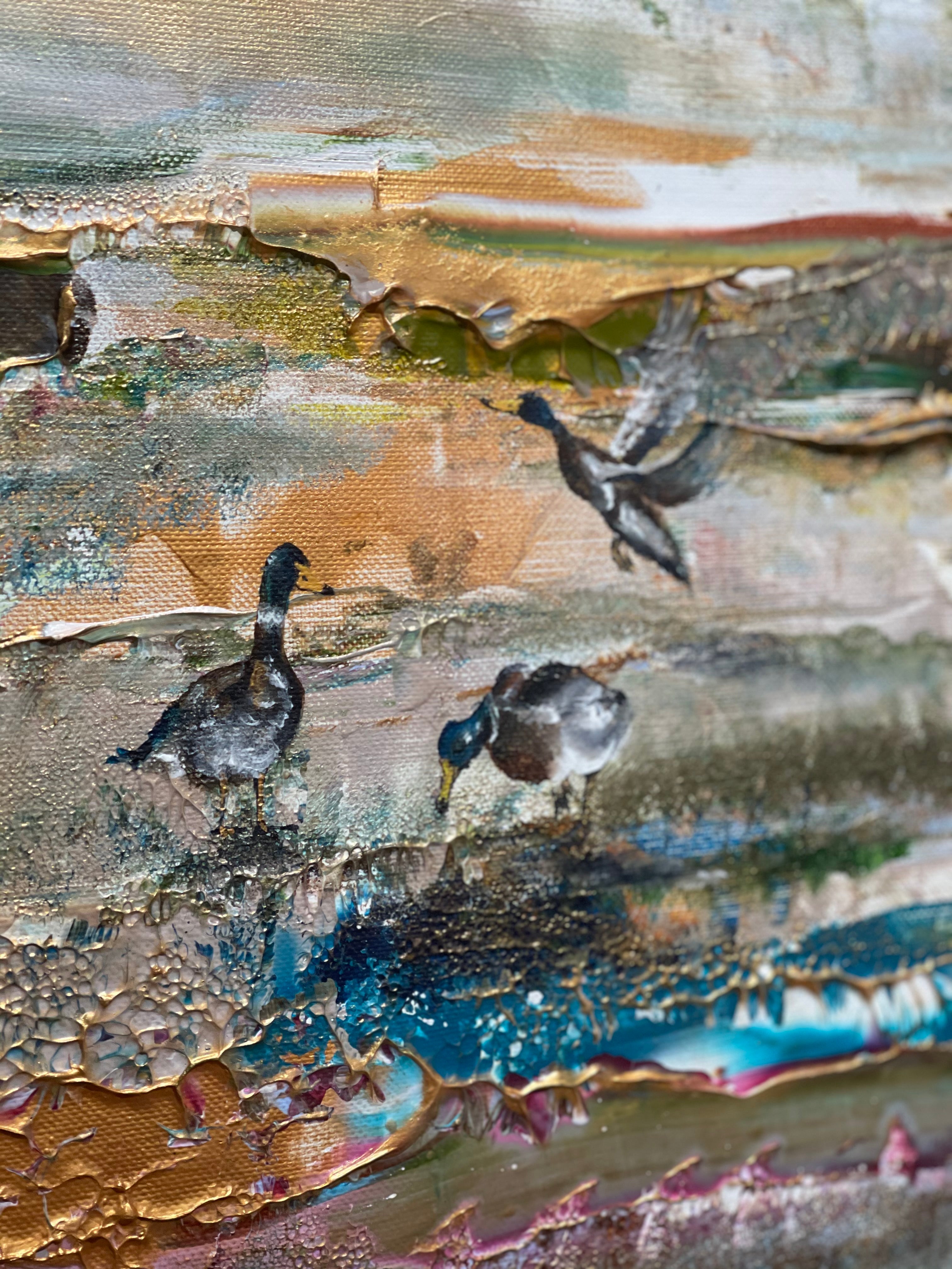 Med inspirasjon fra Djurgårskanalen. Jeg har blitt spesielt inspirert av den lille stranden i begynnelsen av Djurgårdspromenaden, der ender vanligvis ligger og nyter solen. Å blande konkrete detaljer i et abstrakt miljø er virkelig noe jeg har hatt glede av å skape.