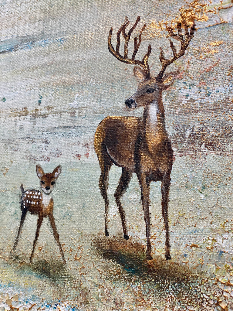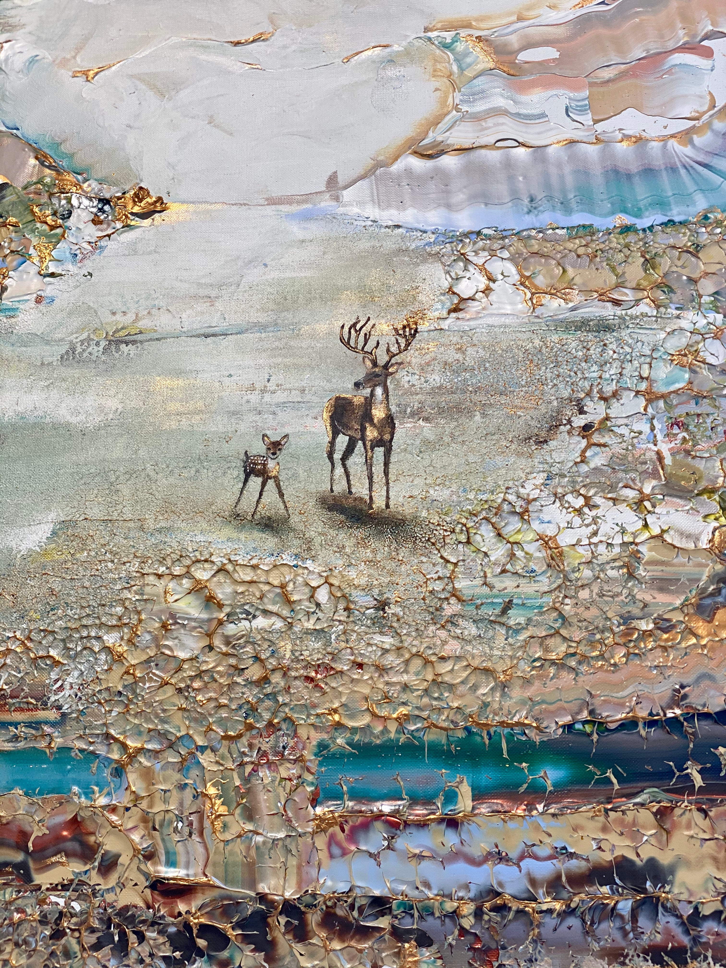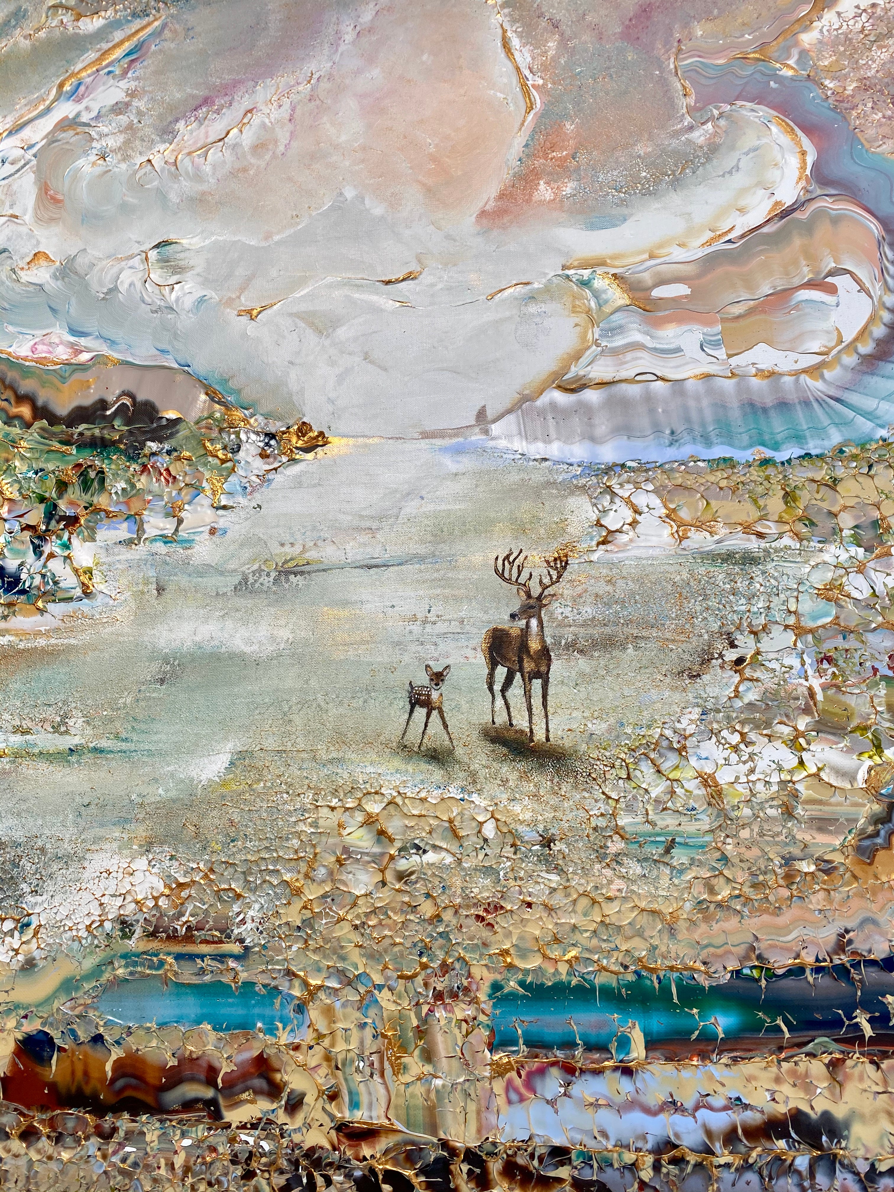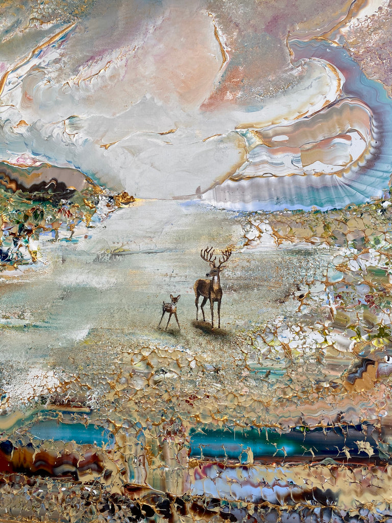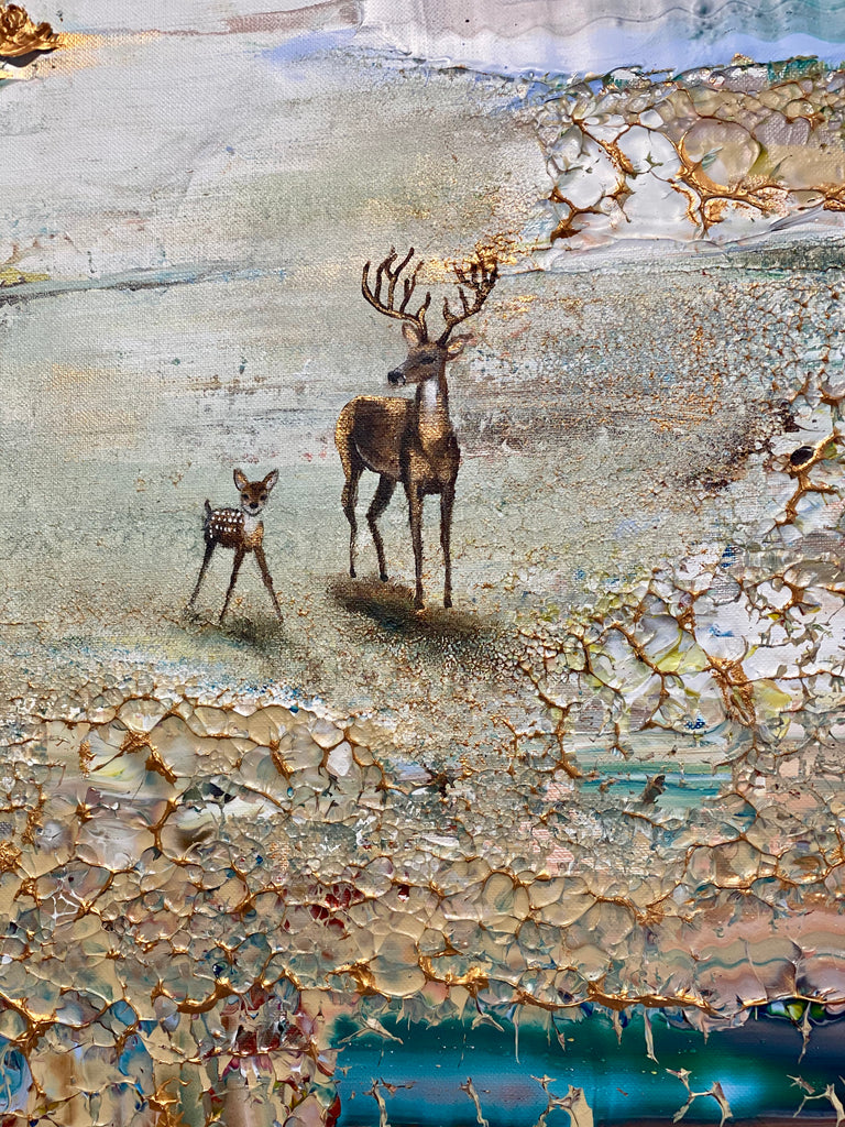 Inspirert av den vakre Vikdalen i Nacka. Her famler og jeg har gått i mange turer og ofte sett hjort (som hun elsker å jakte). I dette maleriet har jeg brukt mange lyse fargekombinasjoner som jeg ikke har en tendens til å gjøre. Inntrykket er et rolig og harmonisk miljø der hjorten kan leve fritt.