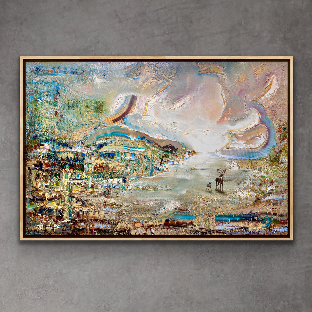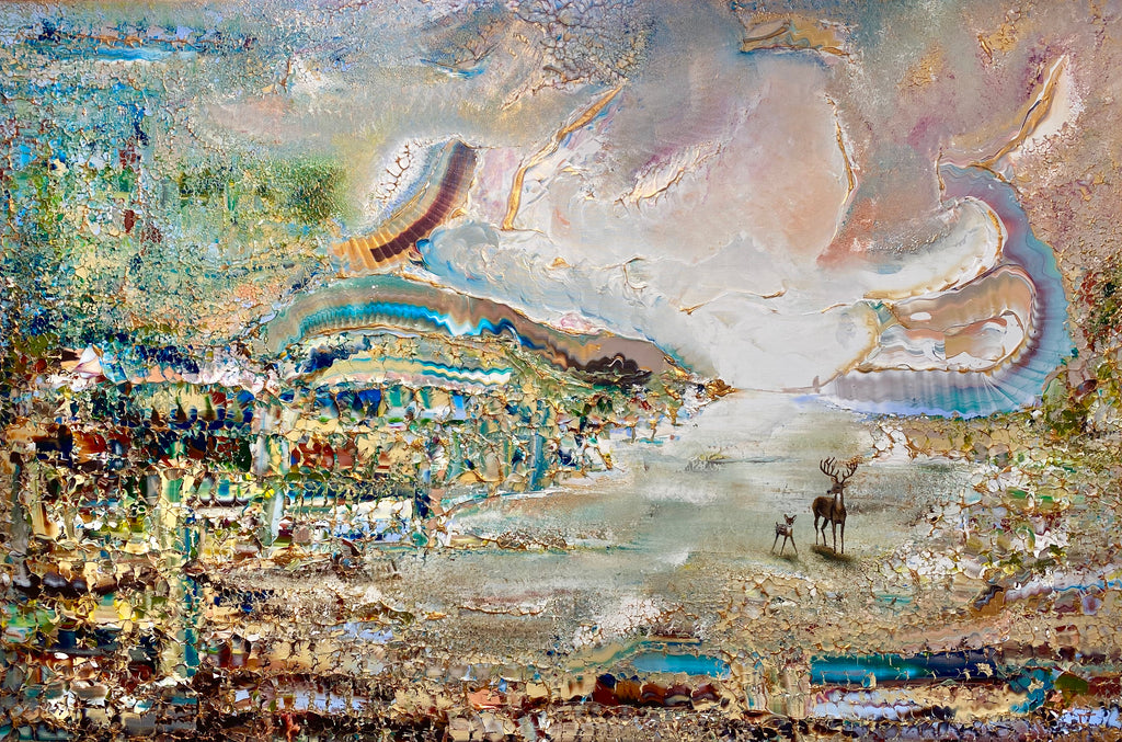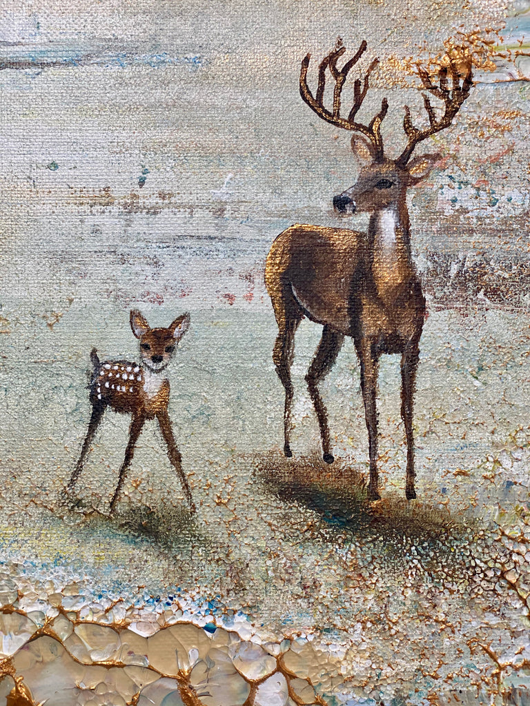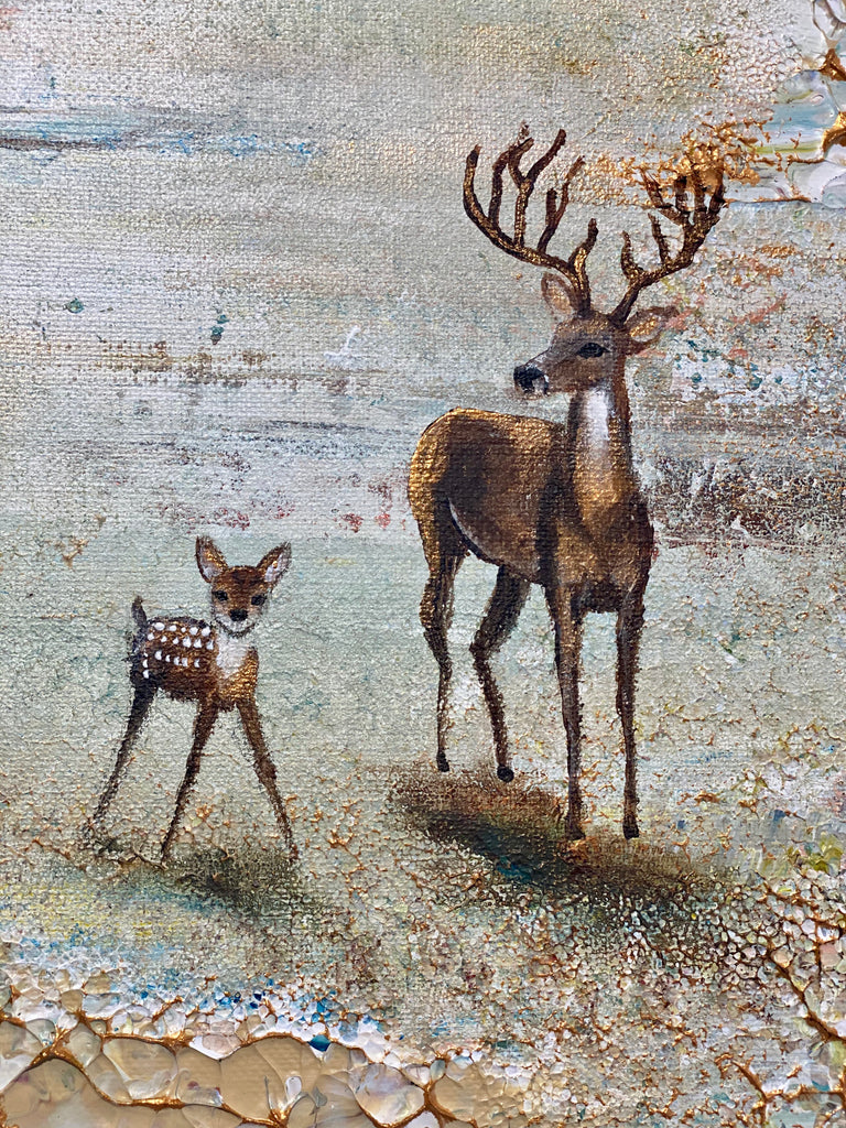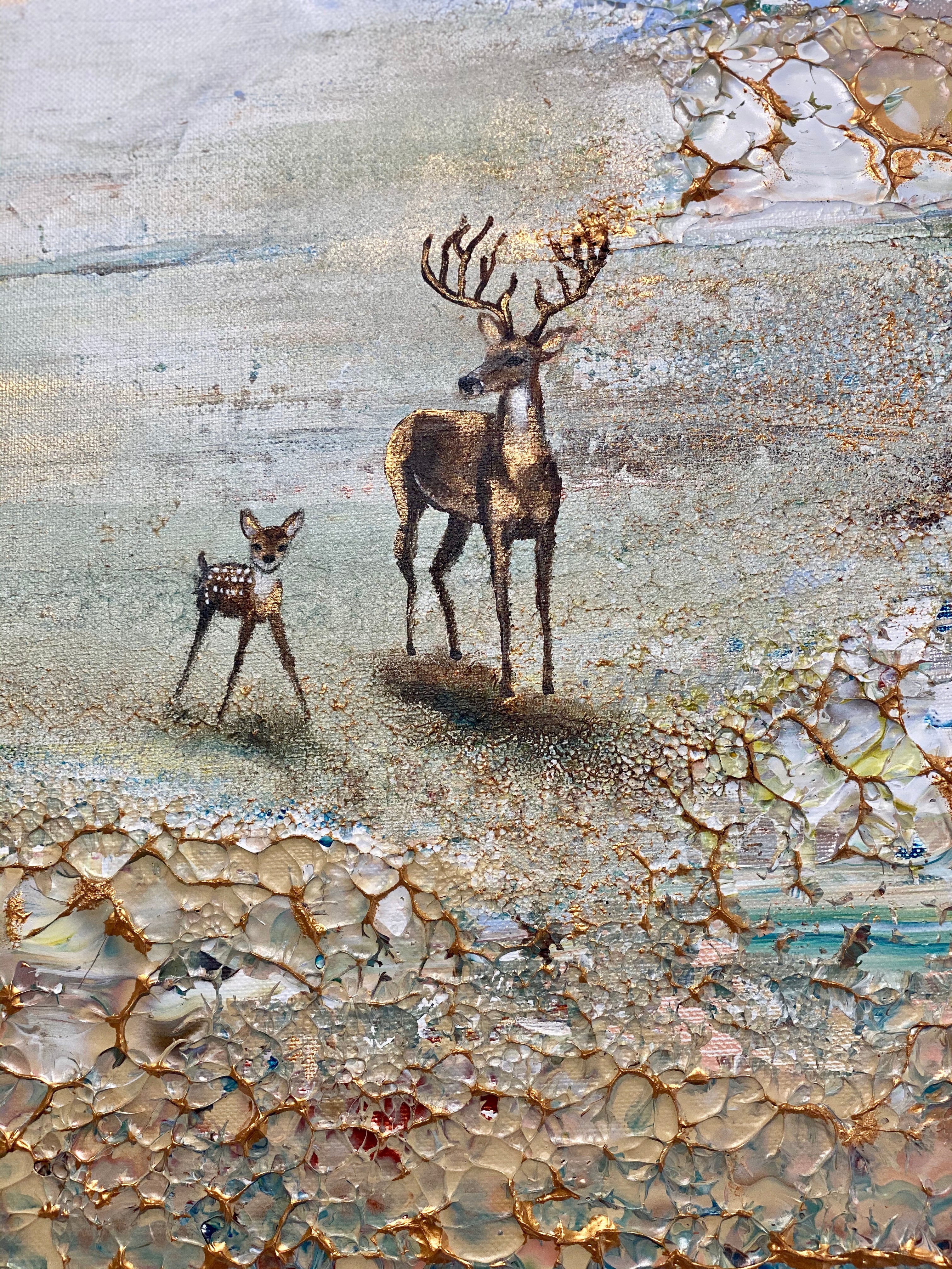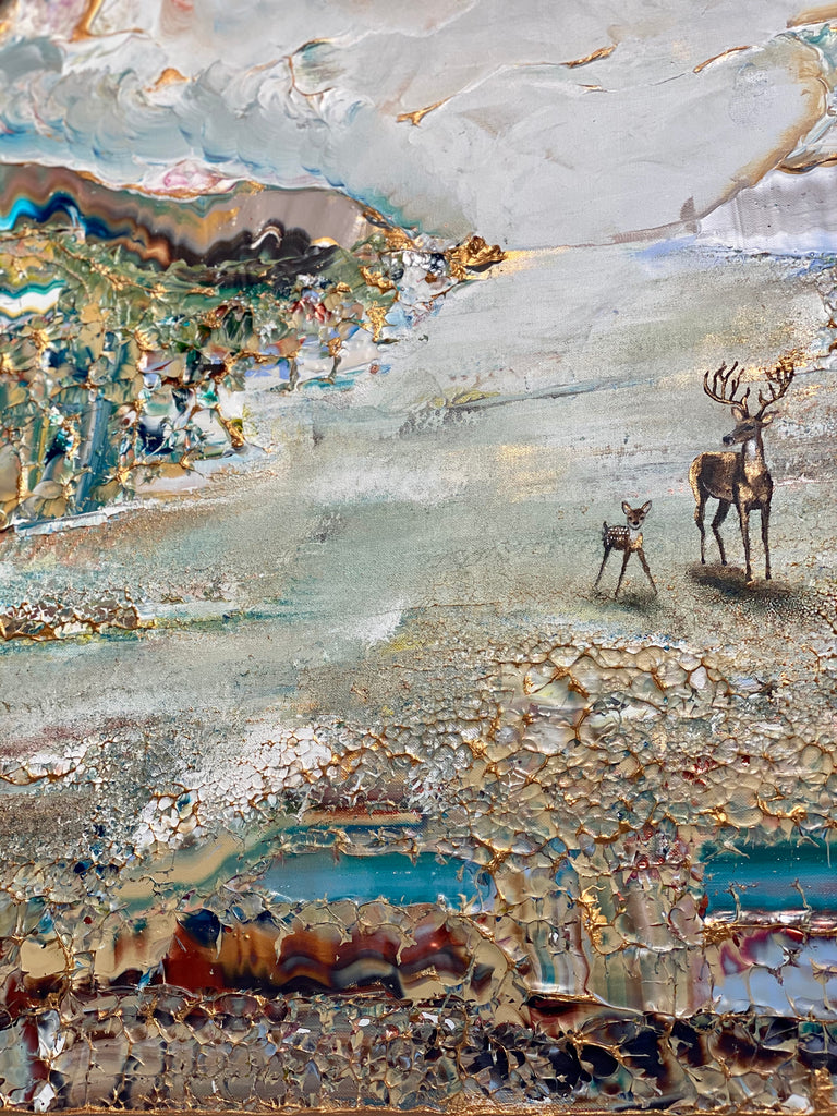 Inspirert av den vakre Vikdalen i Nacka. Her famler og jeg har gått i mange turer og ofte sett hjort (som hun elsker å jakte). I dette maleriet har jeg brukt mange lyse fargekombinasjoner som jeg ikke har en tendens til å gjøre. Inntrykket er et rolig og harmonisk miljø der hjorten kan leve fritt.