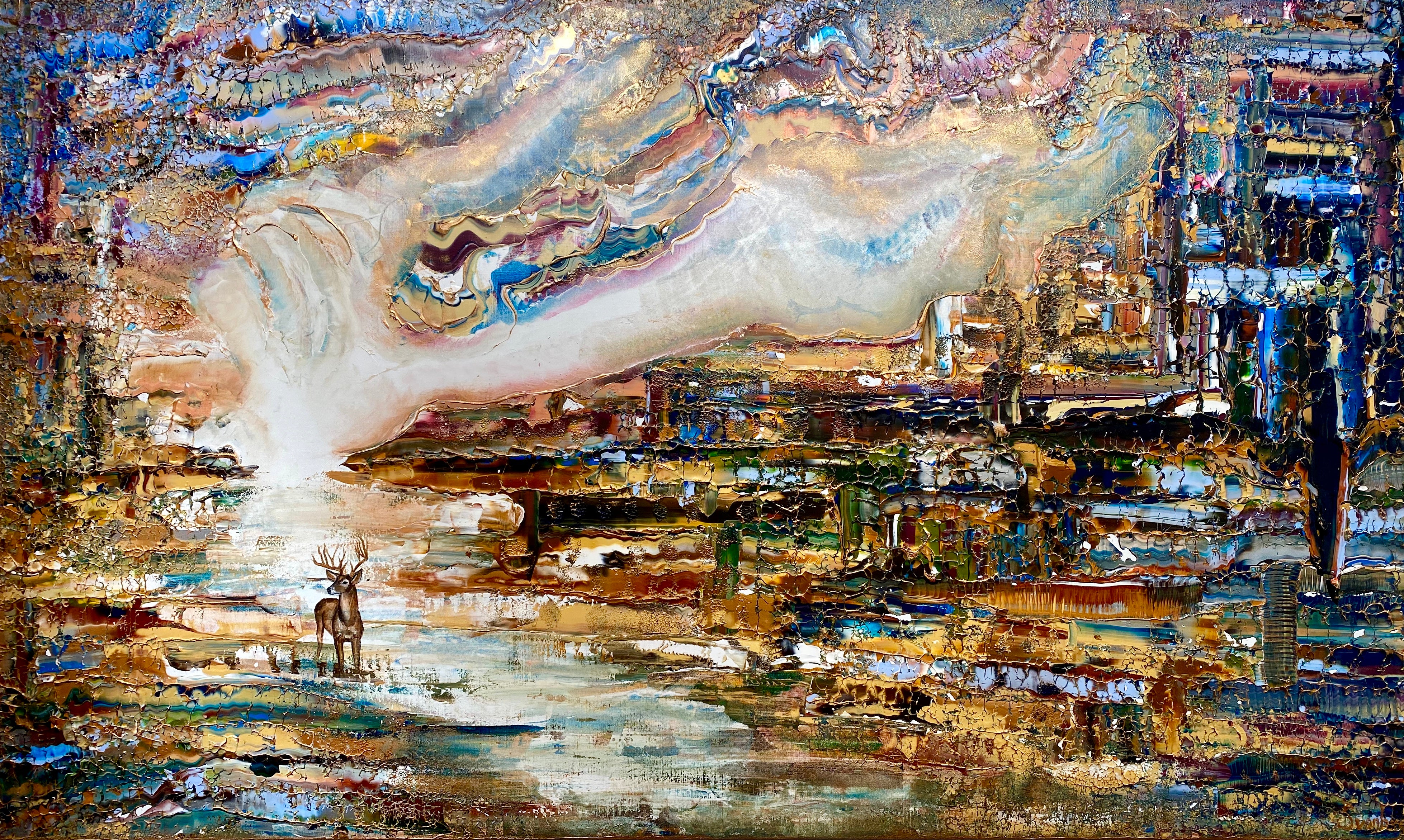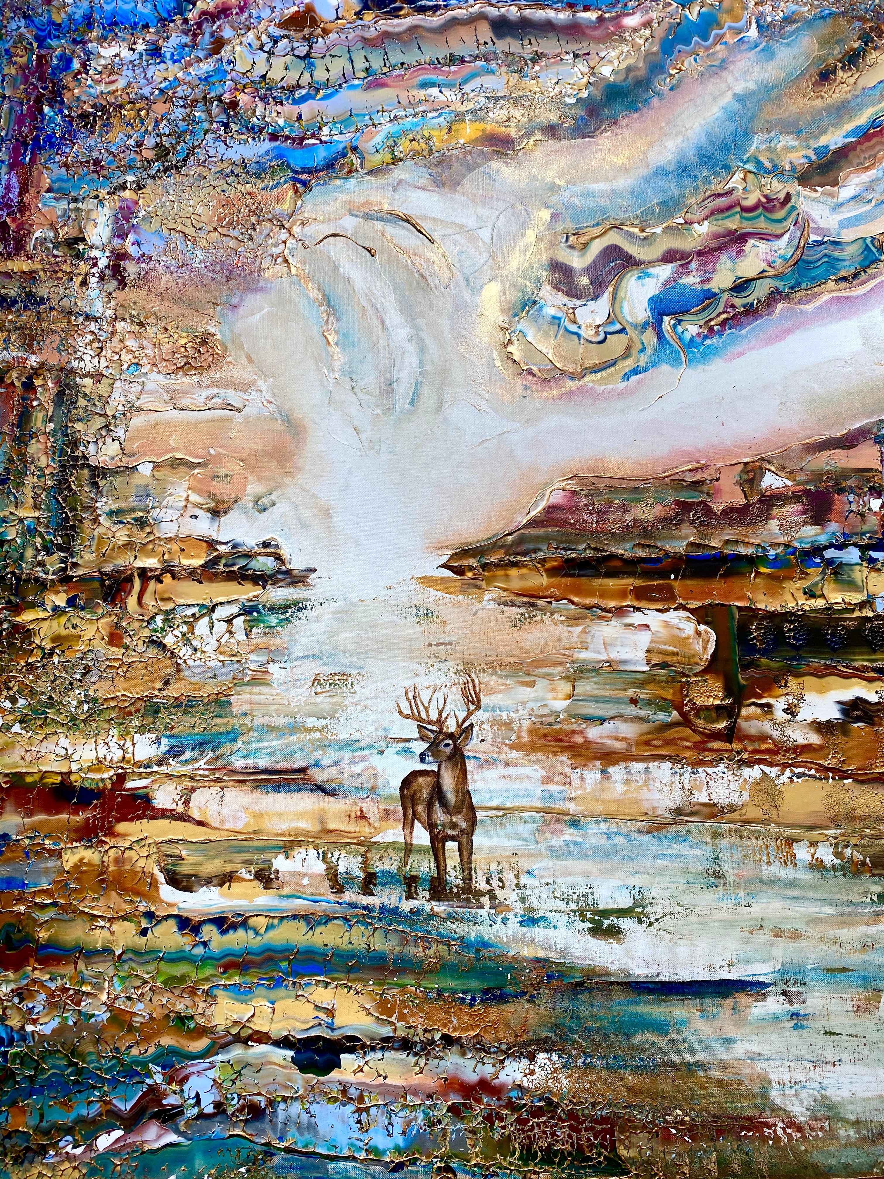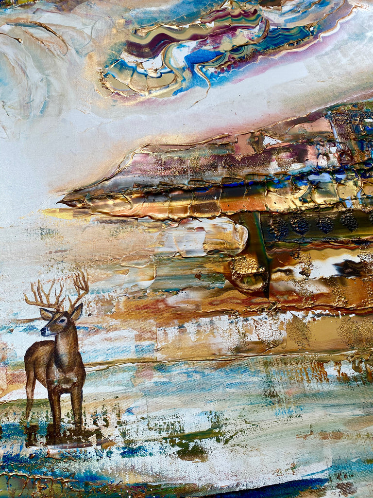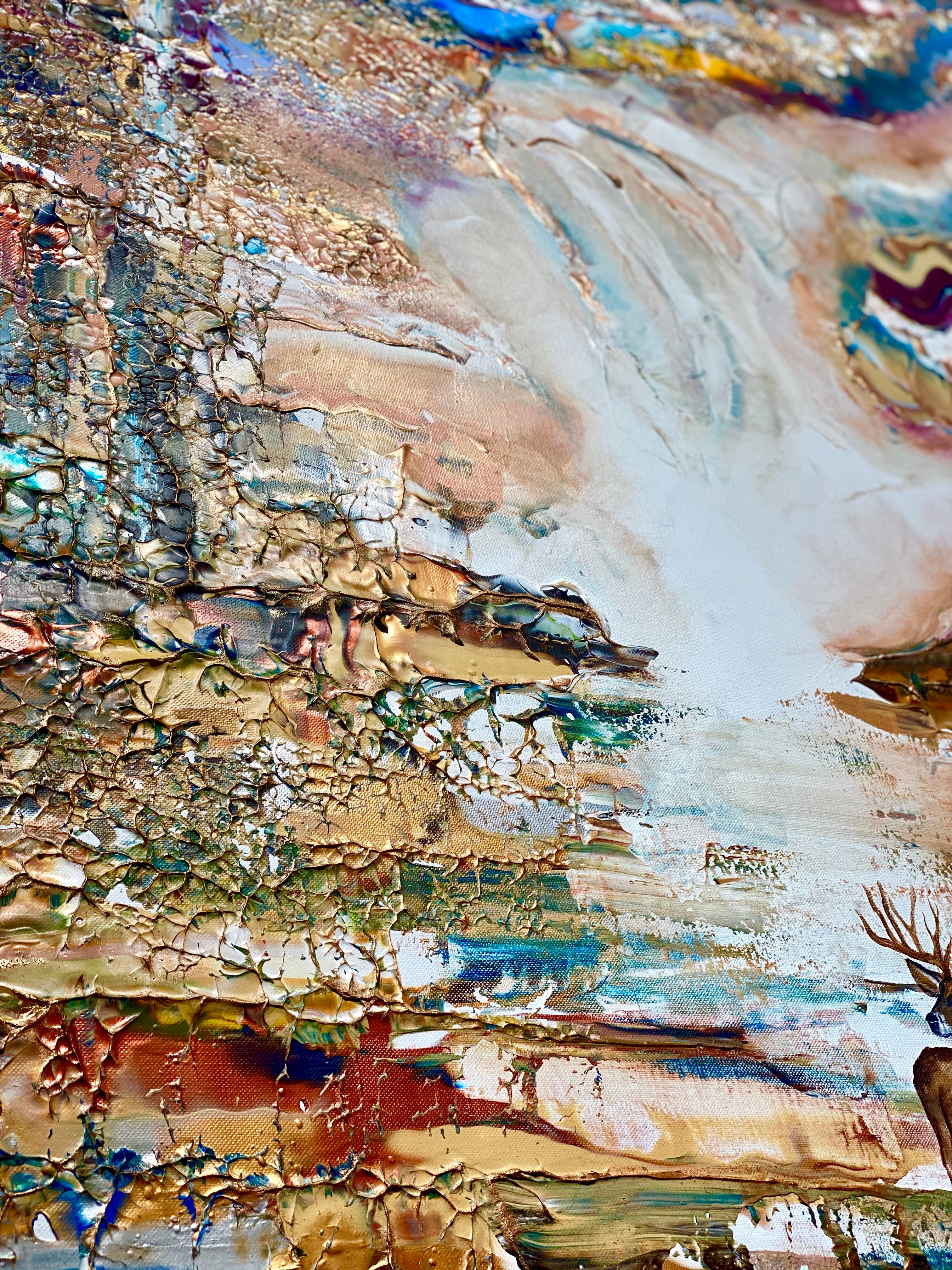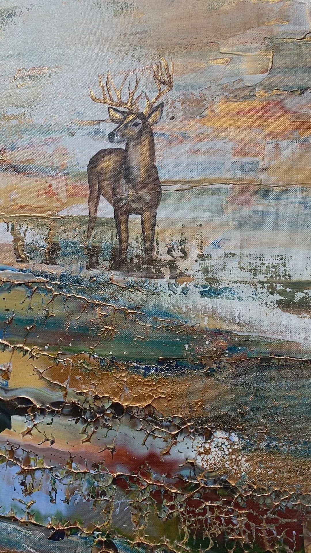 Dette maleriet er inspirert av den vakre utsikten over Värmdö. Jeg fortsetter min konkrete og detaljerte skapelse ved å produsere denne staselige røde hjorten. Hornene og pelsen er bleke med gull, noe som bidrar til en mer realistisk oppfatning. I forskjellige vinkler kan du se hvordan han skinner som jeg virkelig likte å eksperimentere med. Jeg elsker å skape det abstrakte landskapet rundt ham, som er åpent for tolkning.