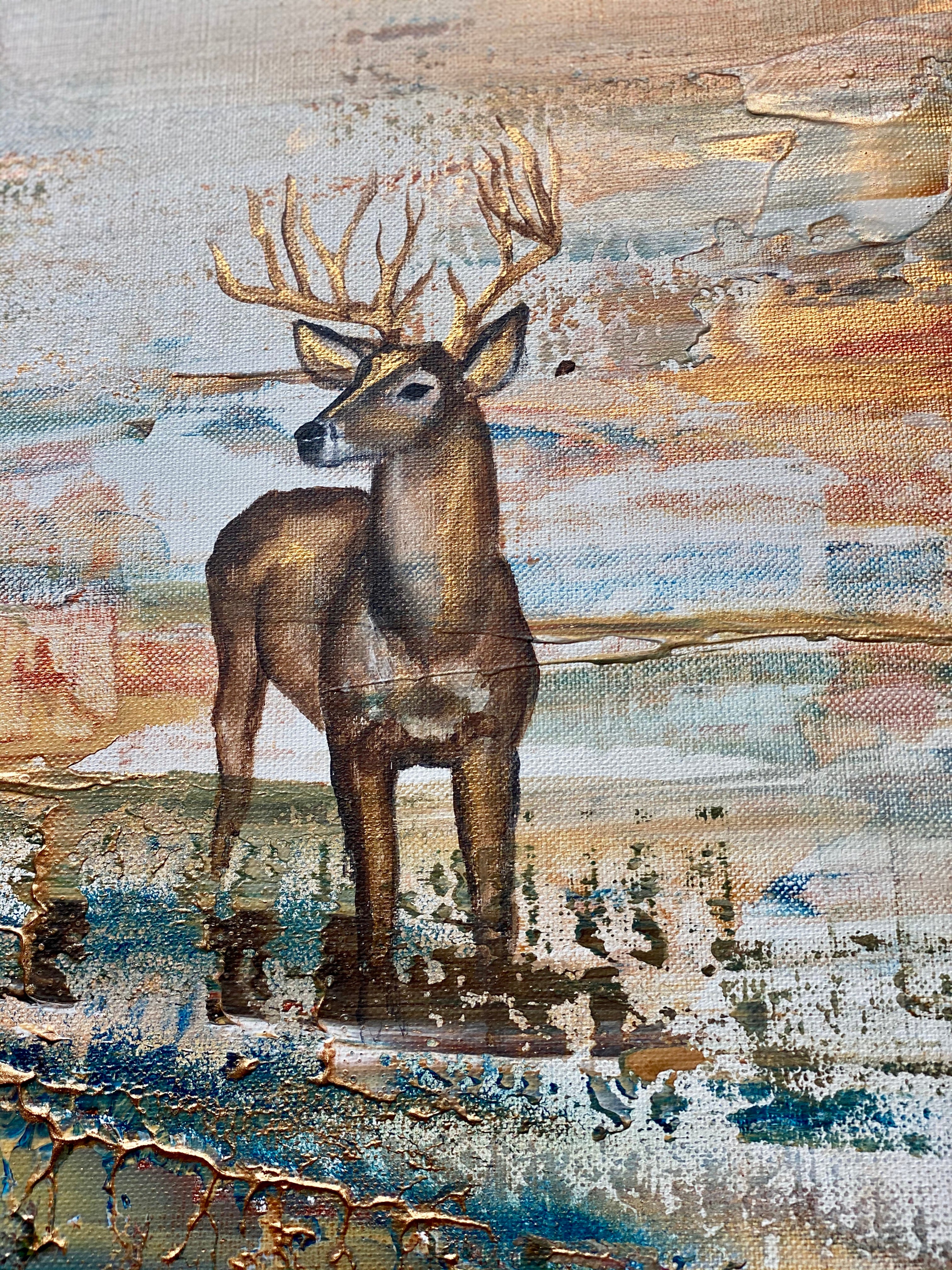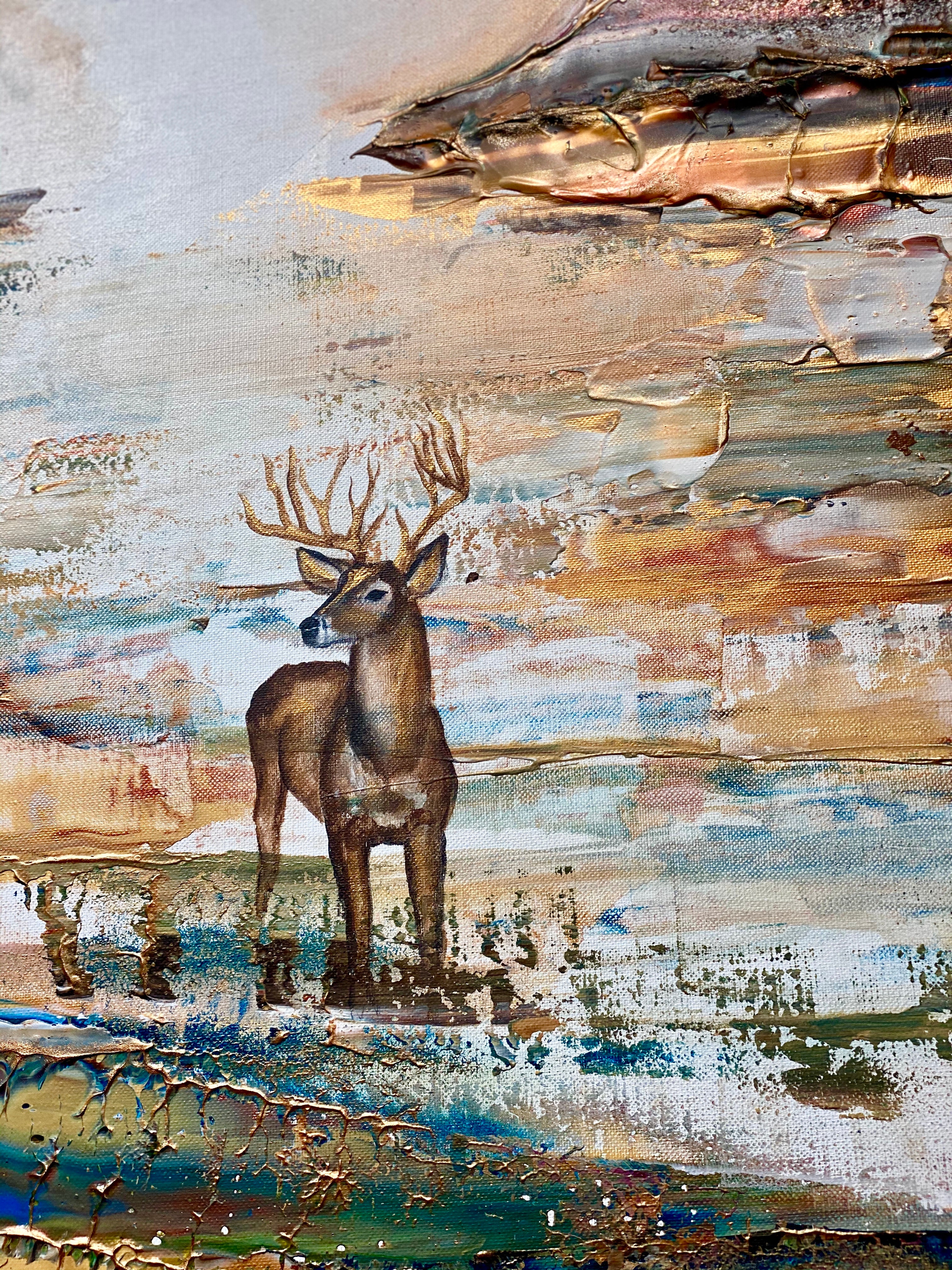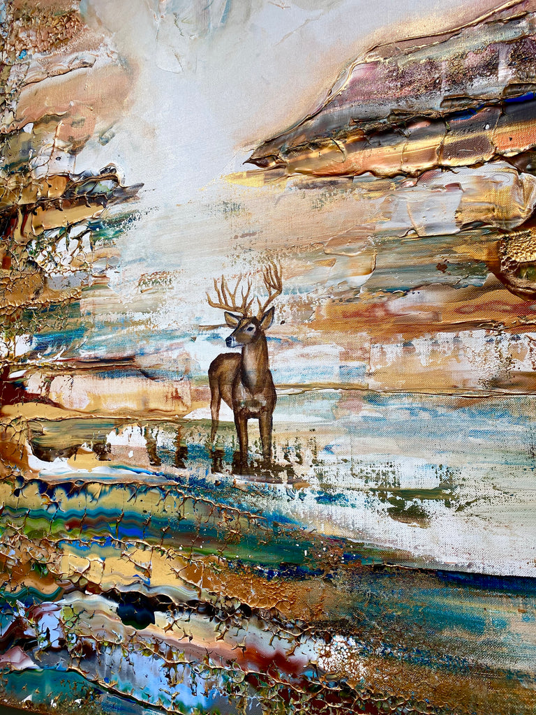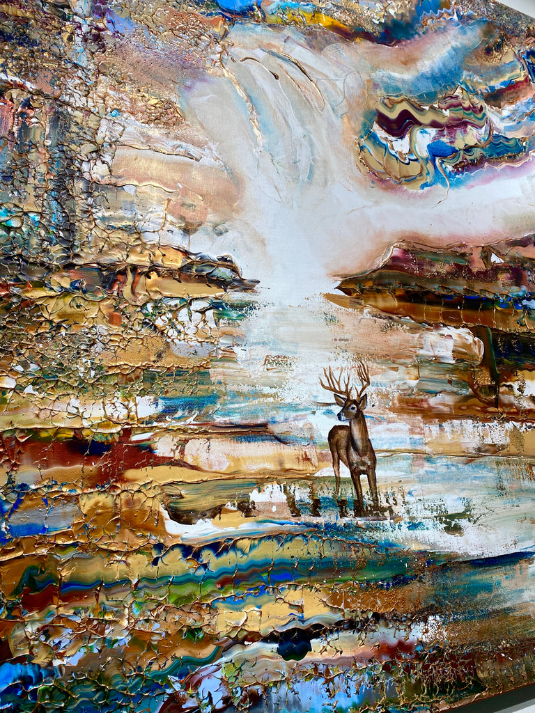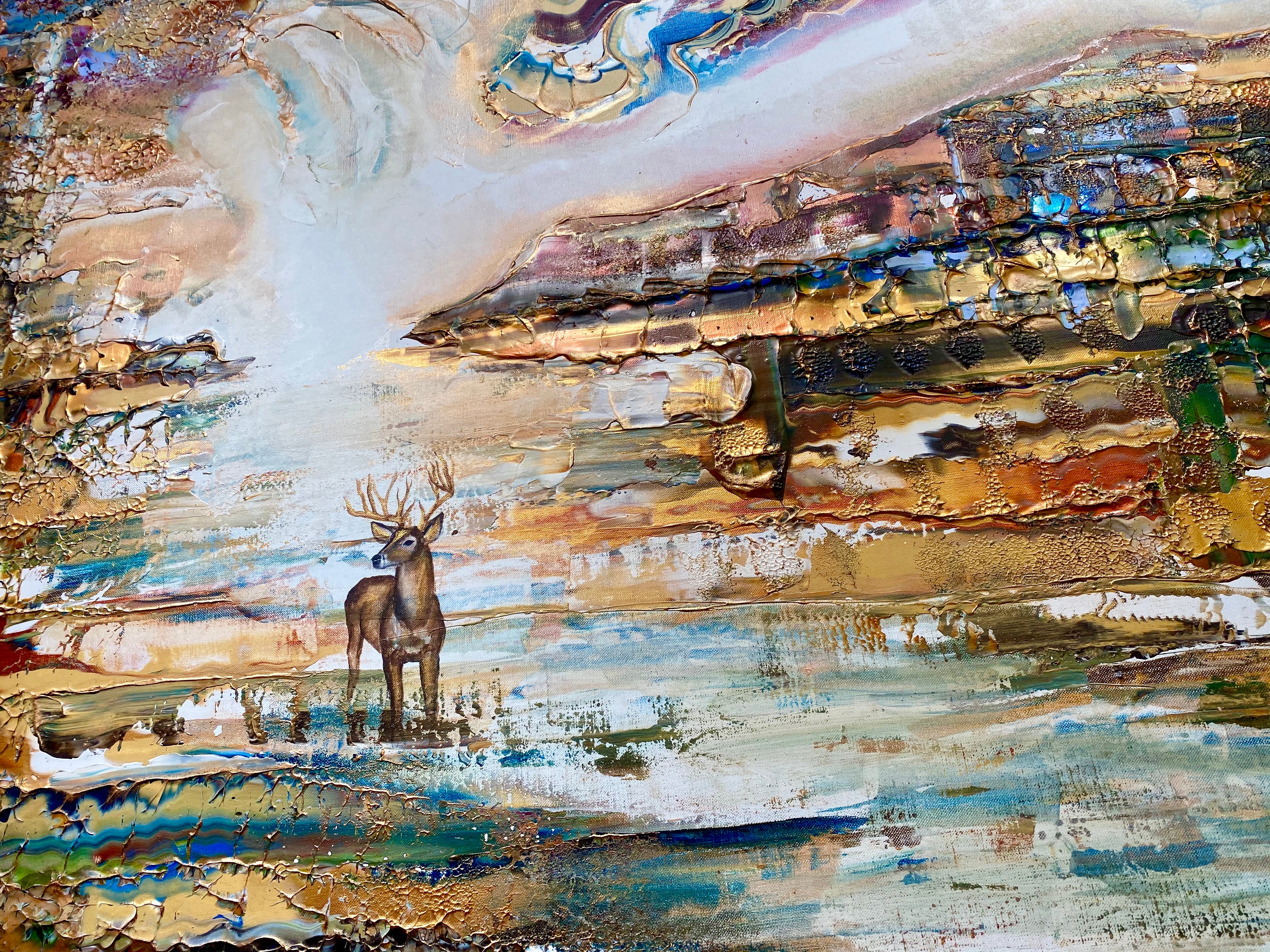 Dette maleriet er inspirert av den vakre utsikten over Värmdö. Jeg fortsetter min konkrete og detaljerte skapelse ved å produsere denne staselige røde hjorten. Hornene og pelsen er bleke med gull, noe som bidrar til en mer realistisk oppfatning. I forskjellige vinkler kan du se hvordan han skinner som jeg virkelig likte å eksperimentere med. Jeg elsker å skape det abstrakte landskapet rundt ham, som er åpent for tolkning.