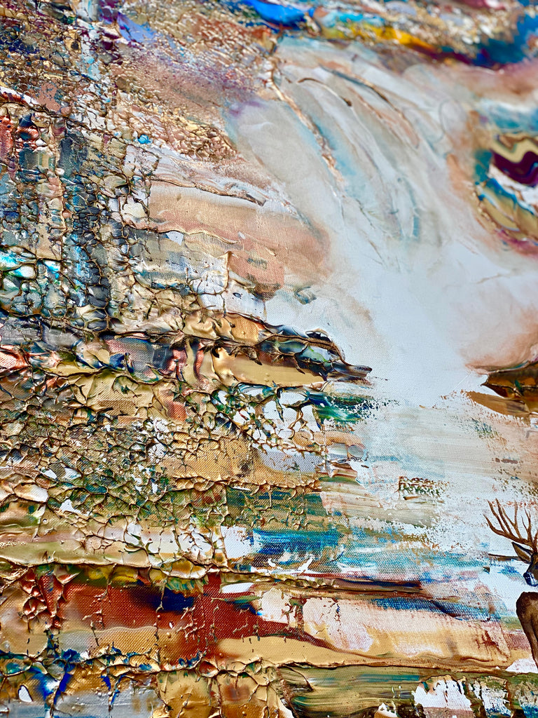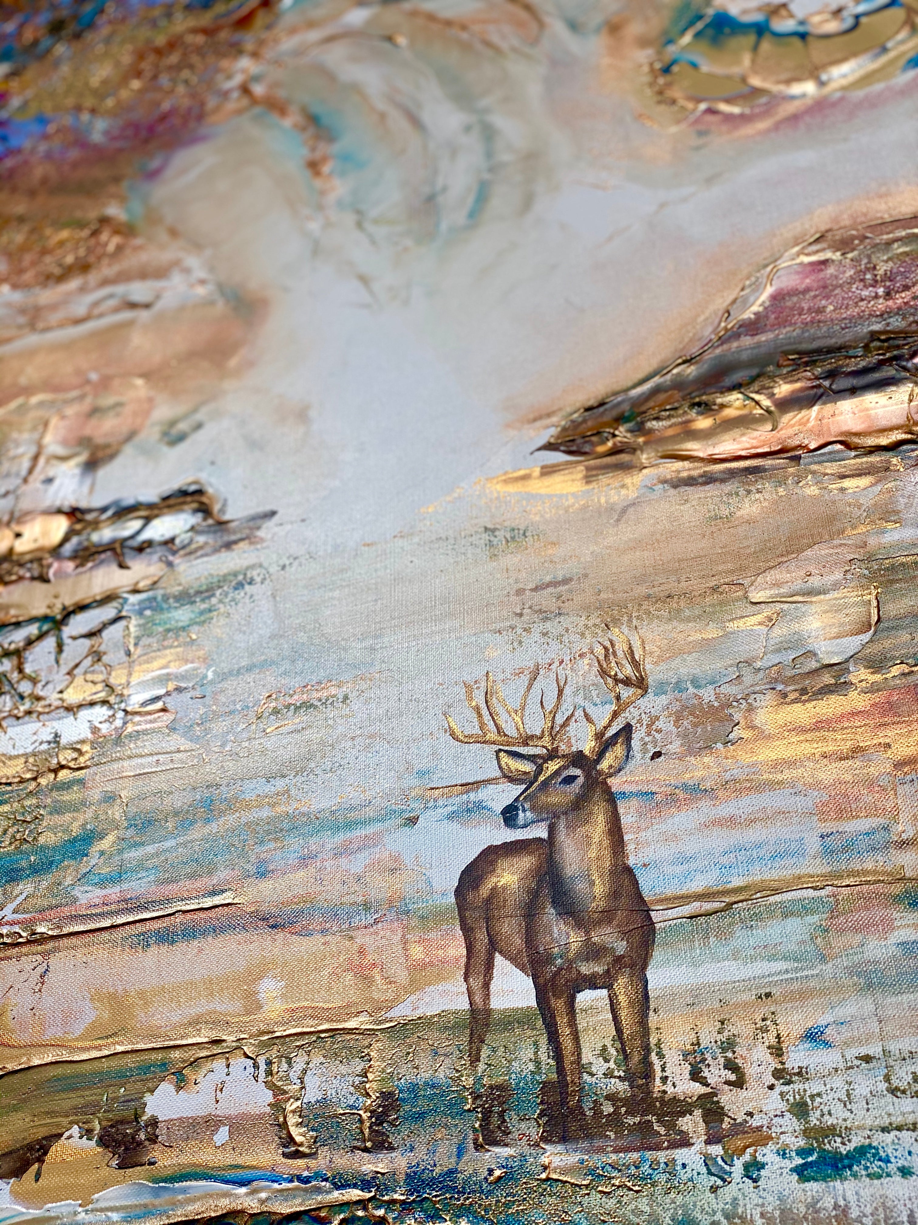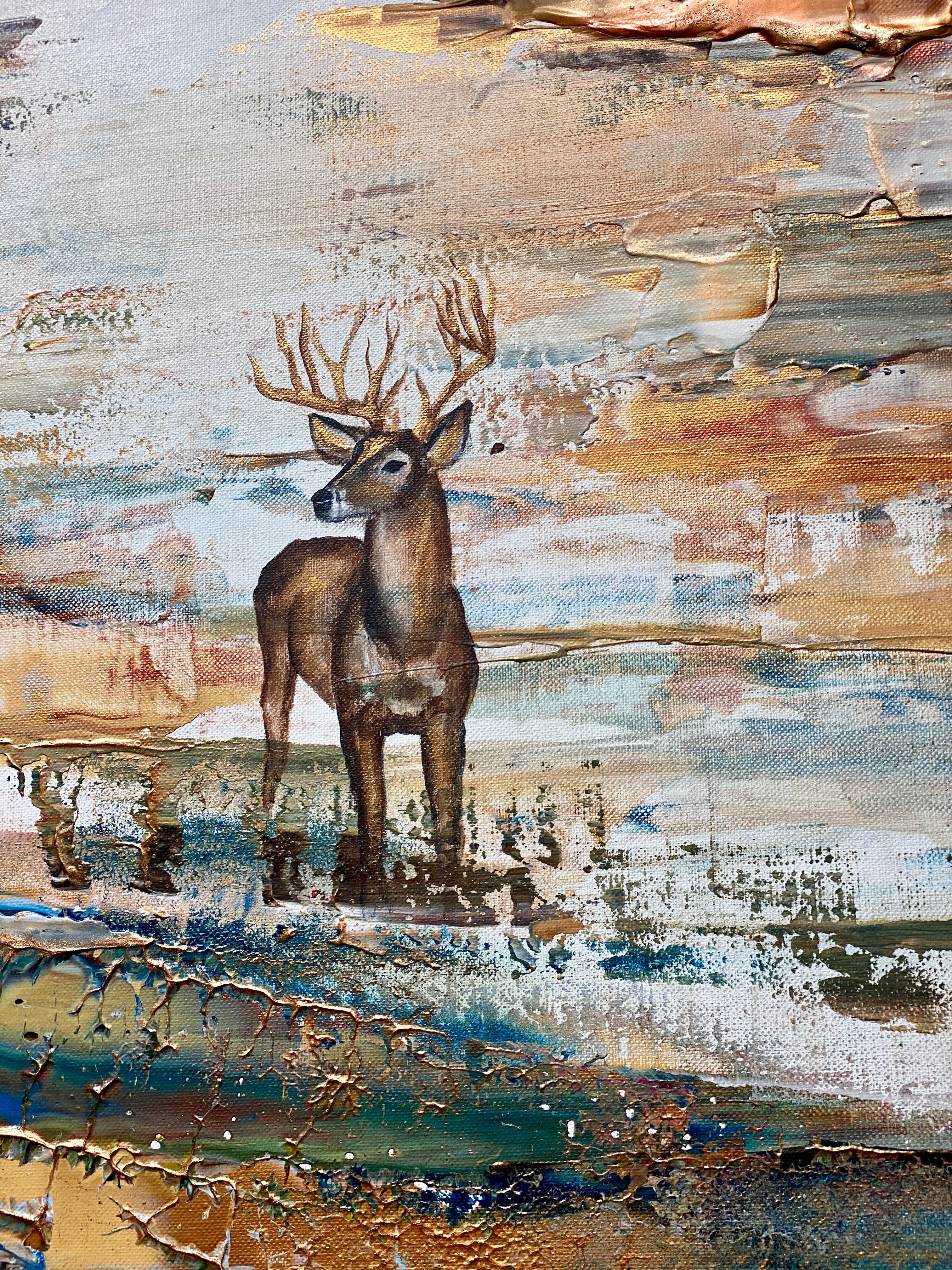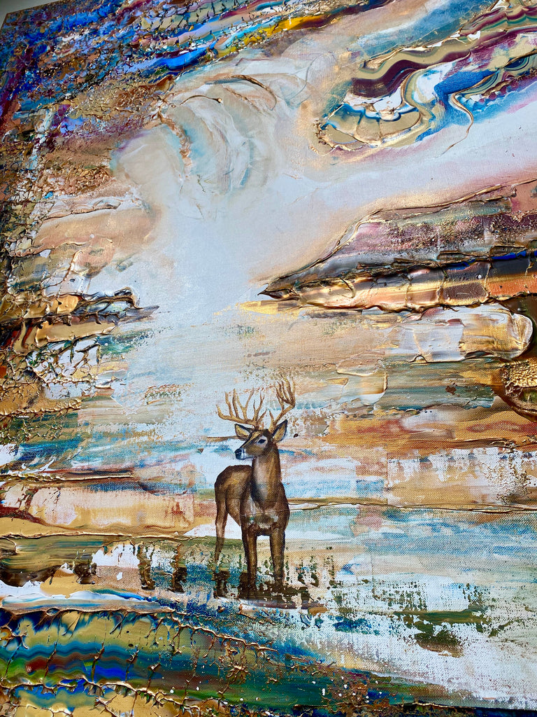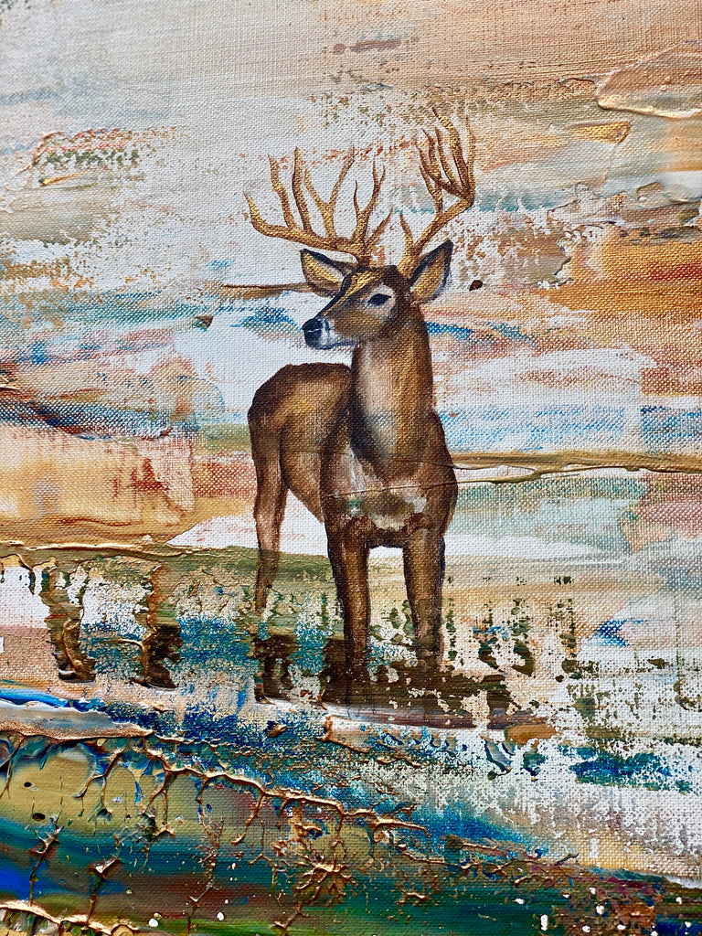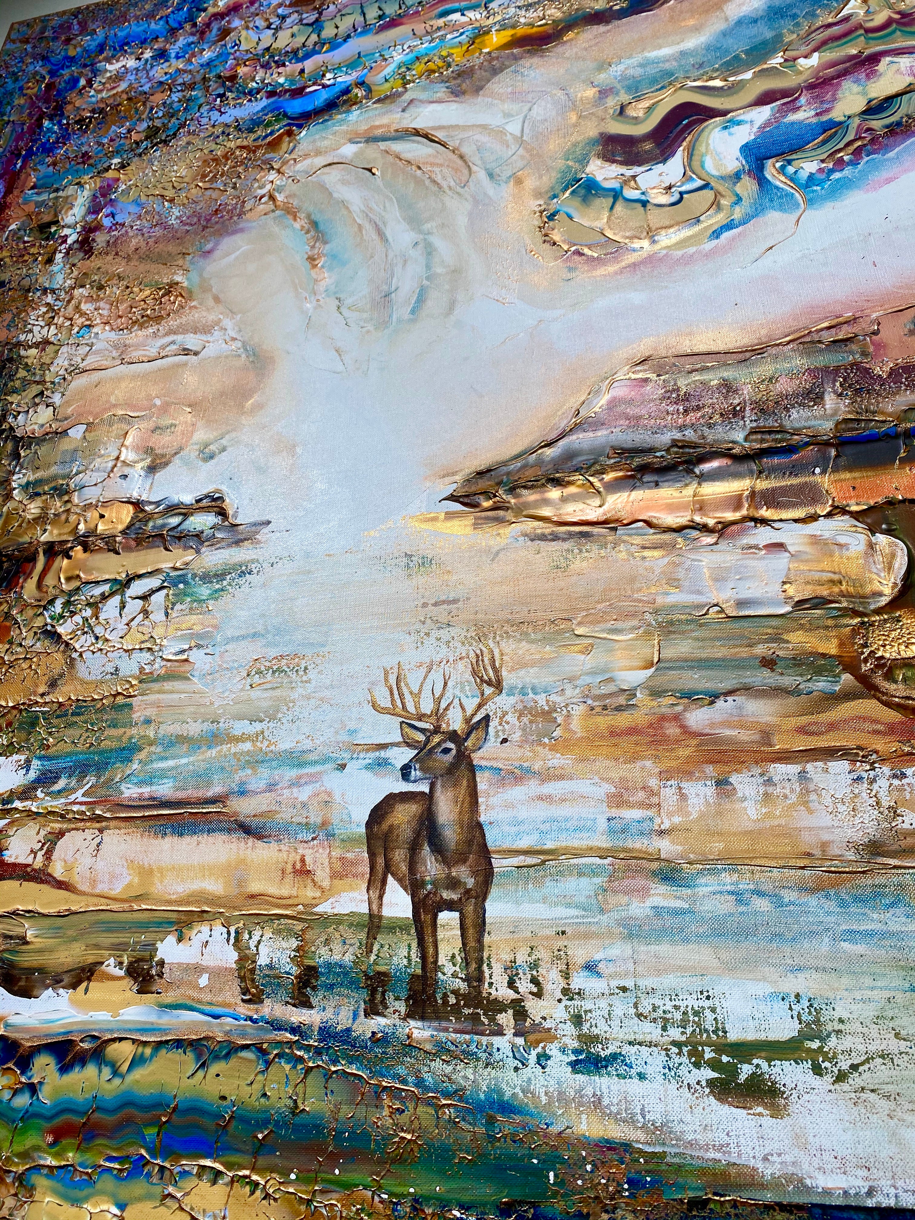 Dette maleriet er inspirert av den vakre utsikten over Värmdö. Jeg fortsetter min konkrete og detaljerte skapelse ved å produsere denne staselige røde hjorten. Hornene og pelsen er bleke med gull, noe som bidrar til en mer realistisk oppfatning. I forskjellige vinkler kan du se hvordan han skinner som jeg virkelig likte å eksperimentere med. Jeg elsker å skape det abstrakte landskapet rundt ham, som er åpent for tolkning.