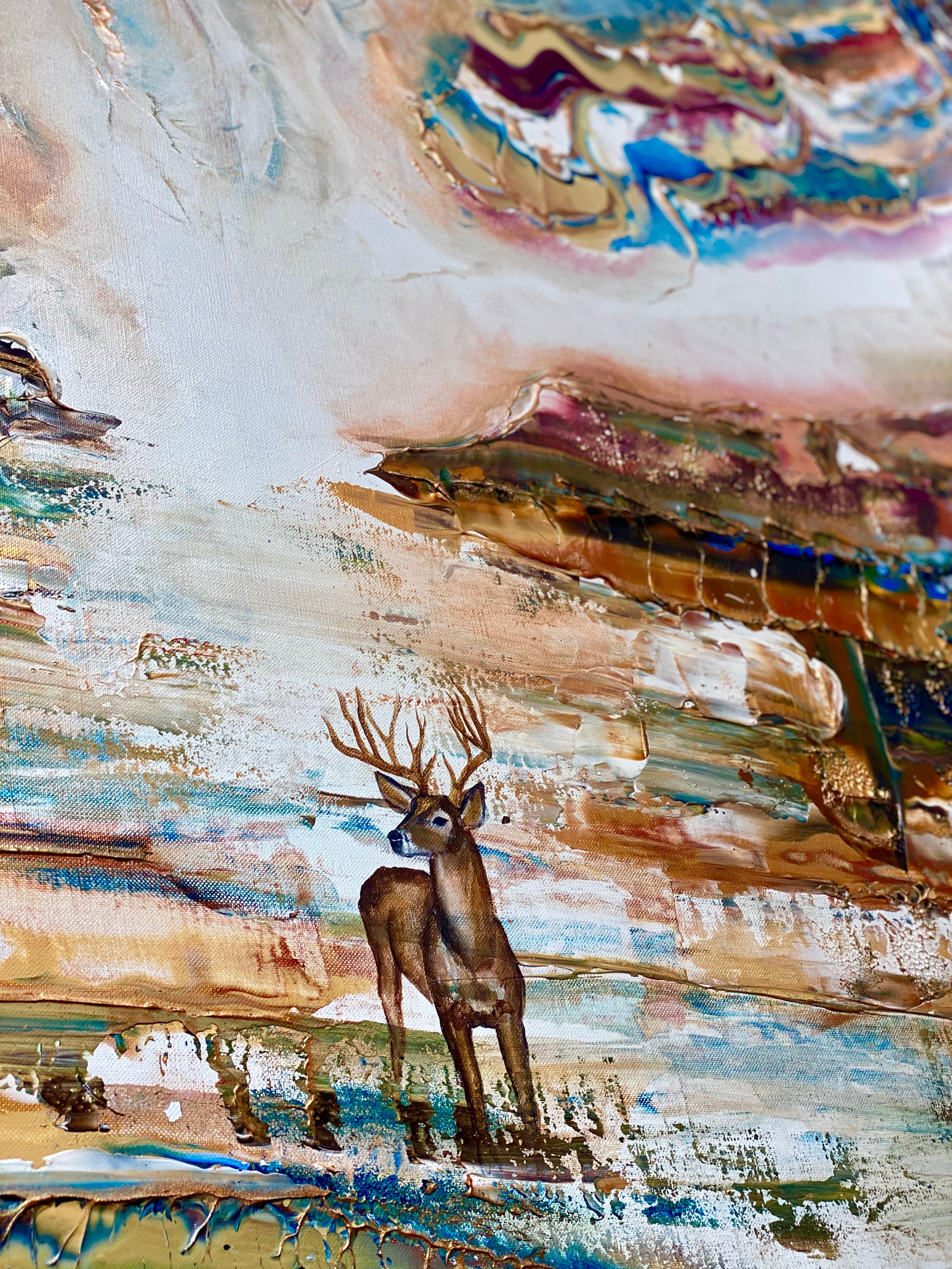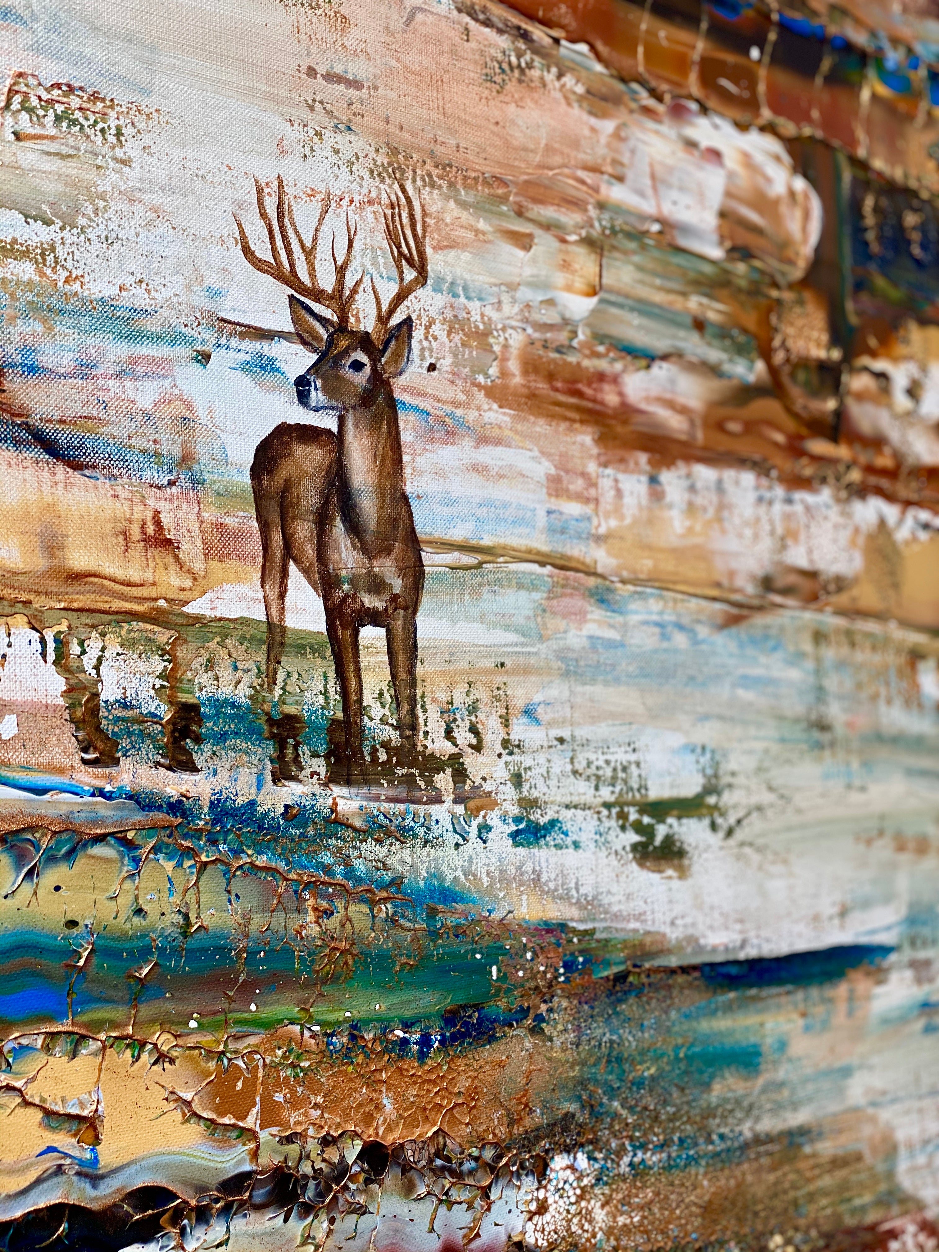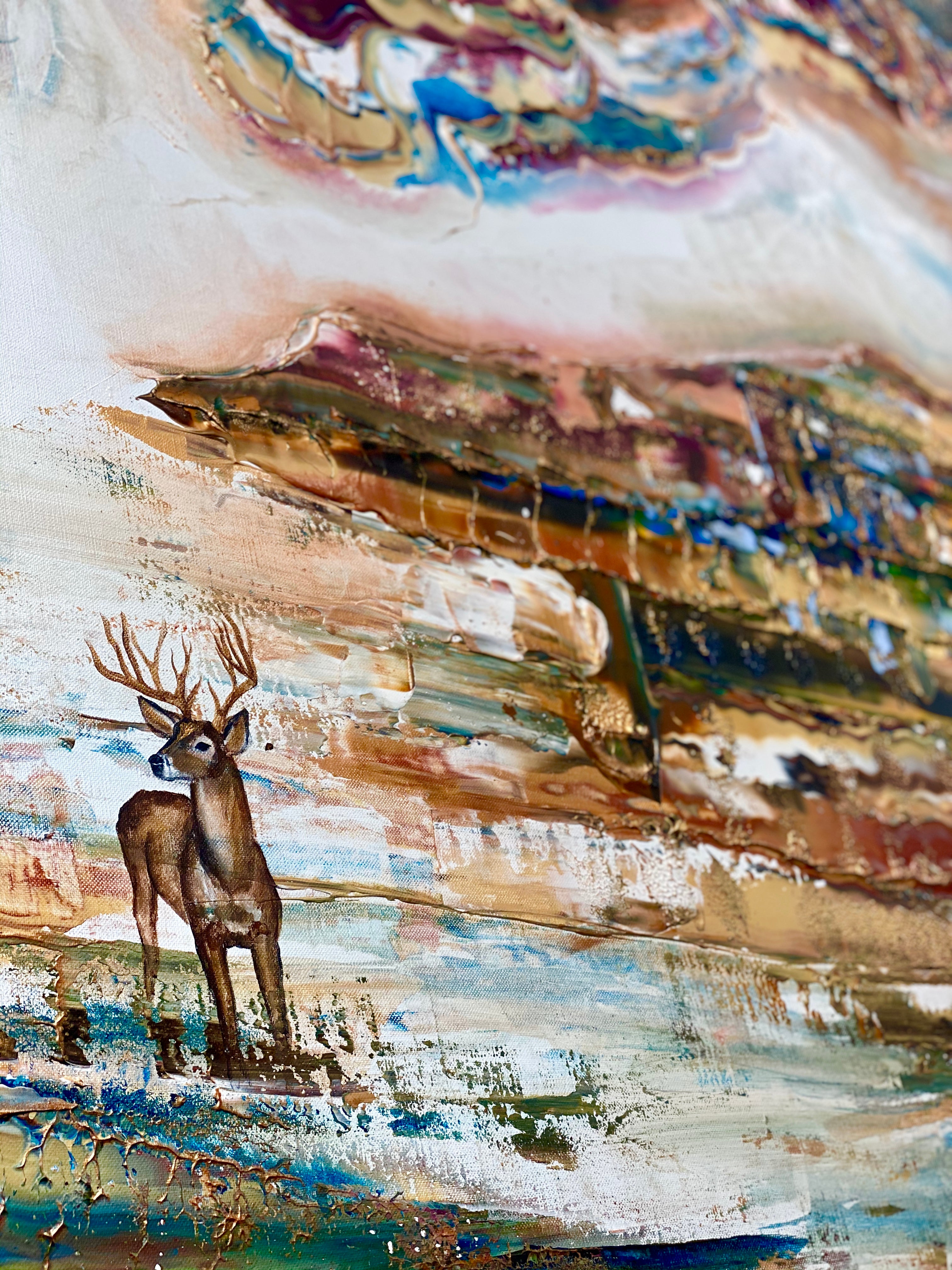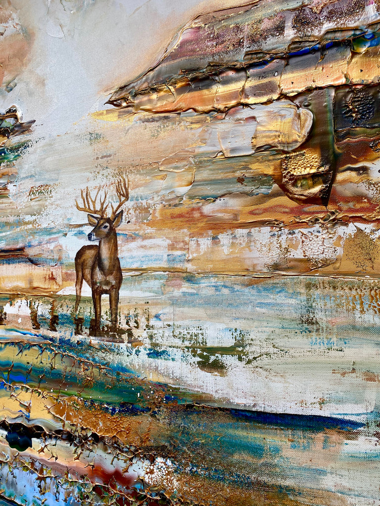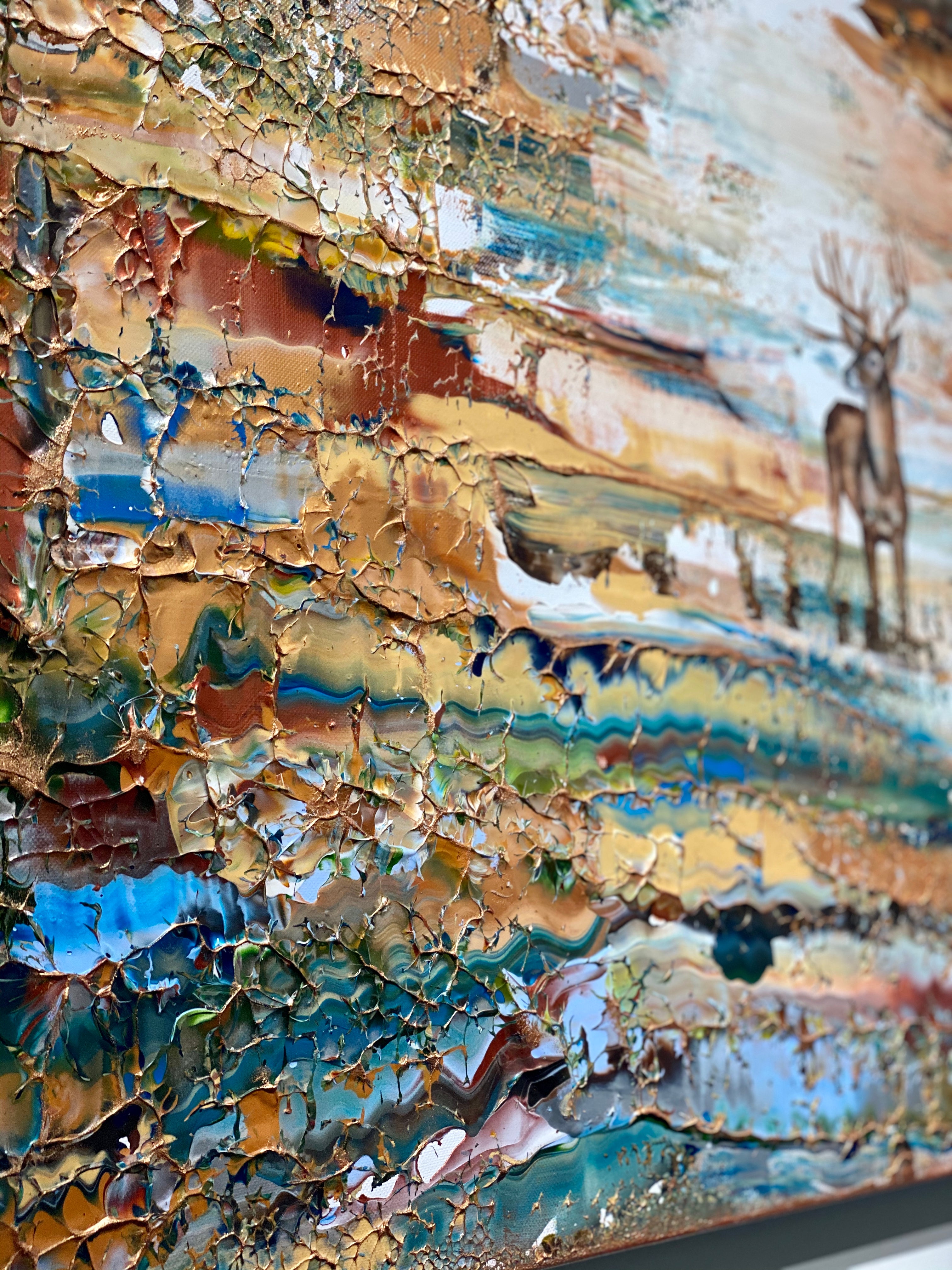 Dette maleriet er inspirert av den vakre utsikten over Värmdö. Jeg fortsetter min konkrete og detaljerte skapelse ved å produsere denne staselige røde hjorten. Hornene og pelsen er bleke med gull, noe som bidrar til en mer realistisk oppfatning. I forskjellige vinkler kan du se hvordan han skinner som jeg virkelig likte å eksperimentere med. Jeg elsker å skape det abstrakte landskapet rundt ham, som er åpent for tolkning.