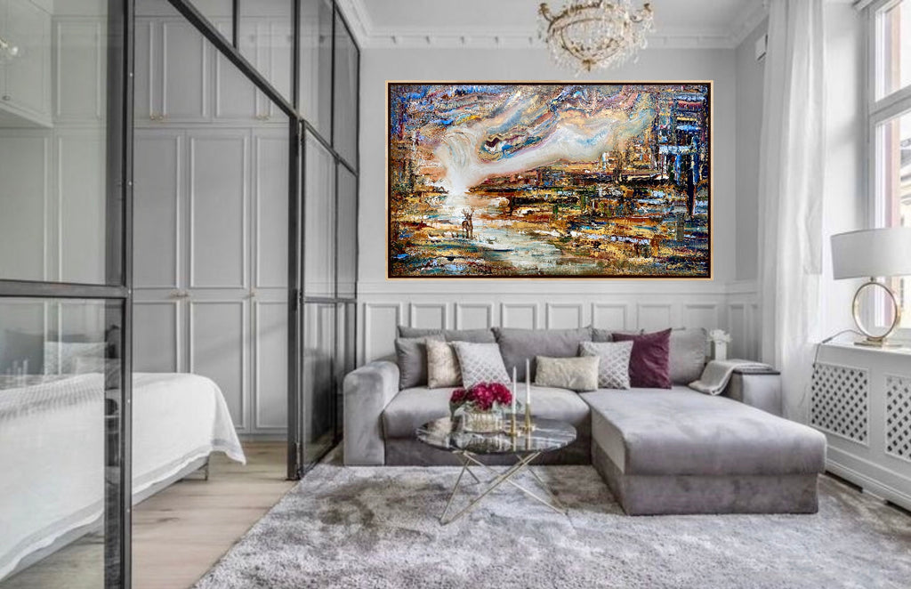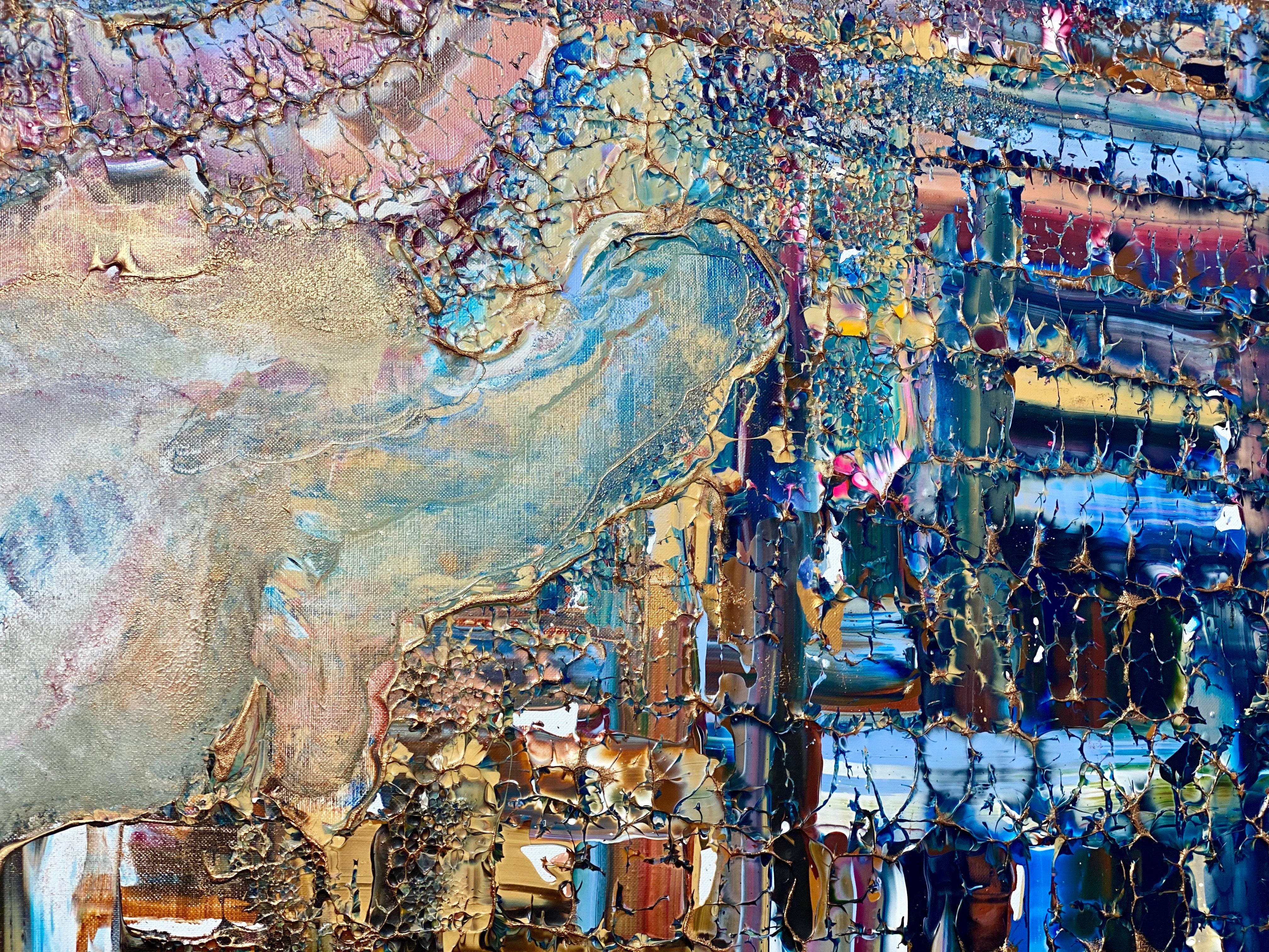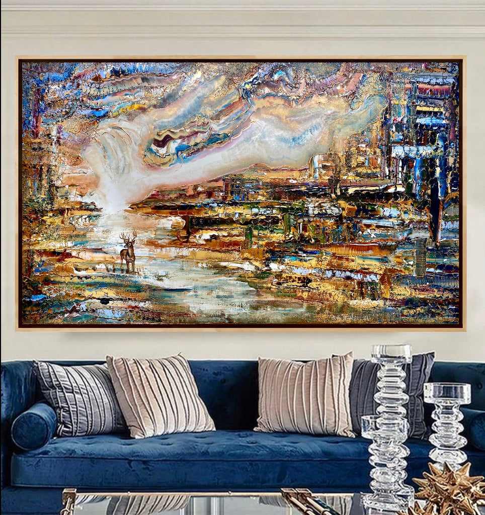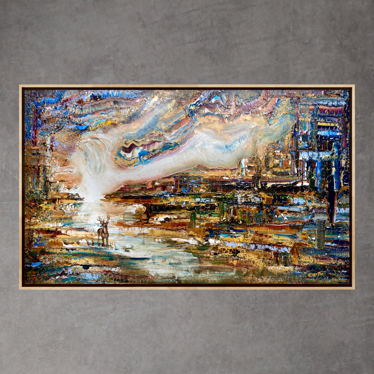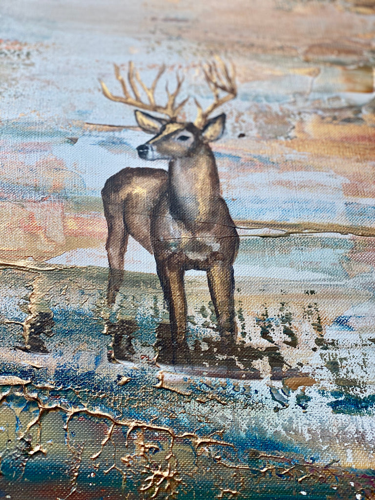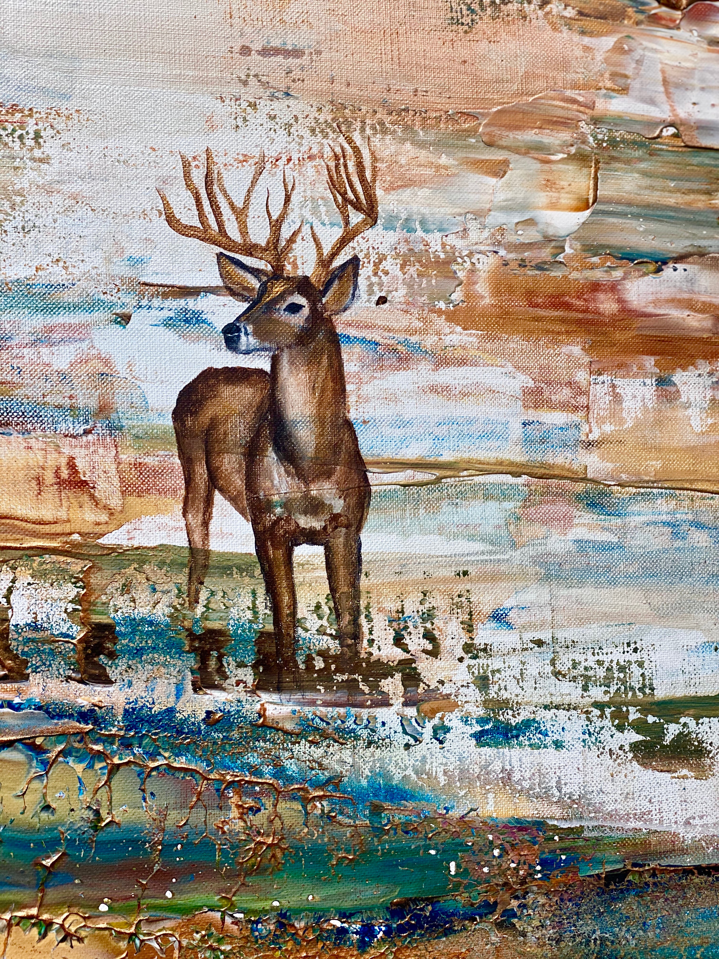 Dette maleriet er inspirert av den vakre utsikten over Värmdö. Jeg fortsetter min konkrete og detaljerte skapelse ved å produsere denne staselige røde hjorten. Hornene og pelsen er bleke med gull, noe som bidrar til en mer realistisk oppfatning. I forskjellige vinkler kan du se hvordan han skinner som jeg virkelig likte å eksperimentere med. Jeg elsker å skape det abstrakte landskapet rundt ham, som er åpent for tolkning.