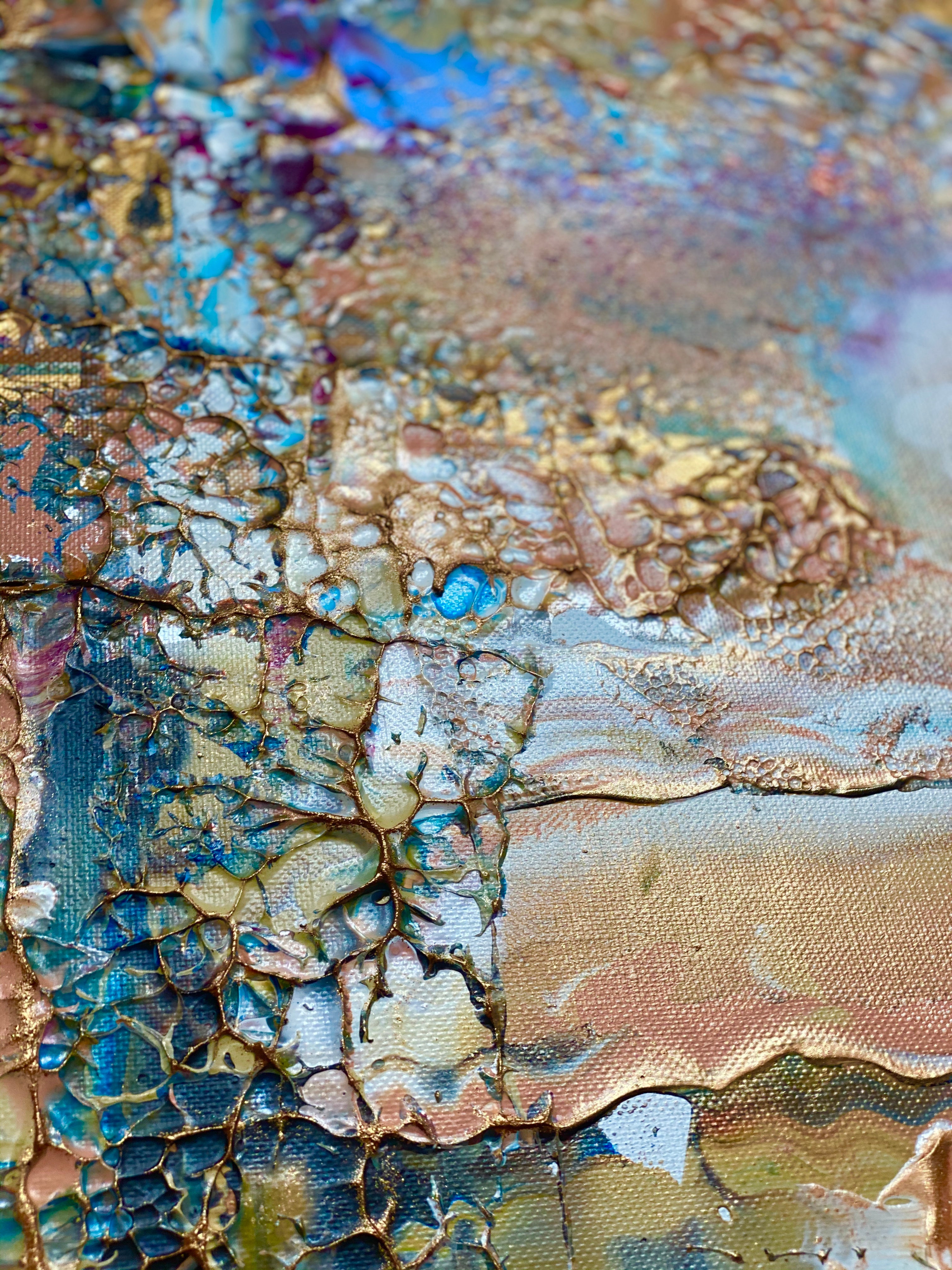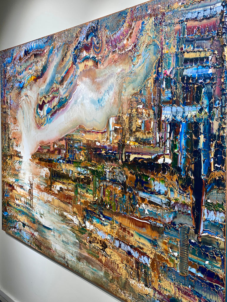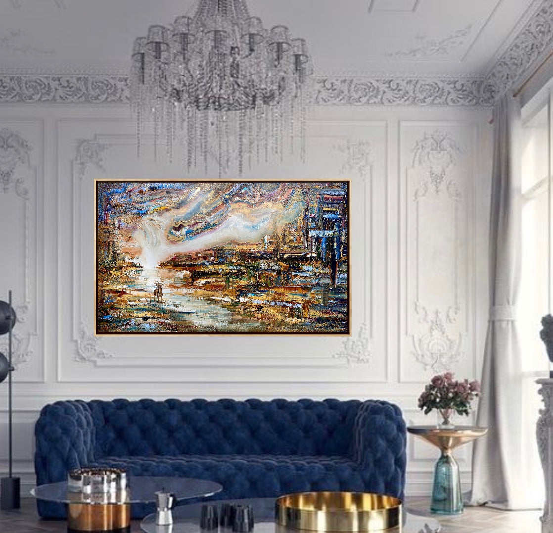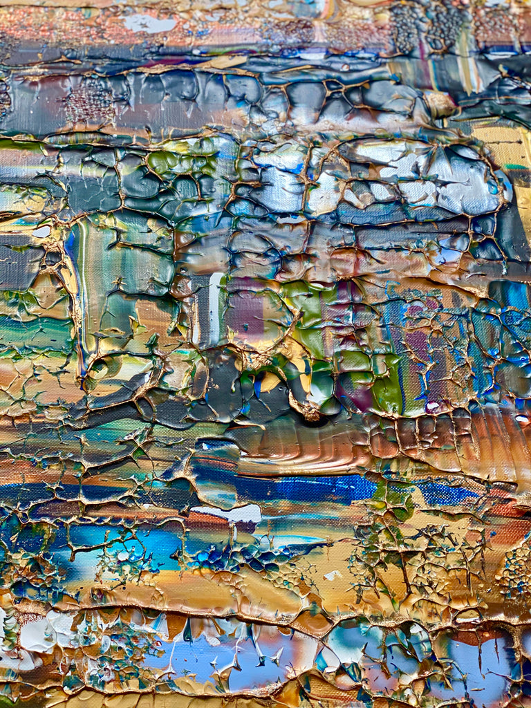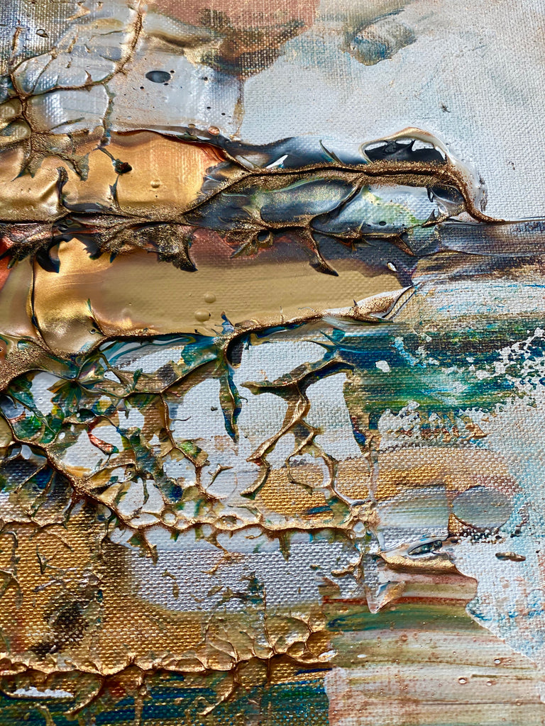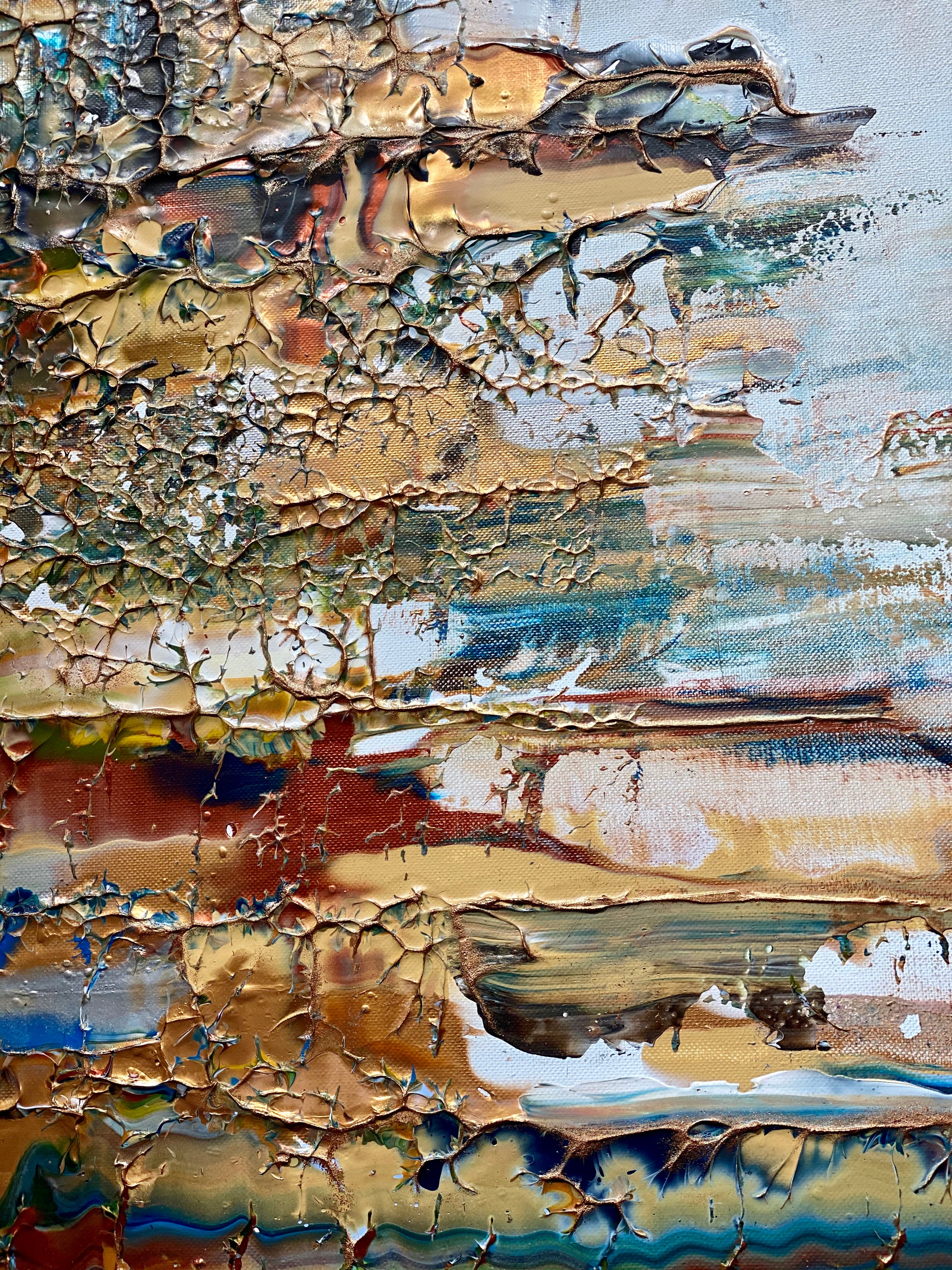 Dette maleriet er inspirert av den vakre utsikten over Värmdö. Jeg fortsetter min konkrete og detaljerte skapelse ved å produsere denne staselige røde hjorten. Hornene og pelsen er bleke med gull, noe som bidrar til en mer realistisk oppfatning. I forskjellige vinkler kan du se hvordan han skinner som jeg virkelig likte å eksperimentere med. Jeg elsker å skape det abstrakte landskapet rundt ham, som er åpent for tolkning.