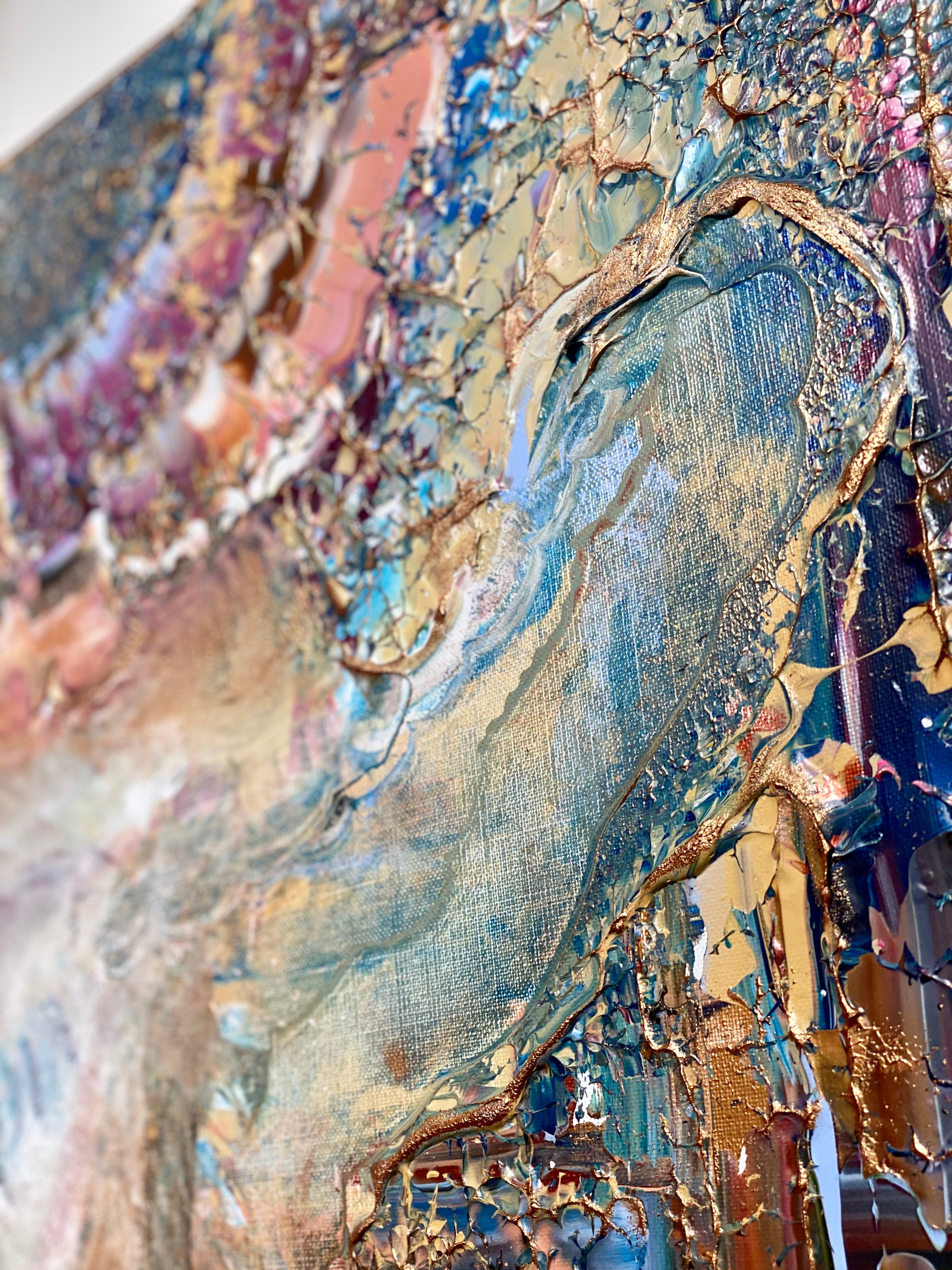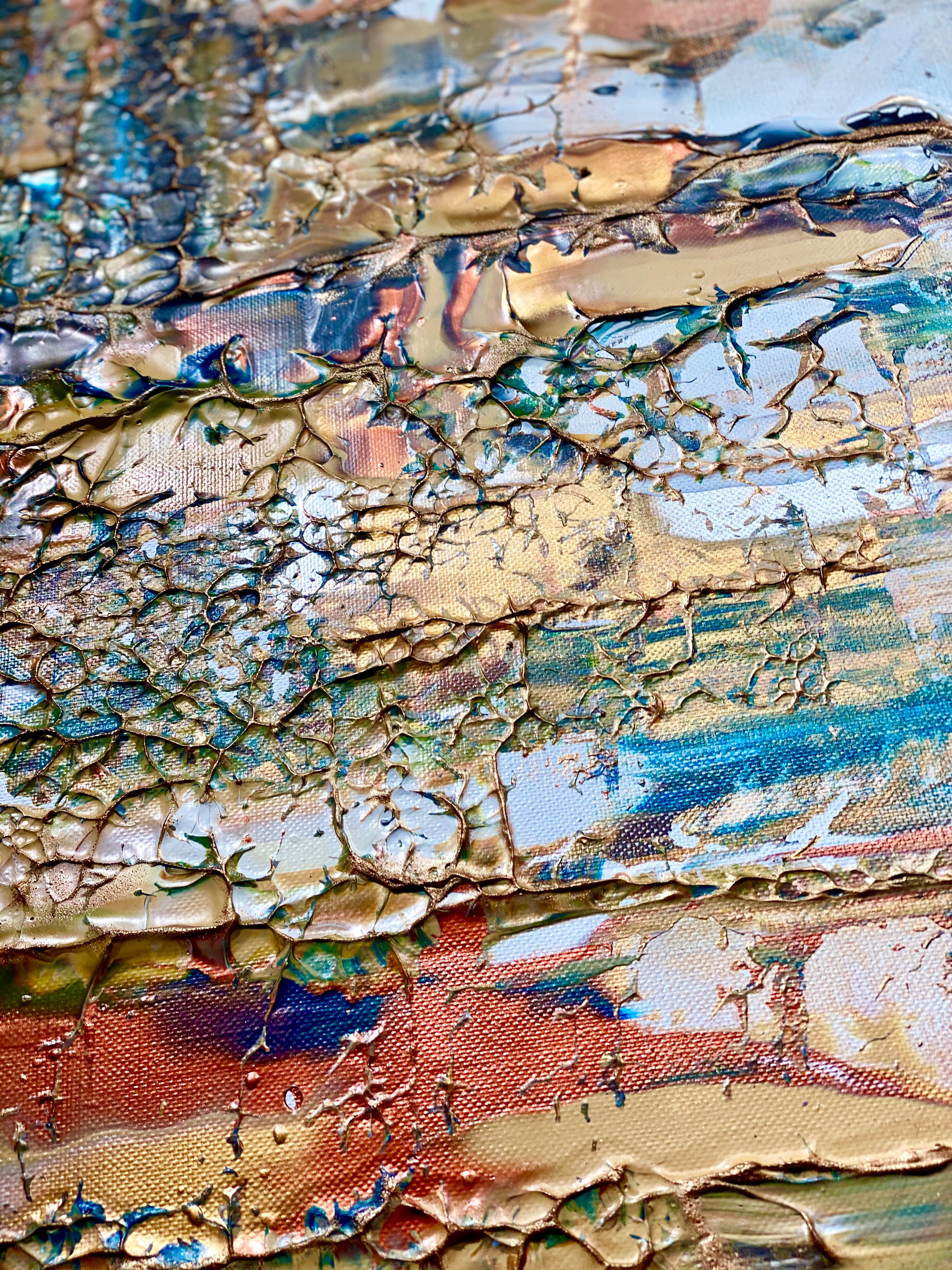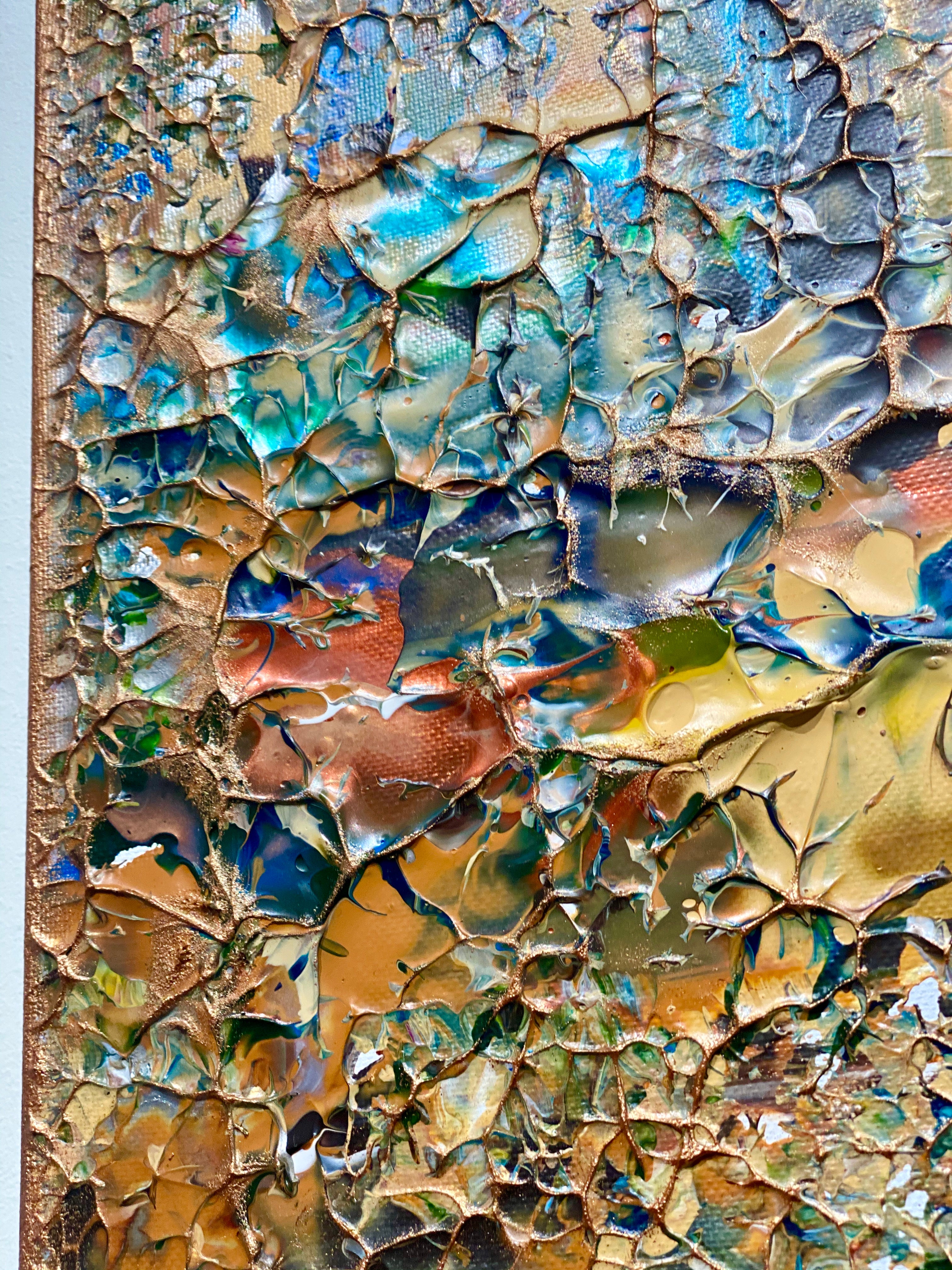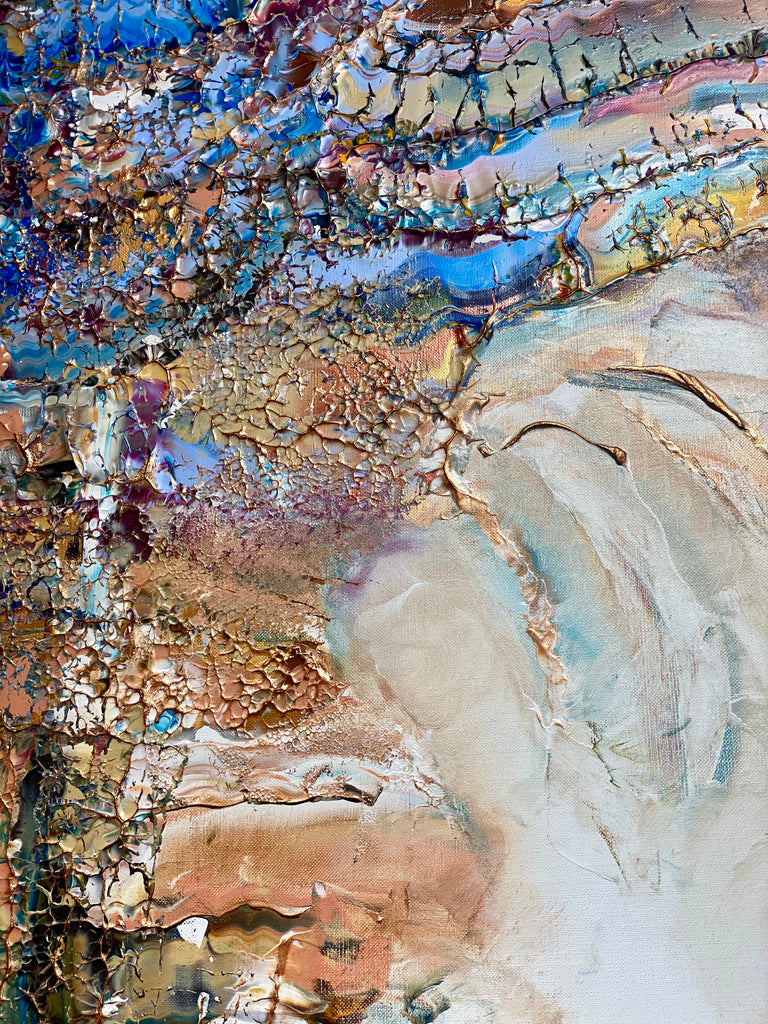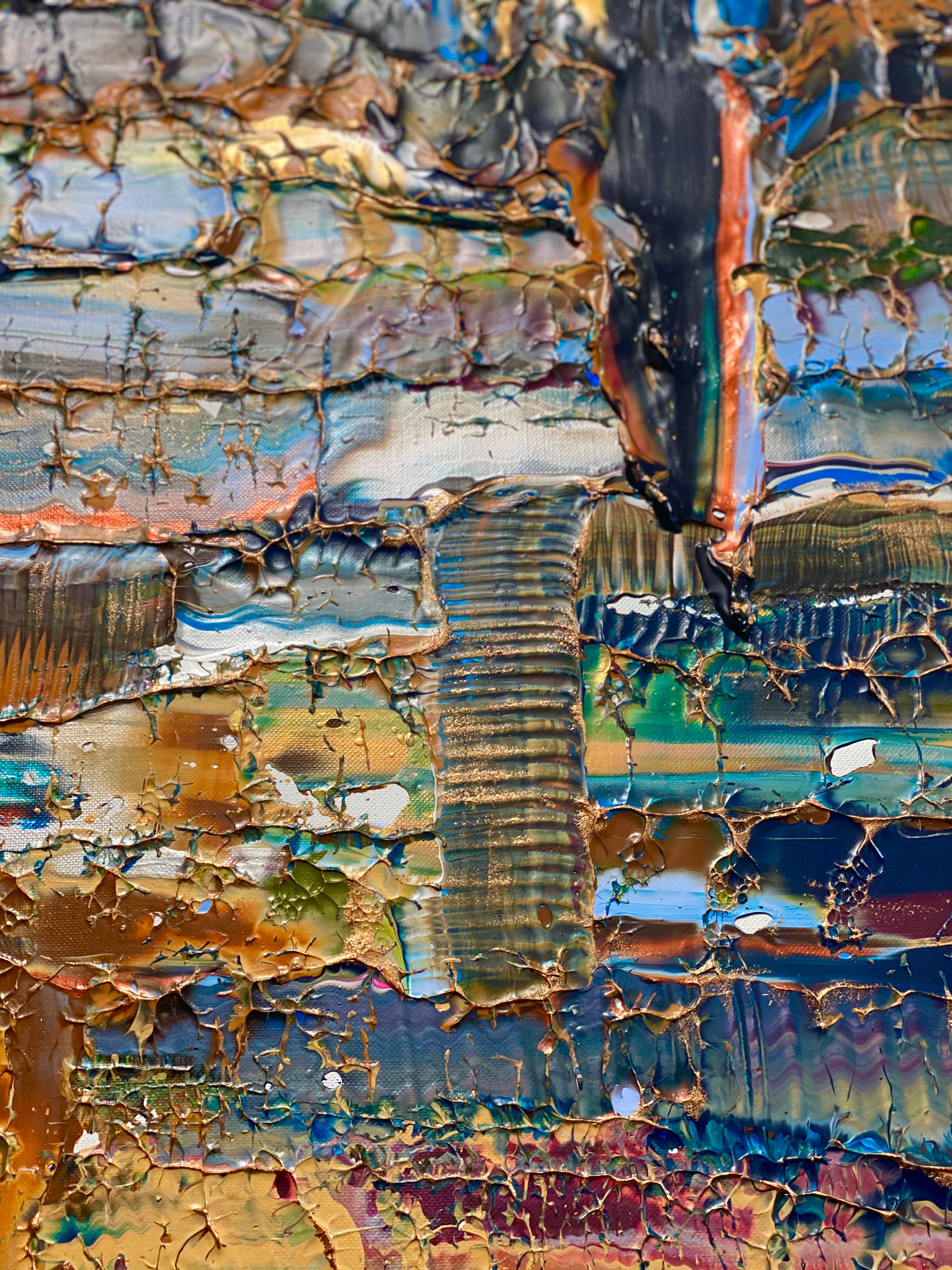 Dette maleriet er inspirert av den vakre utsikten over Värmdö. Jeg fortsetter min konkrete og detaljerte skapelse ved å produsere denne staselige røde hjorten. Hornene og pelsen er bleke med gull, noe som bidrar til en mer realistisk oppfatning. I forskjellige vinkler kan du se hvordan han skinner som jeg virkelig likte å eksperimentere med. Jeg elsker å skape det abstrakte landskapet rundt ham, som er åpent for tolkning.