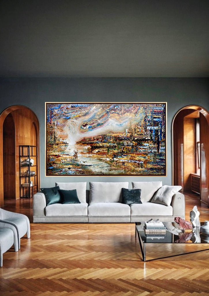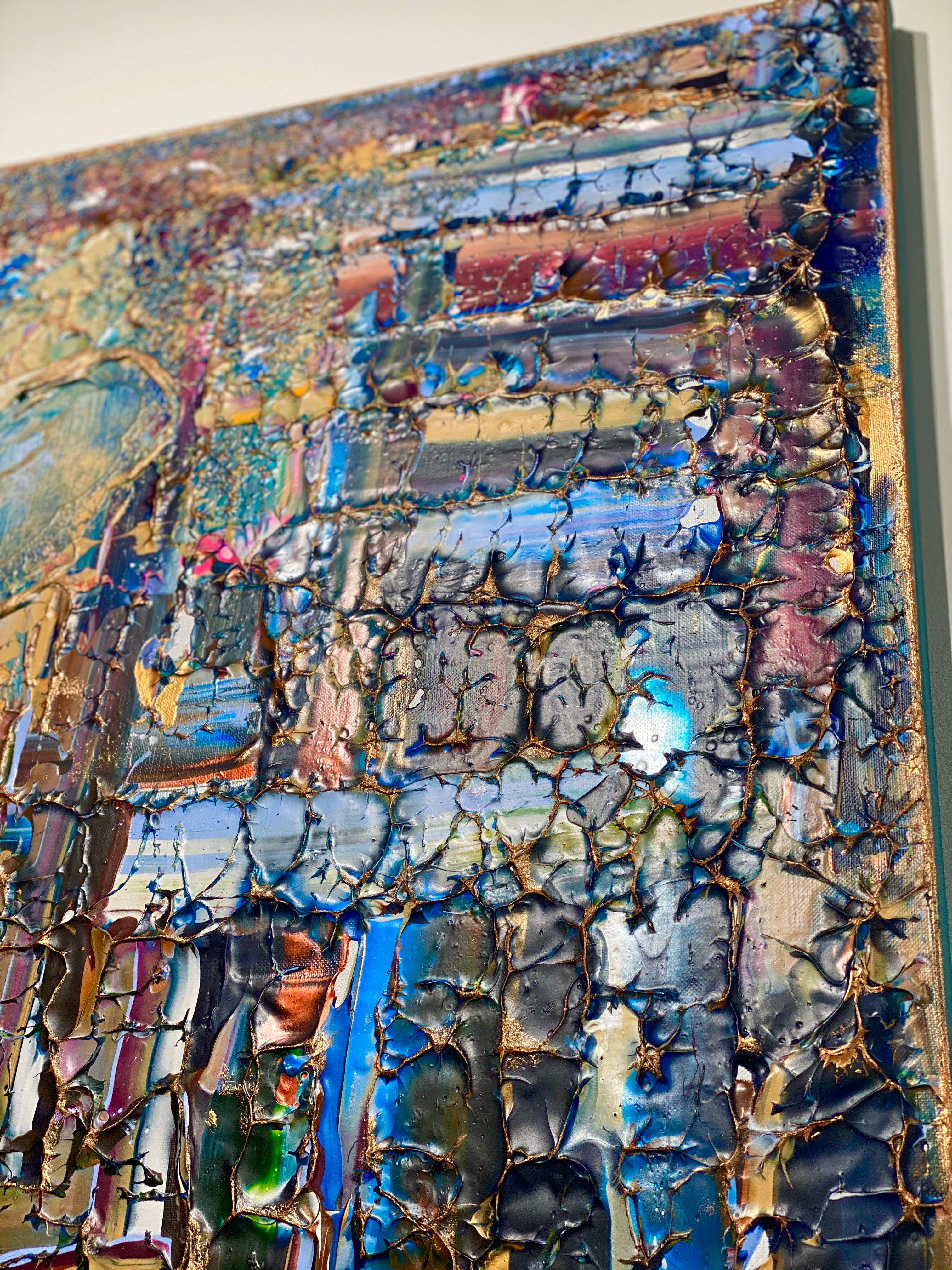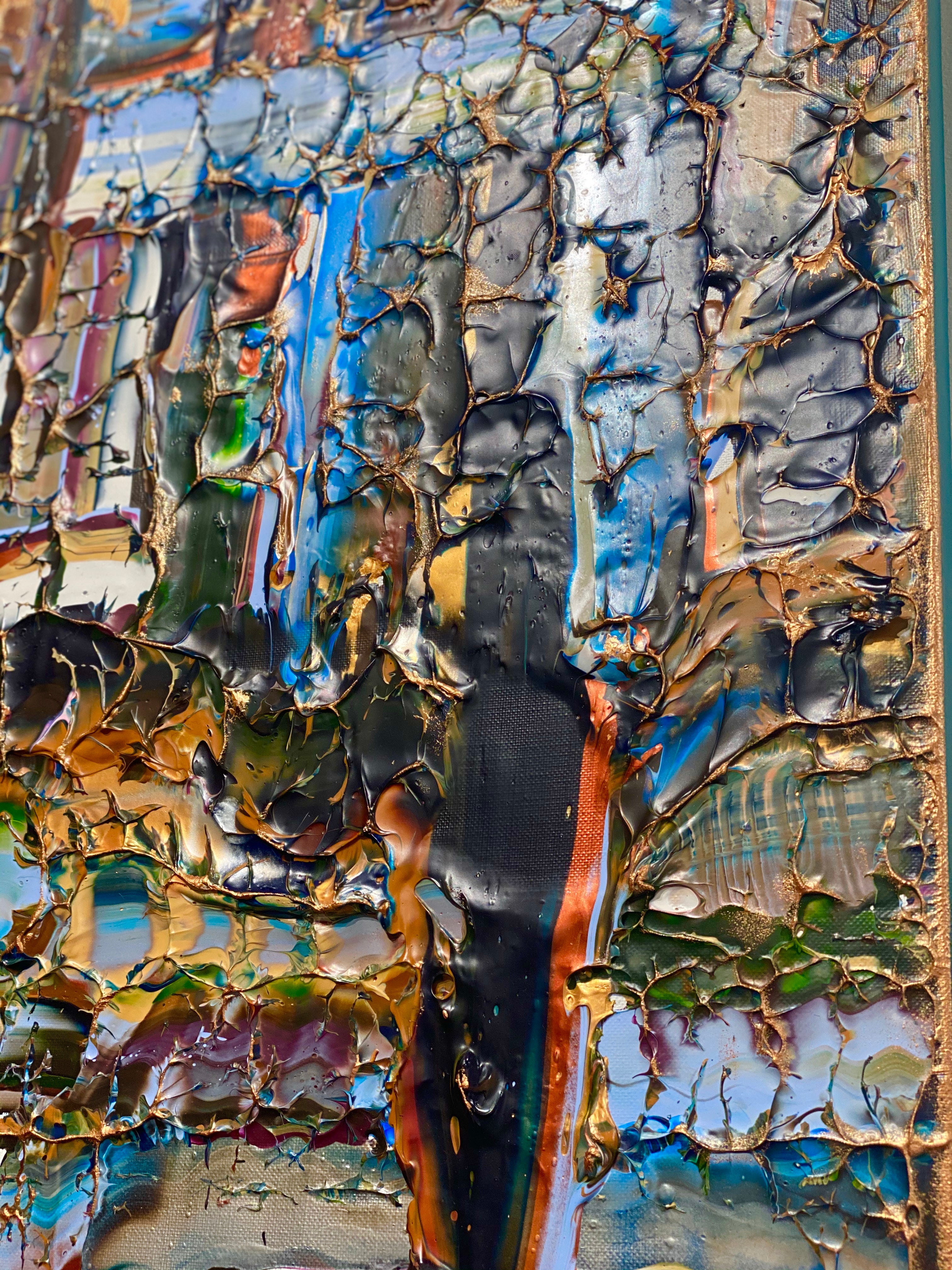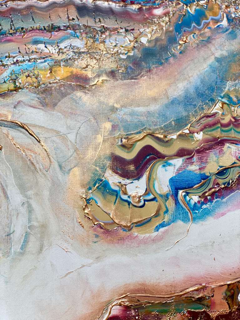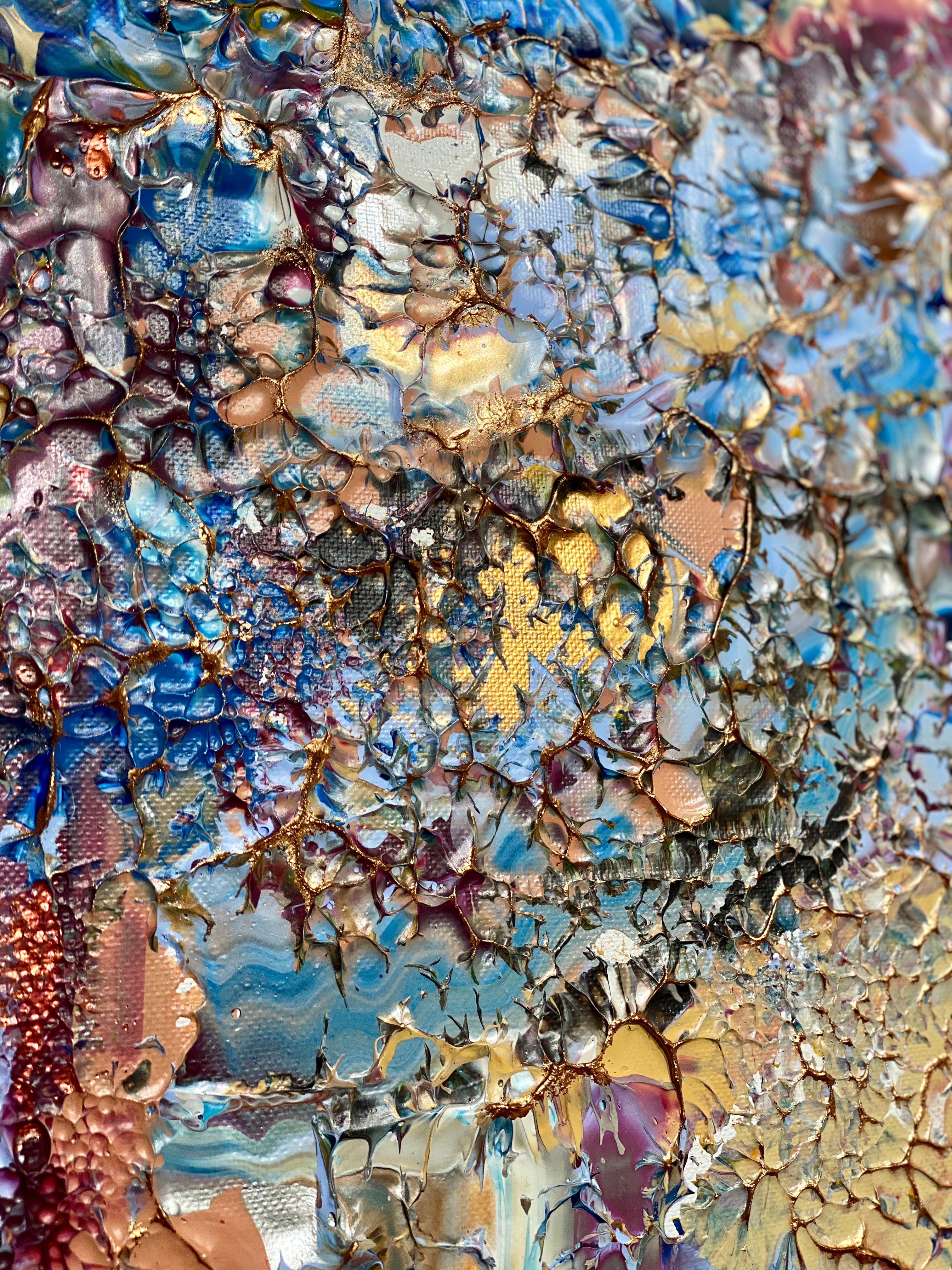 Dette maleriet er inspirert av den vakre utsikten over Värmdö. Jeg fortsetter min konkrete og detaljerte skapelse ved å produsere denne staselige røde hjorten. Hornene og pelsen er bleke med gull, noe som bidrar til en mer realistisk oppfatning. I forskjellige vinkler kan du se hvordan han skinner som jeg virkelig likte å eksperimentere med. Jeg elsker å skape det abstrakte landskapet rundt ham, som er åpent for tolkning.