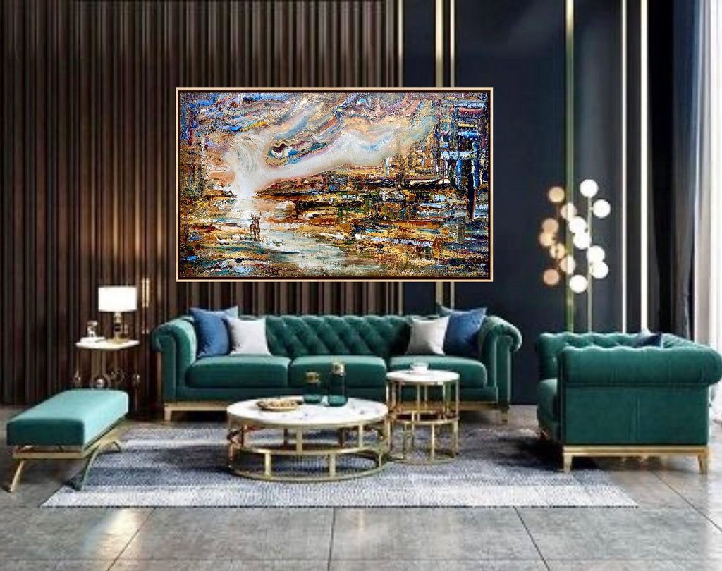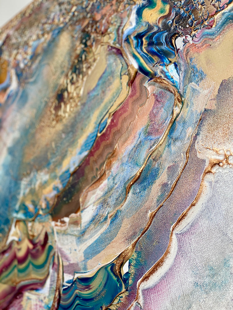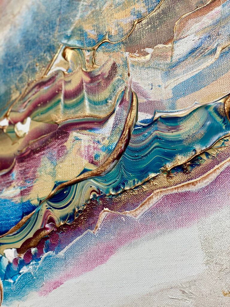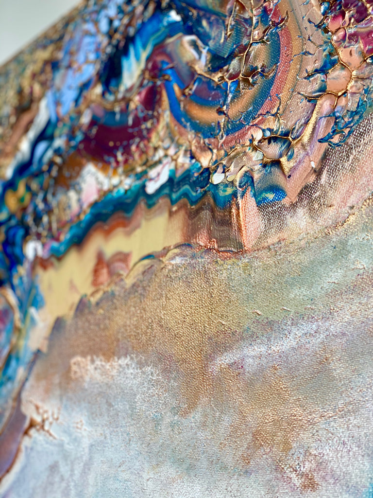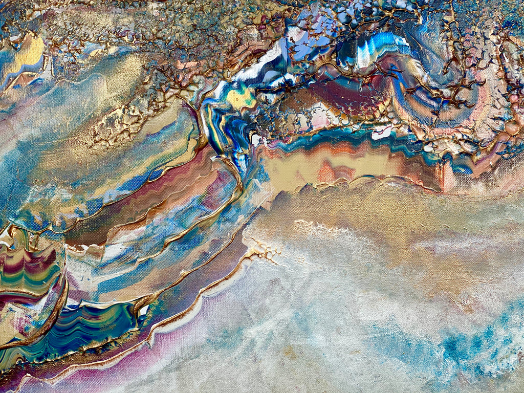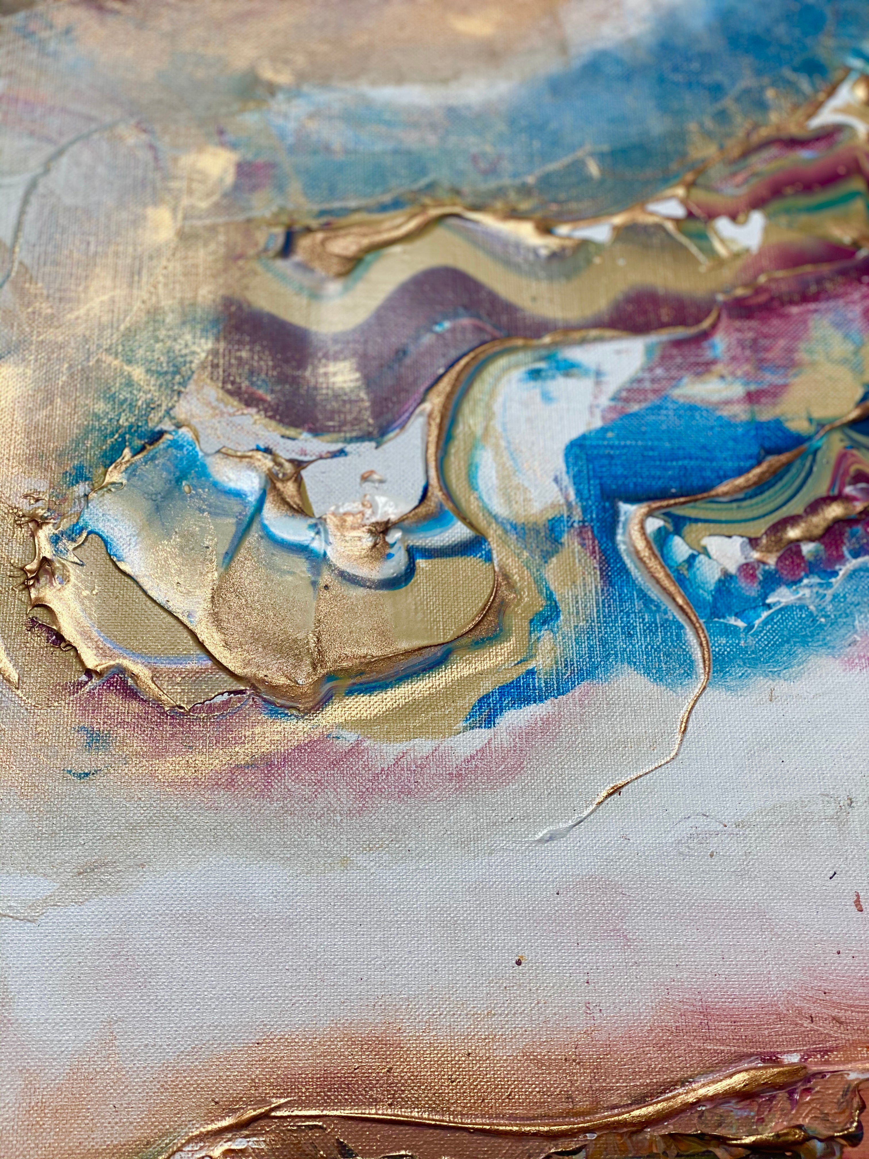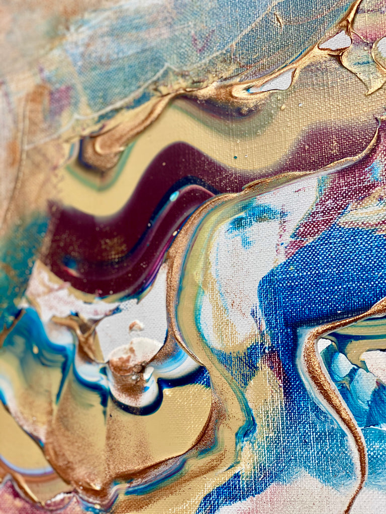 Dette maleriet er inspirert av den vakre utsikten over Värmdö. Jeg fortsetter min konkrete og detaljerte skapelse ved å produsere denne staselige røde hjorten. Hornene og pelsen er bleke med gull, noe som bidrar til en mer realistisk oppfatning. I forskjellige vinkler kan du se hvordan han skinner som jeg virkelig likte å eksperimentere med. Jeg elsker å skape det abstrakte landskapet rundt ham, som er åpent for tolkning.