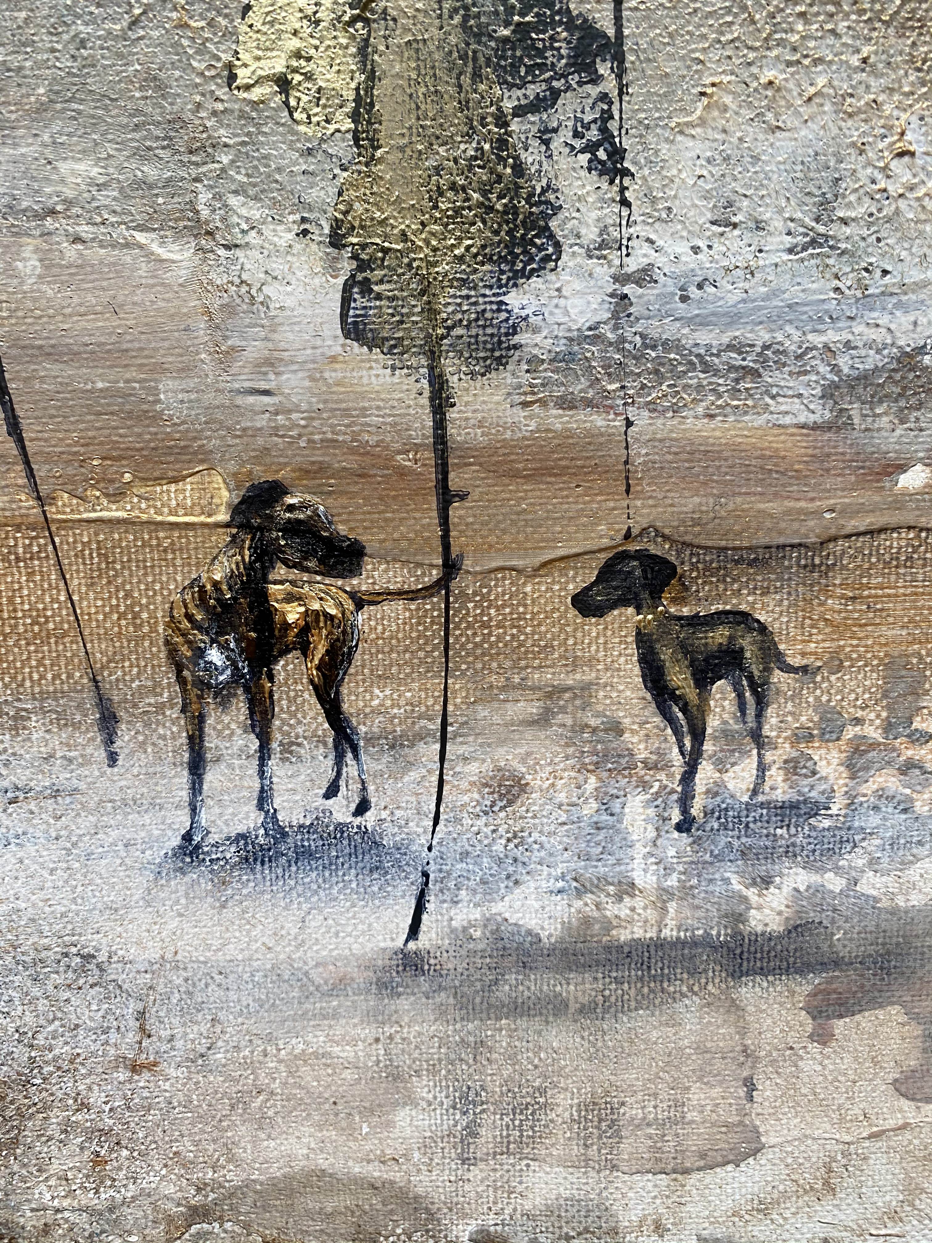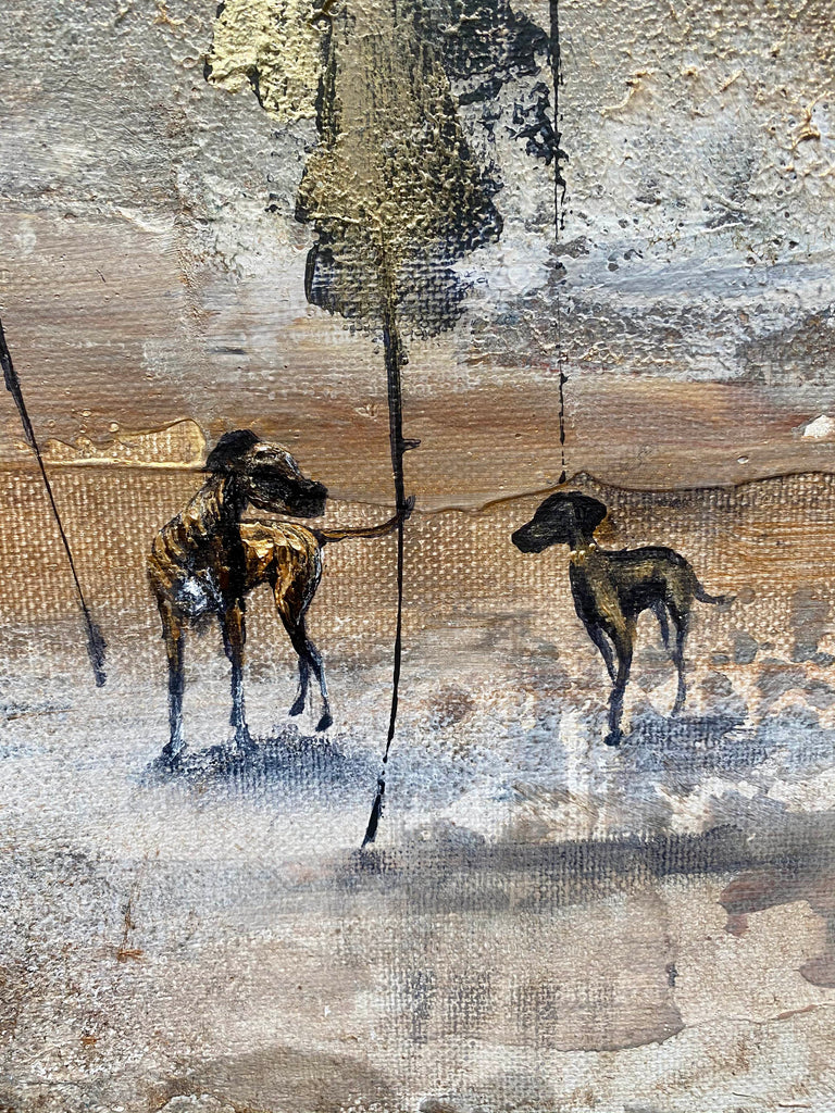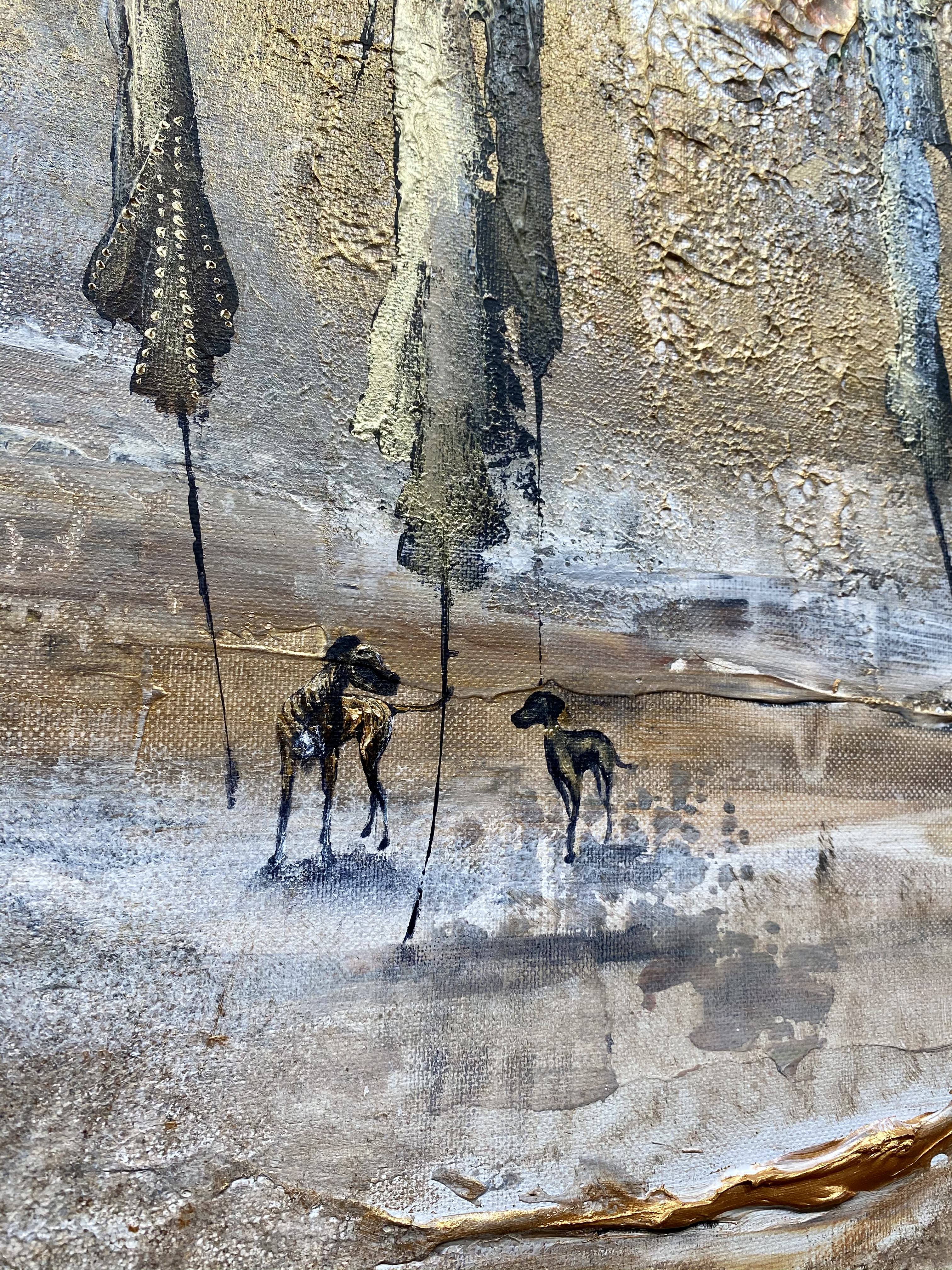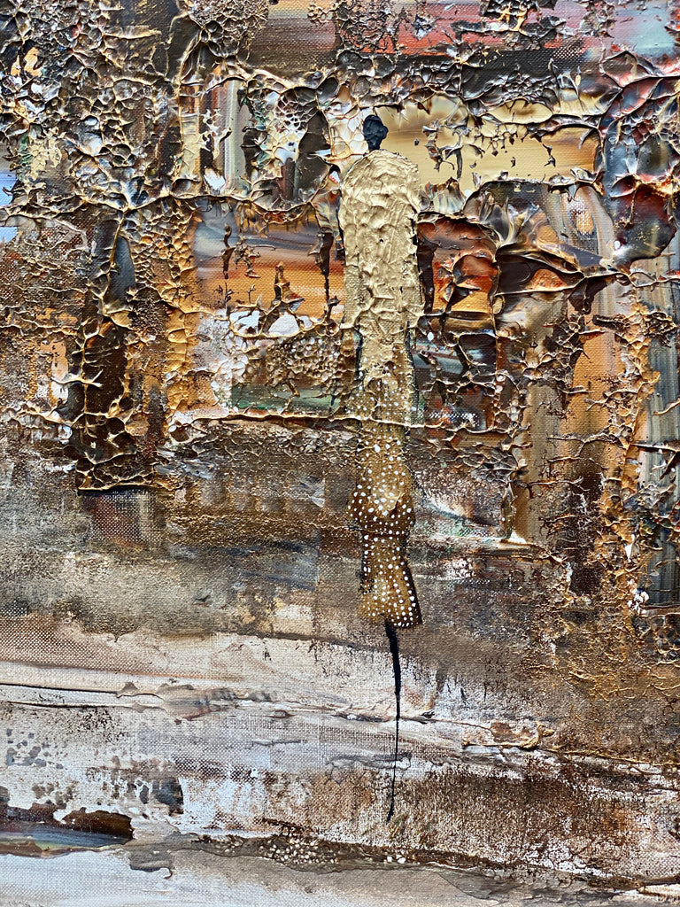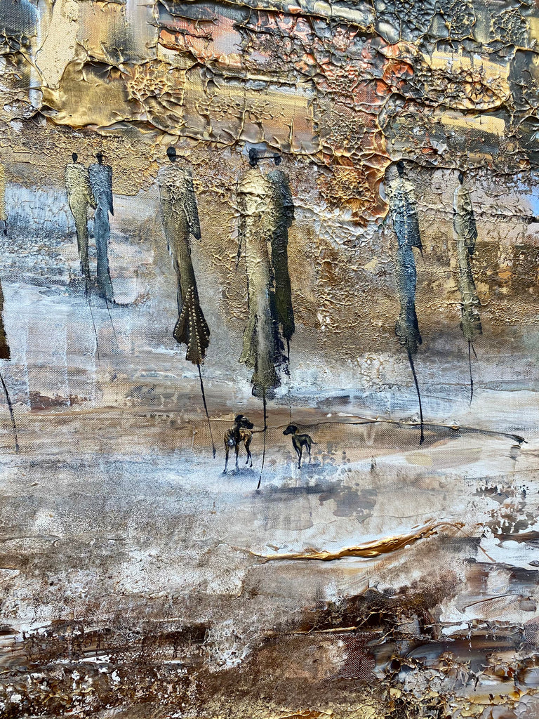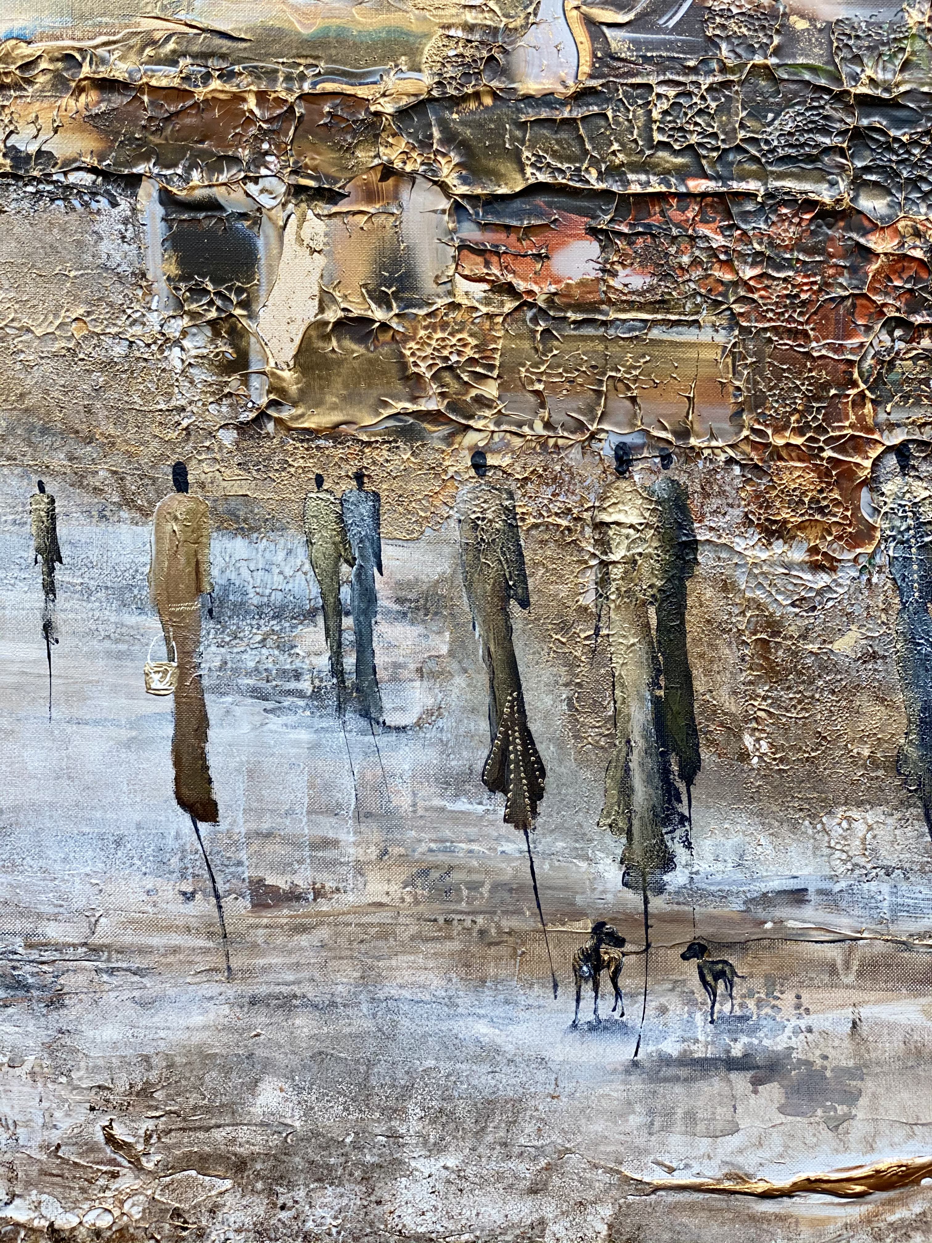 "Inspirerad av höst och mode på en av Stockholms mest fantastiska shoppinggator" Birger Jarlsgatan ". I den här målningen har jag fokuserat på att ge karaktärerna en berättelse och därmed försiktigt prydde sina kläder och väskor. Mina två babyhundar är i Mitt i målningen fumble och hJördis.