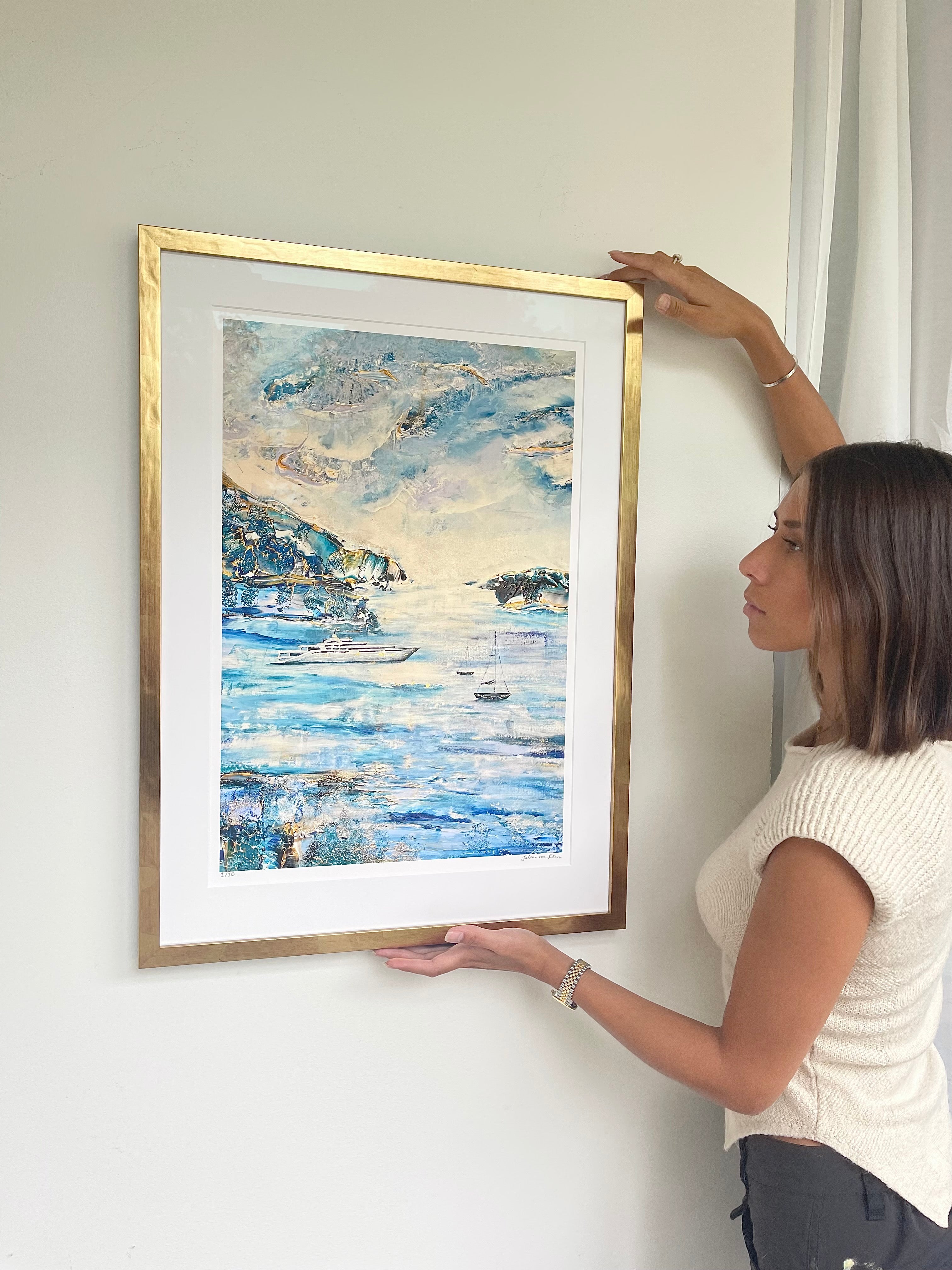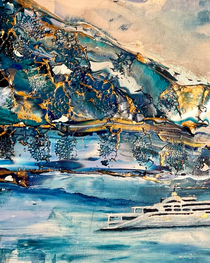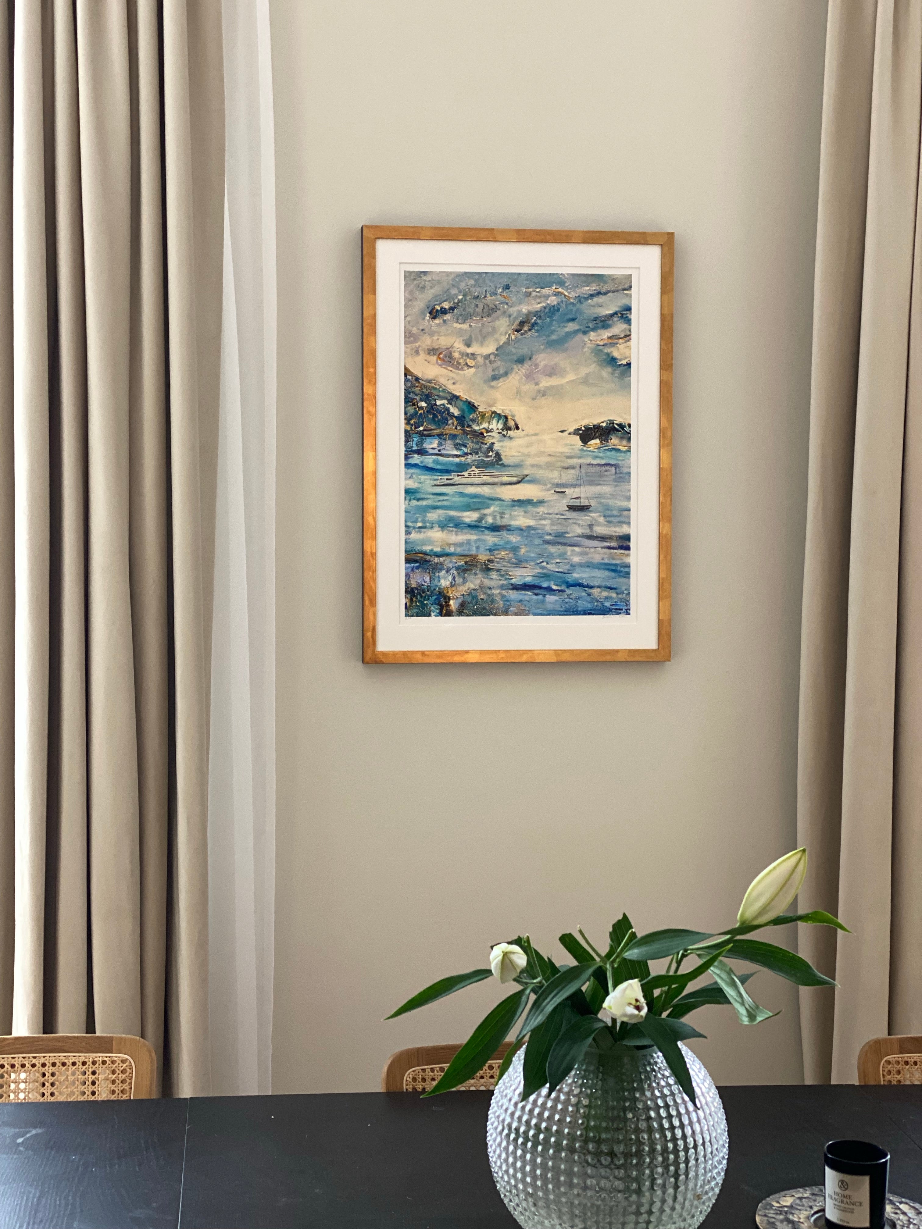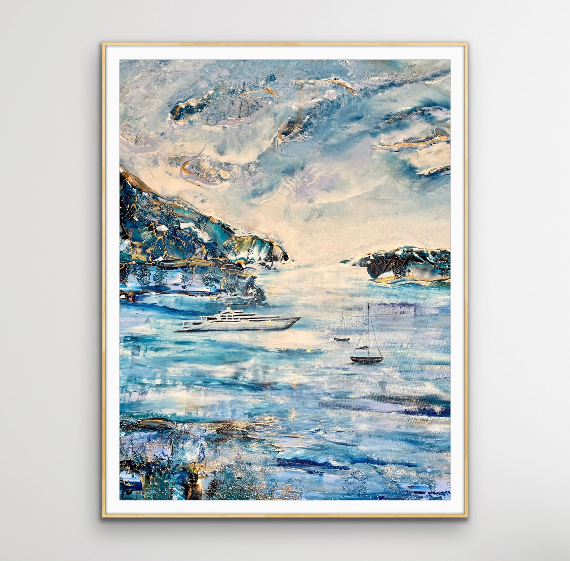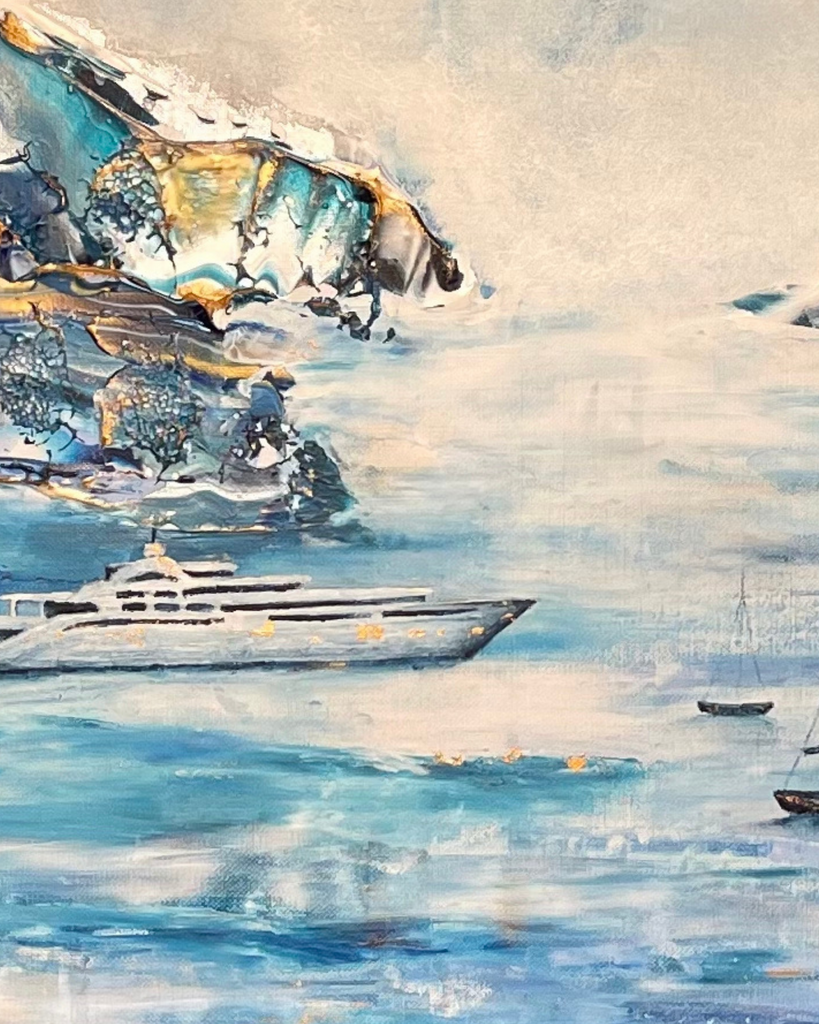 Mykonos är en så härlig plats i Grekland, och jag kunde inte motstå att skapa en målning som fångar ön. Mer bearbetade detaljer med nya motiv, i detta fall, en yacht, är en viktig del av den kommande utställningen. Att lägga mycket ansträngning i de konkreta delarna av mina målningar är något som jag kommer att fortsätta utveckla. För mig symboliserar denna målning en vacker dag ute till sjöss, och naturligtvis min kärlek till det stora blå havet.