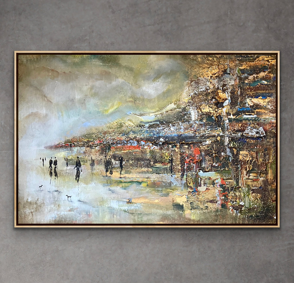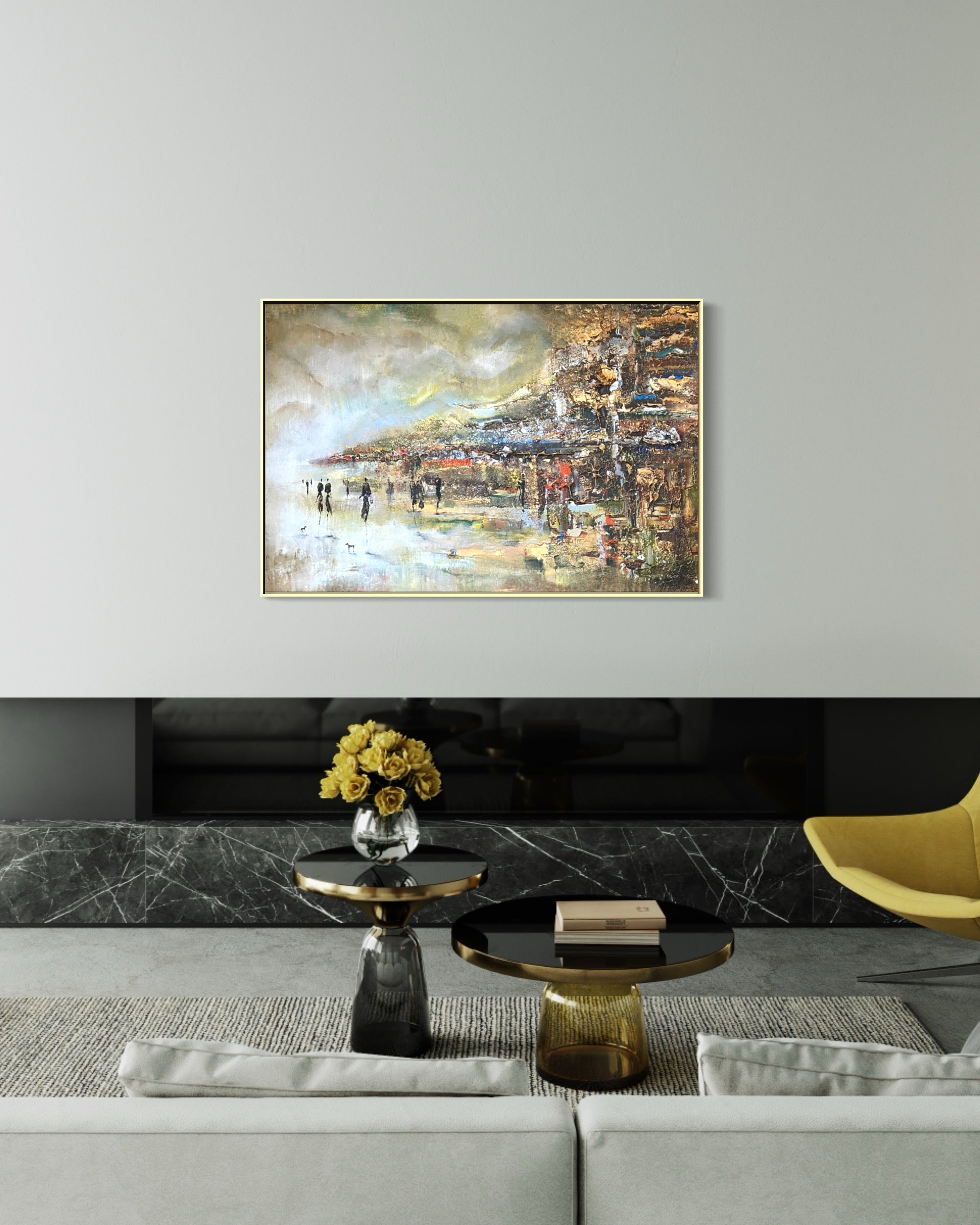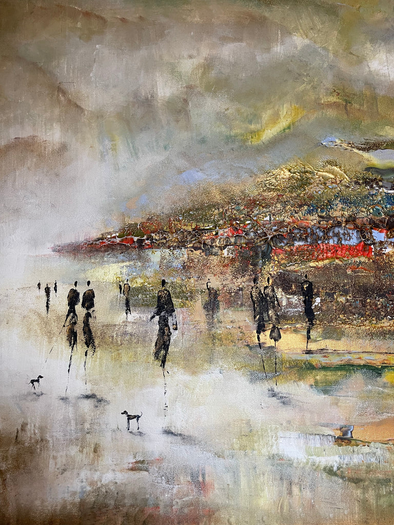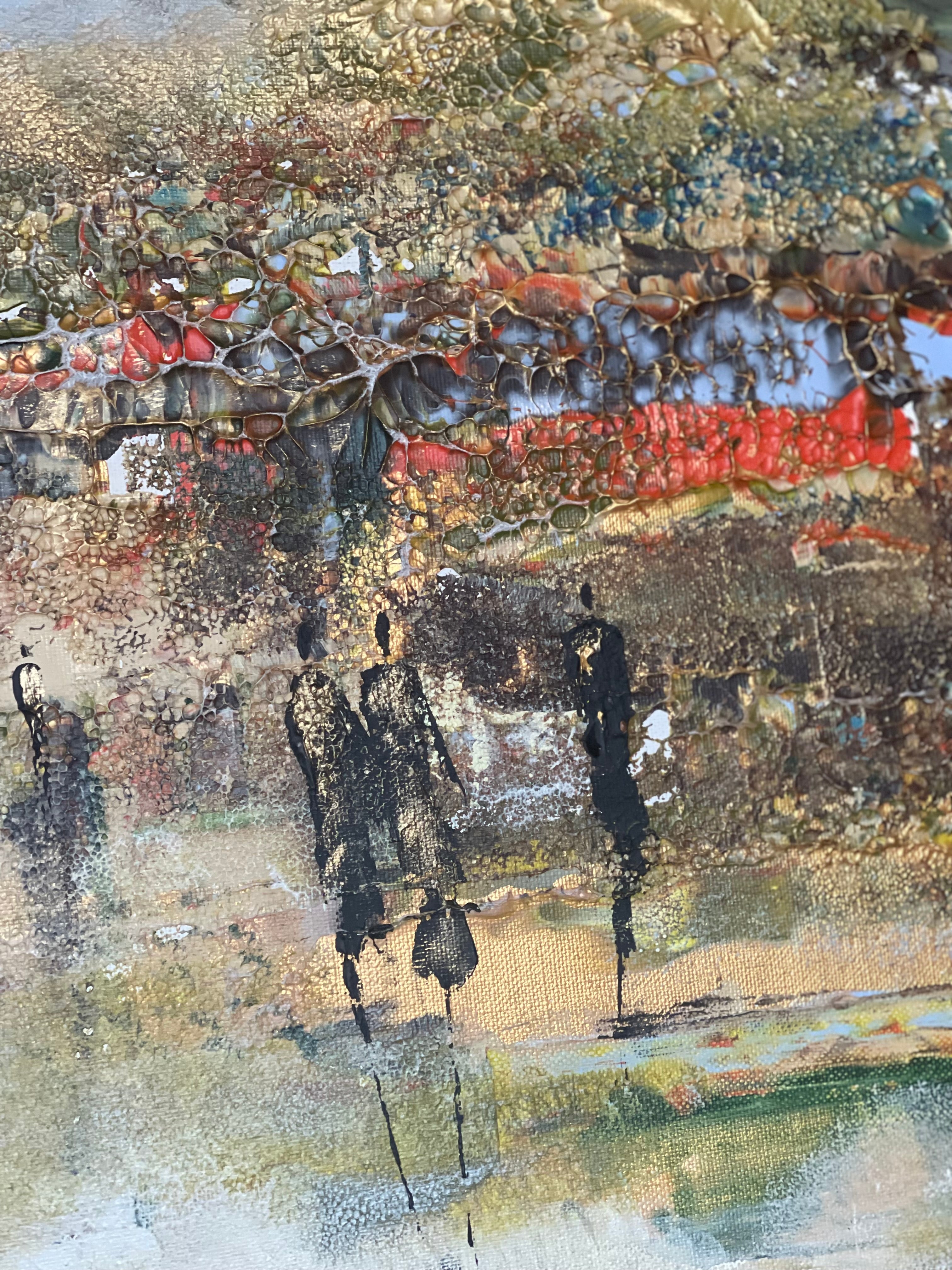 "A Walk Around Lejonslätten" är inspirerad av en av mina favoritplatser på Djunrenden. Jag har mest använt bruna och gyllene nyanser för att skapa känslan av hösten. Jag har också fokuserat mycket på figurerna i den här målningen. De är alla mycket detaljerade och klädda i trendiga kläder. Mina två hundar finns också! Vidare har jag experimenterat med strukturen och applicerat lager av torkad färg. Detta skapar en 3D -effekt, eftersom vissa delar dyker upp ur ramen.