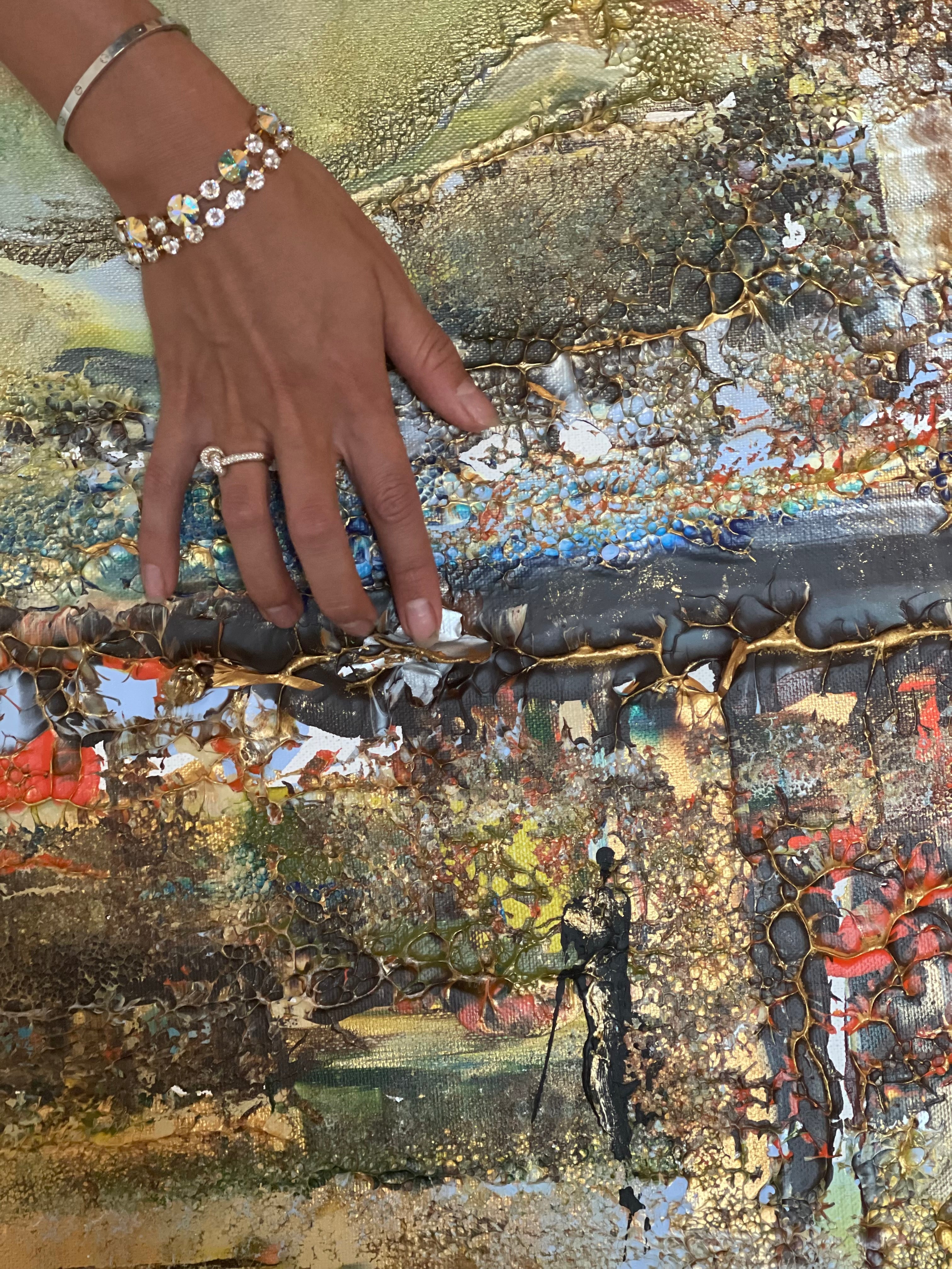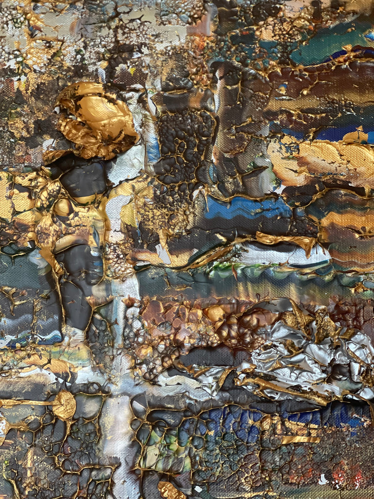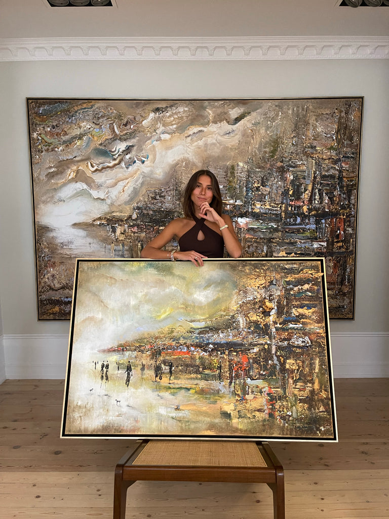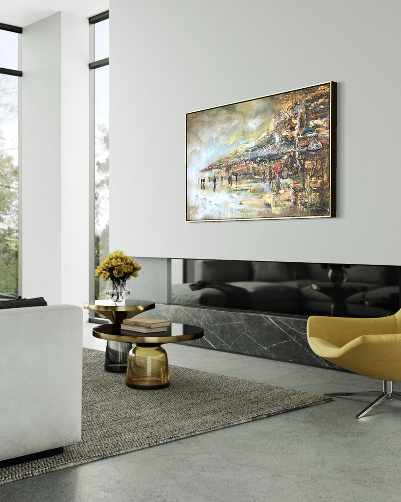 "A Walk Around Lejonslätten" är inspirerad av en av mina favoritplatser på Djunrenden. Jag har mest använt bruna och gyllene nyanser för att skapa känslan av hösten. Jag har också fokuserat mycket på figurerna i den här målningen. De är alla mycket detaljerade och klädda i trendiga kläder. Mina två hundar finns också! Vidare har jag experimenterat med strukturen och applicerat lager av torkad färg. Detta skapar en 3D -effekt, eftersom vissa delar dyker upp ur ramen.